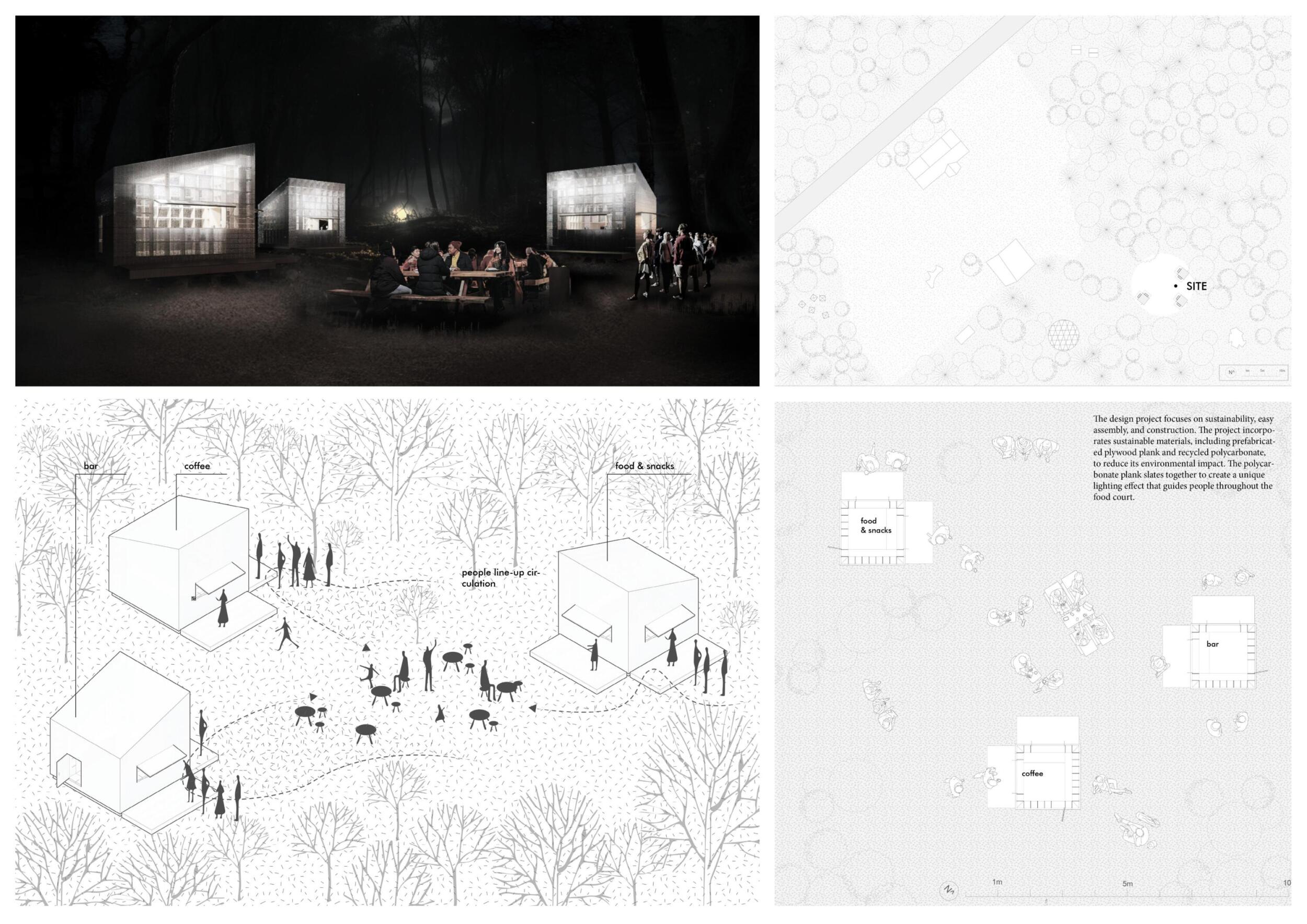 Re(treat) is a proposal for a modular food court consisting of three units sized 3 meters by 3 meters and constructed of locally-sourced timber and upcycled materials. These units serve as an inviting and versatile space for festival goers, as well as a comfortable and versatile space for vendors. It is laid out to ensure no trees are impacted.