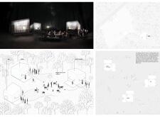 The submission offers a unique graphic language that communicates design experience and is very effective at engaging a reviewer. Its complex drawings combine lines with textures that clearly highlight the architecture within the natural setting of the forest. The project would benefit, however, from further differentiation of line weights and variation in color: the use of grays makes the drawings read as homogenous, and it is difficult to extract the details, visually speaking.