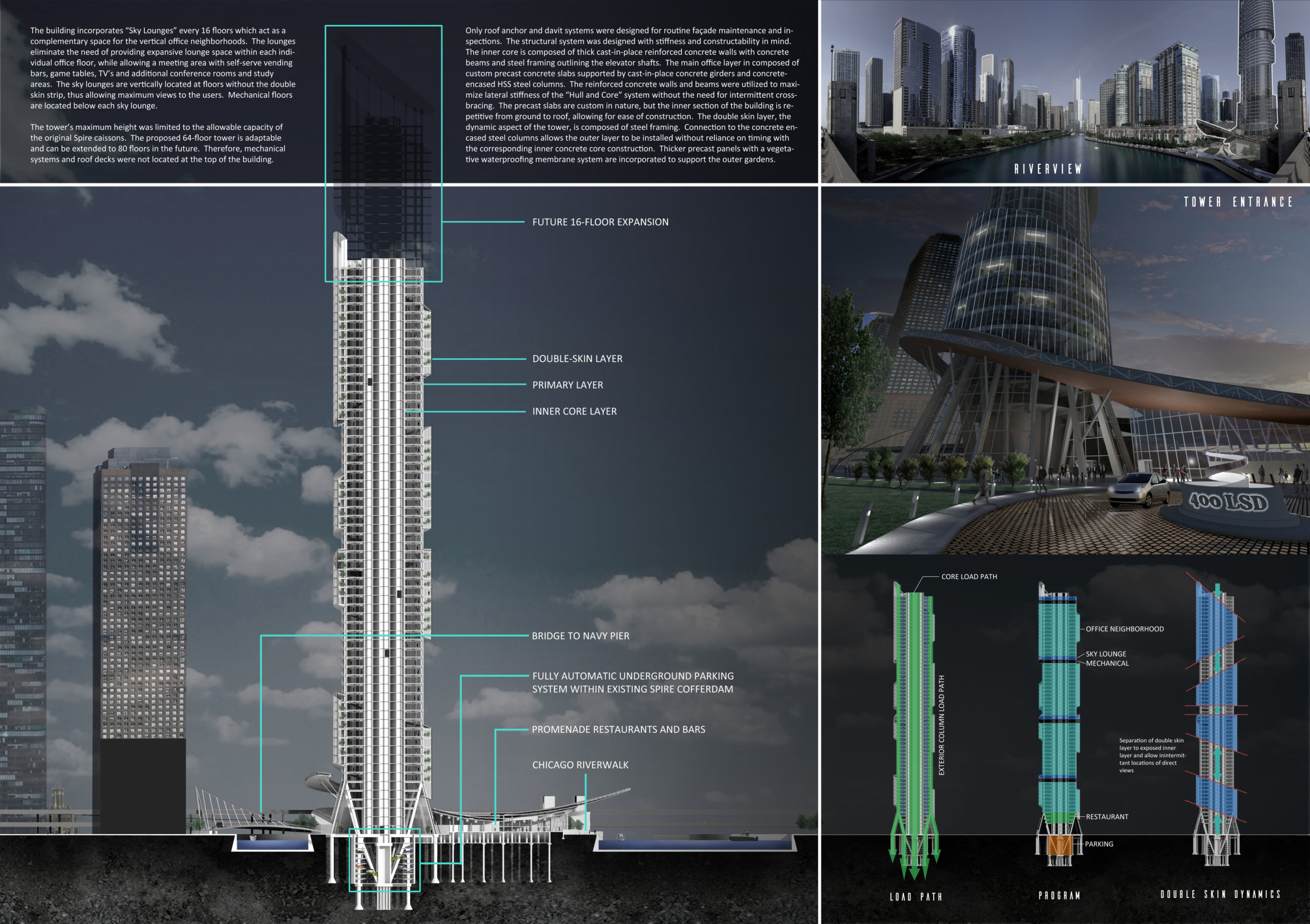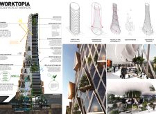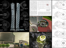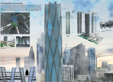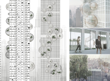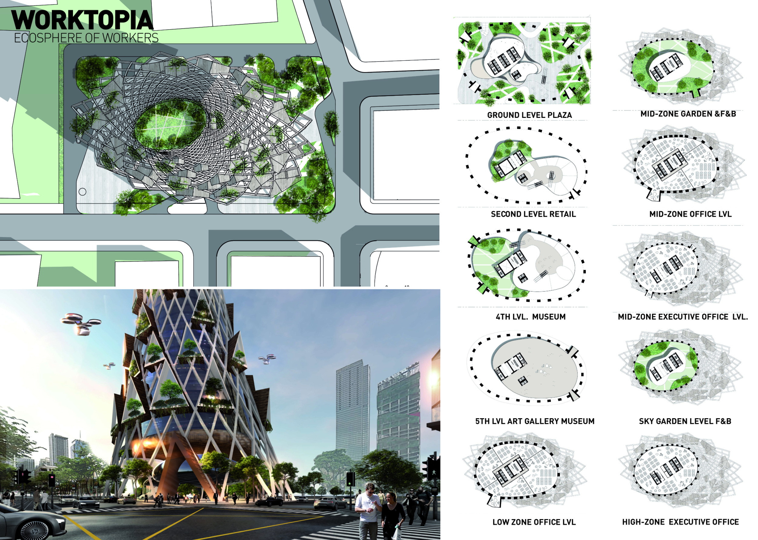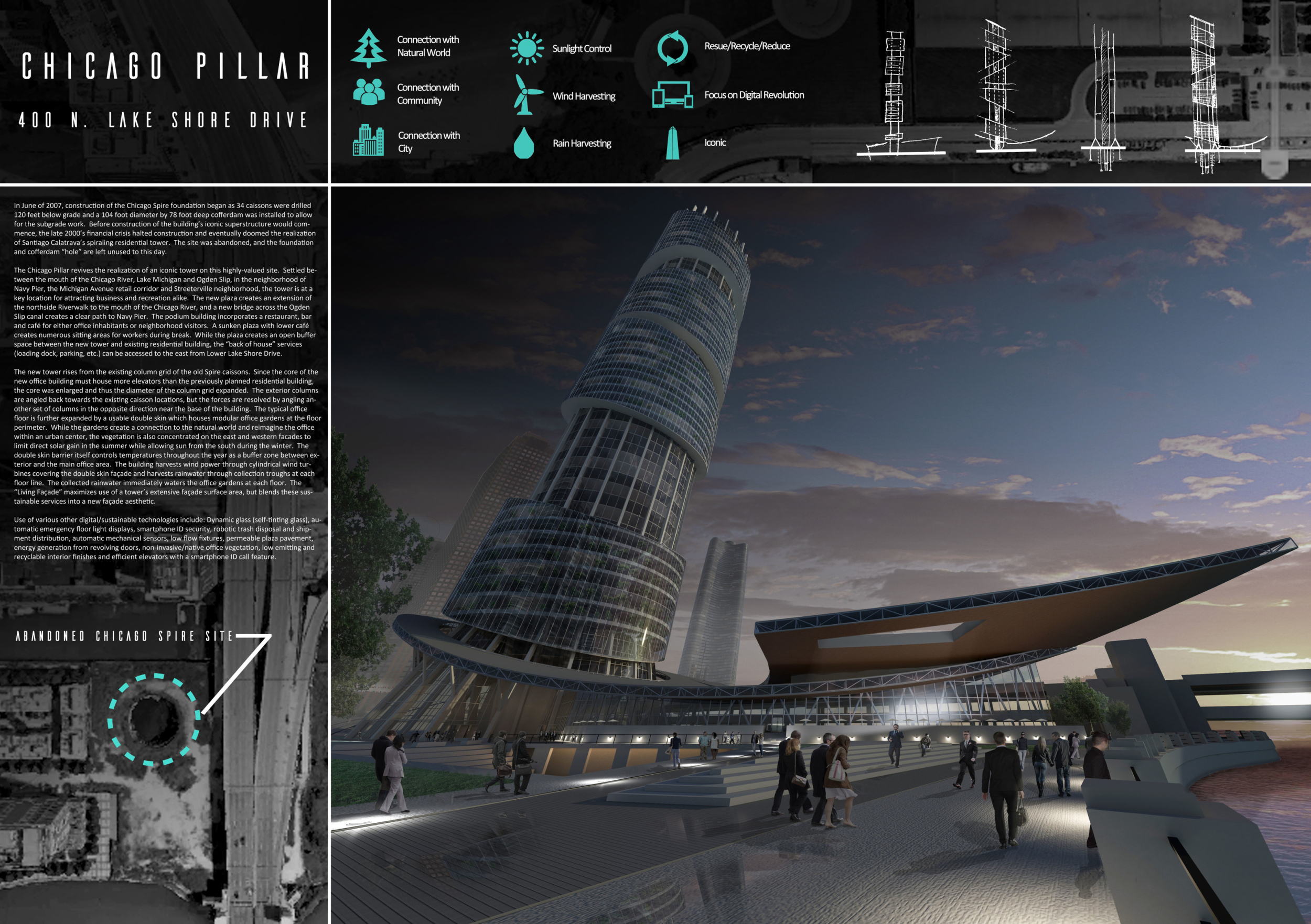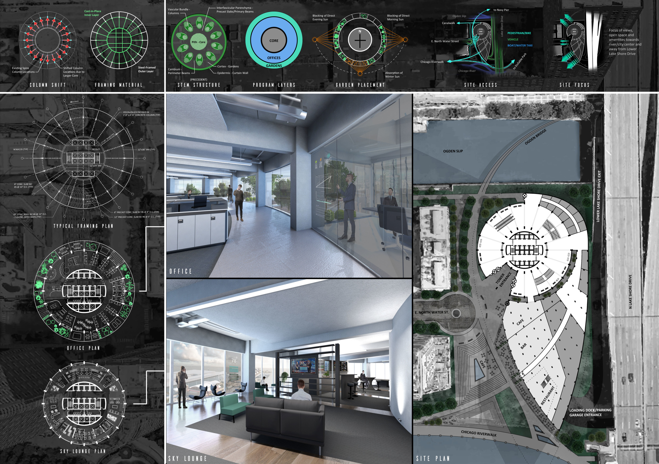 There has been much demand for proposals considering the famous 'Chicago Spire' site which awaits development in that city's downtown. Though the submission focuses on this particular site, the design has the potential to be used anywhere. A simple cylindrical tower is wrapped in a ribbon of perimeter green spaces that transform the typical office, and which are well-designed with details showing deep planters permitting the growth of trees and appropriate drainage.