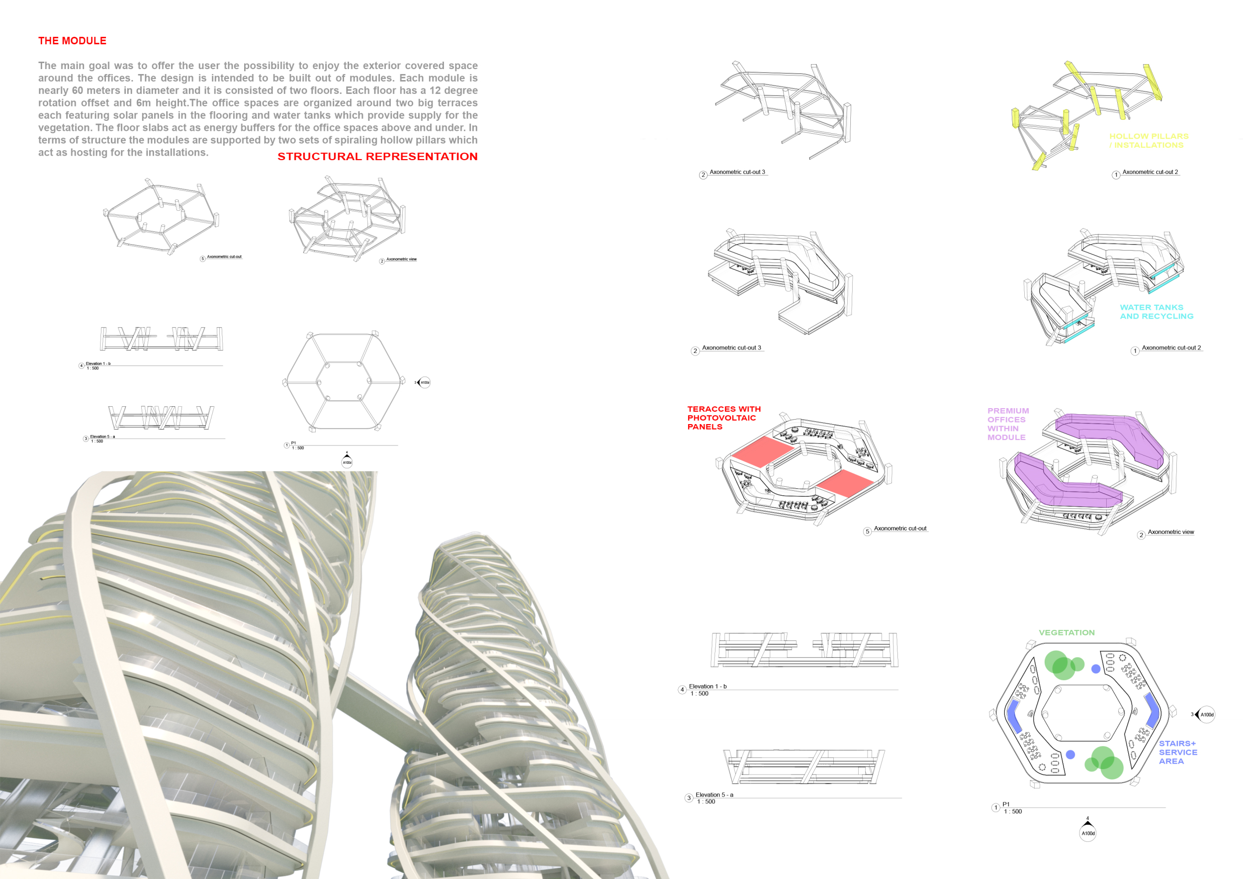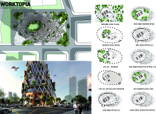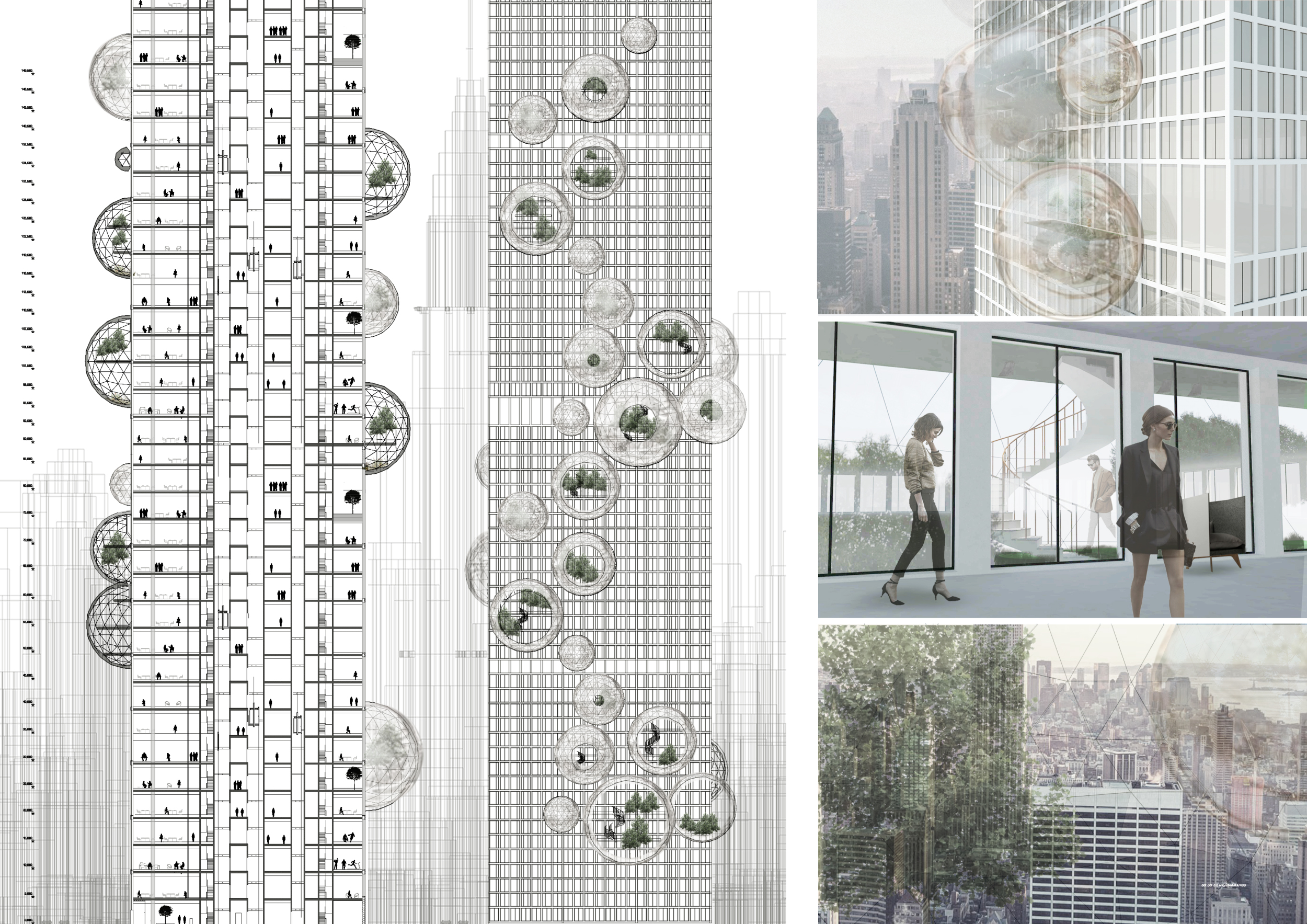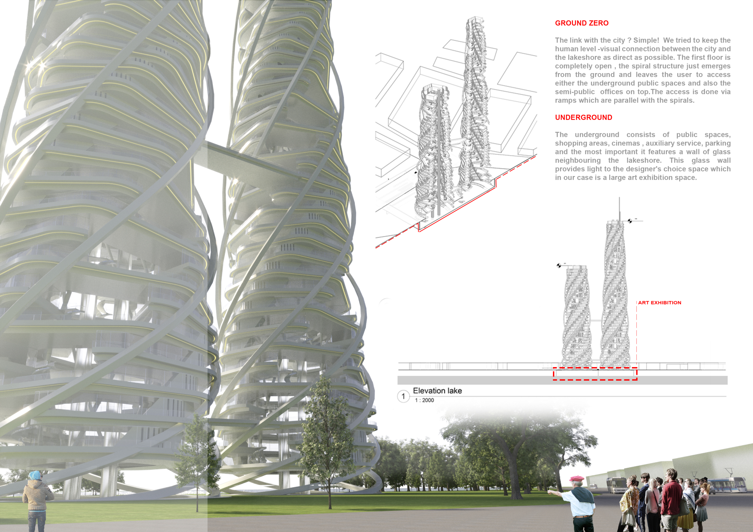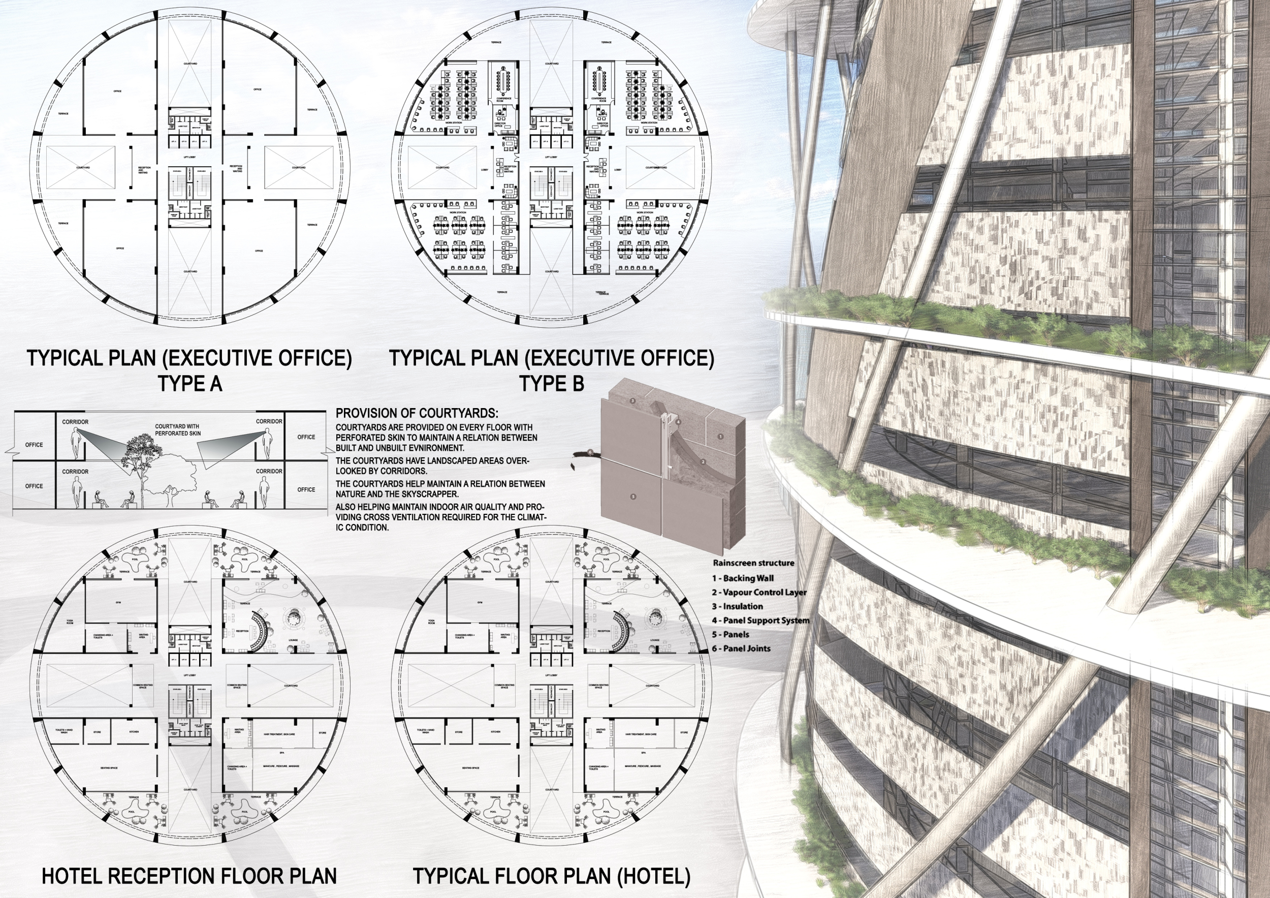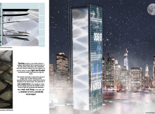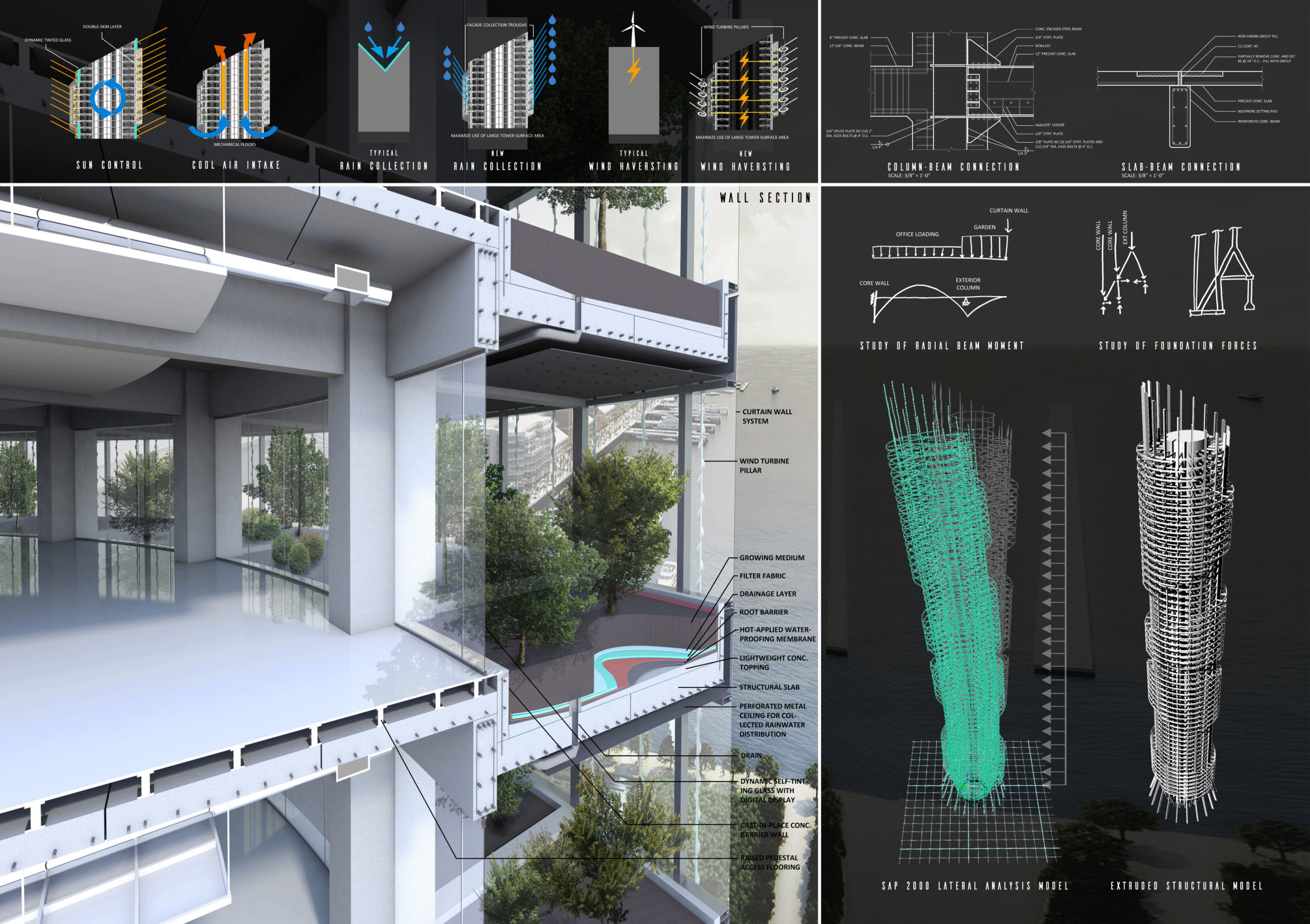 There has been much demand for proposals considering the famous 'Chicago Spire' site which awaits development in that city's downtown. Though the submission focuses on this particular site, the design has the potential to be used anywhere. A simple cylindrical tower is wrapped in a ribbon of perimeter green spaces that transform the typical office, and which are well-designed with details showing deep planters permitting the growth of trees and appropriate drainage.