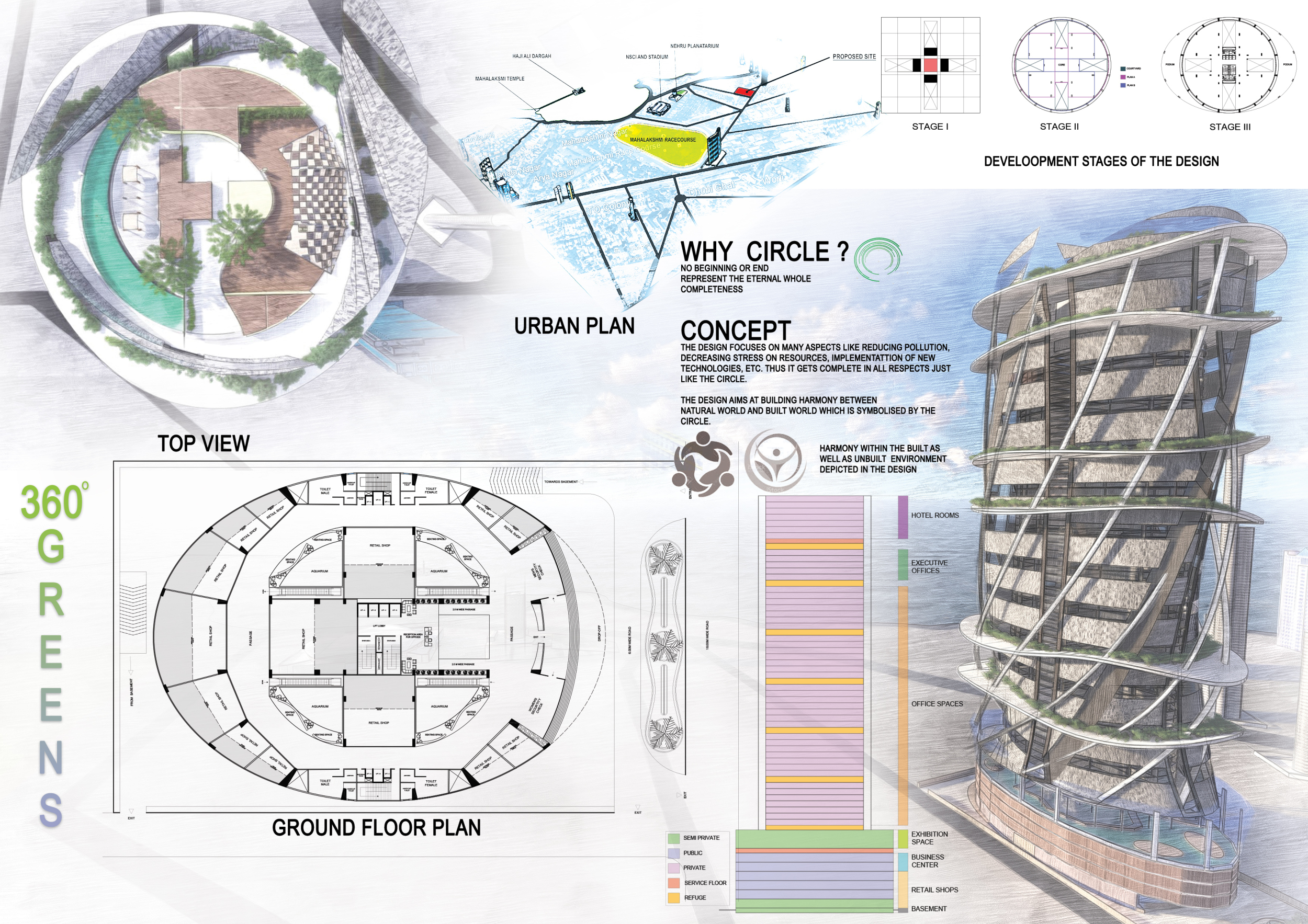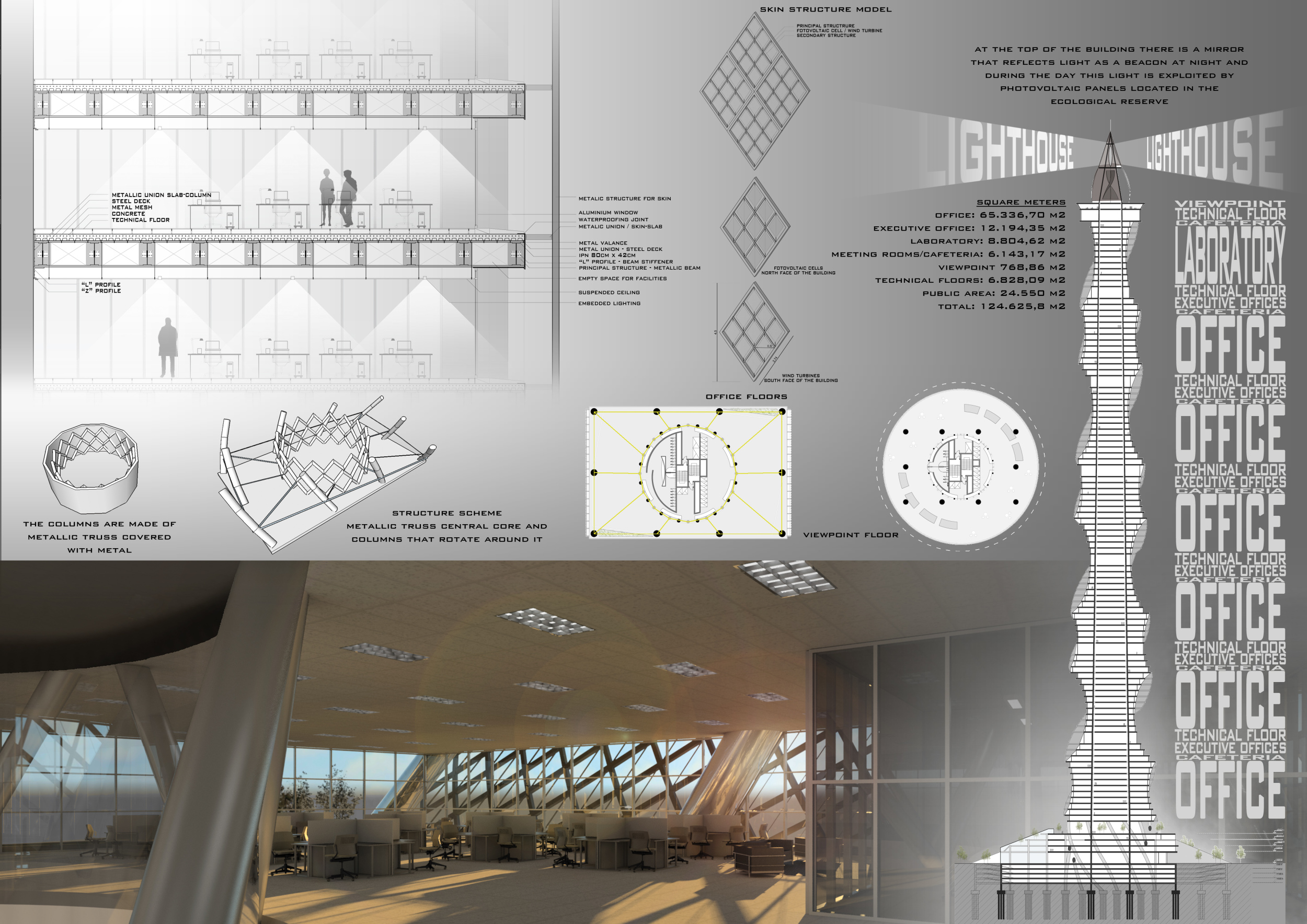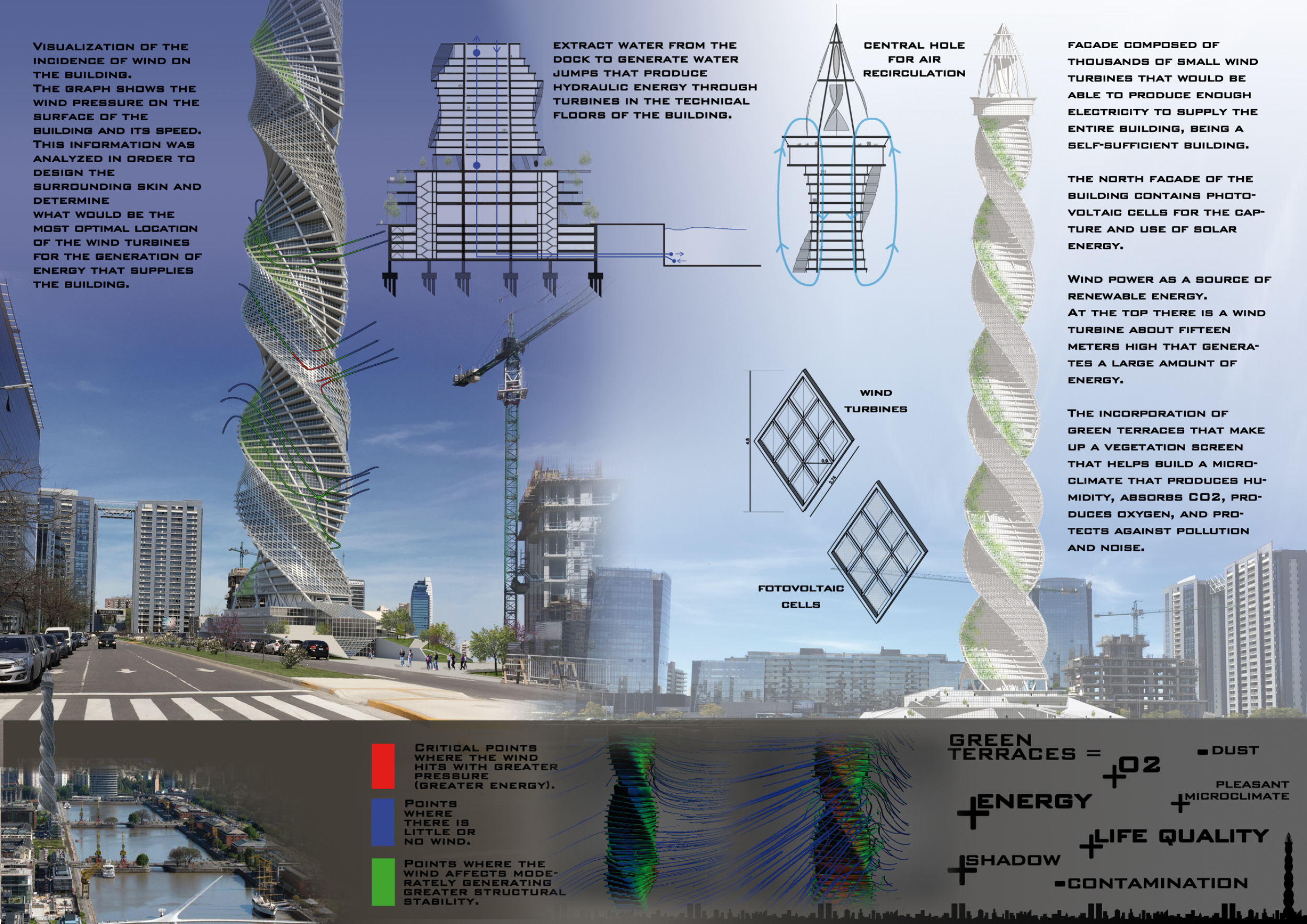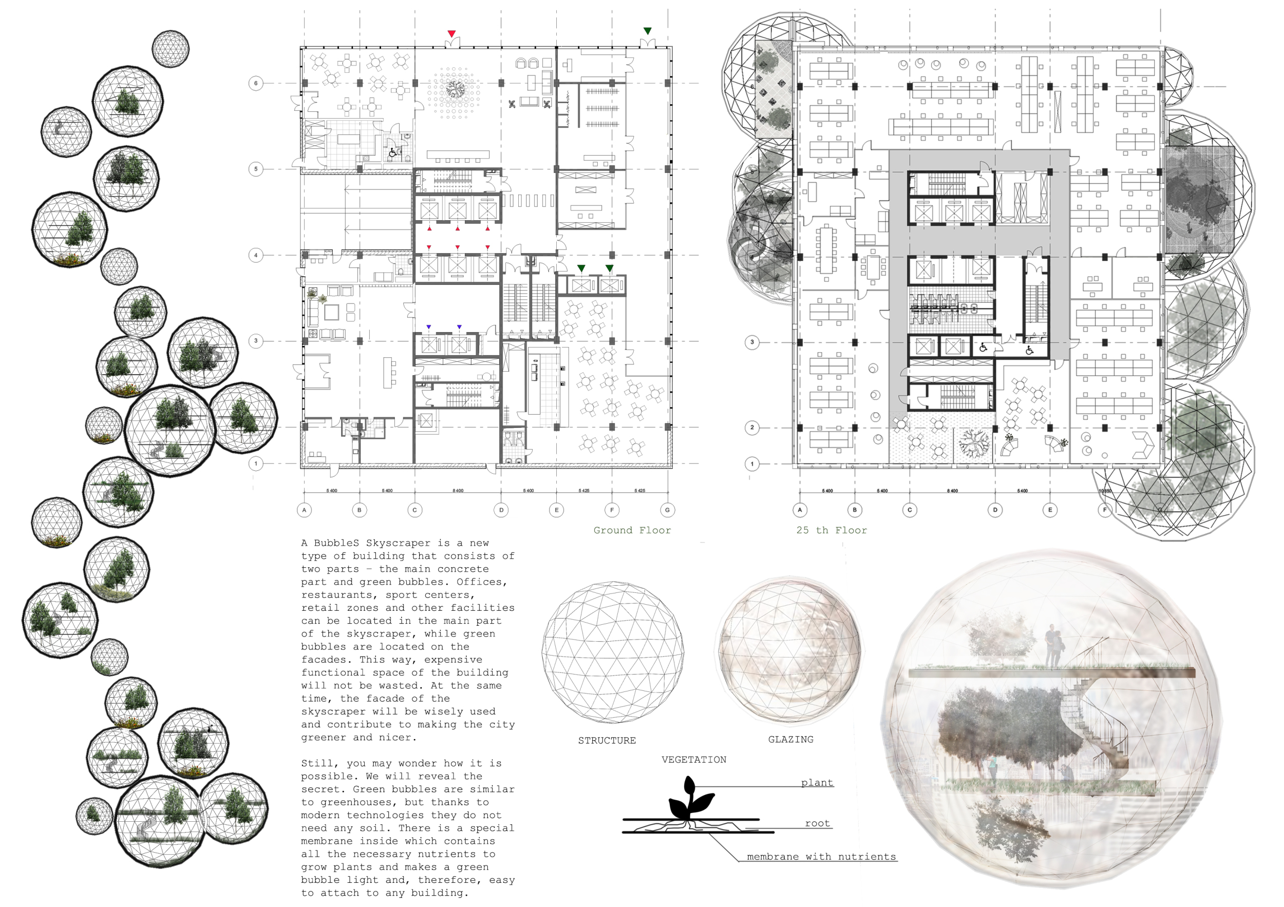 There has been much demand for proposals considering the famous 'Chicago Spire' site which awaits development in that city's downtown. Though the submission focuses on this particular site, the design has the potential to be used anywhere. A simple cylindrical tower is wrapped in a ribbon of perimeter green spaces that transform the typical office, and which are well-designed with details showing deep planters permitting the growth of trees and appropriate drainage.