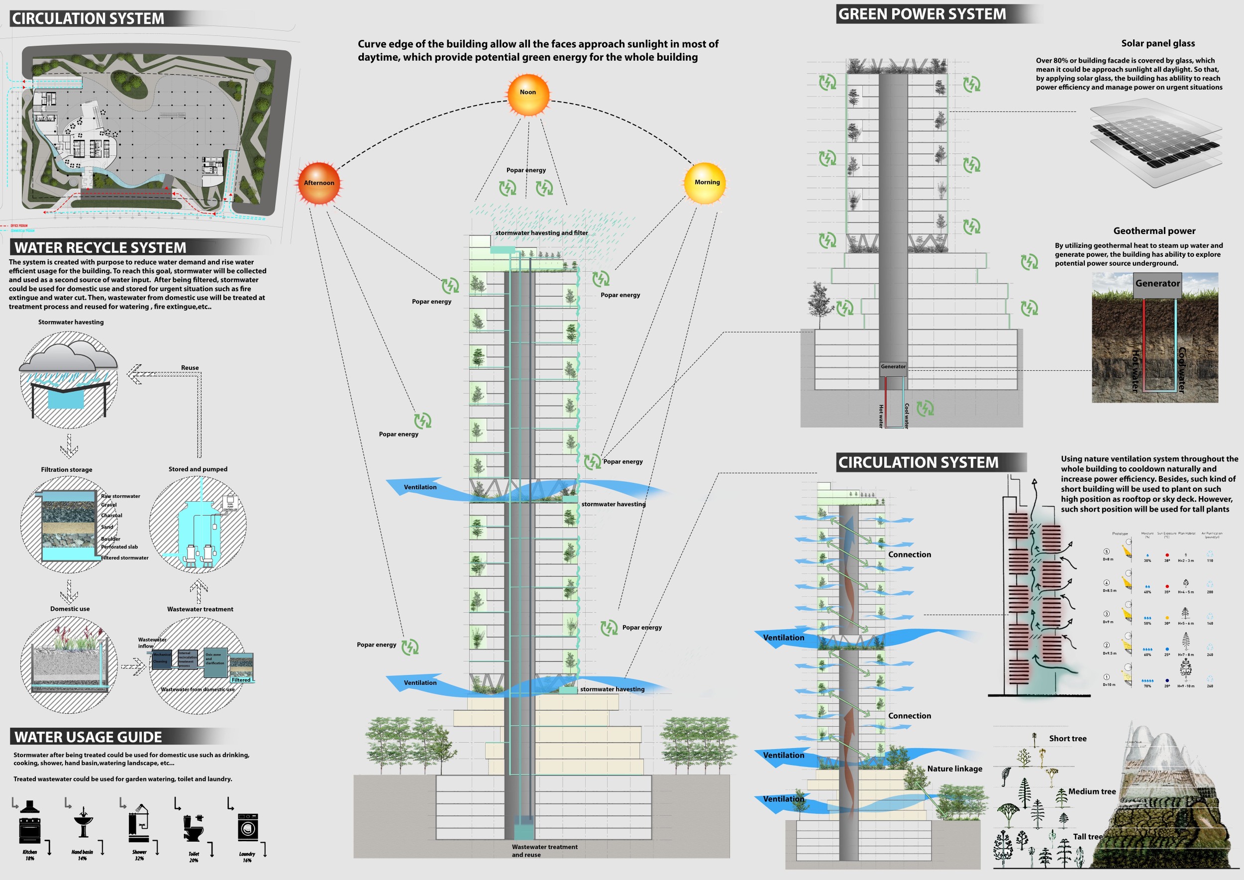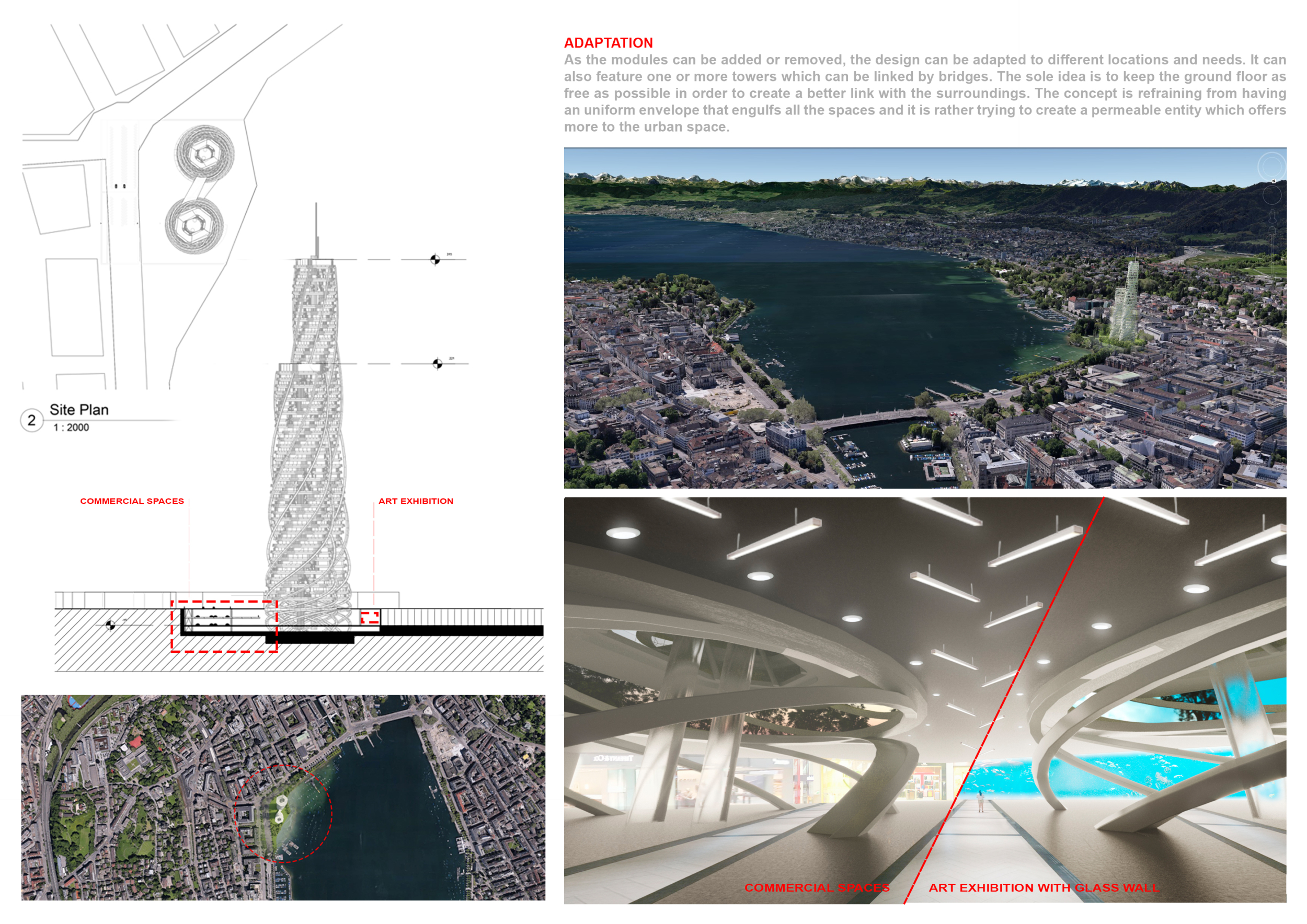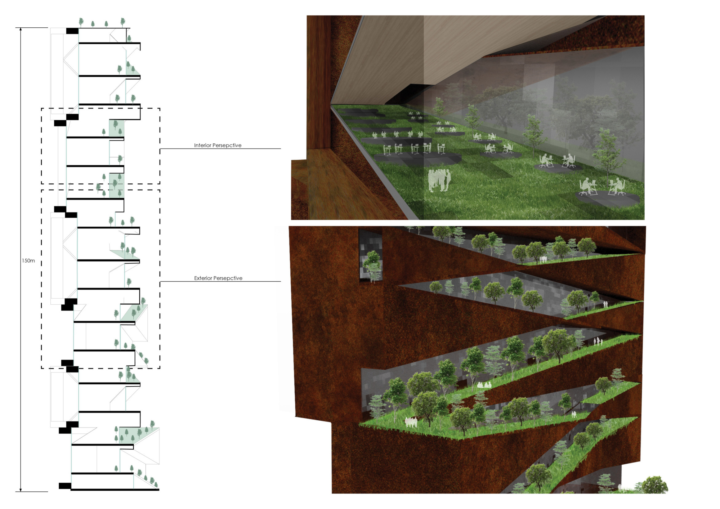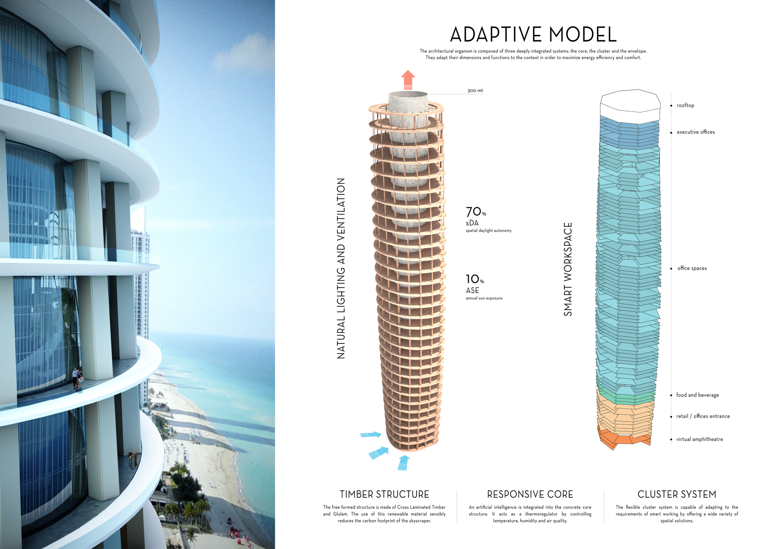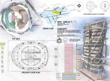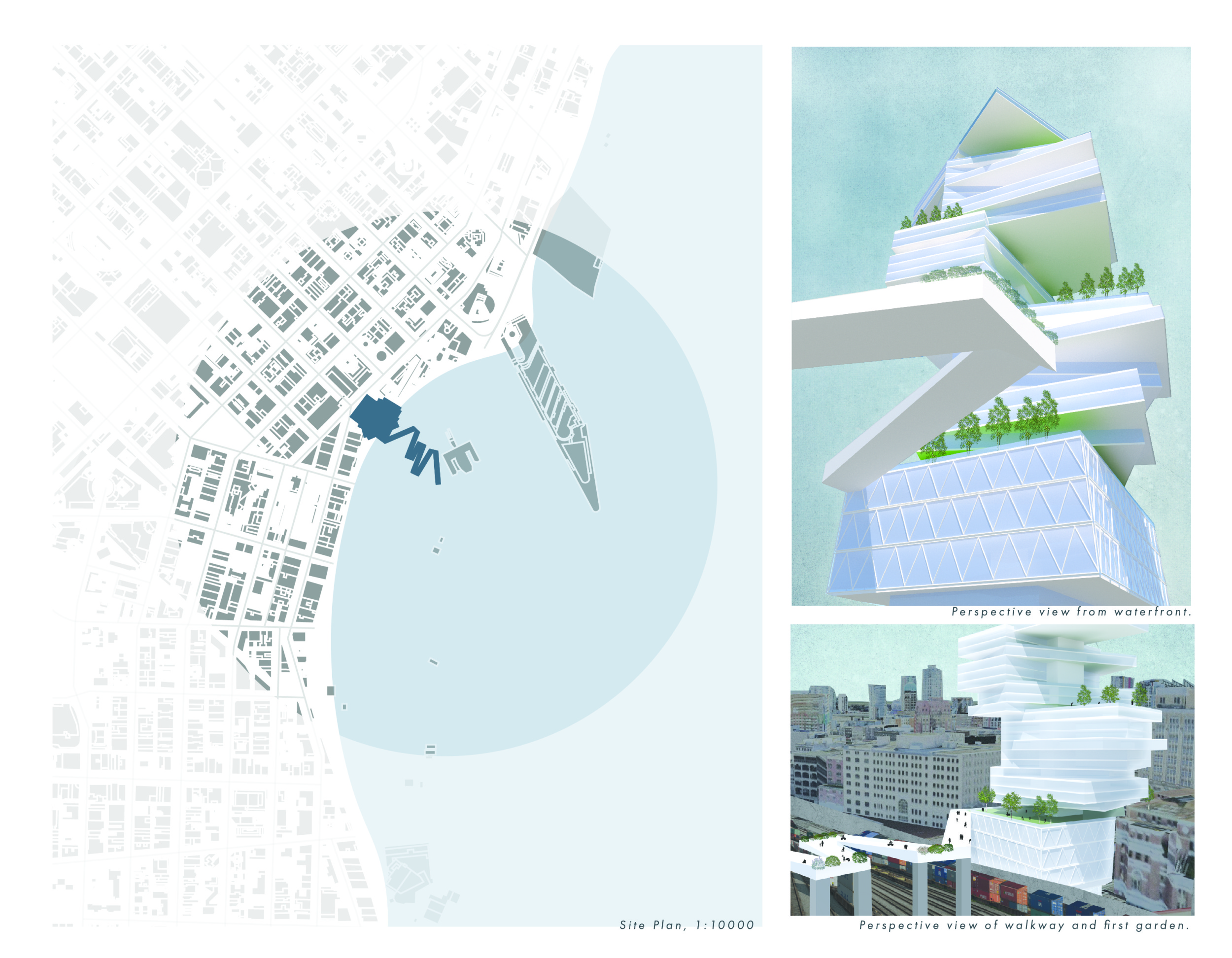 There has been much demand for proposals considering the famous 'Chicago Spire' site which awaits development in that city's downtown. Though the submission focuses on this particular site, the design has the potential to be used anywhere. A simple cylindrical tower is wrapped in a ribbon of perimeter green spaces that transform the typical office, and which are well-designed with details showing deep planters permitting the growth of trees and appropriate drainage.