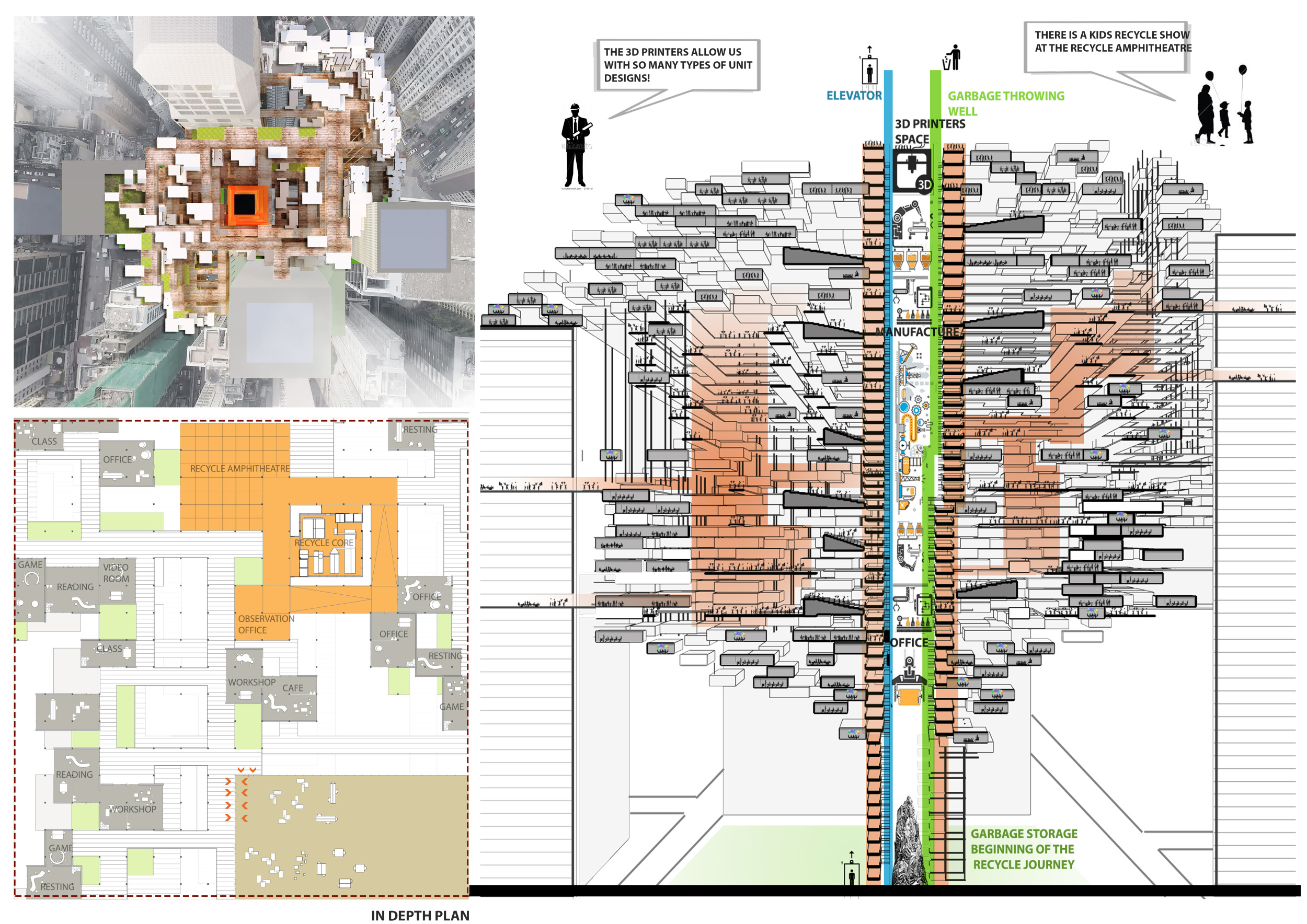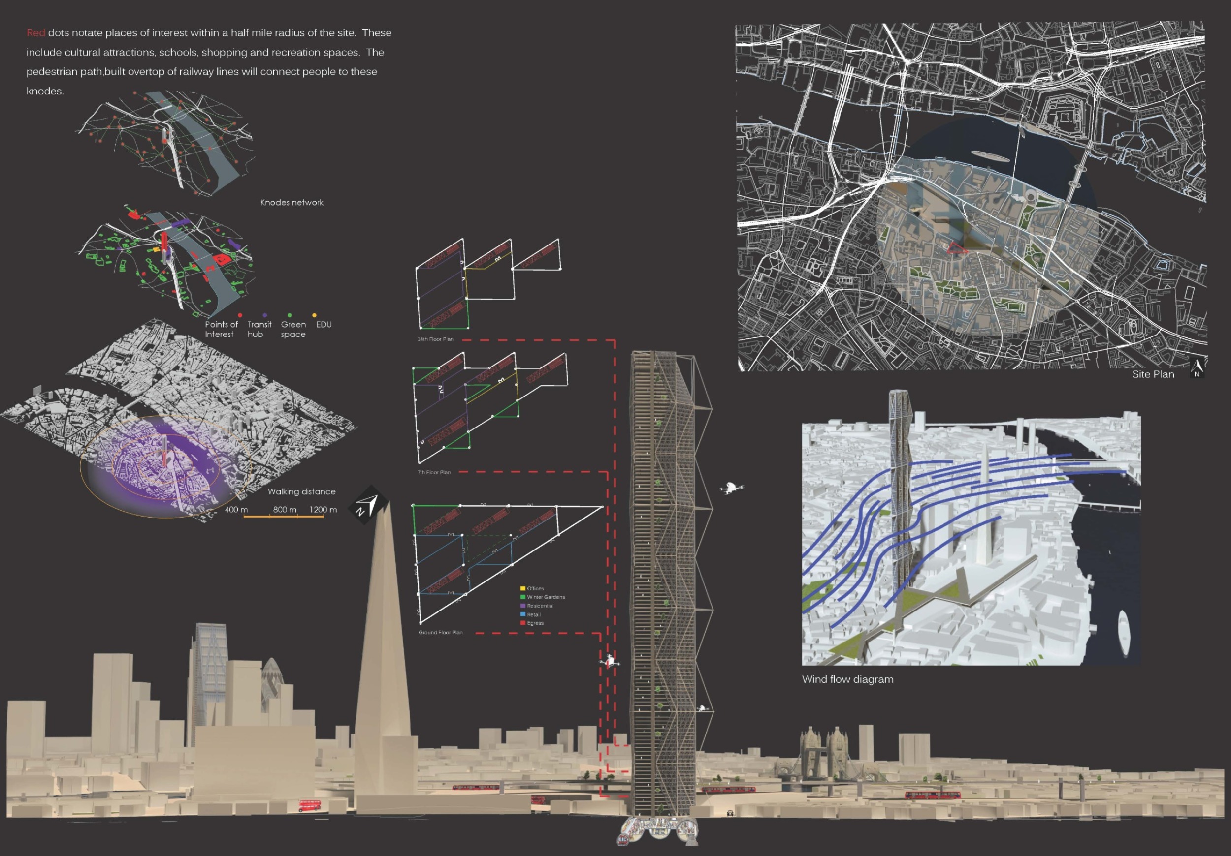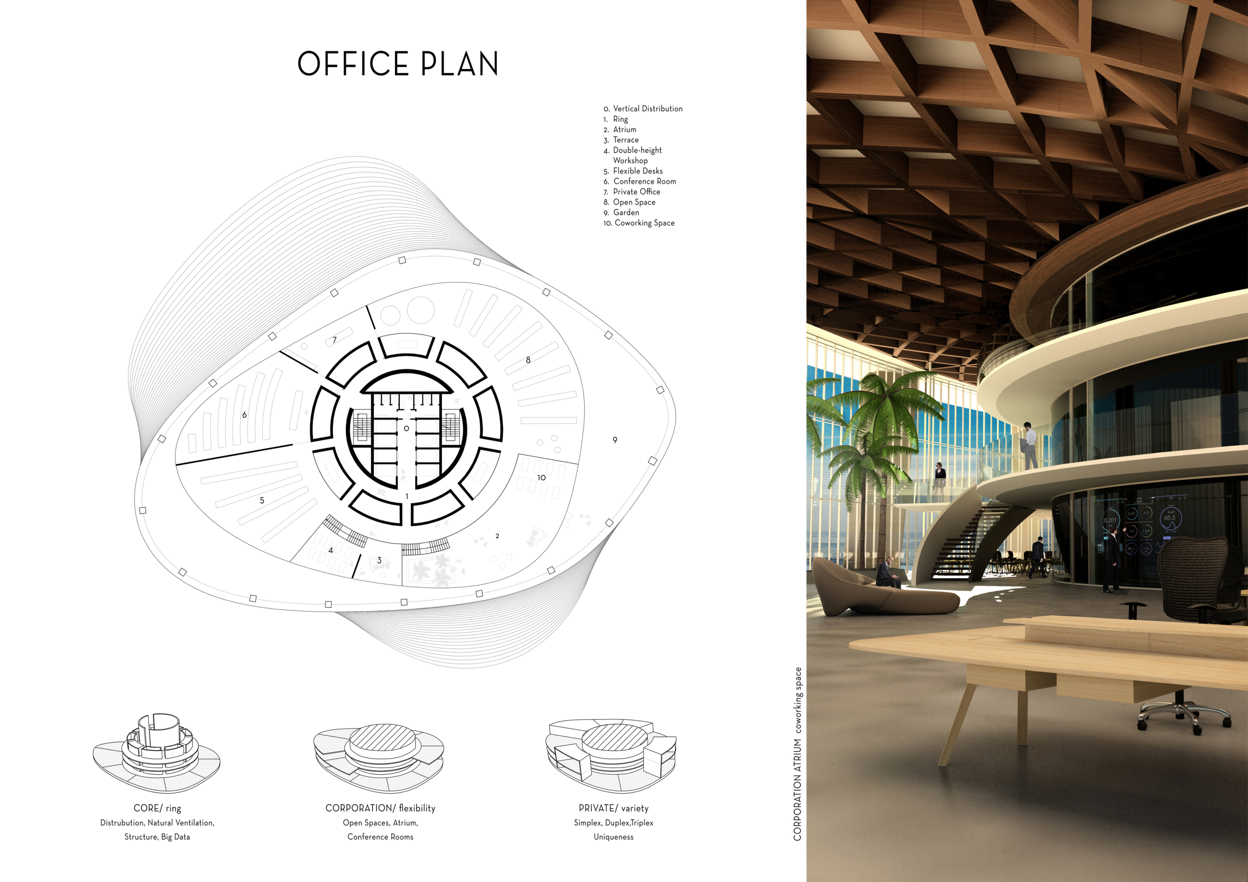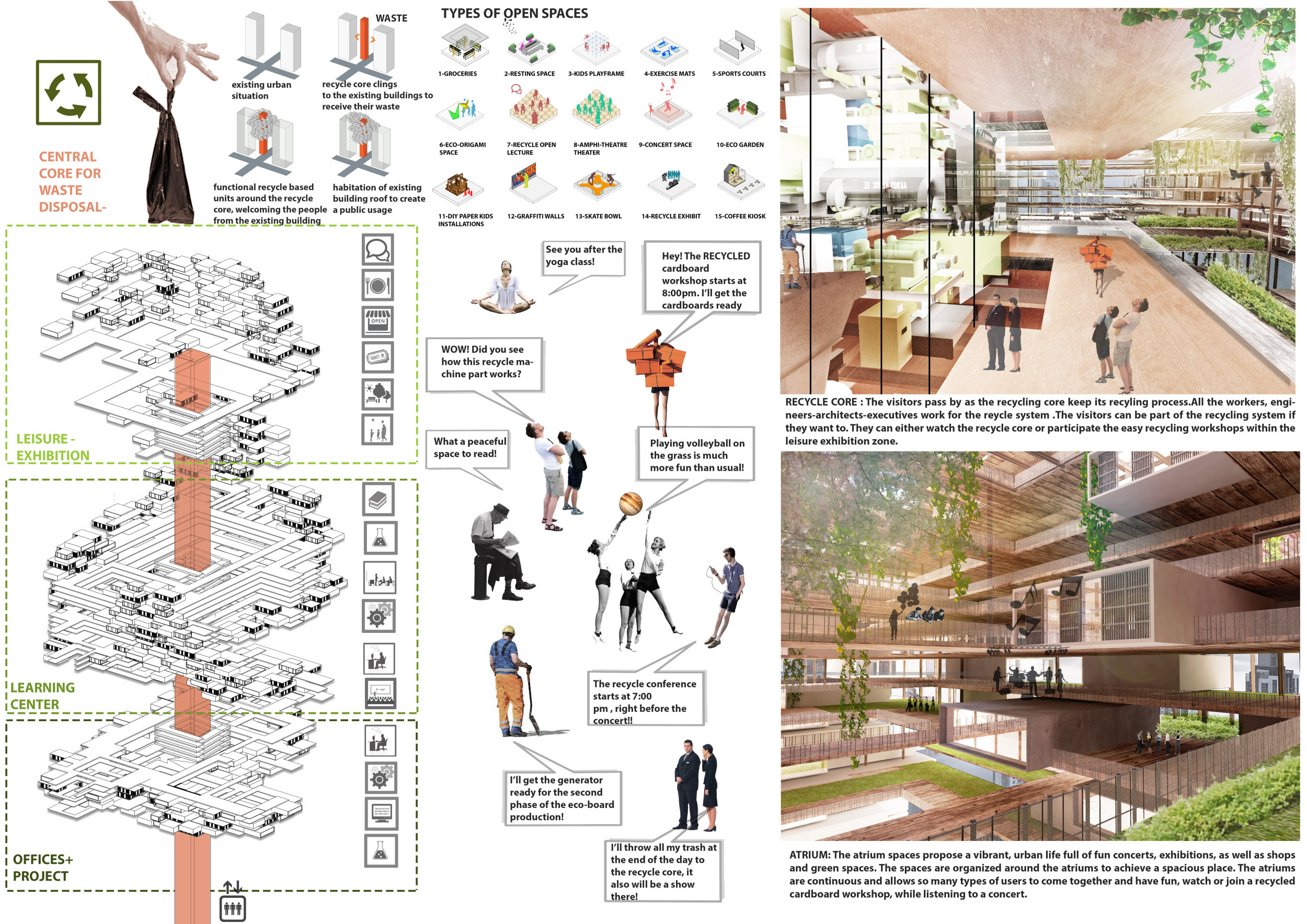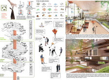 There has been much demand for proposals considering the famous 'Chicago Spire' site which awaits development in that city's downtown. Though the submission focuses on this particular site, the design has the potential to be used anywhere. A simple cylindrical tower is wrapped in a ribbon of perimeter green spaces that transform the typical office, and which are well-designed with details showing deep planters permitting the growth of trees and appropriate drainage.