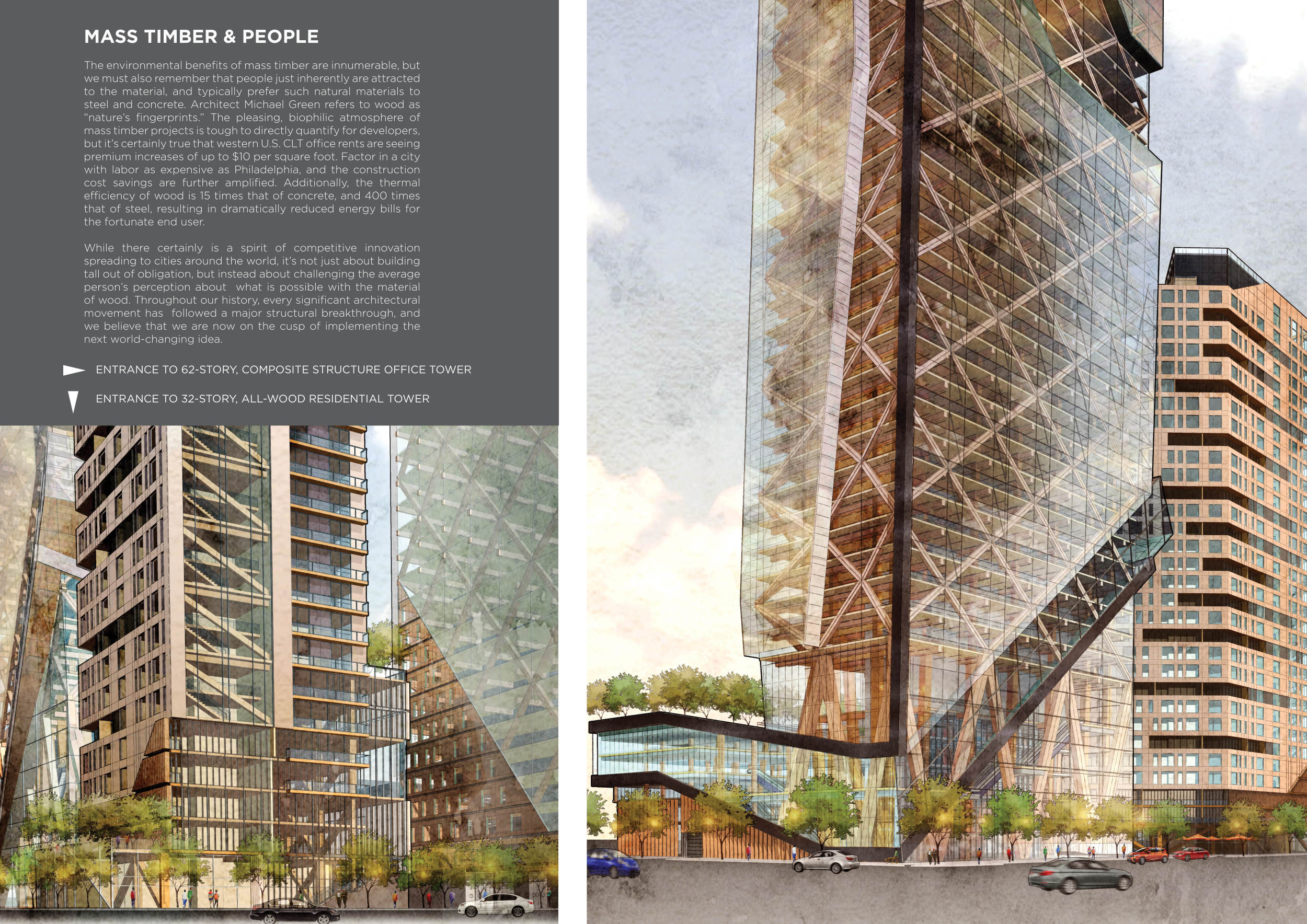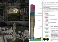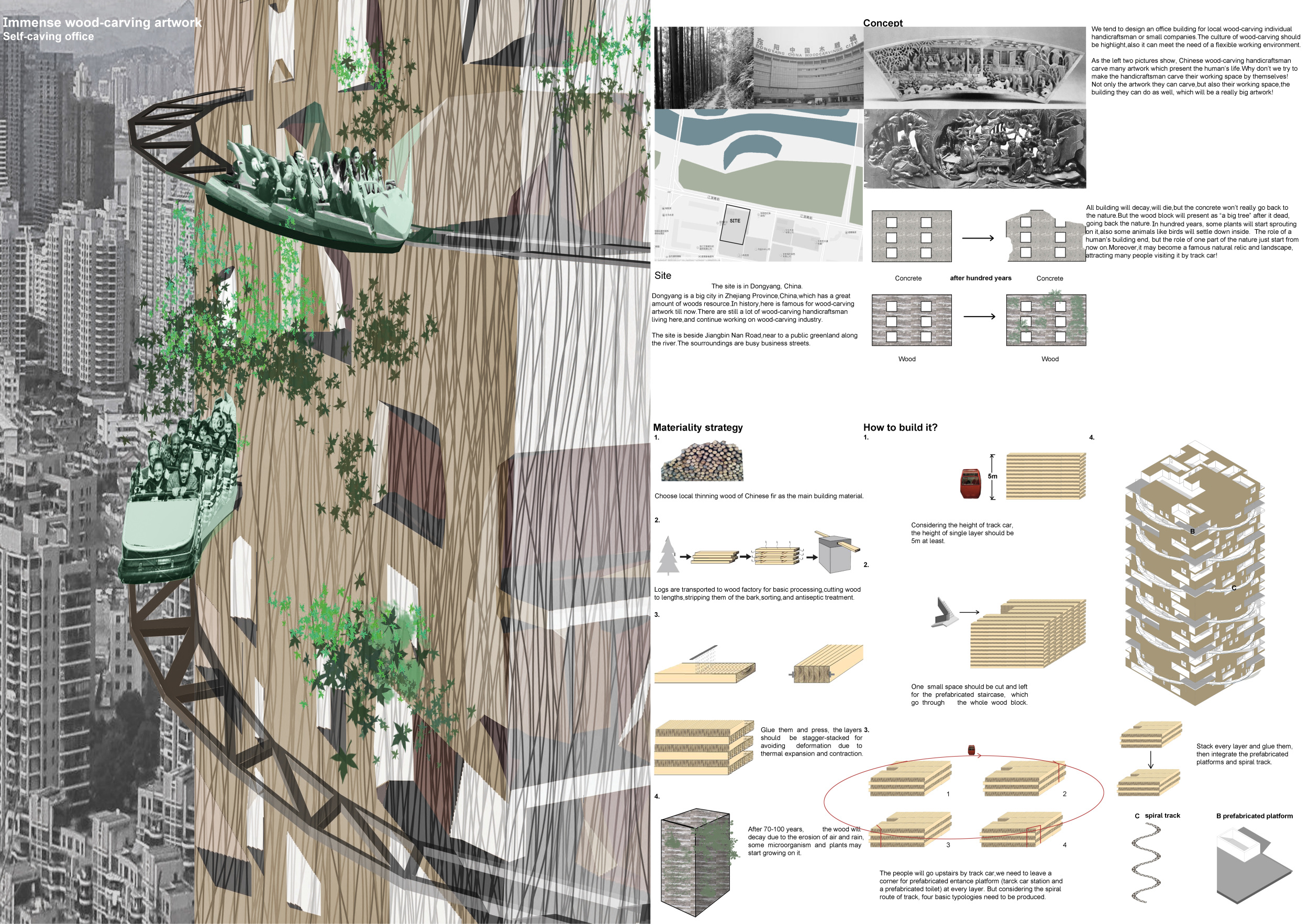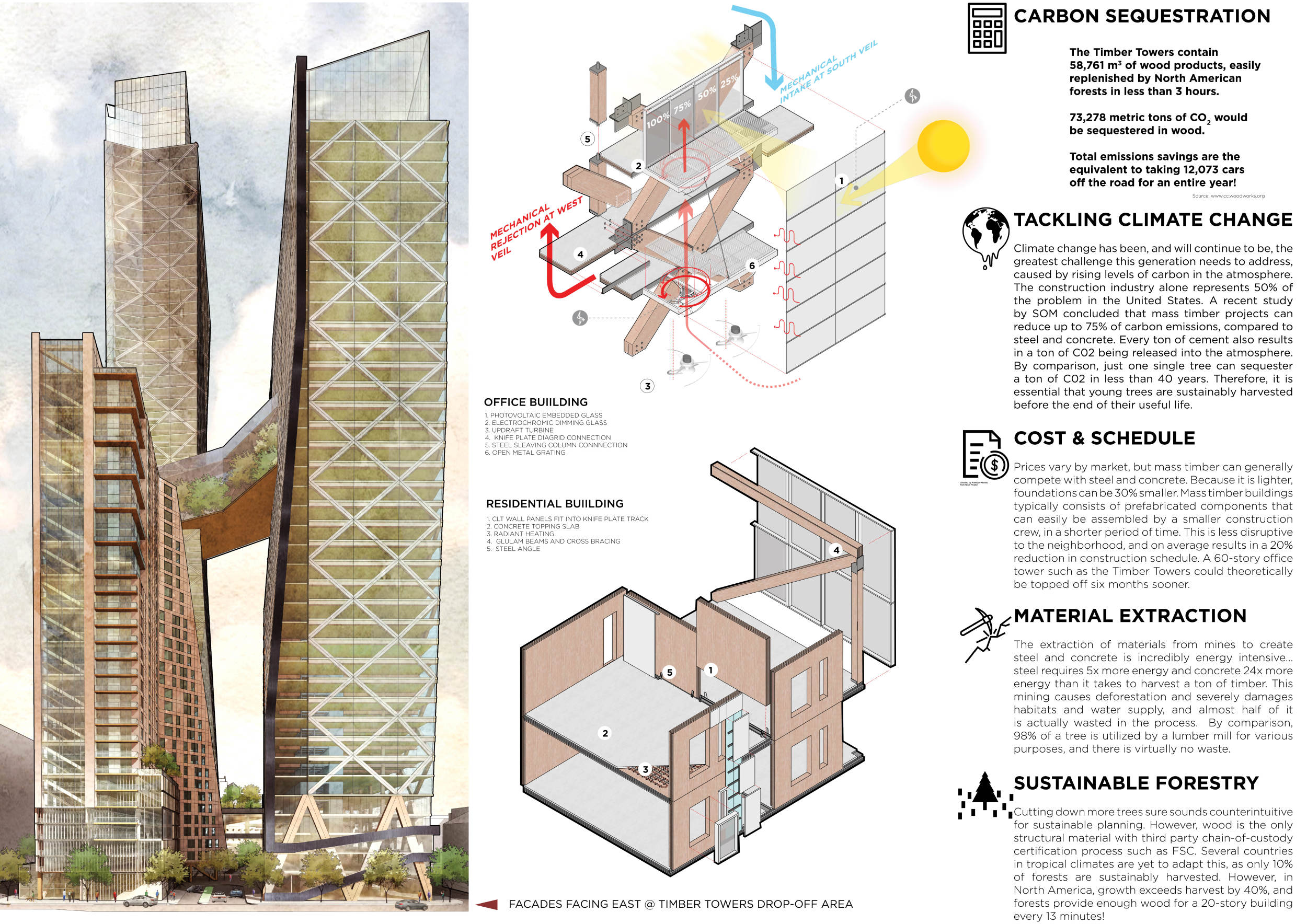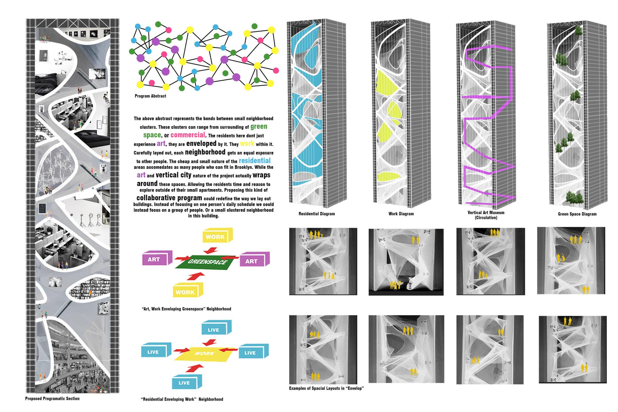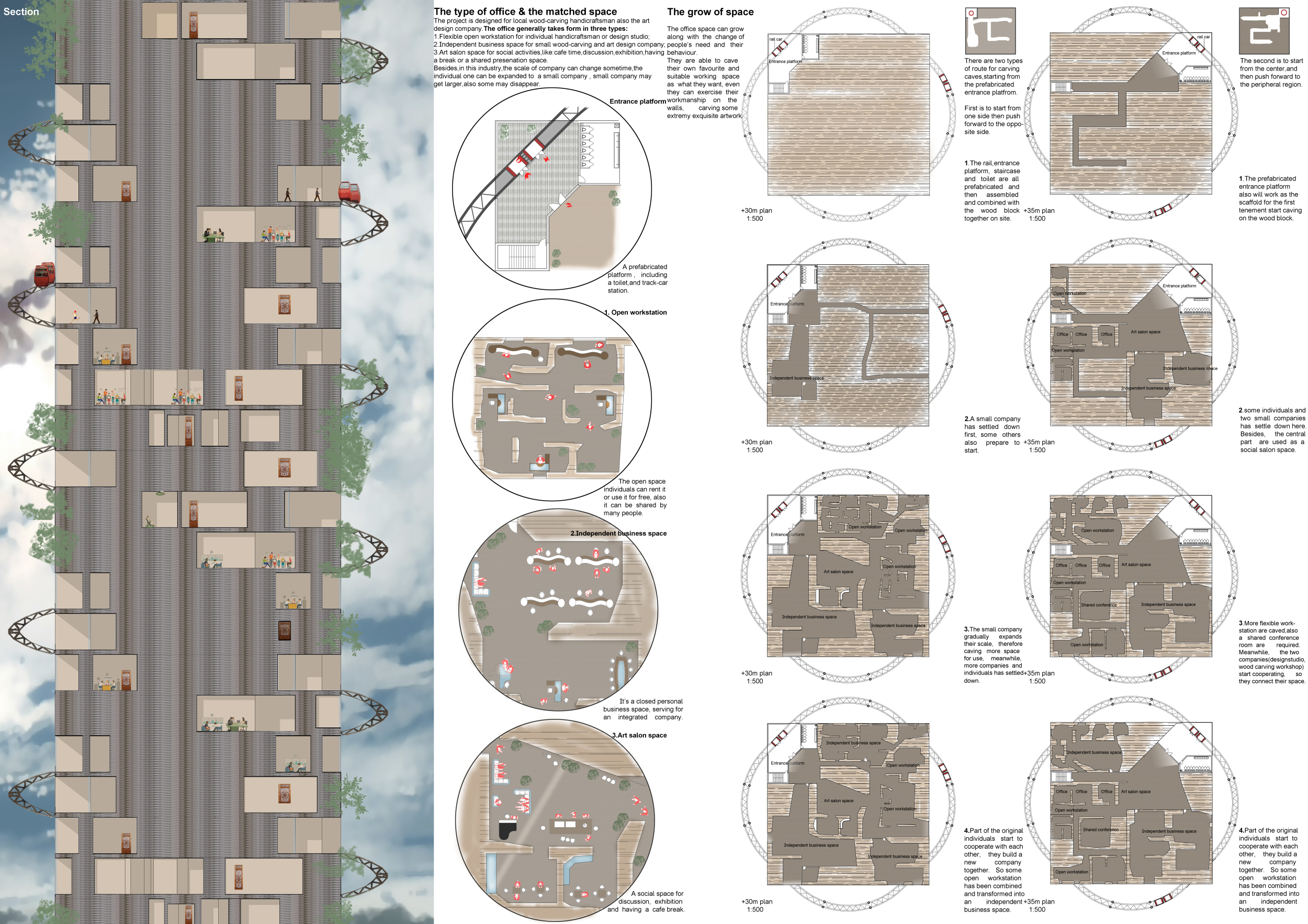 There has been much demand for proposals considering the famous 'Chicago Spire' site which awaits development in that city's downtown. Though the submission focuses on this particular site, the design has the potential to be used anywhere. A simple cylindrical tower is wrapped in a ribbon of perimeter green spaces that transform the typical office, and which are well-designed with details showing deep planters permitting the growth of trees and appropriate drainage.