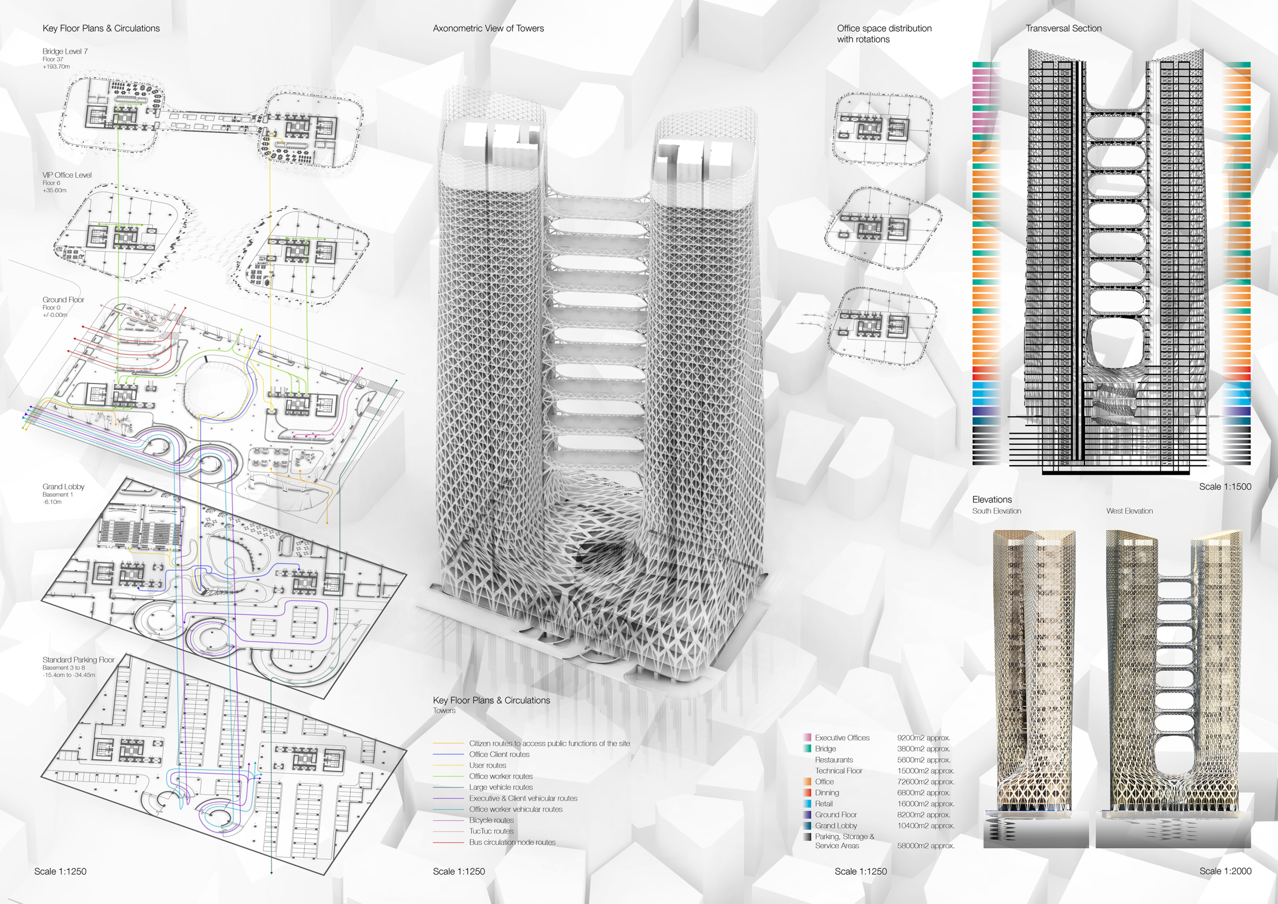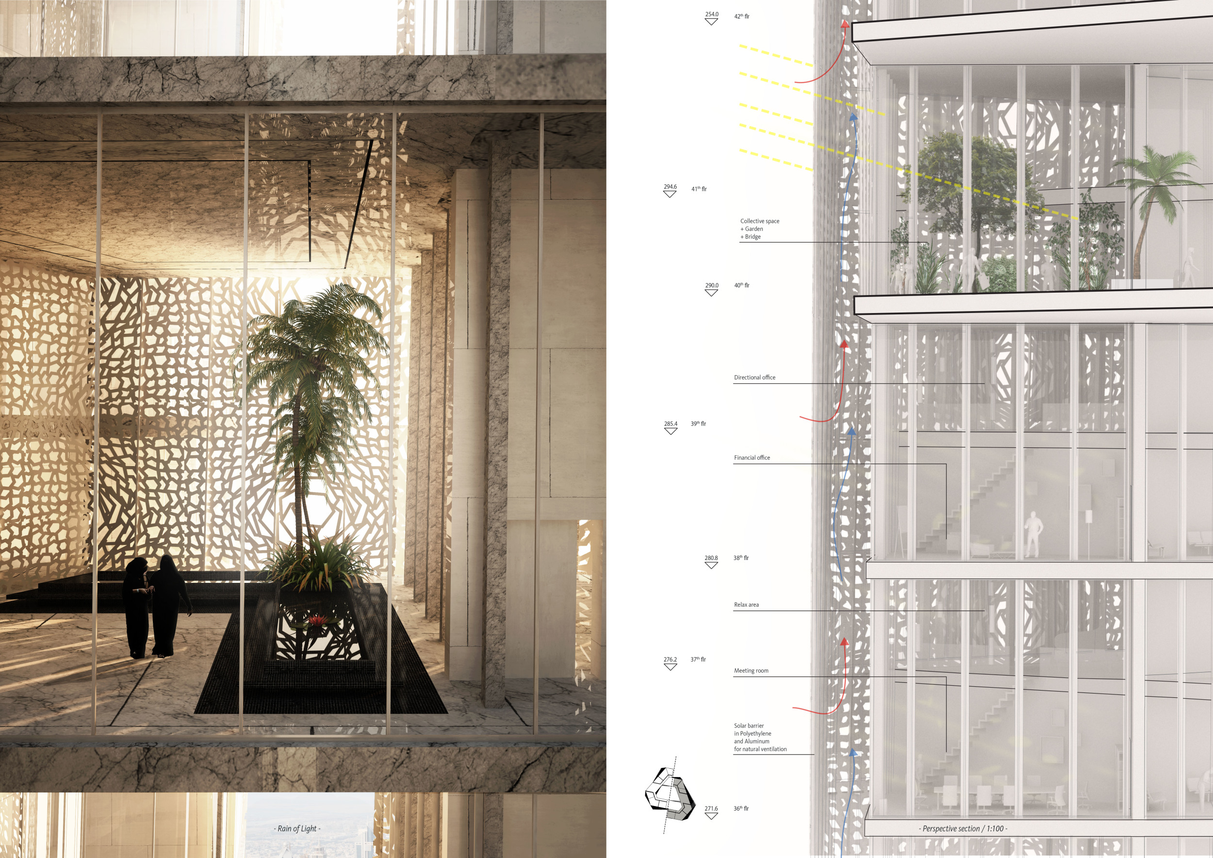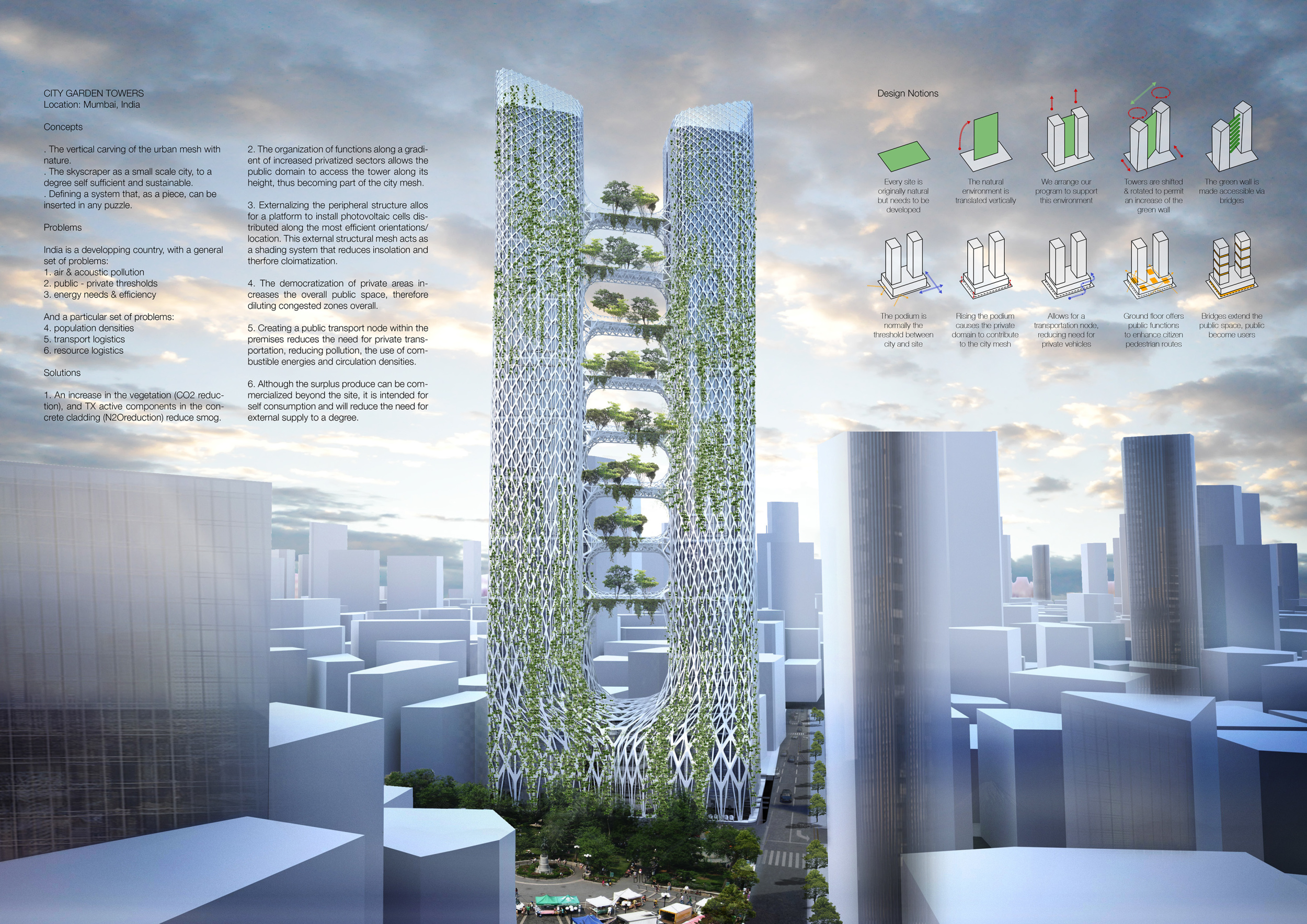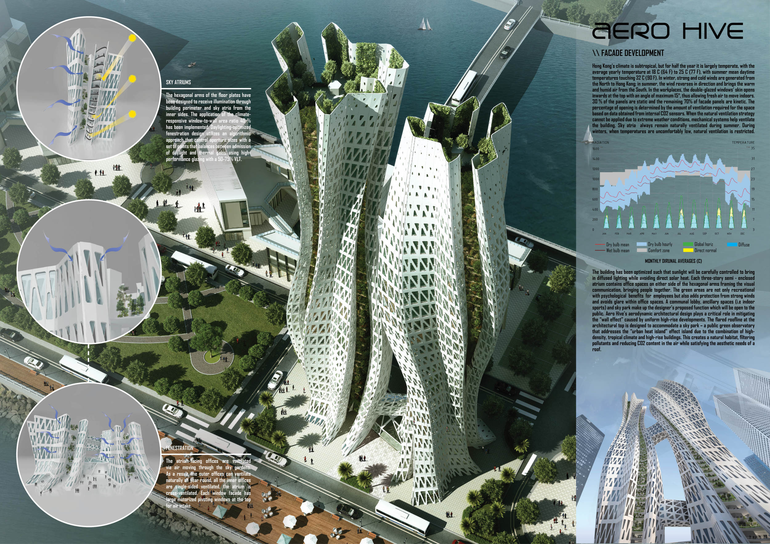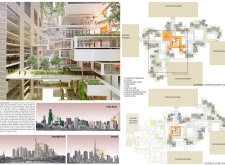 The design resolves a large site by dividing the volume into two towers, reducing the monumentality of the high-rise with a porous and organic form. Each tower is further fragmented into three semi-opaque vertical elements connected by spaces in transparent glass which allow daylight to reach the core, and permit outward views surrounding the proposed Hong Kong site. The towers are connected at mid-height by a sky-bridge and each features a dense rooftop garden open to the sky.