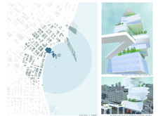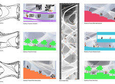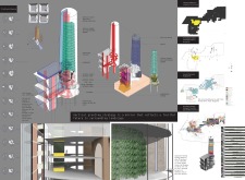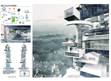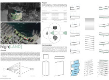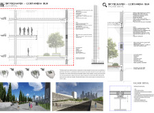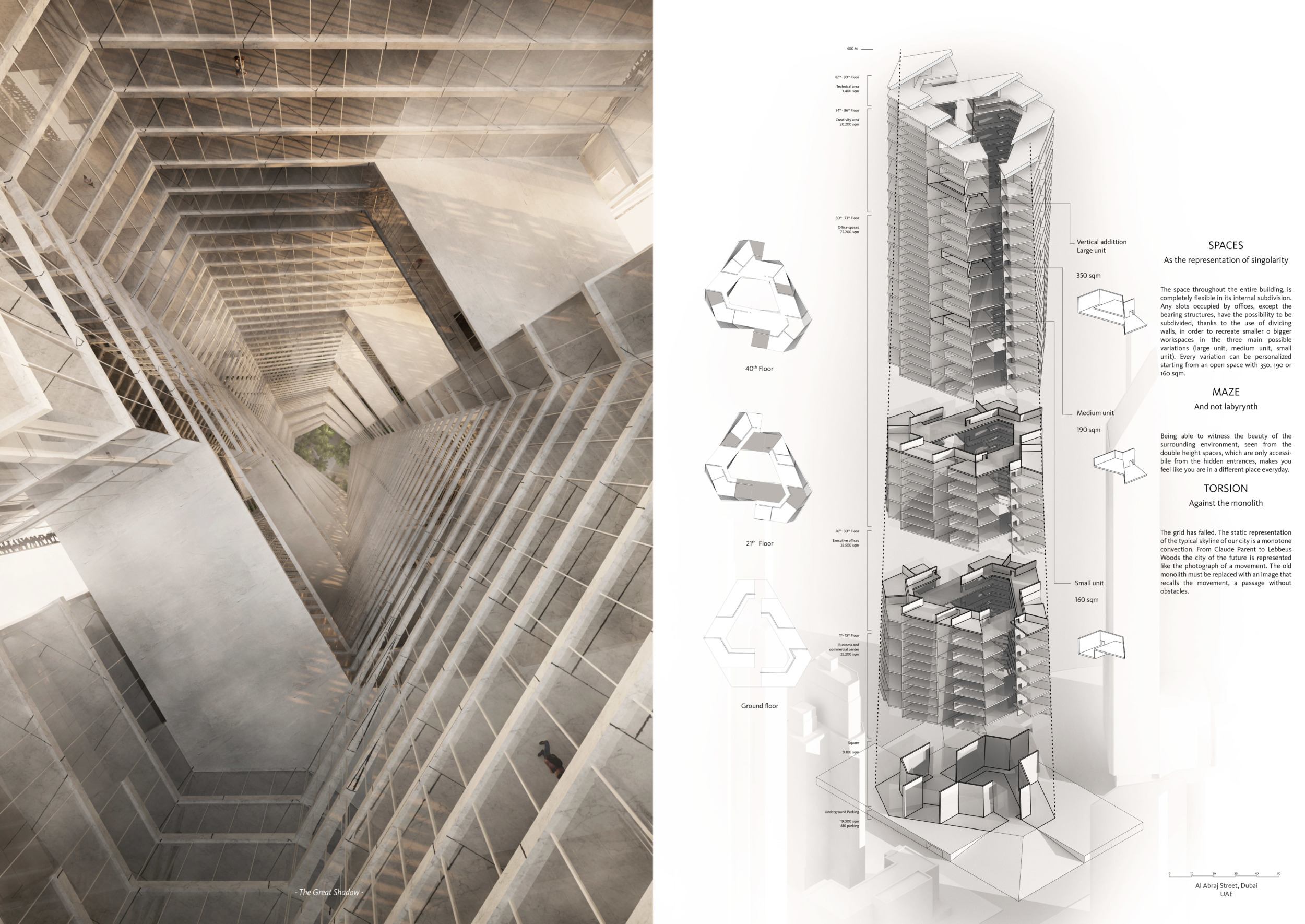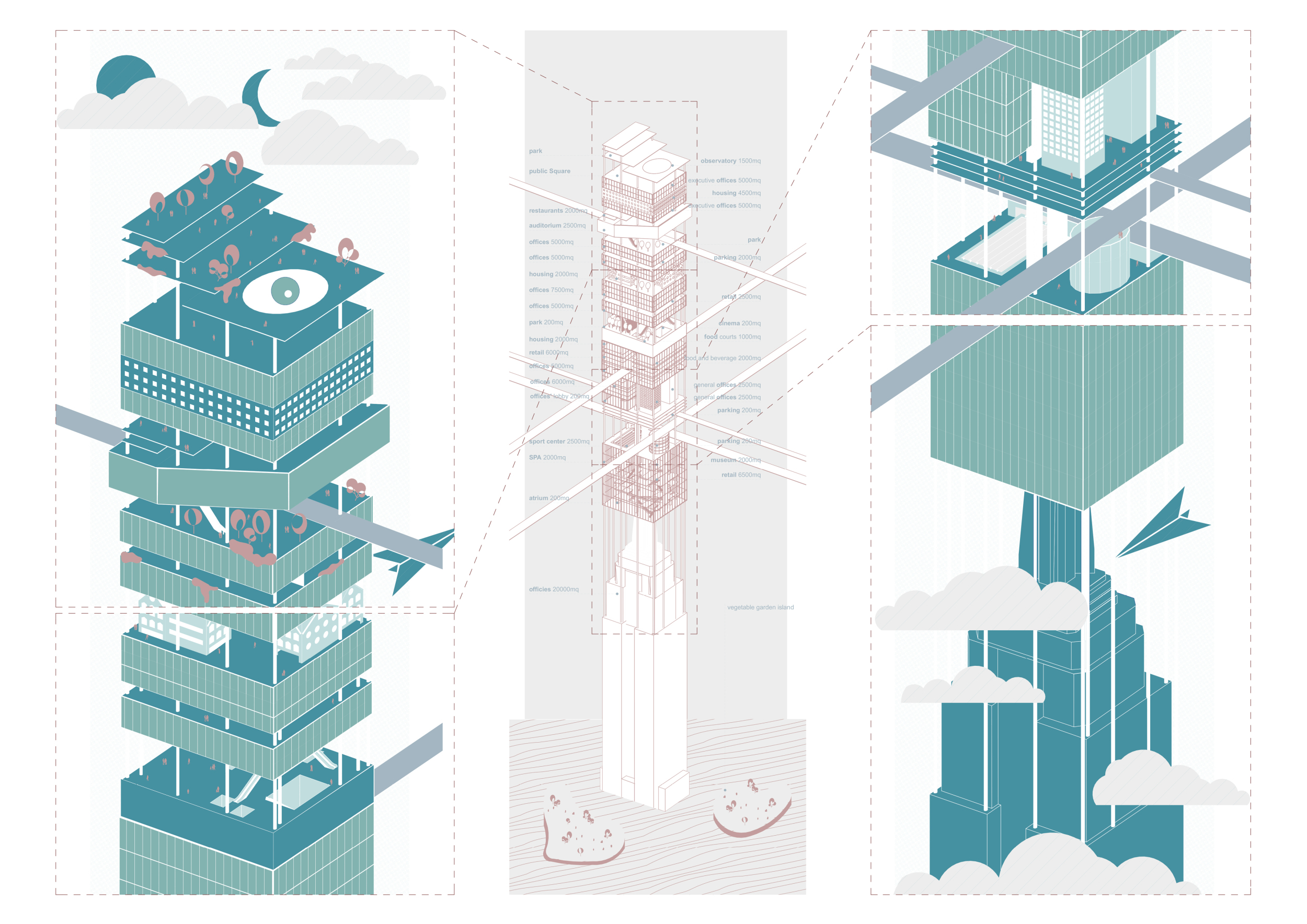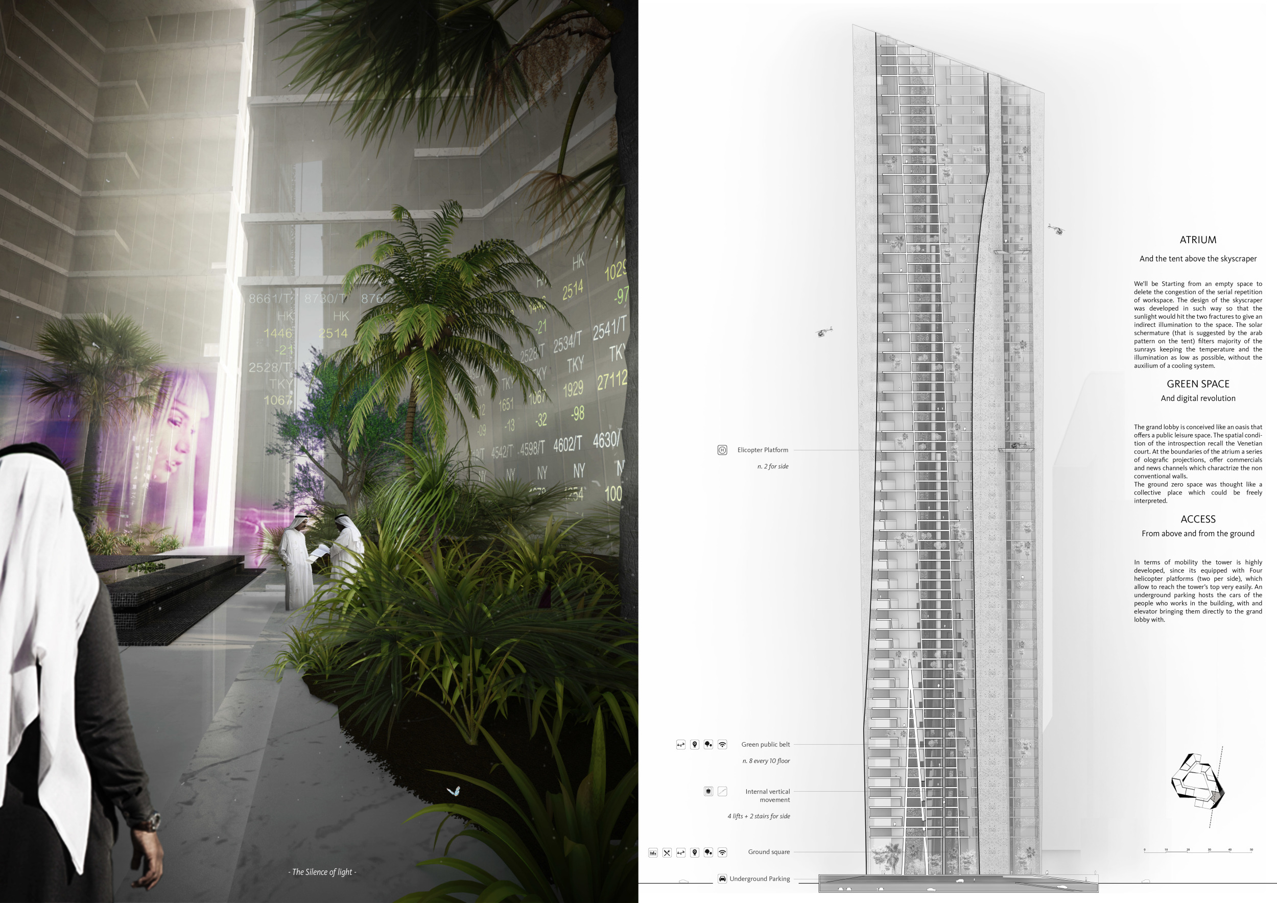 The design resolves a large site by dividing the volume into two towers, reducing the monumentality of the high-rise with a porous and organic form. Each tower is further fragmented into three semi-opaque vertical elements connected by spaces in transparent glass which allow daylight to reach the core, and permit outward views surrounding the proposed Hong Kong site. The towers are connected at mid-height by a sky-bridge and each features a dense rooftop garden open to the sky.