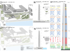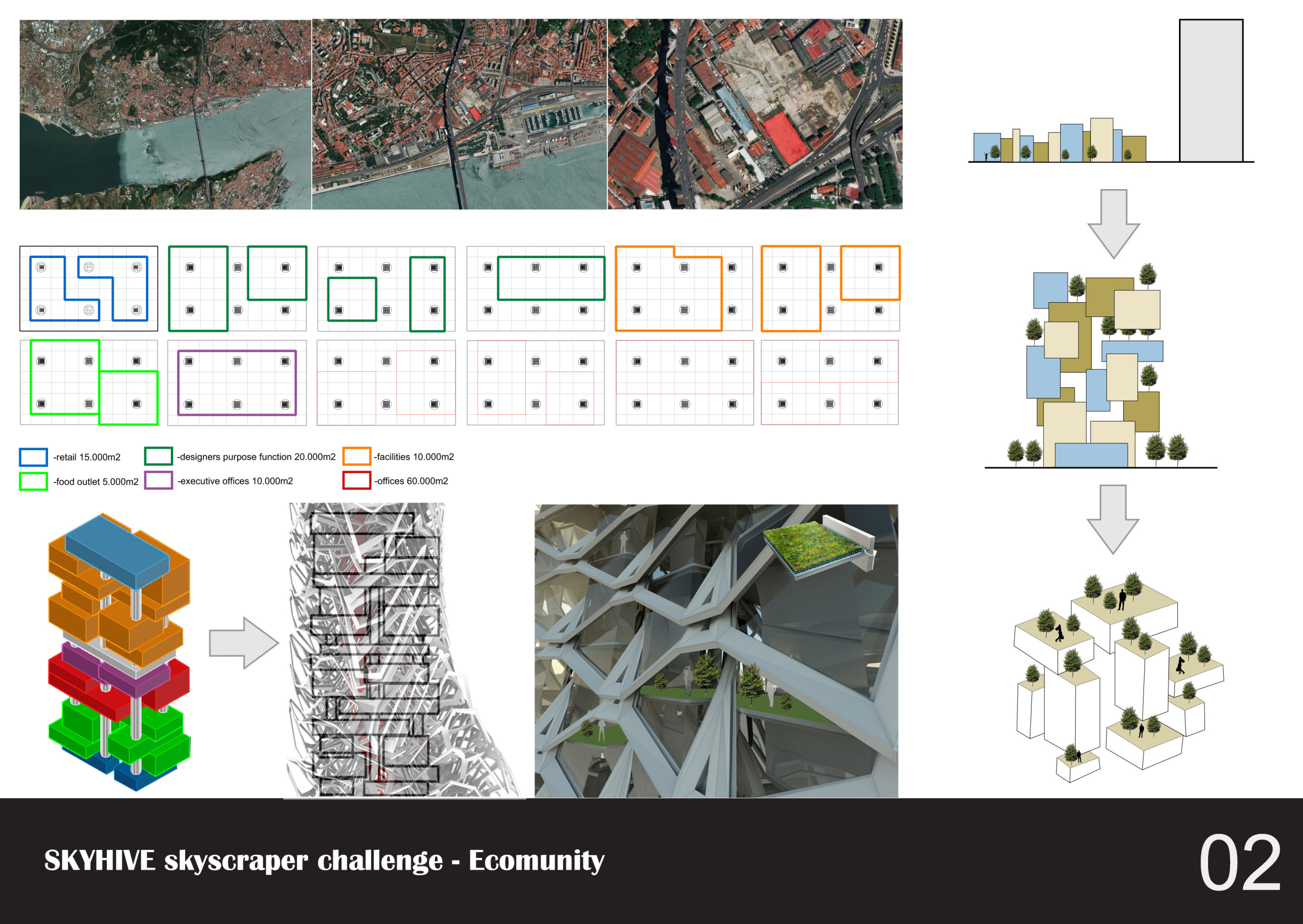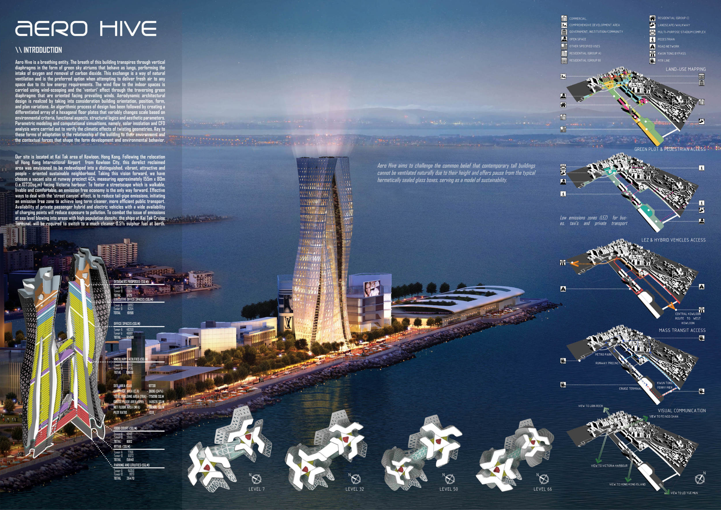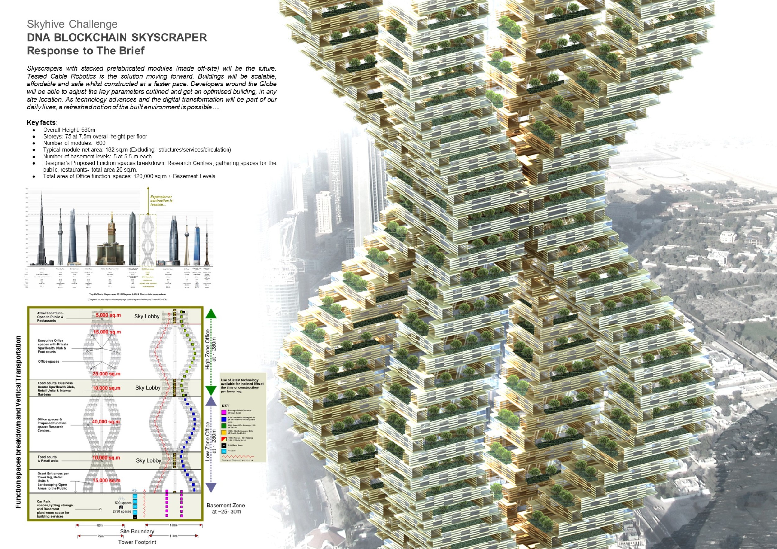 The SKYHIVE is an open architecture ideas competition, with few design restrictions: participants are free to interpret the brief as they choose. Proposals are not constrained by site, program or height. To place emphasis on the need for towers to recognize issues of density, the submitted design is requested to be limited to a site of 130x80m.