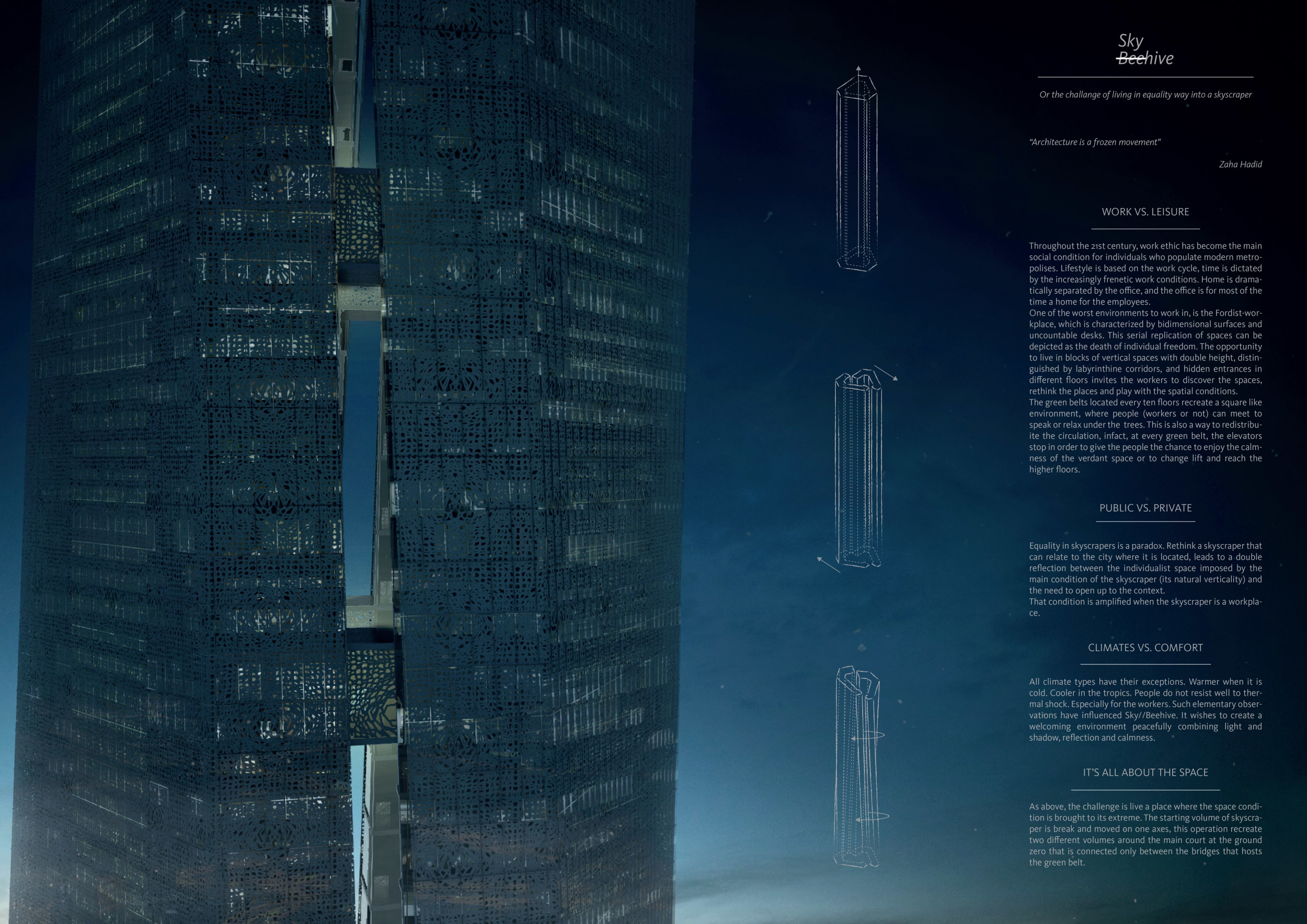 When we decided to join the SKYHIVE Skyscraper Challenge, our first participation in an architecture vision competition, we were fascinated by the idea to open our minds to a new design topic.