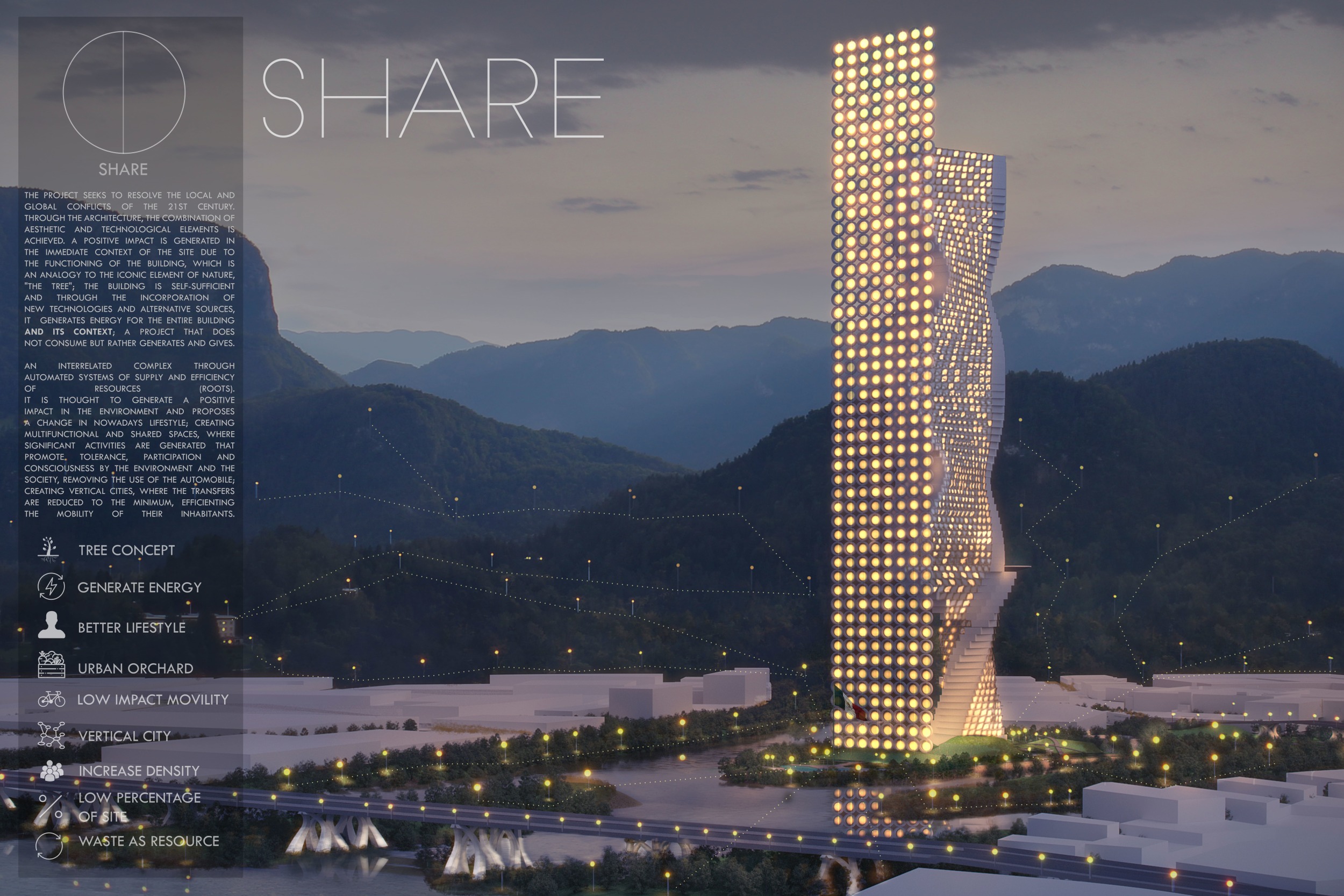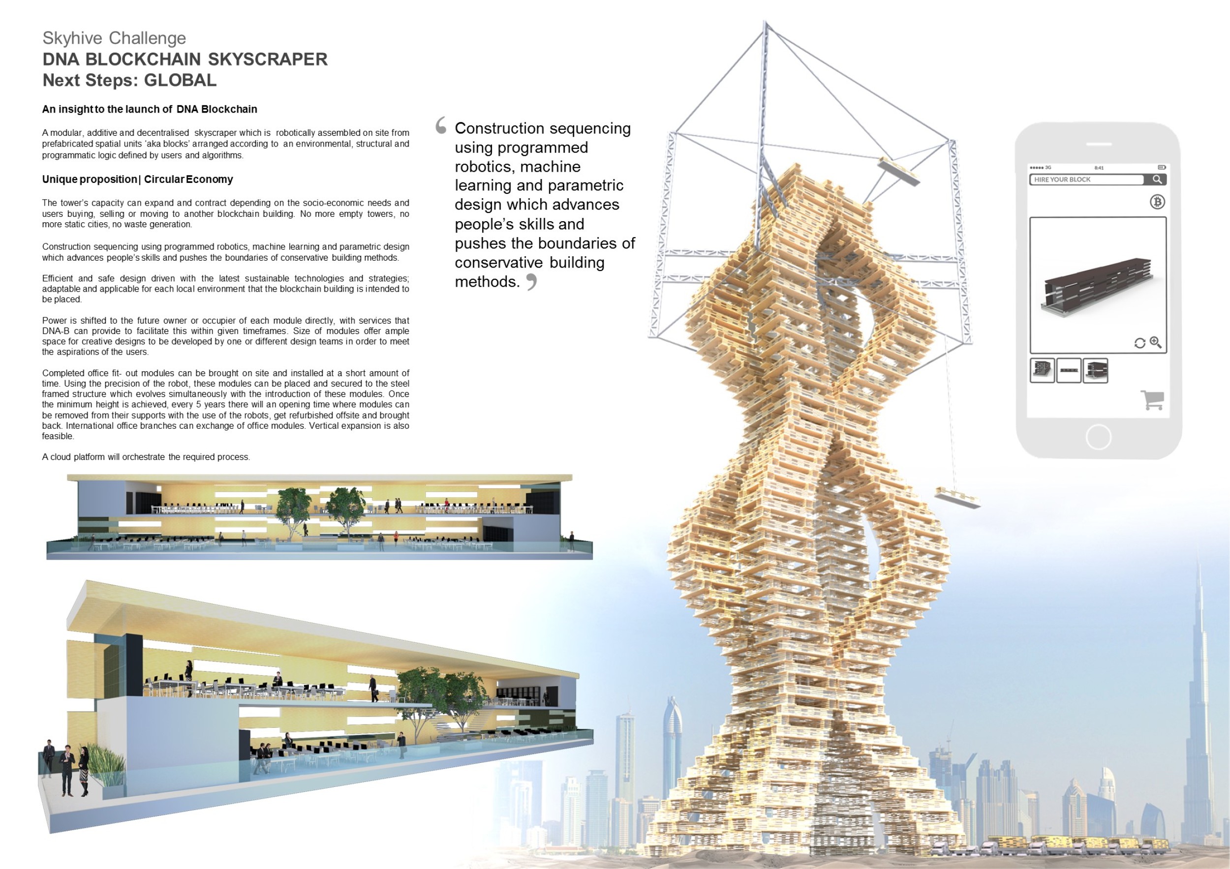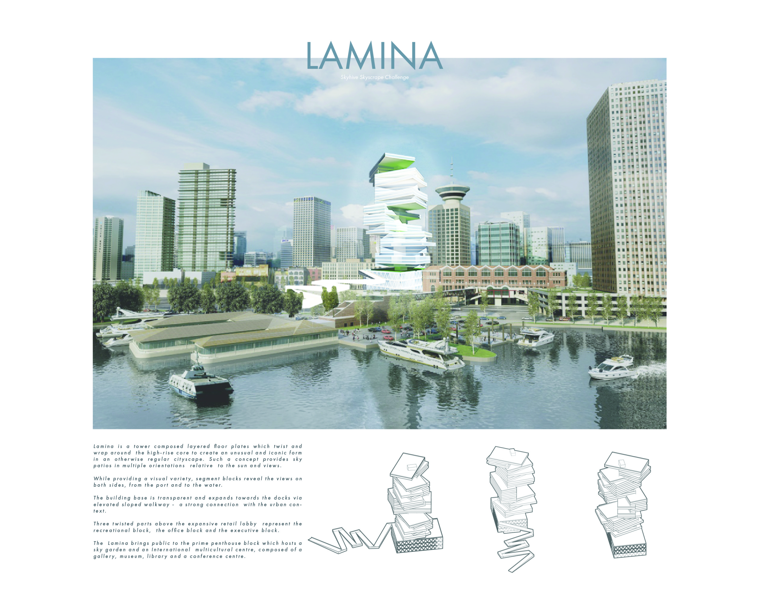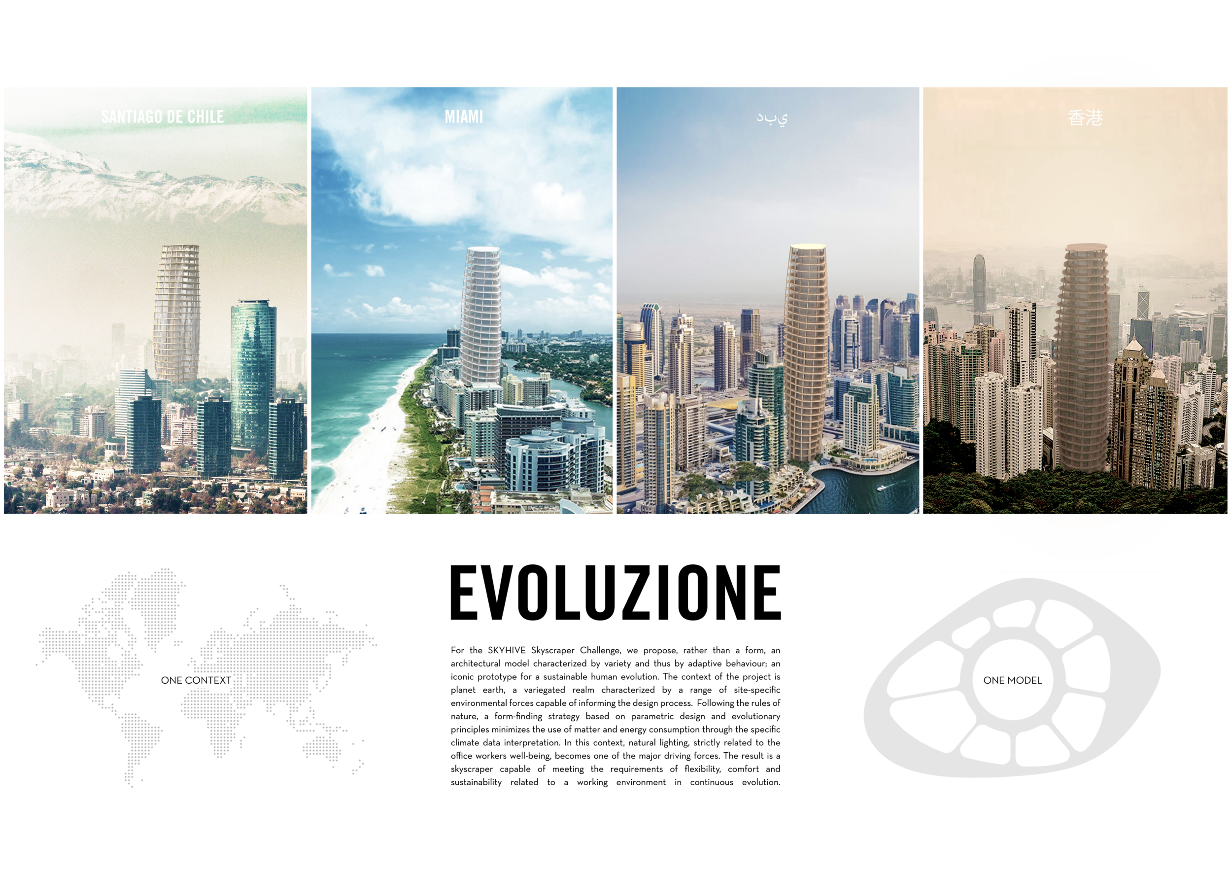 The purpose of the SKYHIVE Skyscraper Challenge is to generate design ideas for iconic high rise buildings in cities around the globe. Architects, design students, engineers, and artists are challenged to submit proposals that question the potentials of high-rise construction, to redefine skyscraper design with new technologies, materials, programs, forms, facade solutions and other tools.