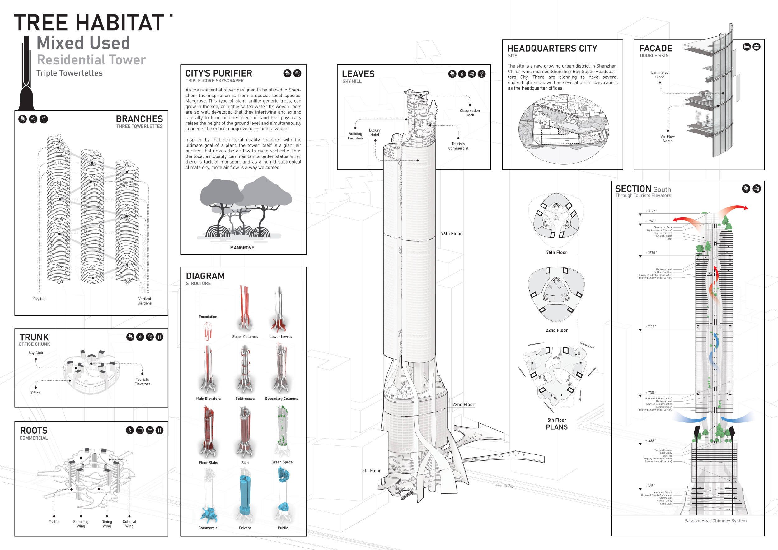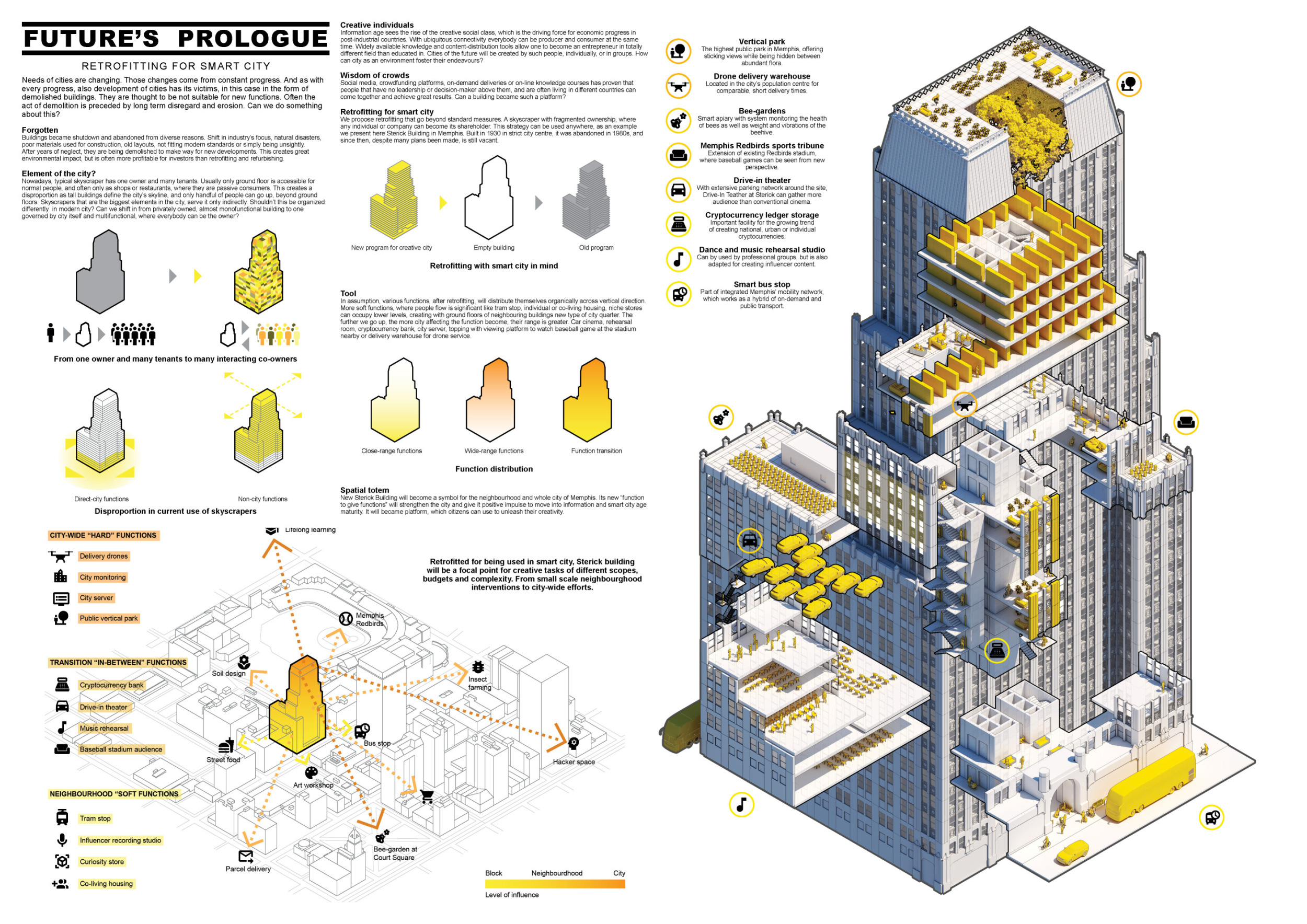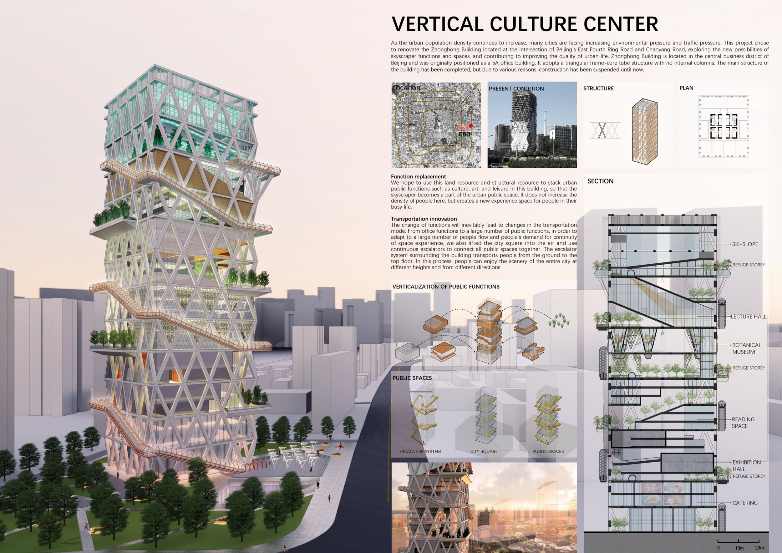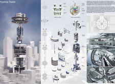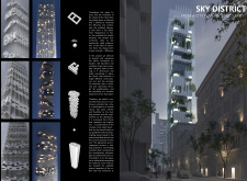 State of the Art Plaza is described by one juror as “if not by OMA, then a love letter to them, their diagrammatic clarity, and purity of form. Deserving for this alone and for the unlikely thought of making one nostalgic for a time two decades ago.” The project’s concept of three primary function types supported by a public plaza is clear and successfully examines the notion of vertical singularity. Read more The horizontal tower formation at the top as a public destination offers a variety of uses and alternative purpose to the city. The illustrations are simple yet concise and strong.