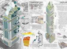 Adapting Obsolescence proposes an ephemeral tower that soars upward from the architectural vestiges of the past. The jury commented, “The dramatic design is clearly presented, with sufficient thought devoted to the structure's relationship with both its residents and to community at large. Read more A proposition at first undertaken with humor and wit, and resolved with a determination for its commercial viability, managing to find a better building at the end of it all.” Through the simple act of embedding a façade more deeply into the body of the building, the designers have produced a solution to several aspects of the office-building-to-residences dilemma – reducing the distance from core to skin, and simultaneously providing inhabitants with outdoor spaces. The idea to not only renovate such structures, but also treat them as a base for future vertical construction is promising, though one suspects that this could still be done while maintaining the historic integrity of the infamous postmodern structure depicted.