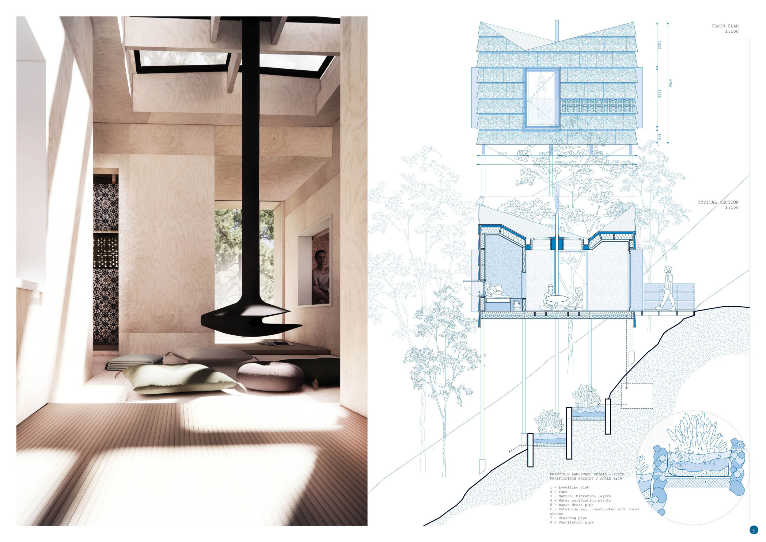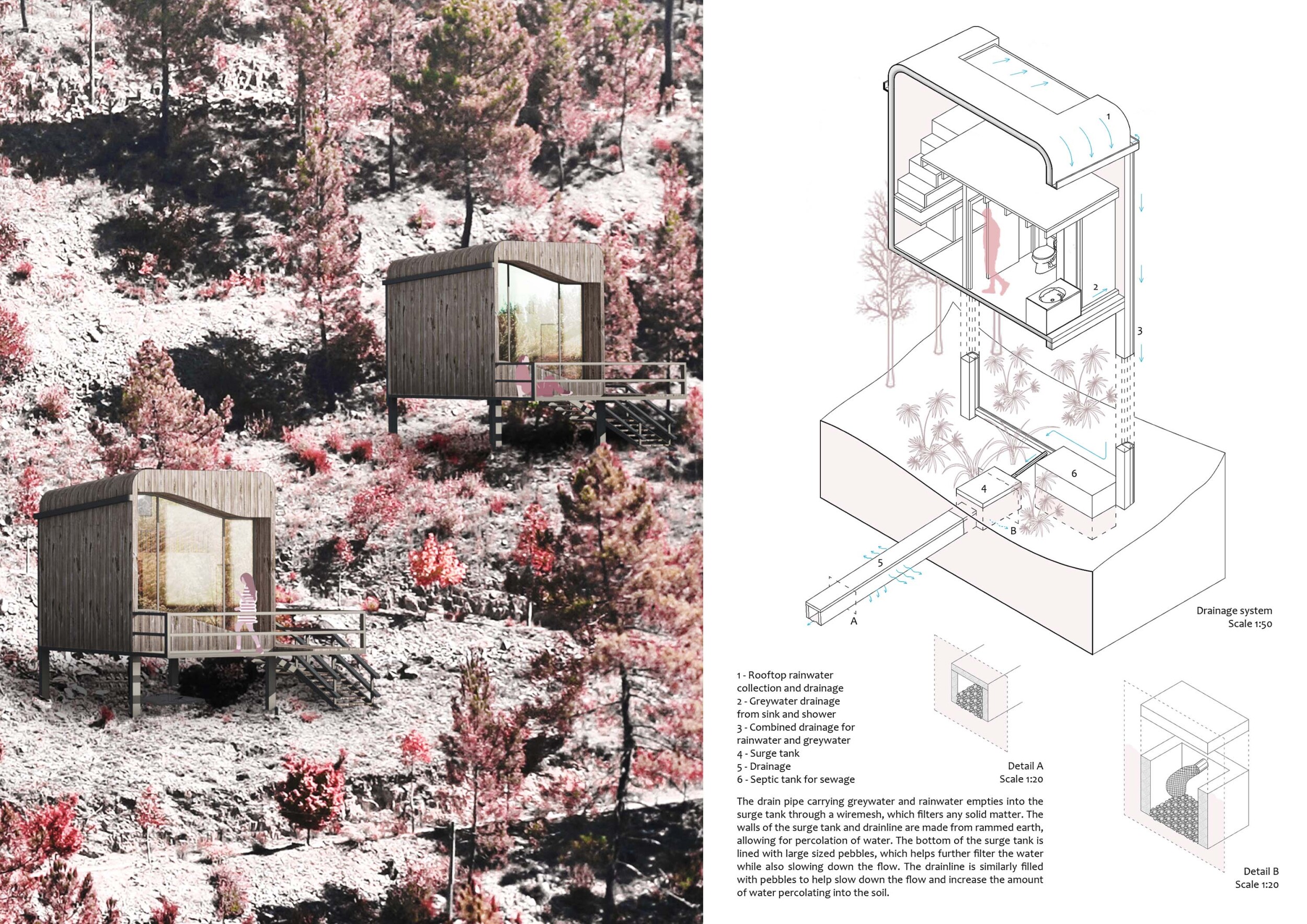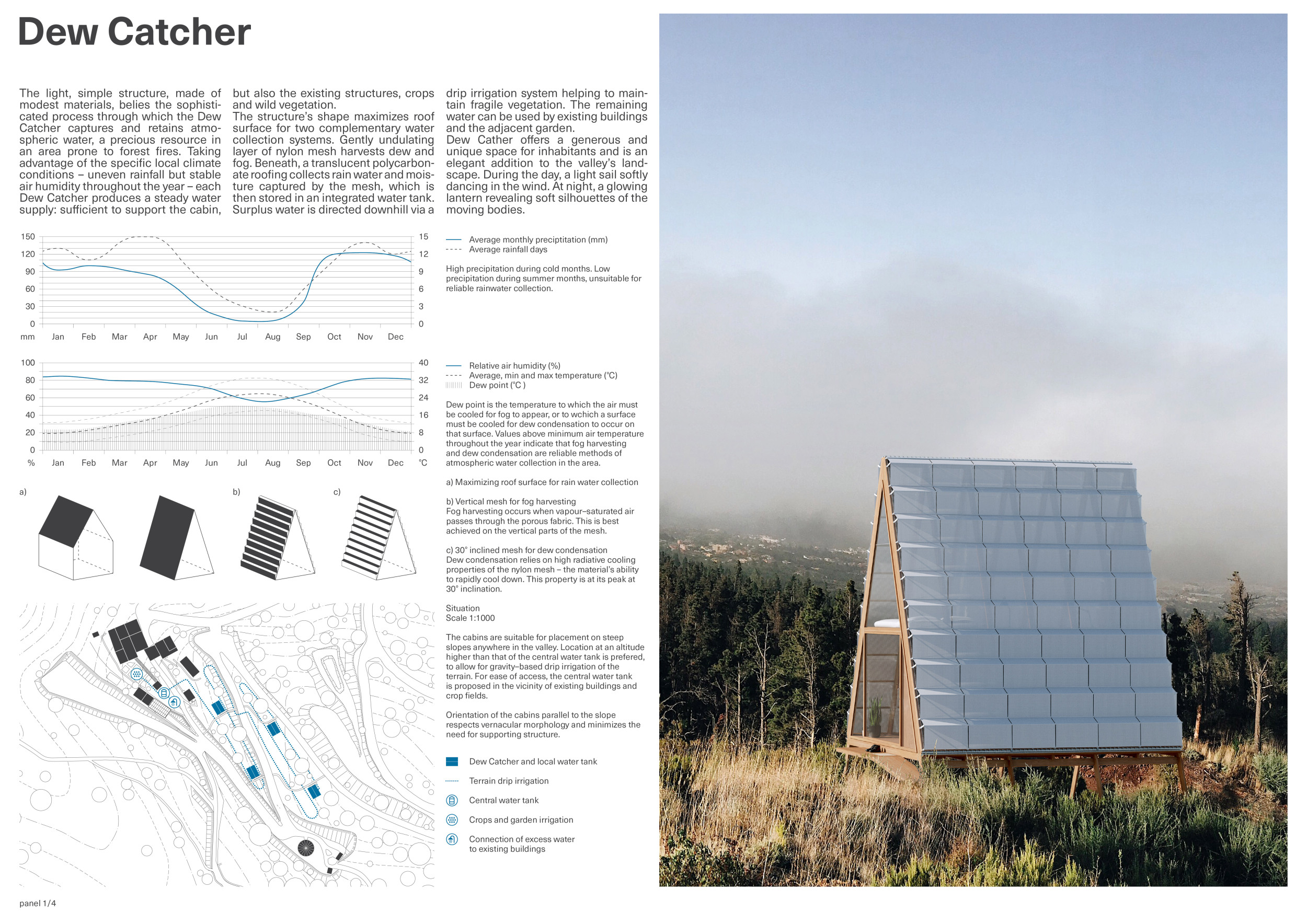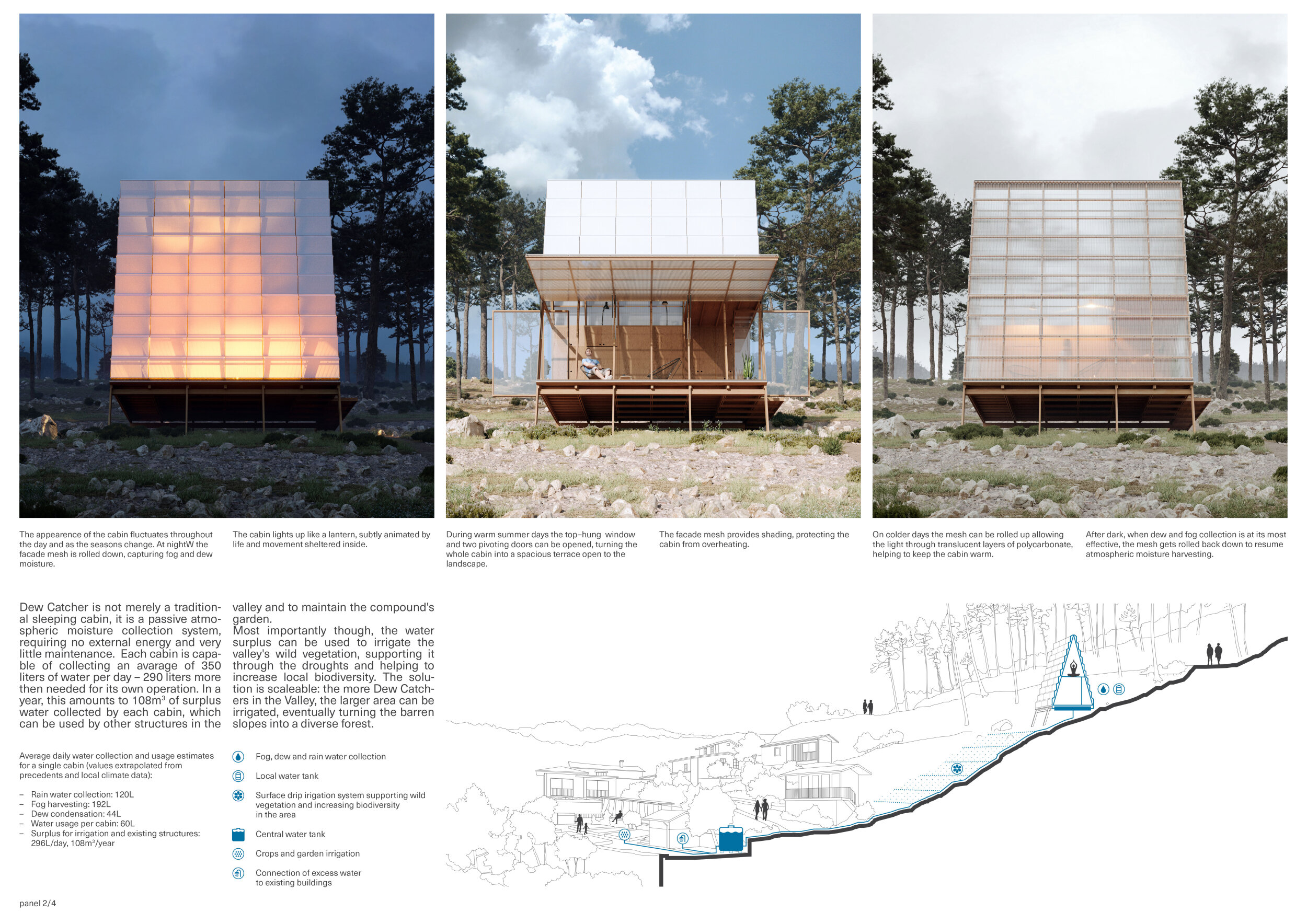 The jury favorite, ‘Dew Catcher’, proposes an A-frame structure with a stepped, transparent polycarbonate roof over layers of nylon mesh that capture dew and fog and thus supply water to the cabin and surrounding vegetation. The submission claims such a construction has the capacity to collect 350 liters daily.