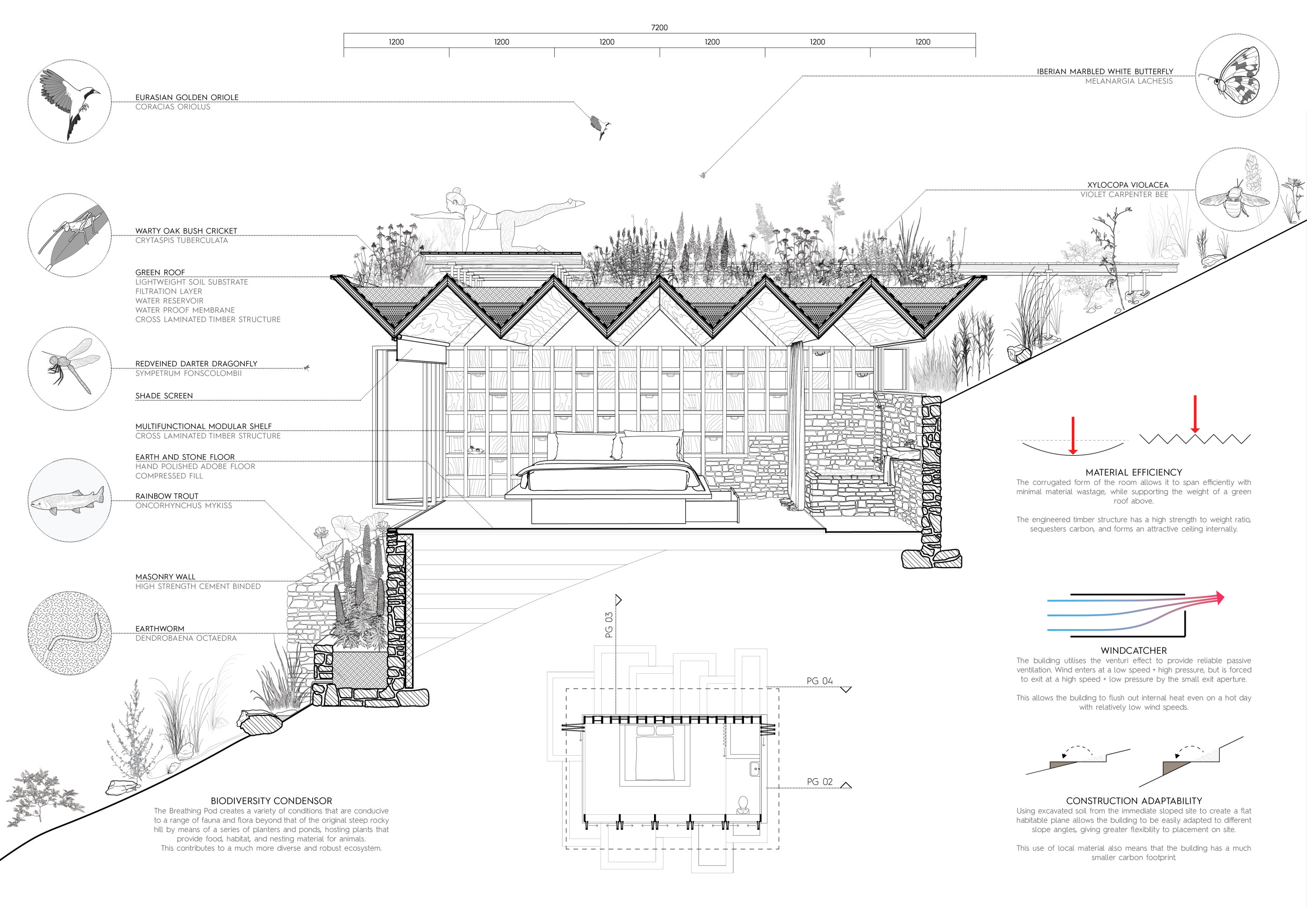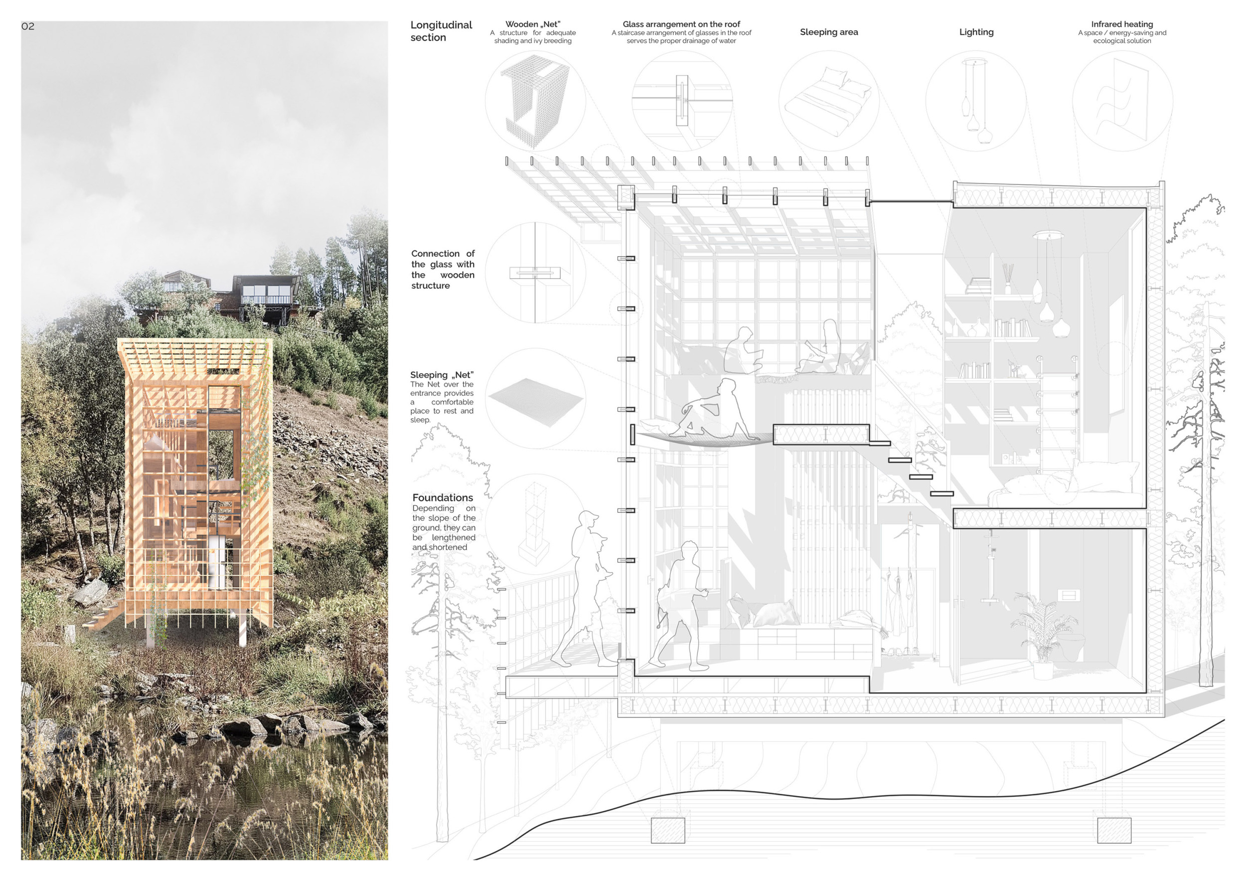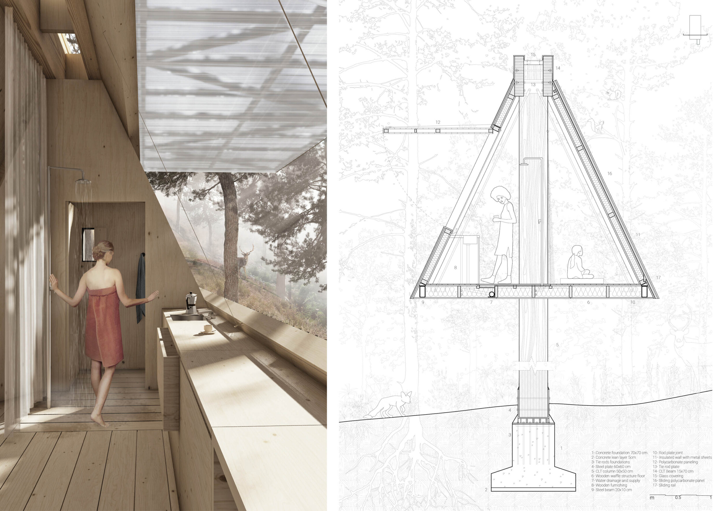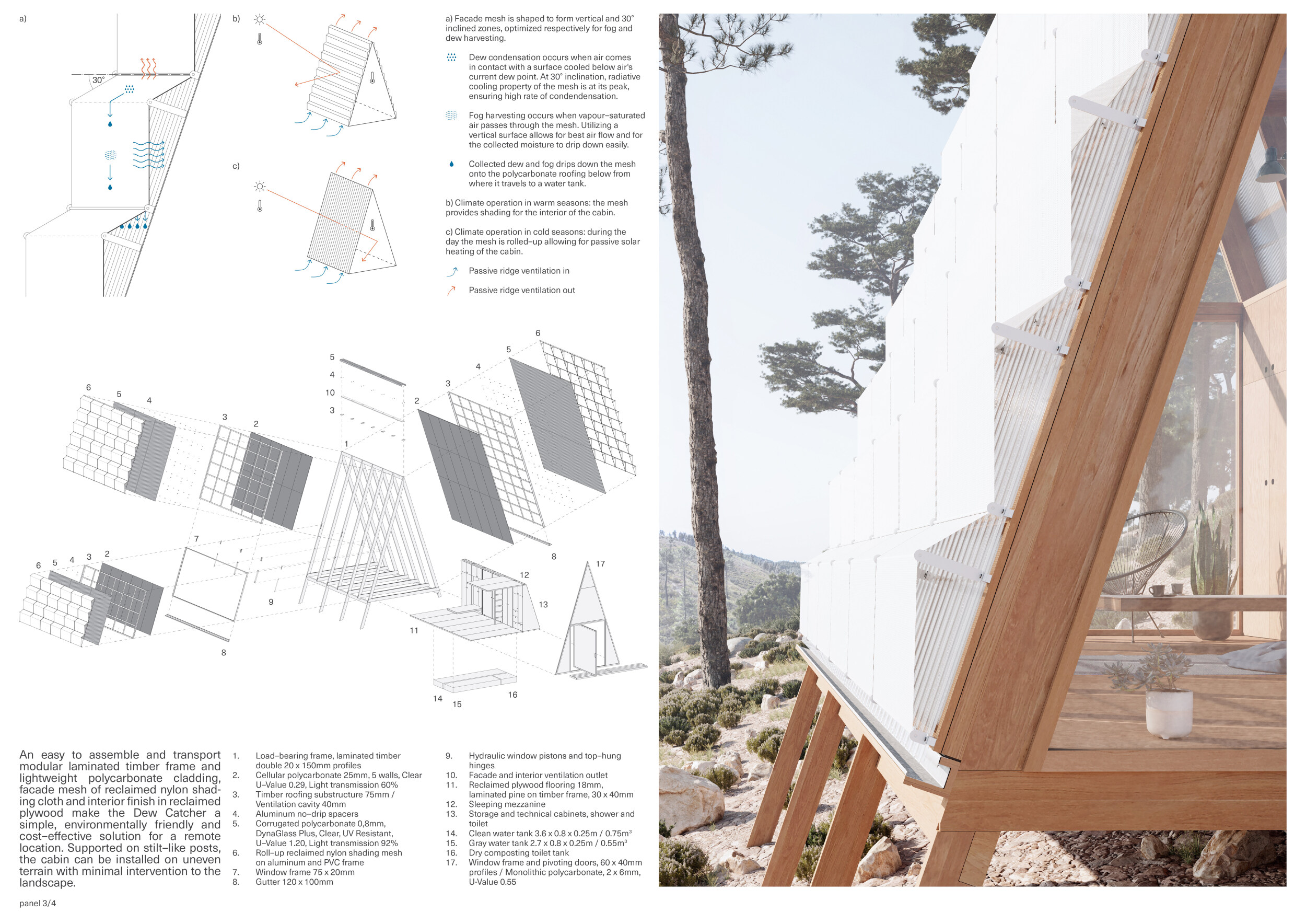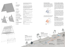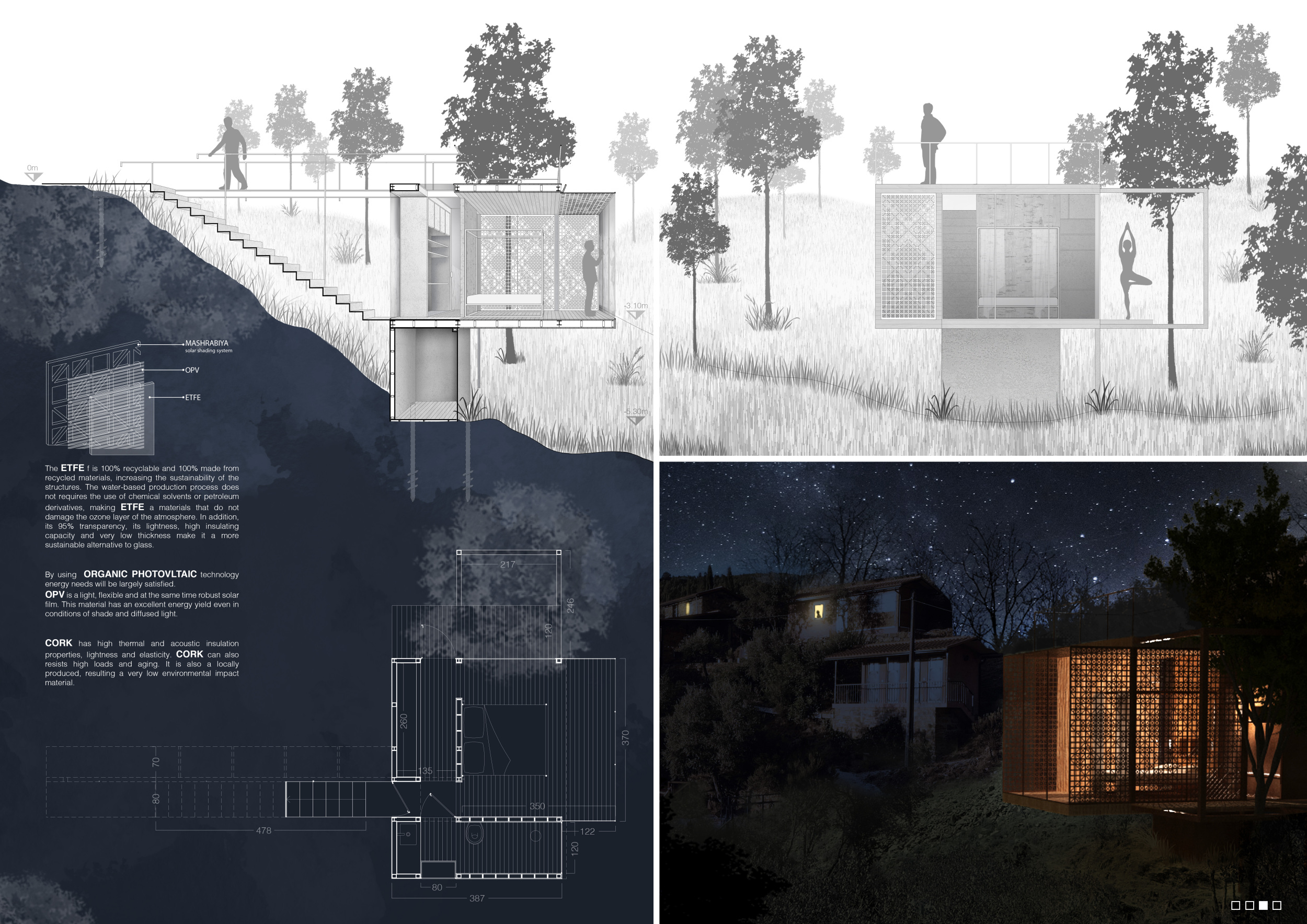 The jury favorite, ‘Dew Catcher’, proposes an A-frame structure with a stepped, transparent polycarbonate roof over layers of nylon mesh that capture dew and fog and thus supply water to the cabin and surrounding vegetation. The submission claims such a construction has the capacity to collect 350 liters daily.