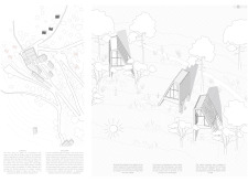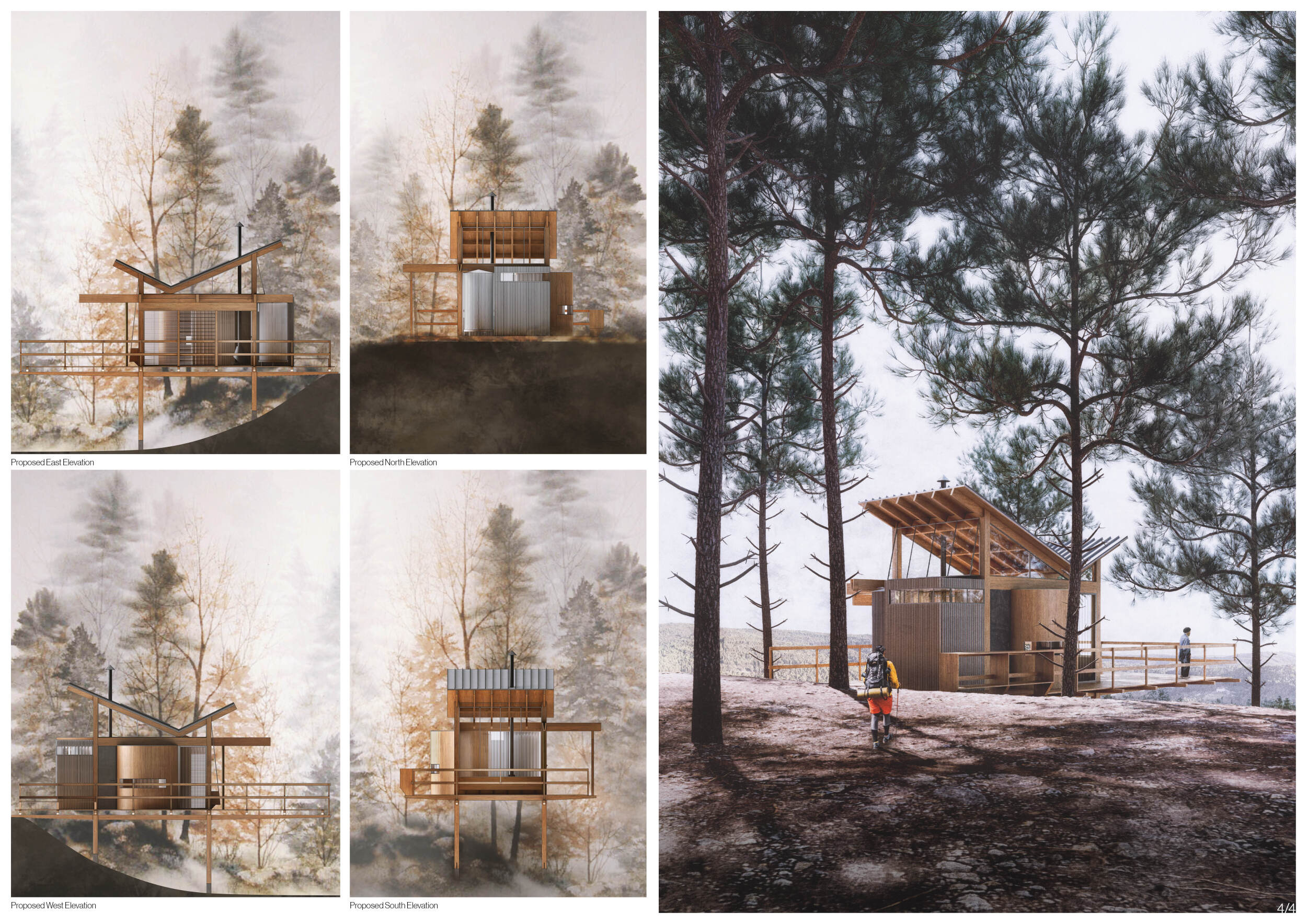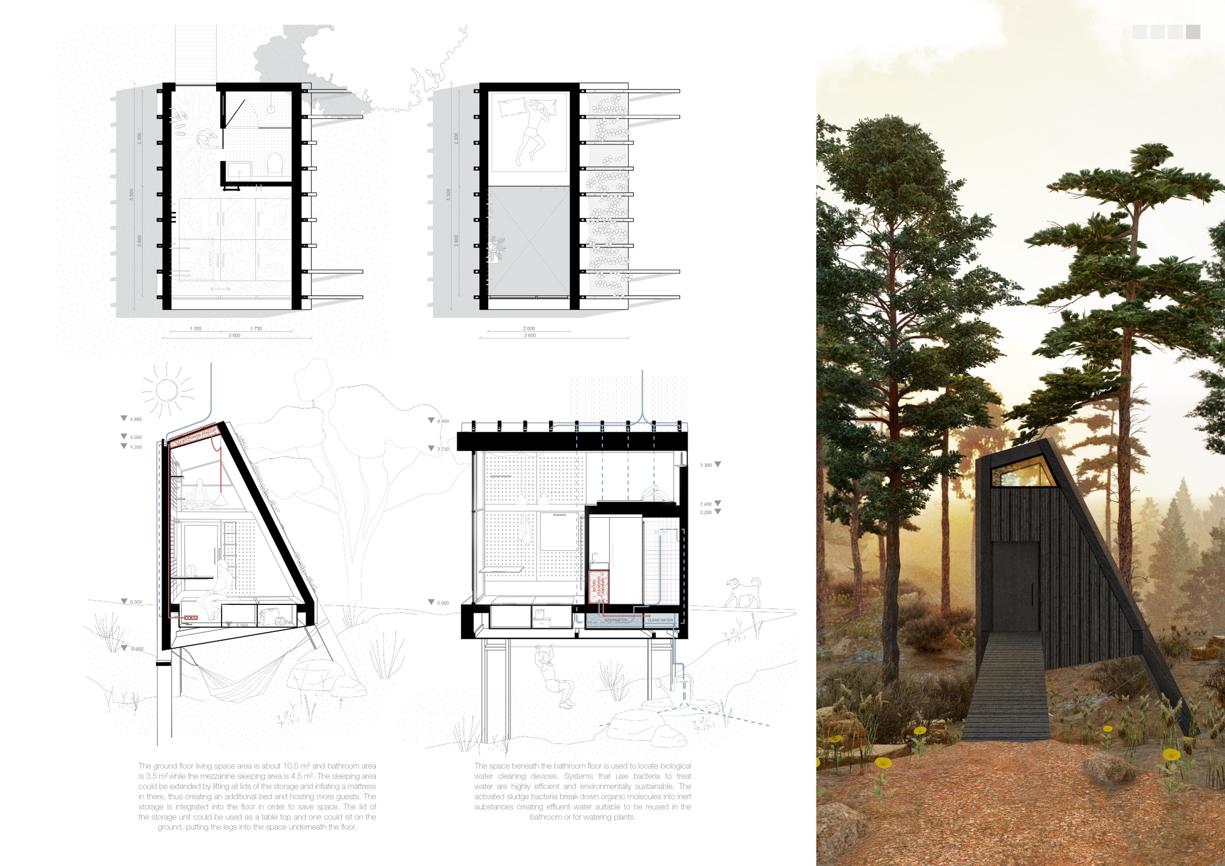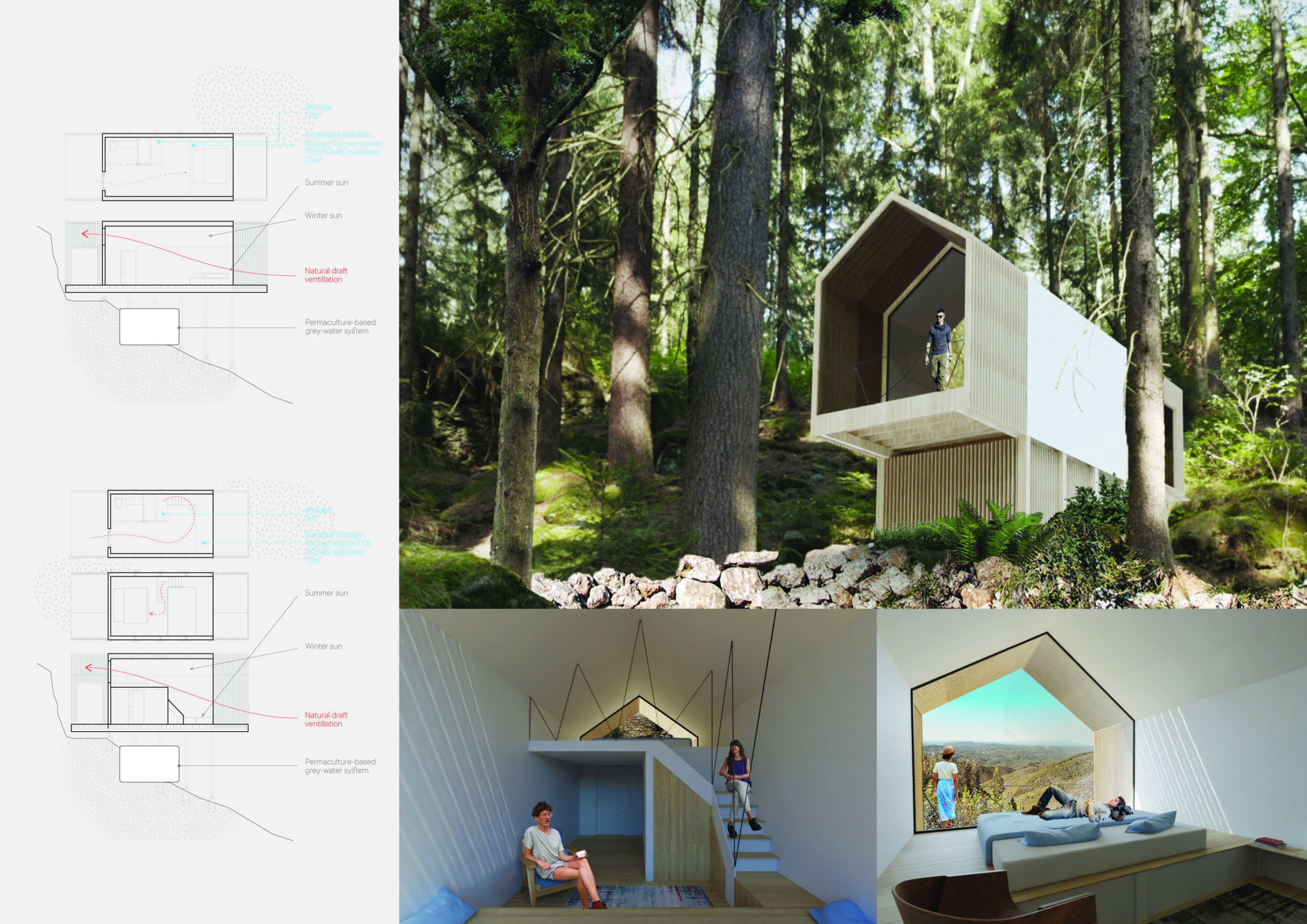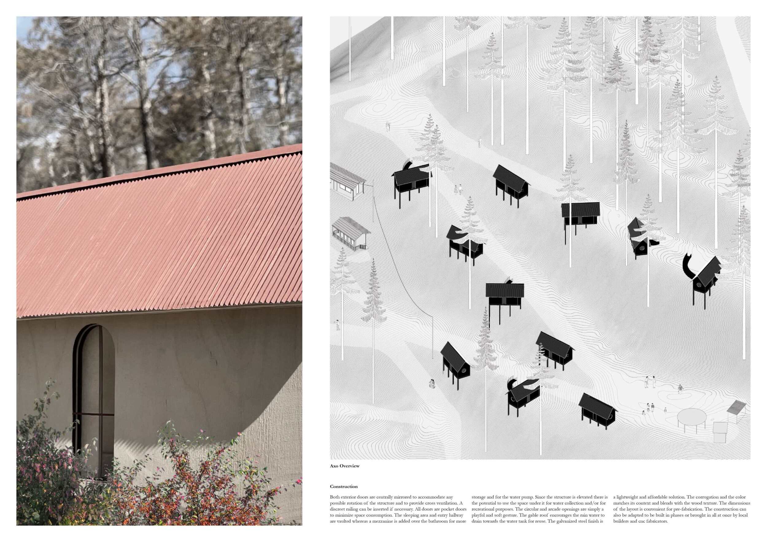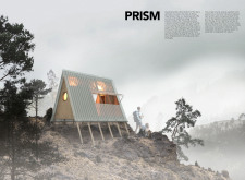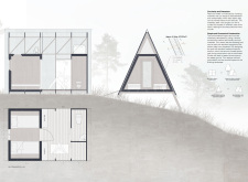 The jury favorite, ‘Dew Catcher’, proposes an A-frame structure with a stepped, transparent polycarbonate roof over layers of nylon mesh that capture dew and fog and thus supply water to the cabin and surrounding vegetation. The submission claims such a construction has the capacity to collect 350 liters daily.