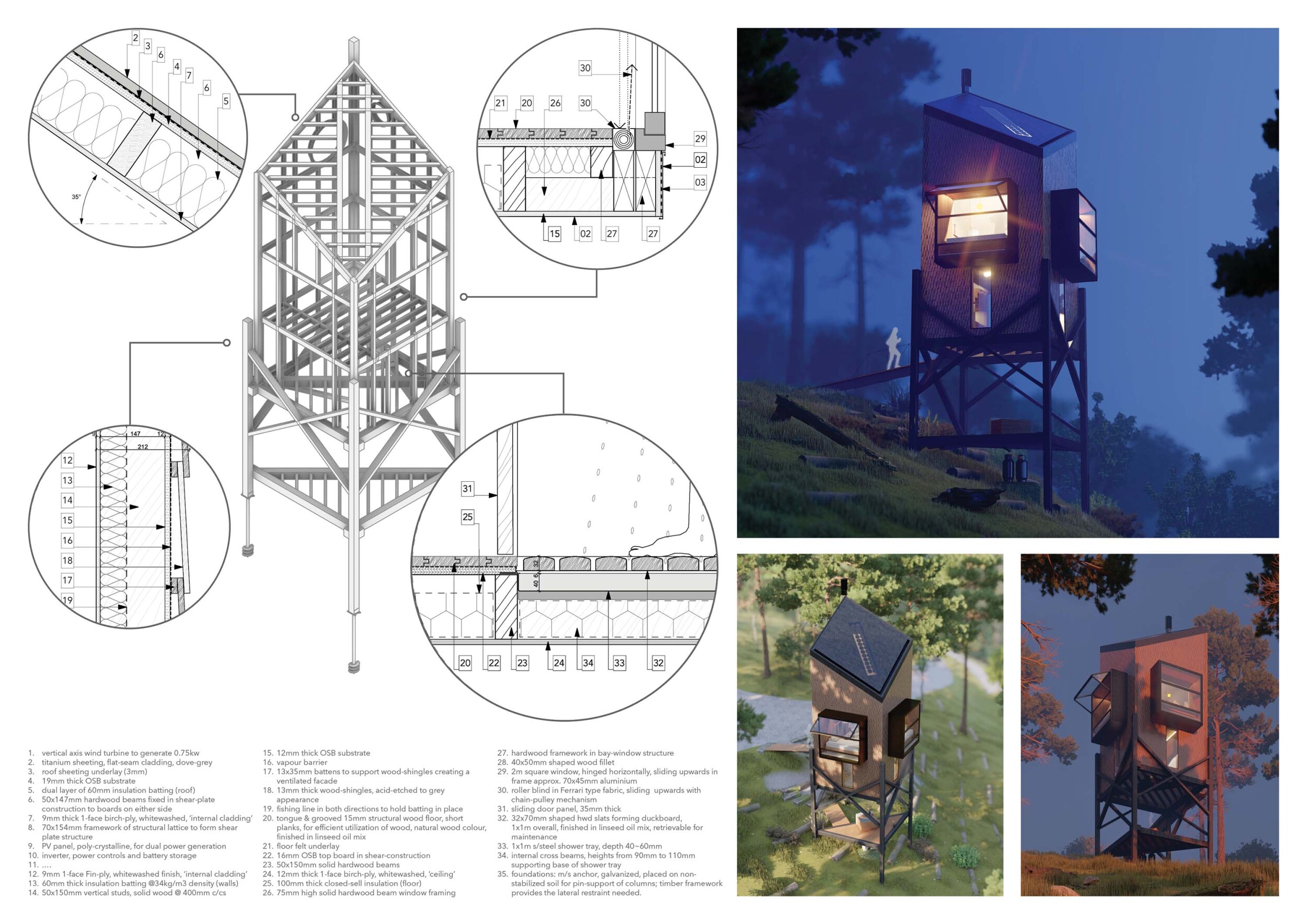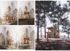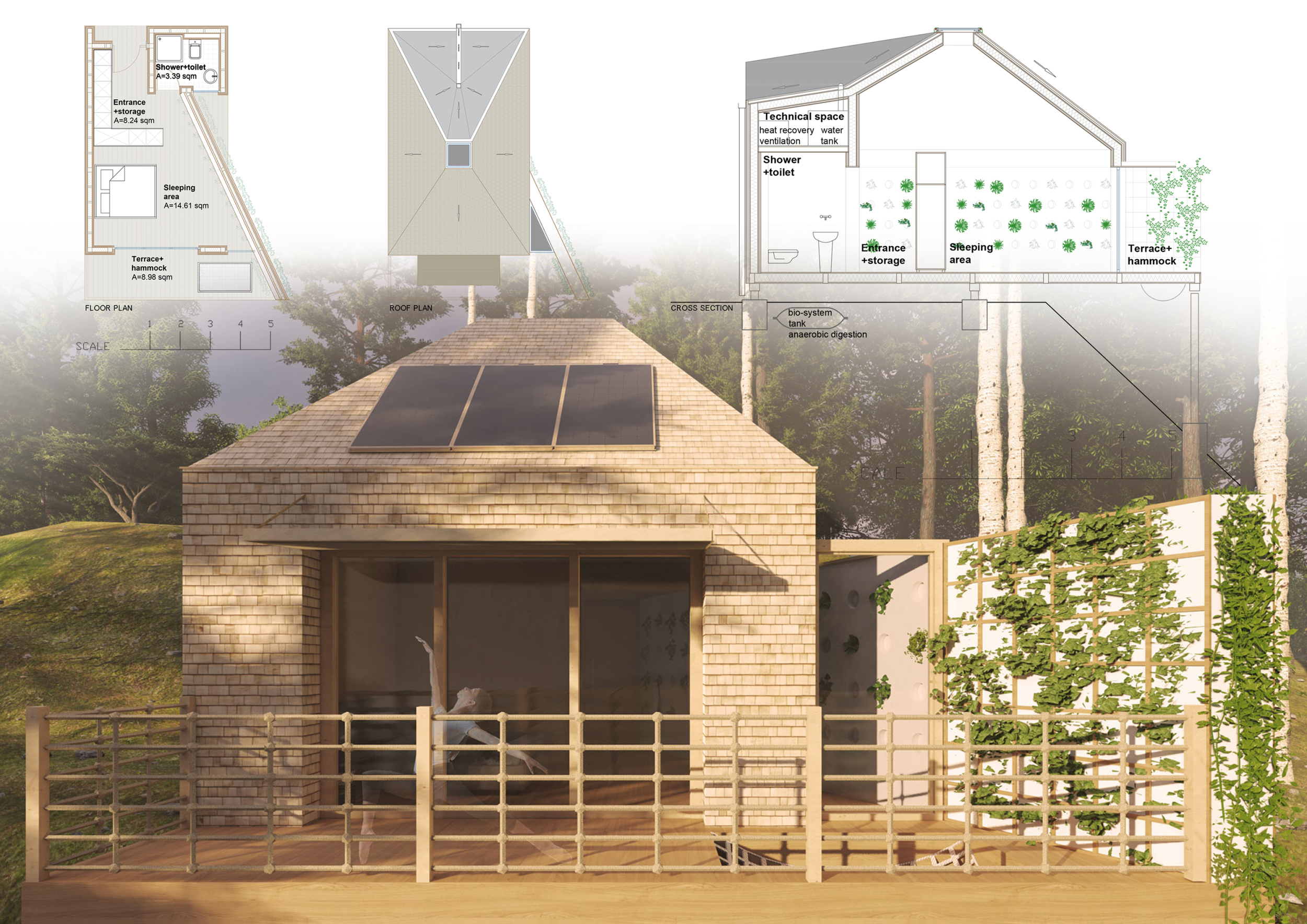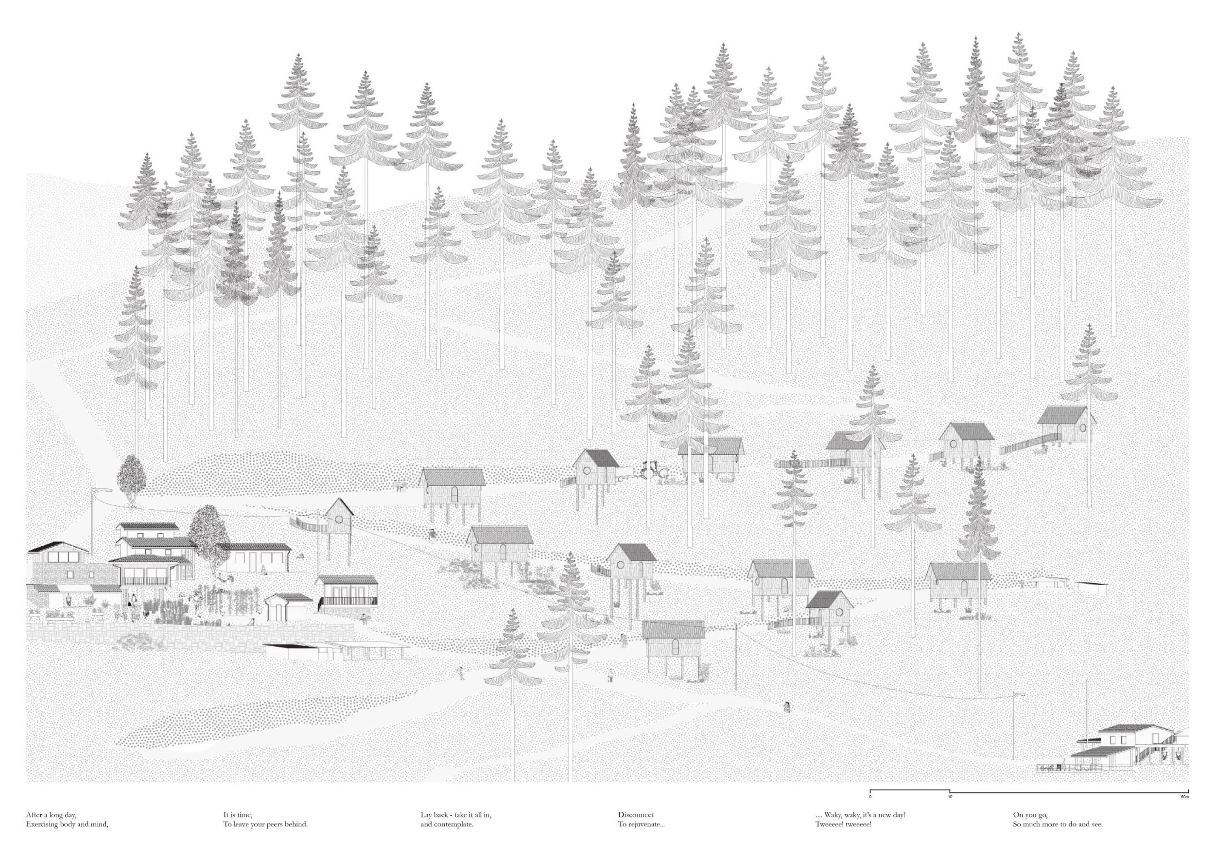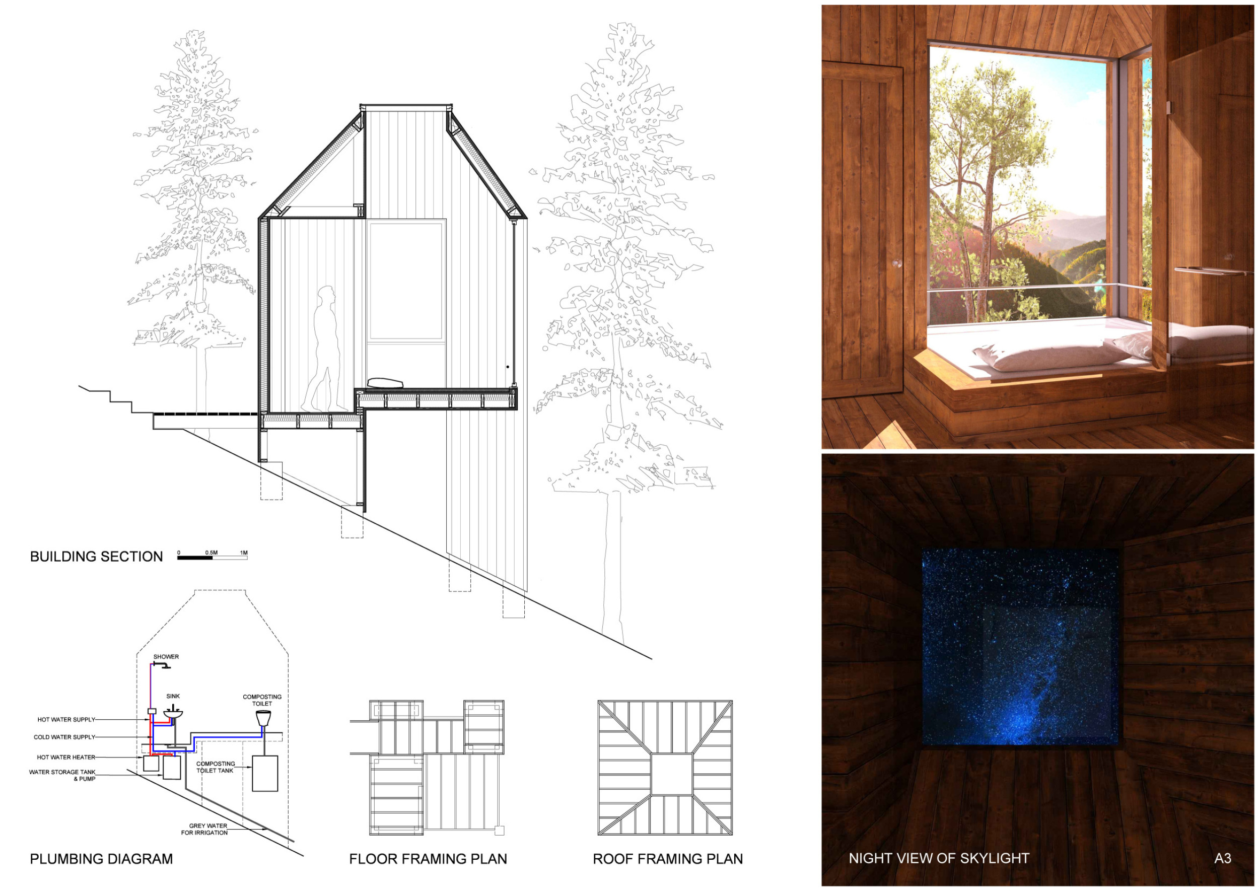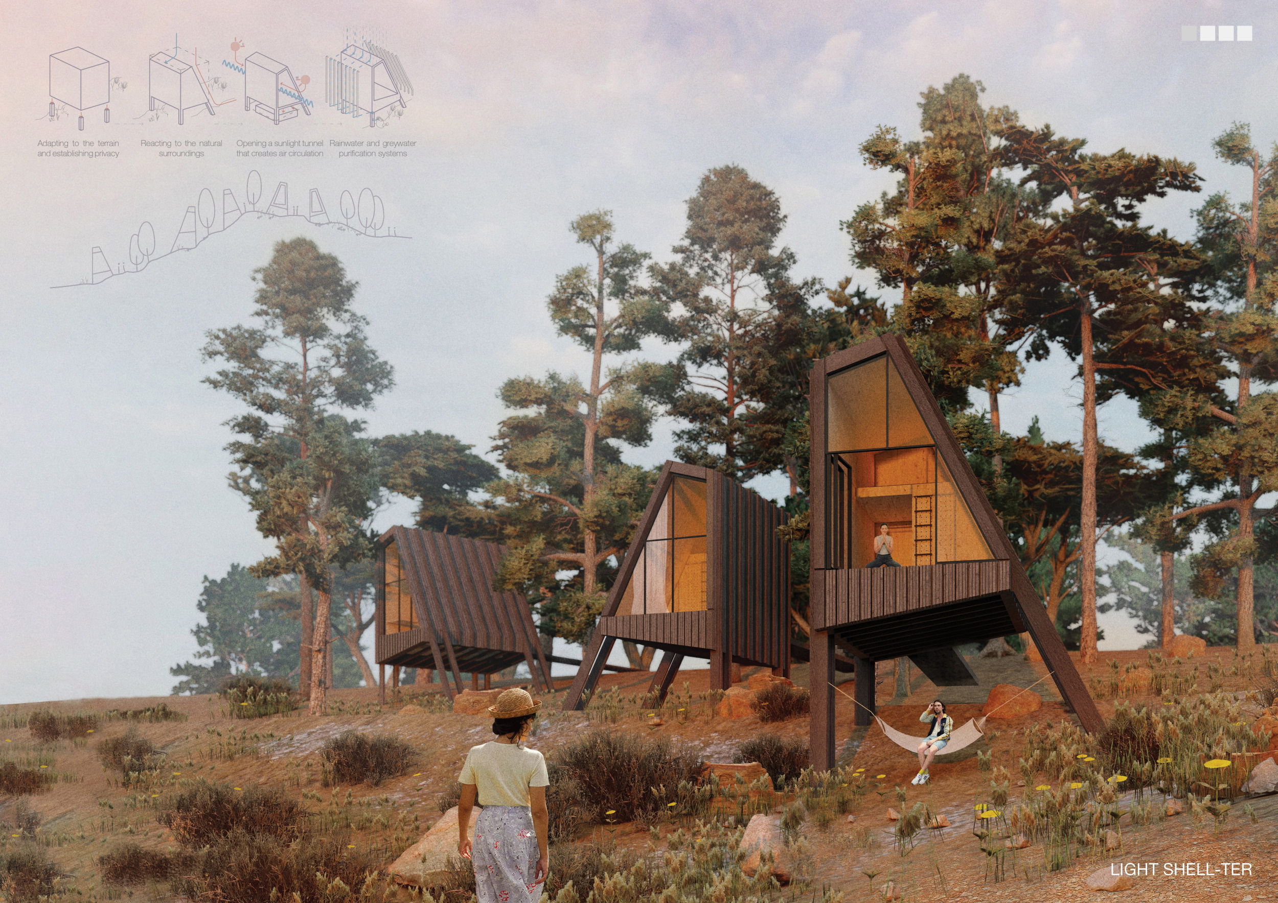 The jury favorite, ‘Dew Catcher’, proposes an A-frame structure with a stepped, transparent polycarbonate roof over layers of nylon mesh that capture dew and fog and thus supply water to the cabin and surrounding vegetation. The submission claims such a construction has the capacity to collect 350 liters daily.