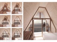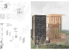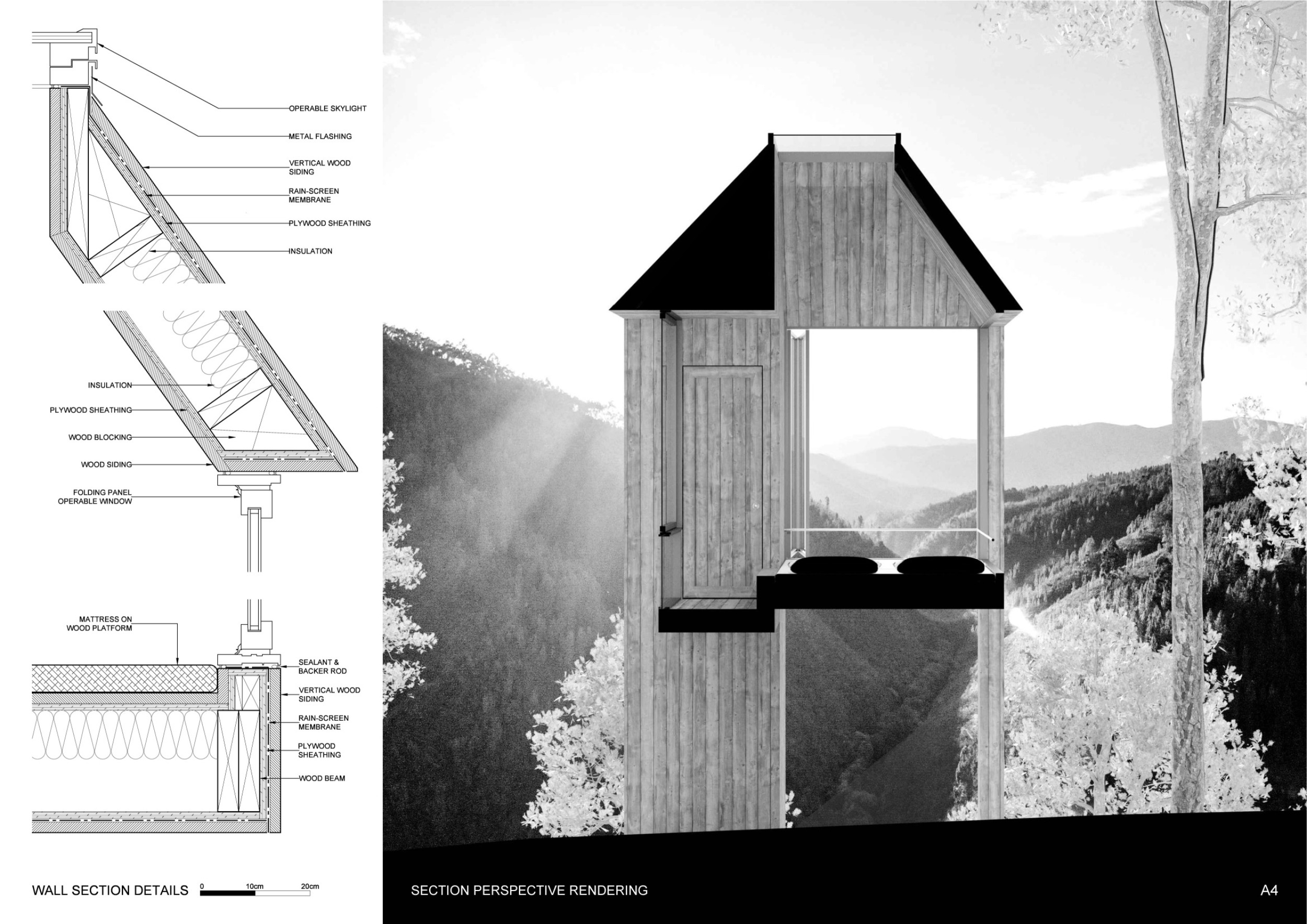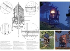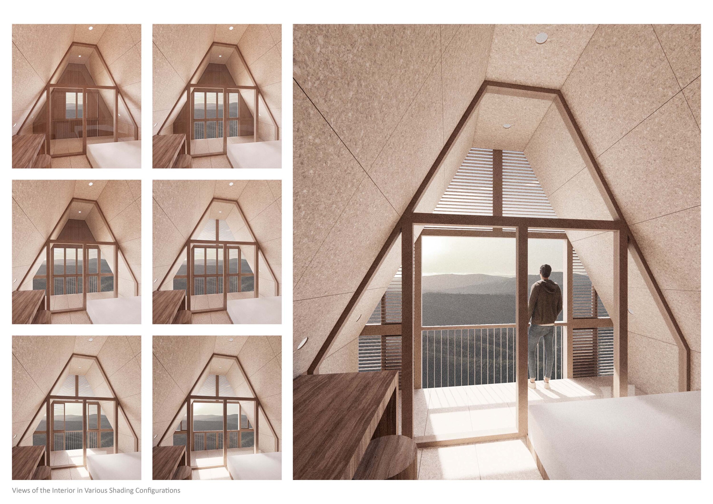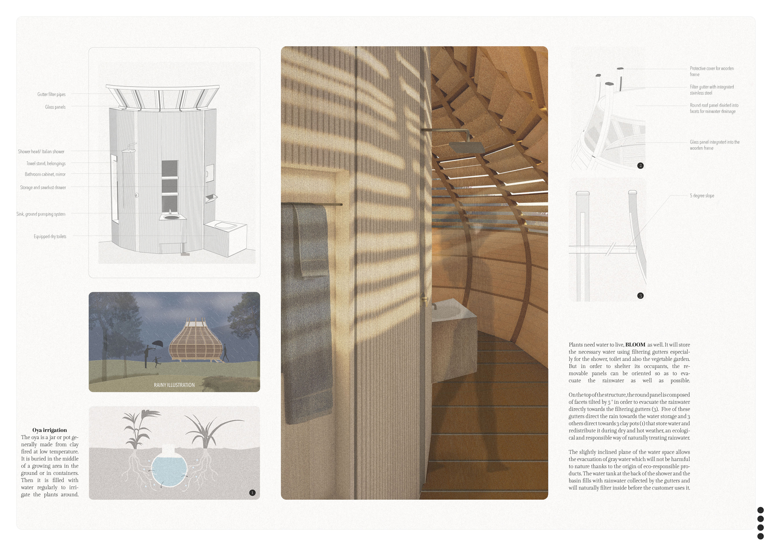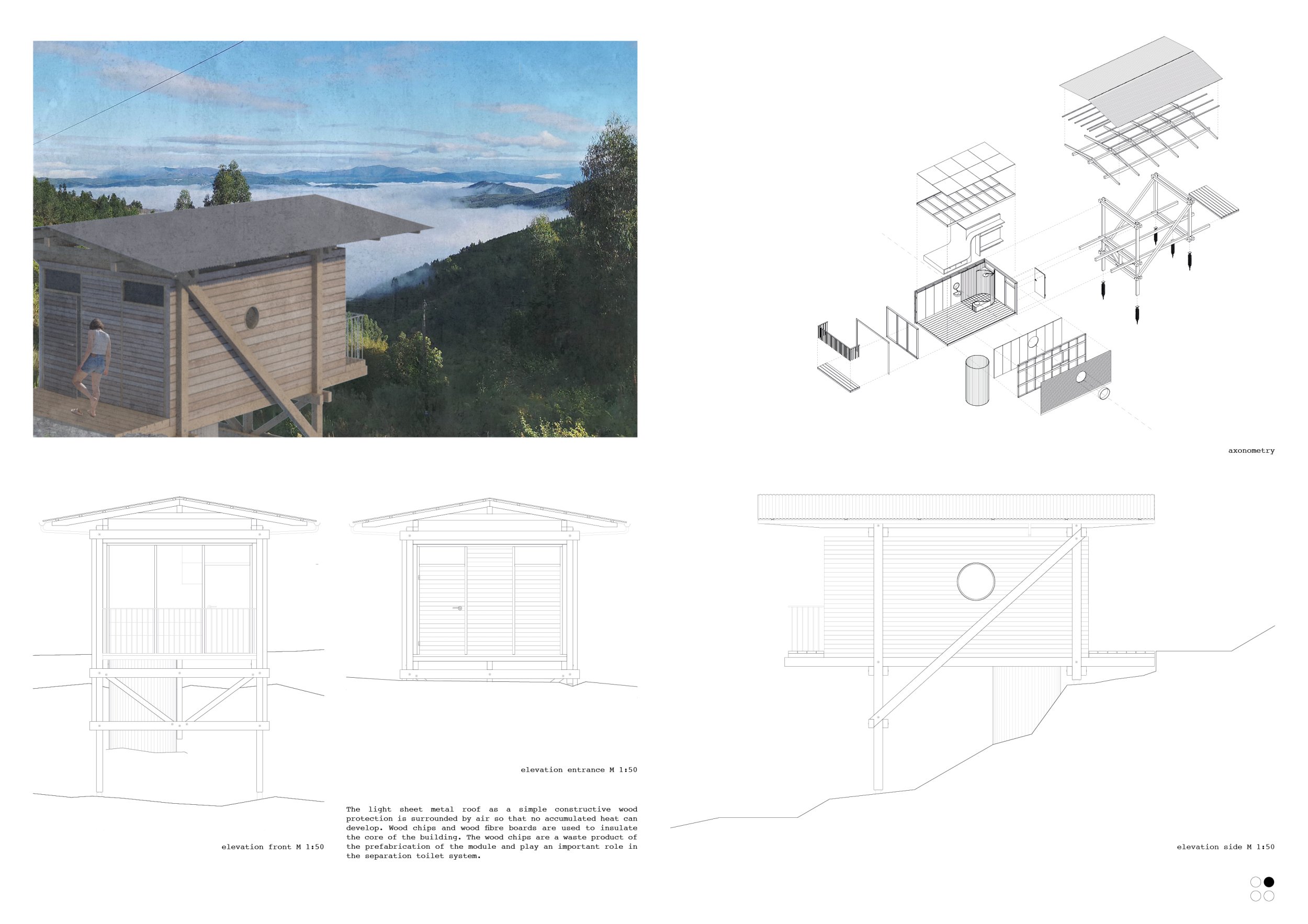 The jury favorite, ‘Dew Catcher’, proposes an A-frame structure with a stepped, transparent polycarbonate roof over layers of nylon mesh that capture dew and fog and thus supply water to the cabin and surrounding vegetation. The submission claims such a construction has the capacity to collect 350 liters daily.