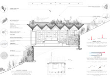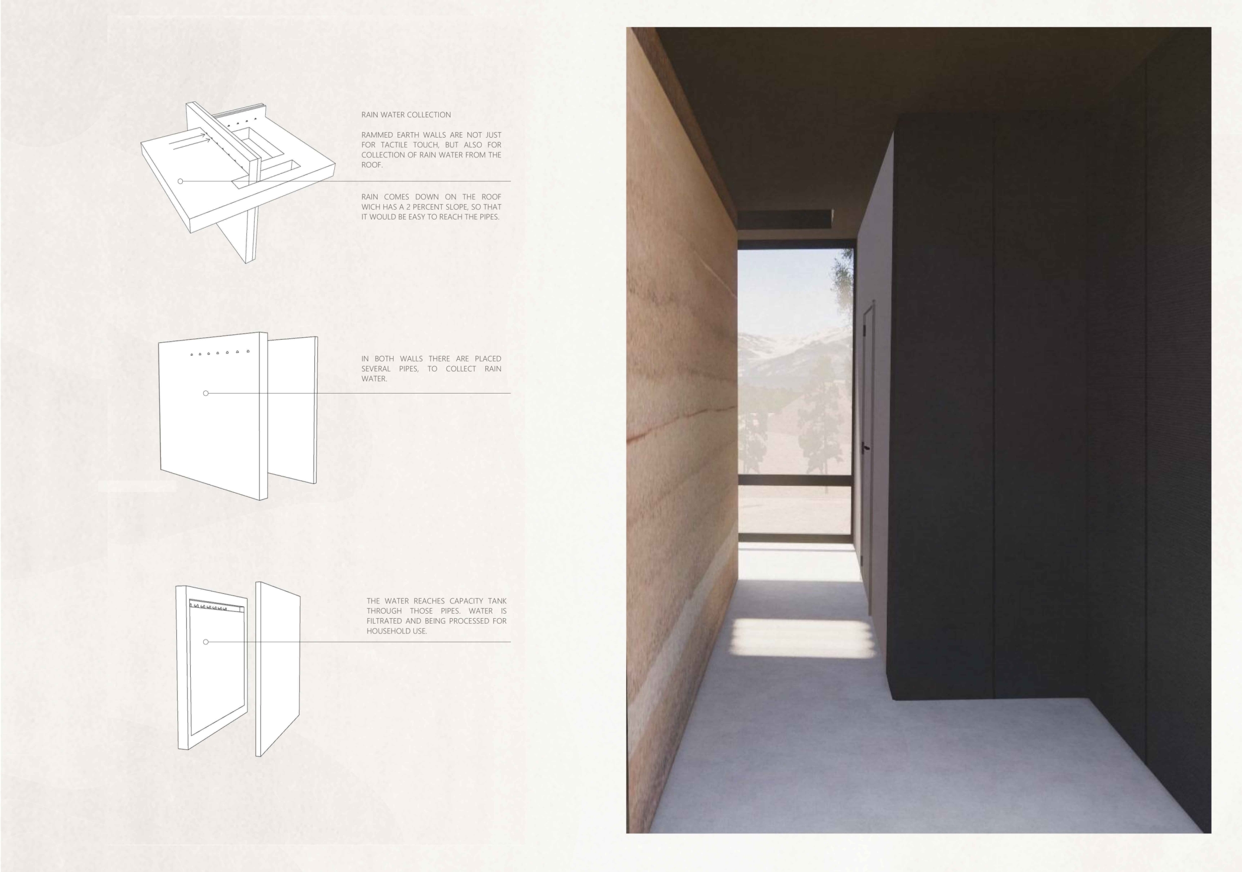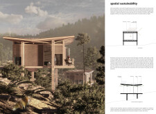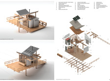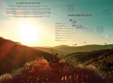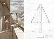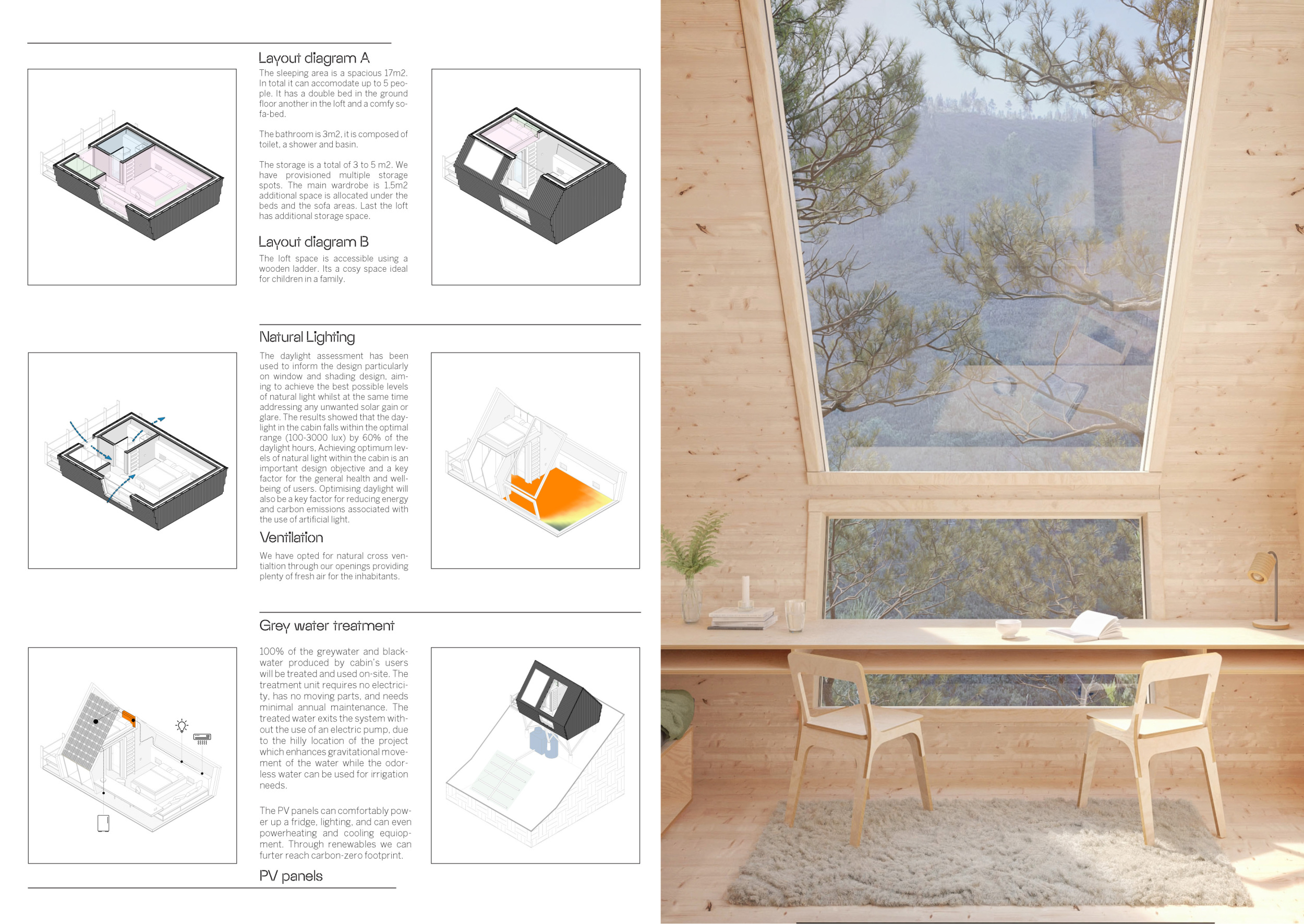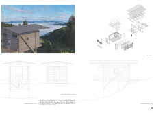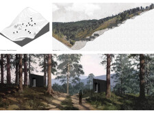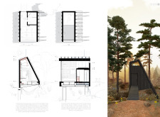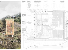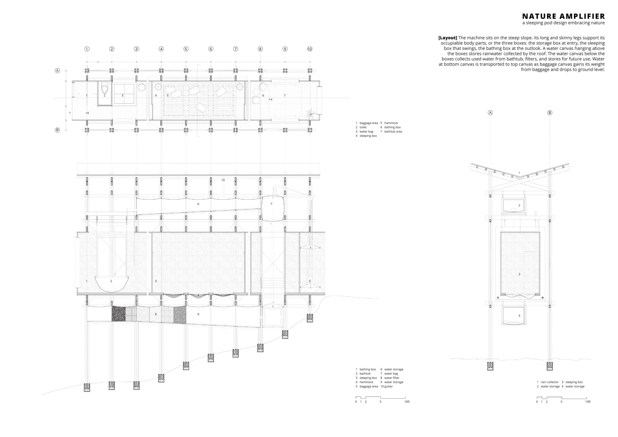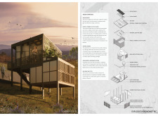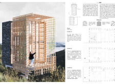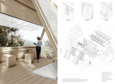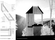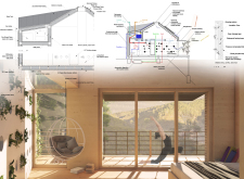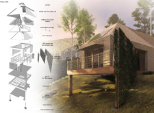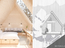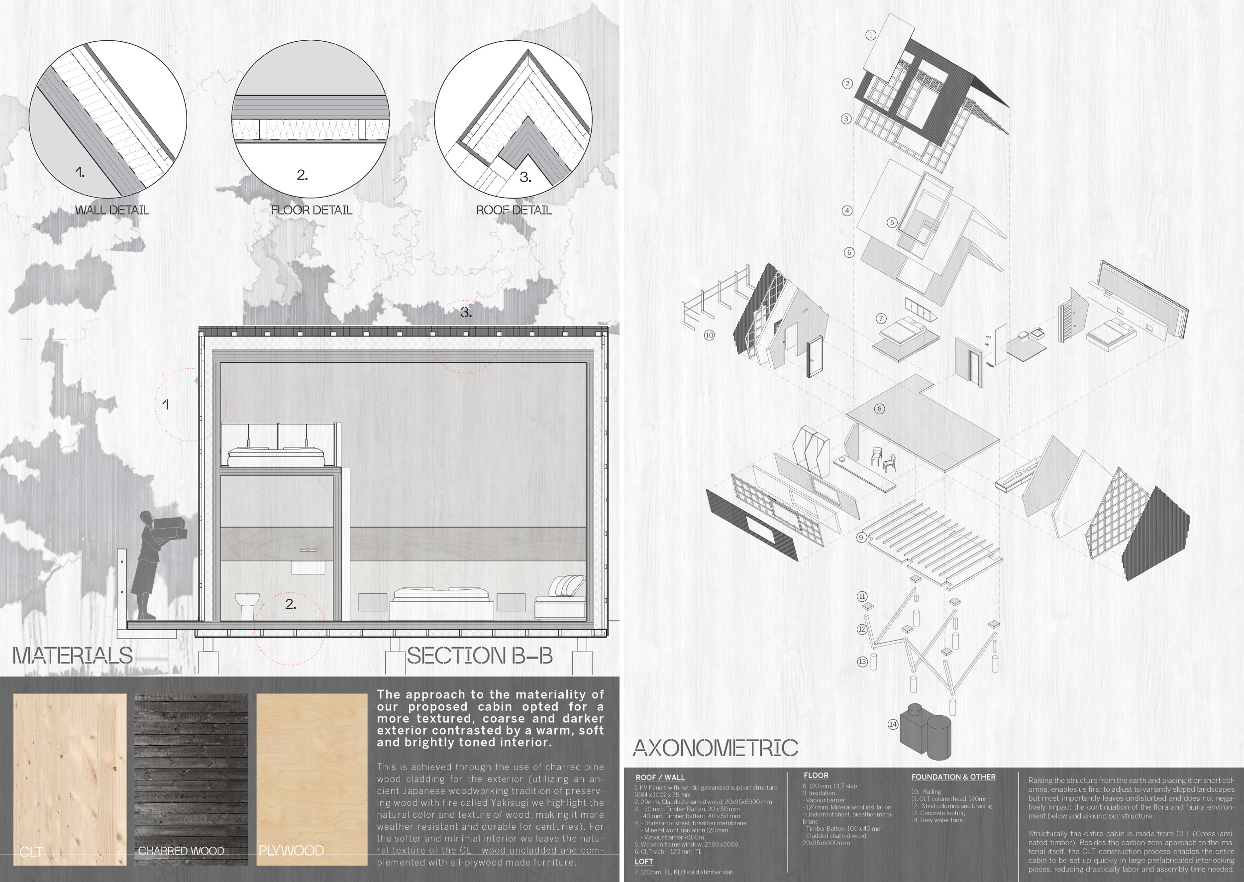 The jury favorite, ‘Dew Catcher’, proposes an A-frame structure with a stepped, transparent polycarbonate roof over layers of nylon mesh that capture dew and fog and thus supply water to the cabin and surrounding vegetation. The submission claims such a construction has the capacity to collect 350 liters daily.