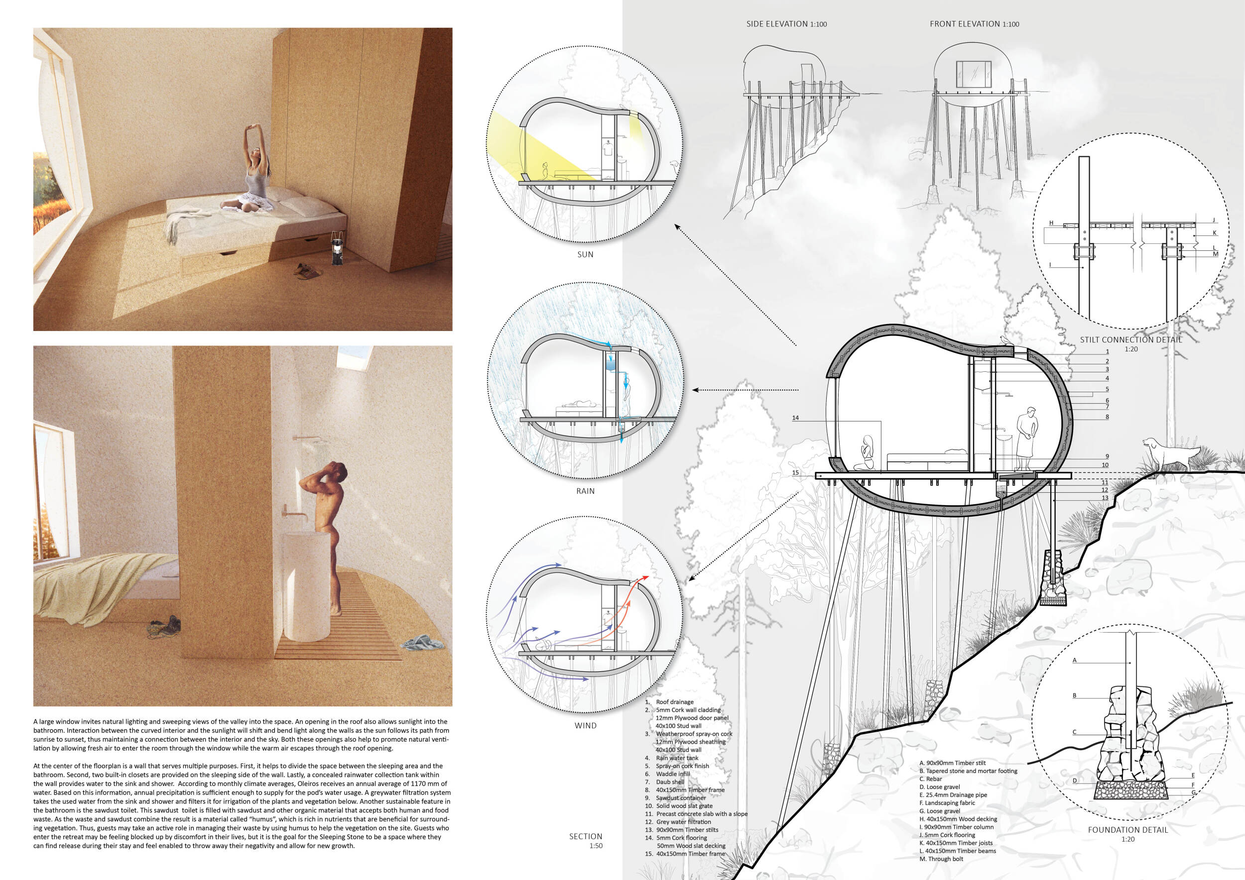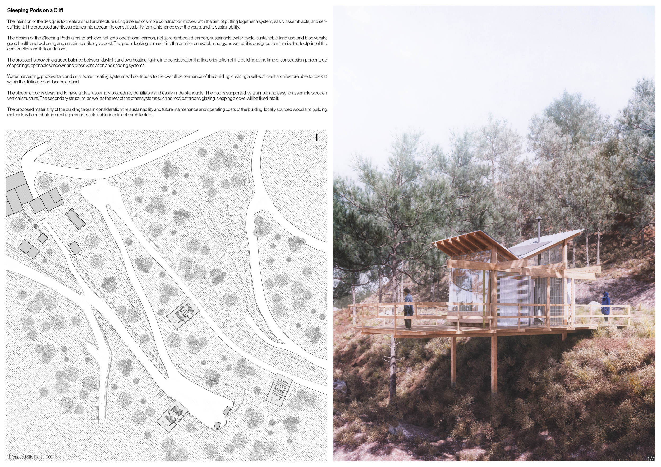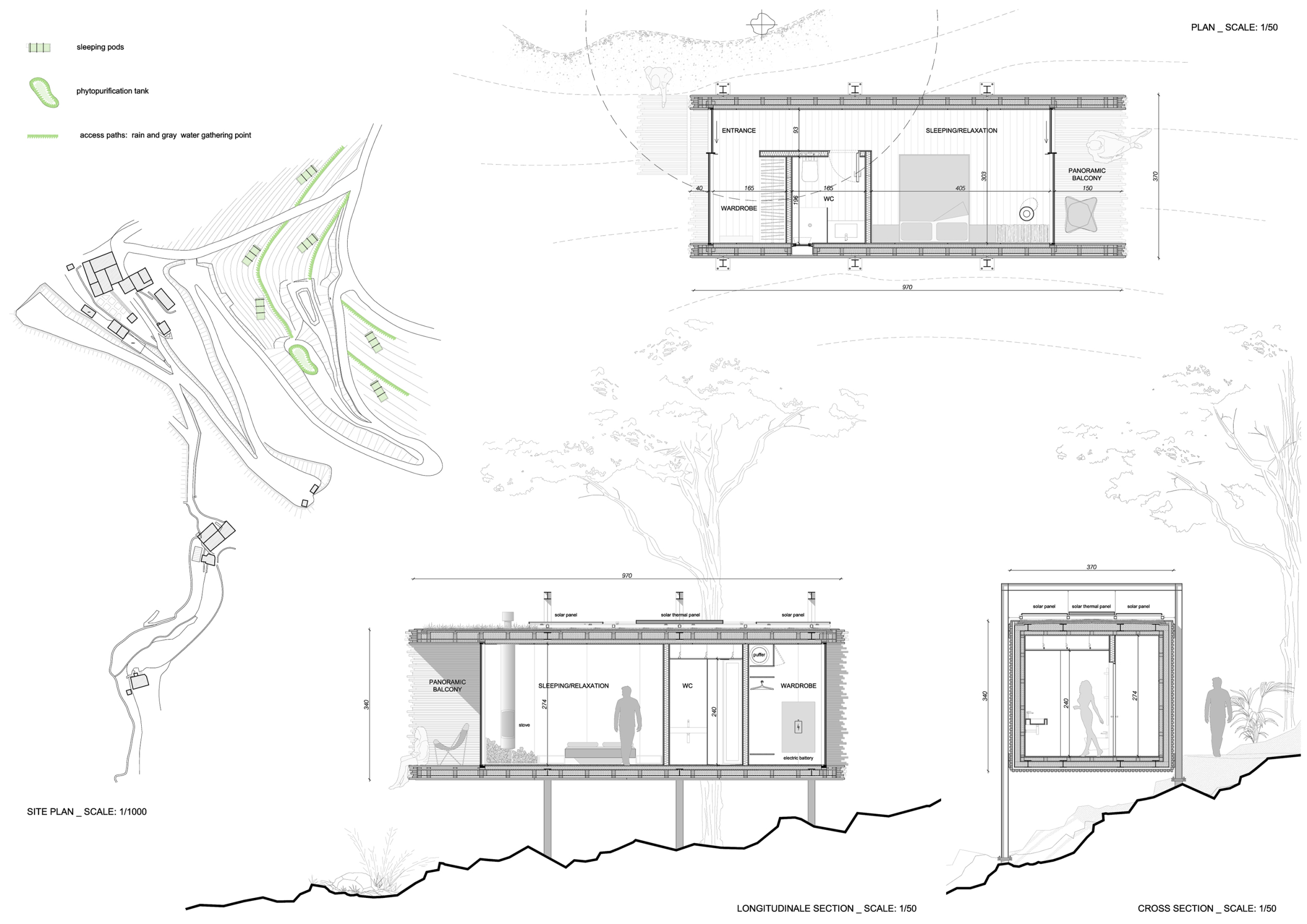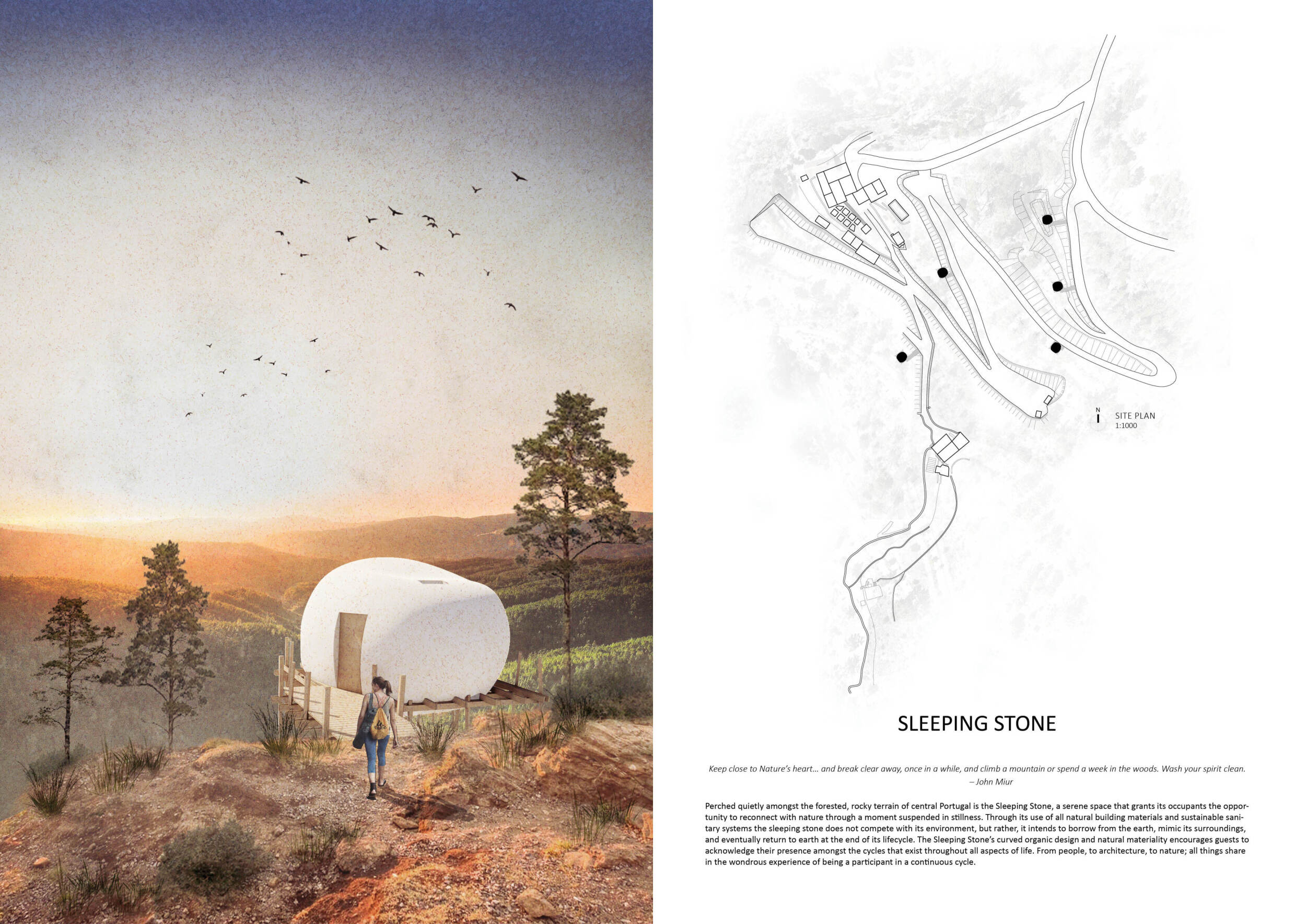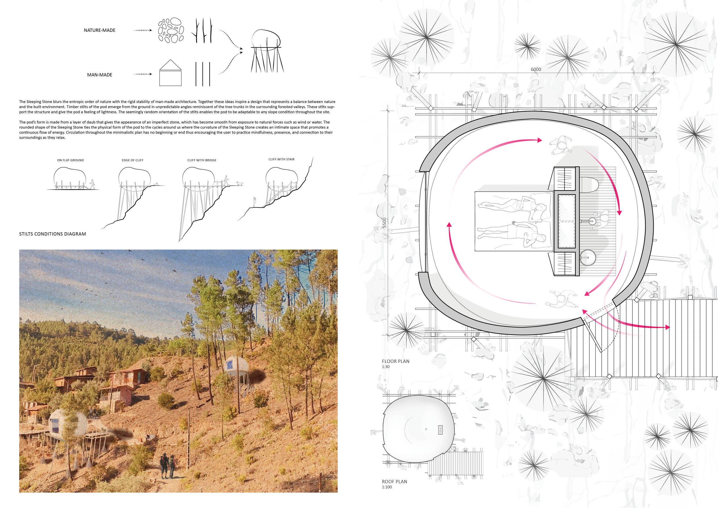 The current infrastructure of the retreat consists of four once-abandoned stone farmhouse cottages that are now repurposed. For the Sleeping Pods on a Cliff competition, participants were tasked with proposing design solutions for simple sleeping pods that could accommodate a couple of guests at a time. Each sleeping pod was to include a basic sleeping zone as well as washing facilities.