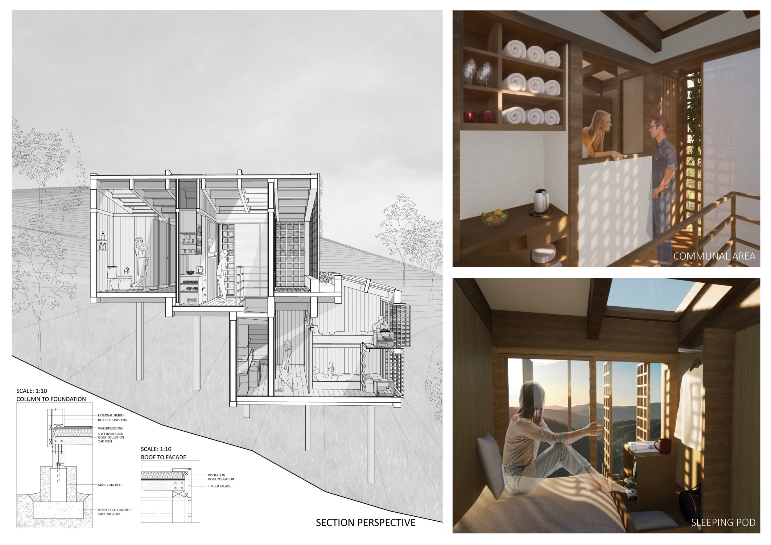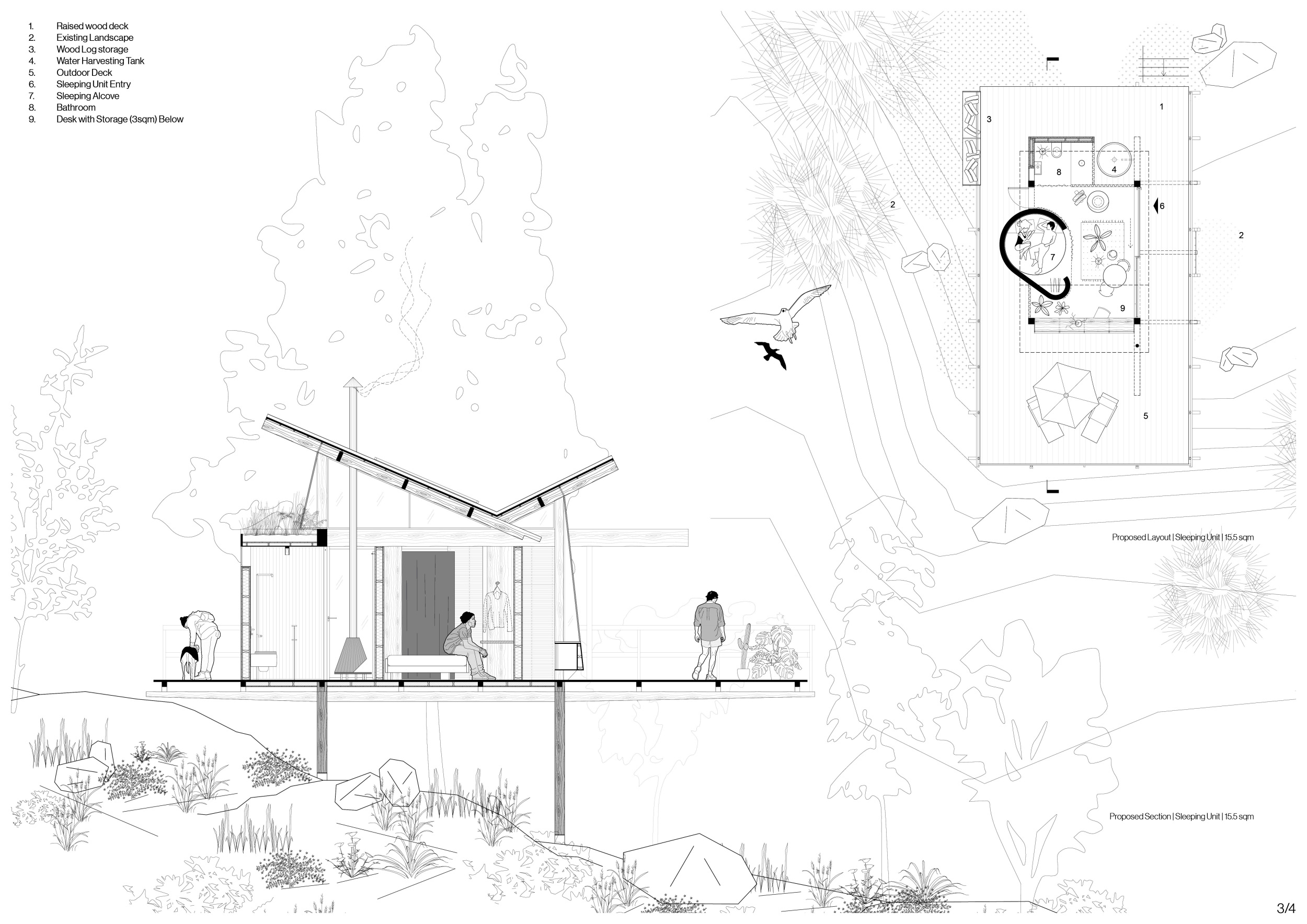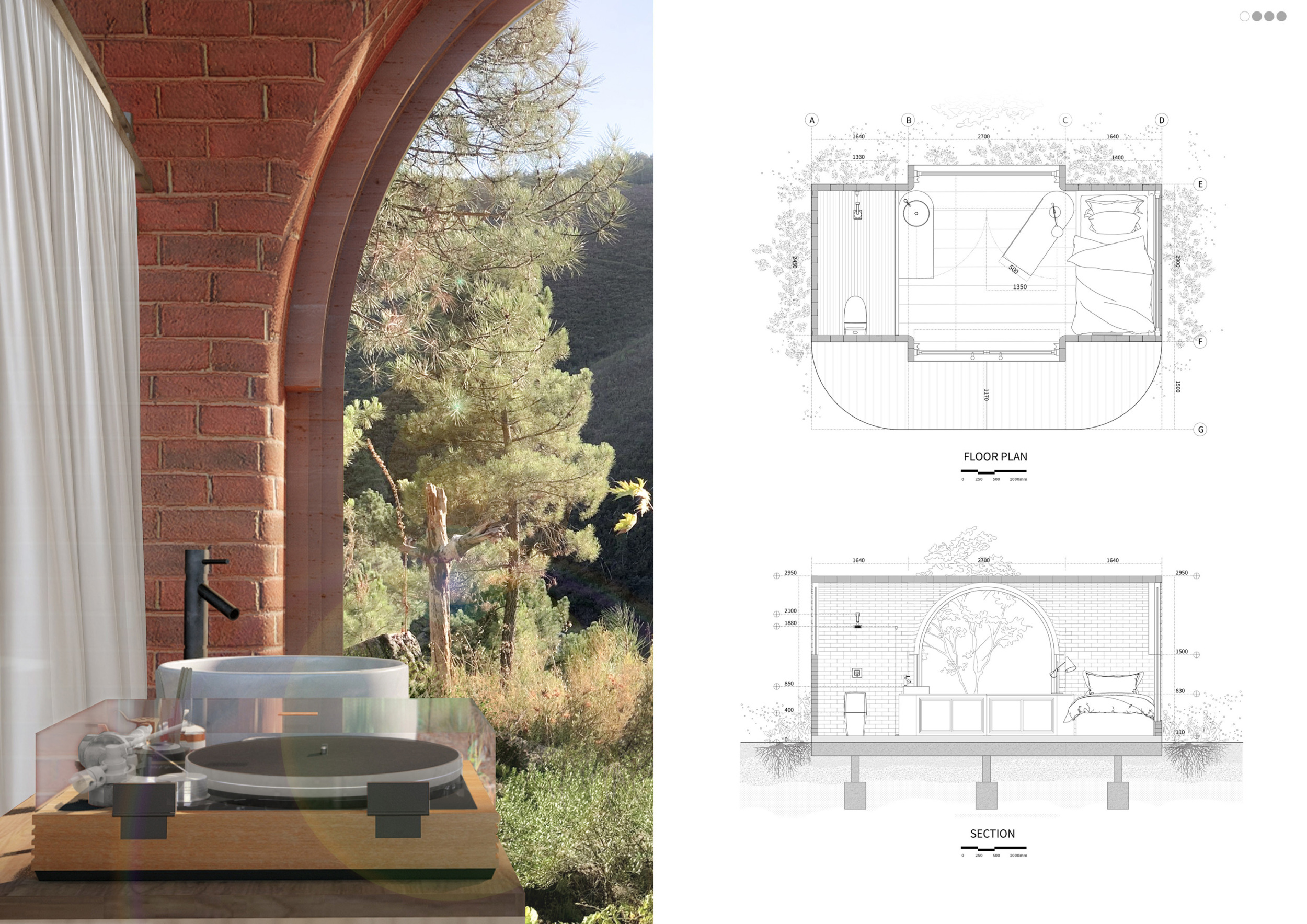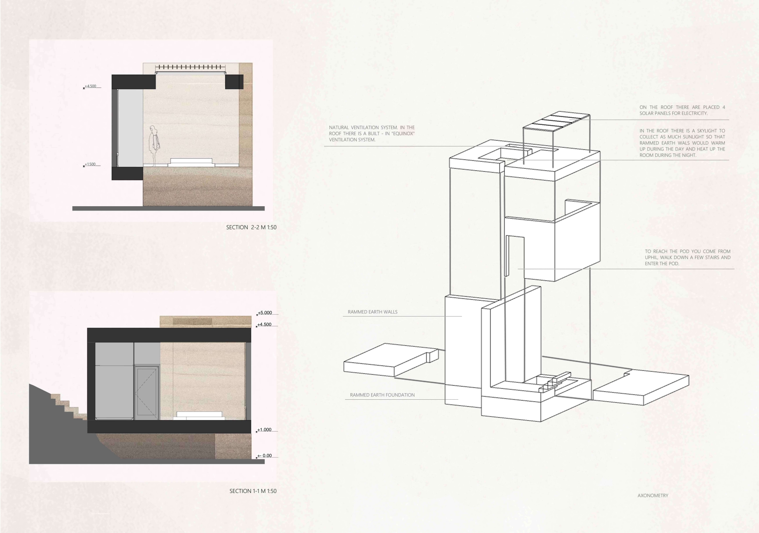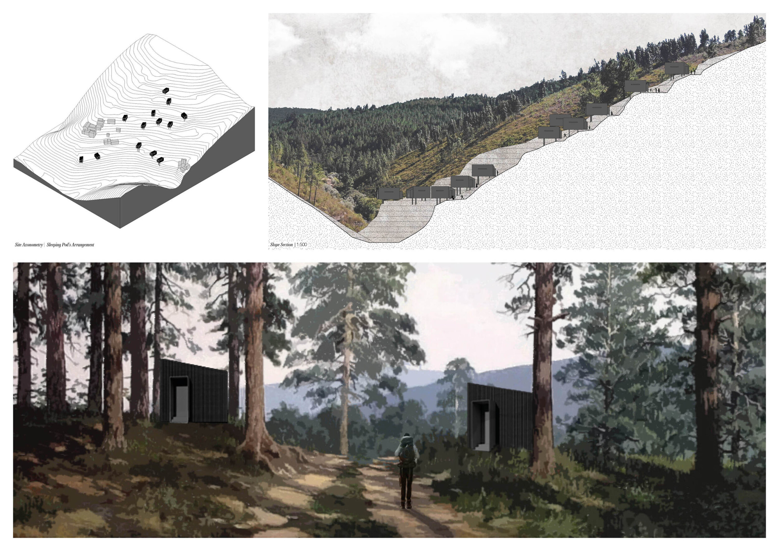 The current infrastructure of the retreat consists of four once-abandoned stone farmhouse cottages that are now repurposed. For the Sleeping Pods on a Cliff competition, participants were tasked with proposing design solutions for simple sleeping pods that could accommodate a couple of guests at a time. Each sleeping pod was to include a basic sleeping zone as well as washing facilities.