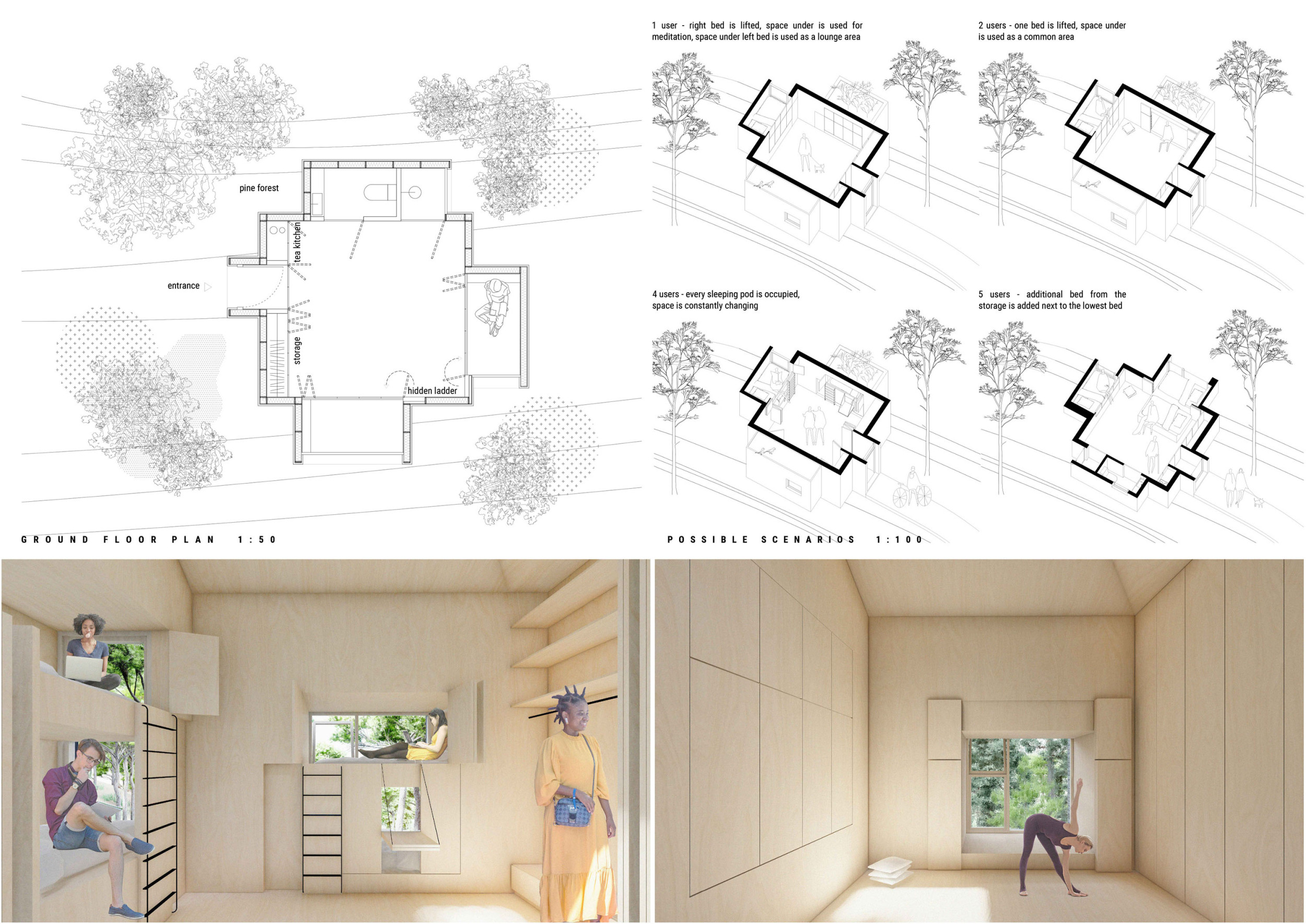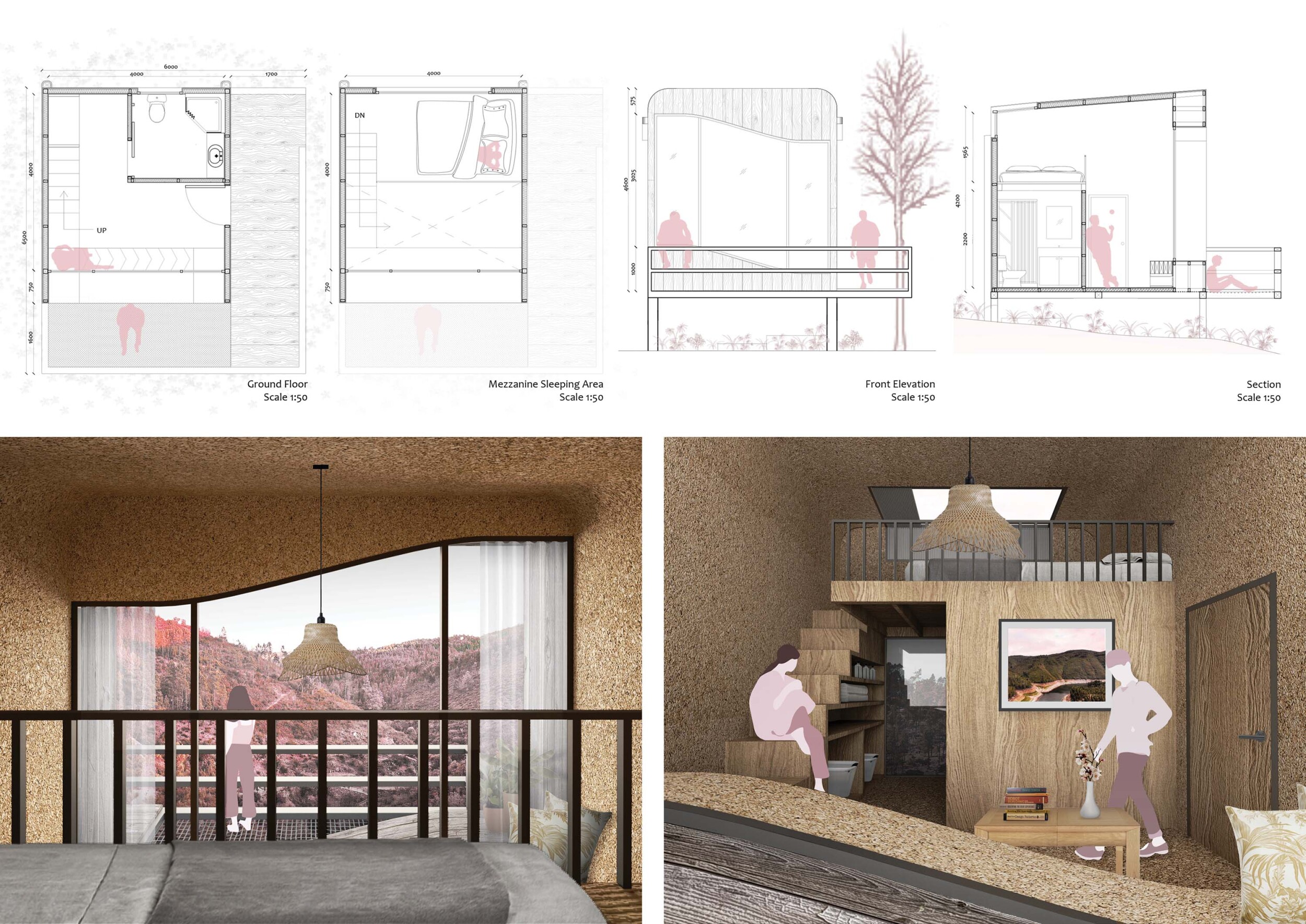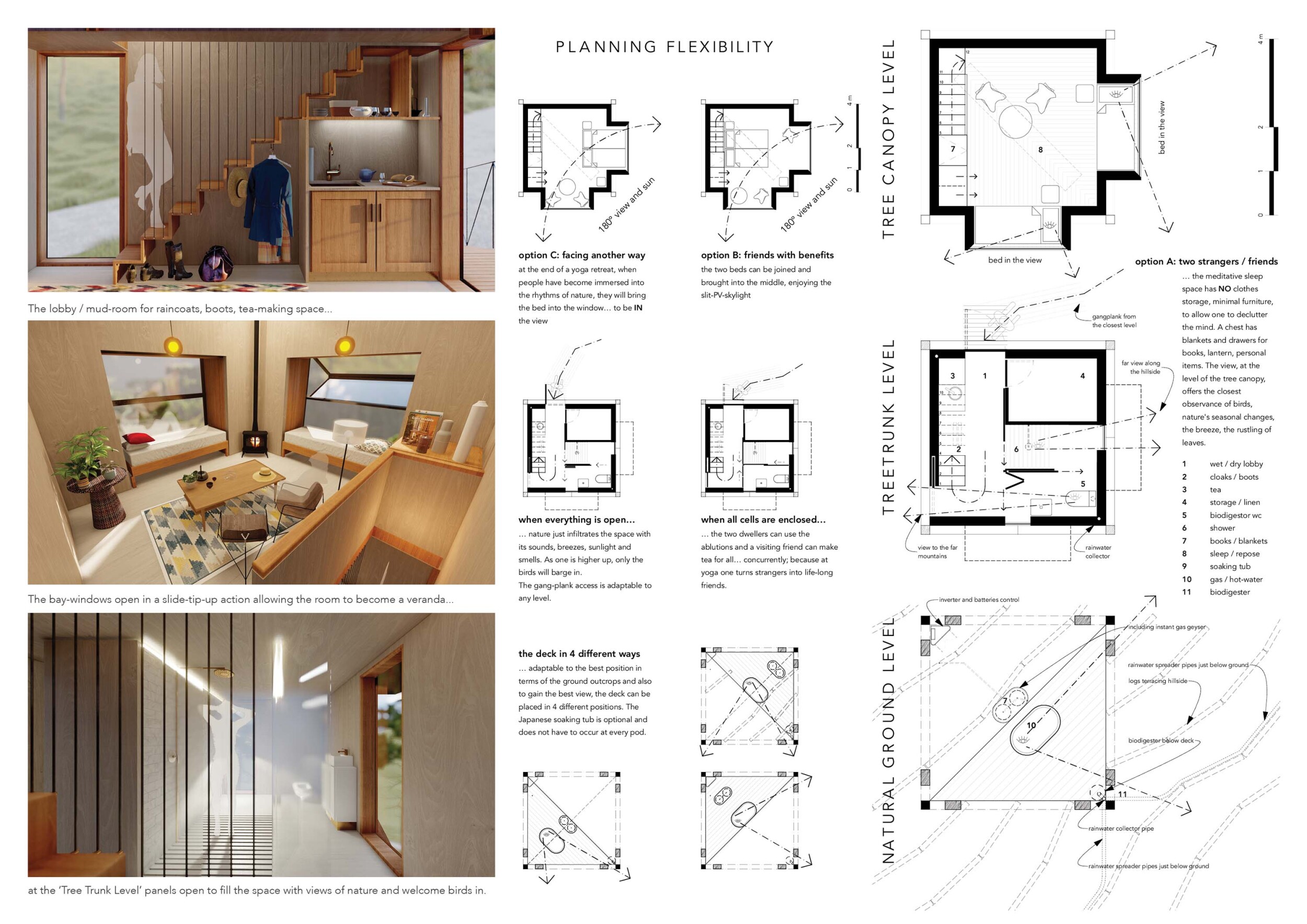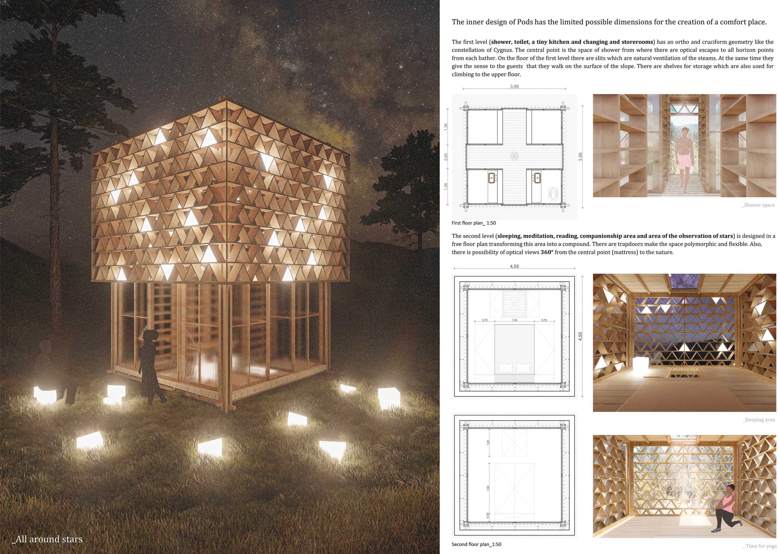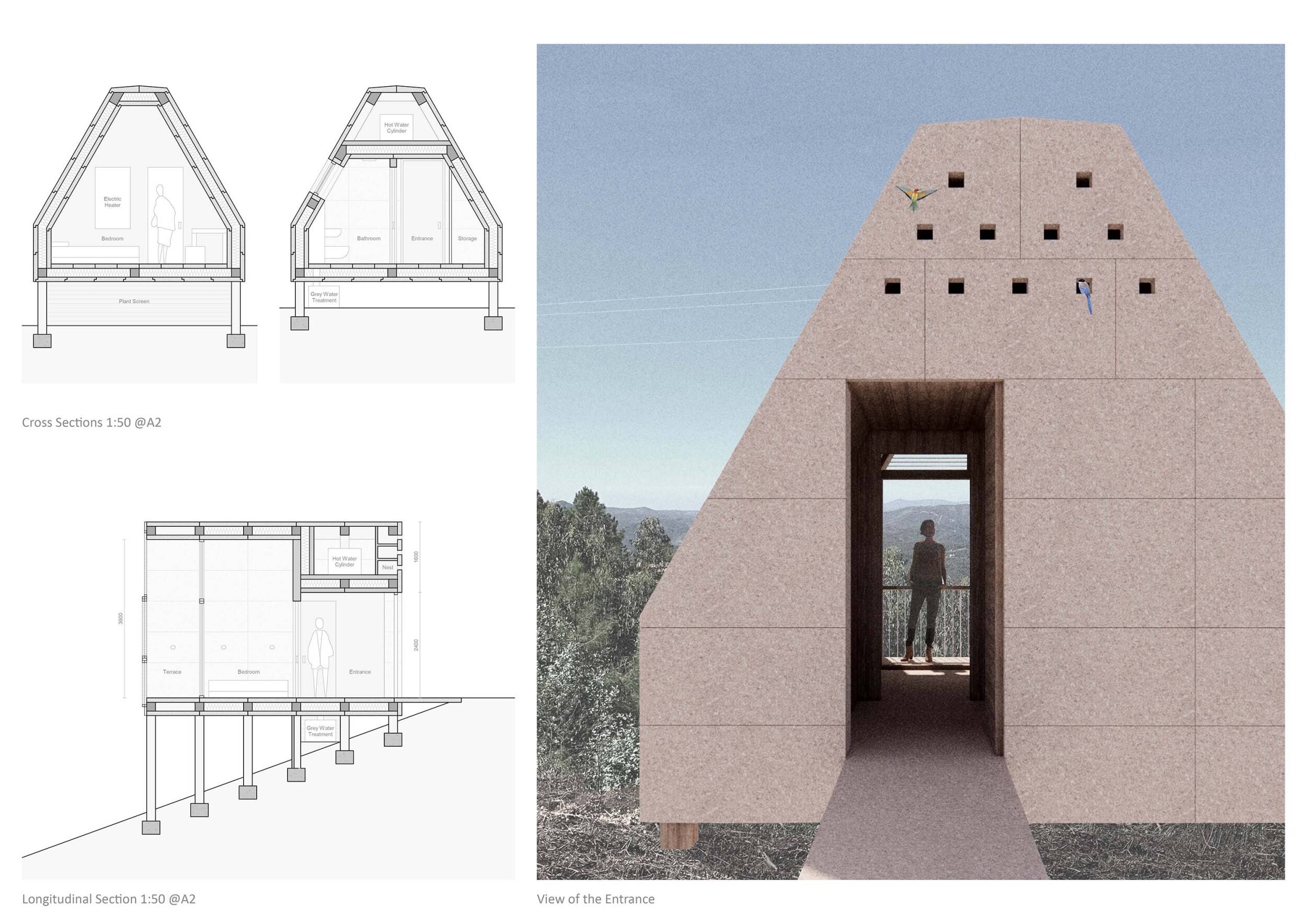 The current infrastructure of the retreat consists of four once-abandoned stone farmhouse cottages that are now repurposed. For the Sleeping Pods on a Cliff competition, participants were tasked with proposing design solutions for simple sleeping pods that could accommodate a couple of guests at a time. Each sleeping pod was to include a basic sleeping zone as well as washing facilities.