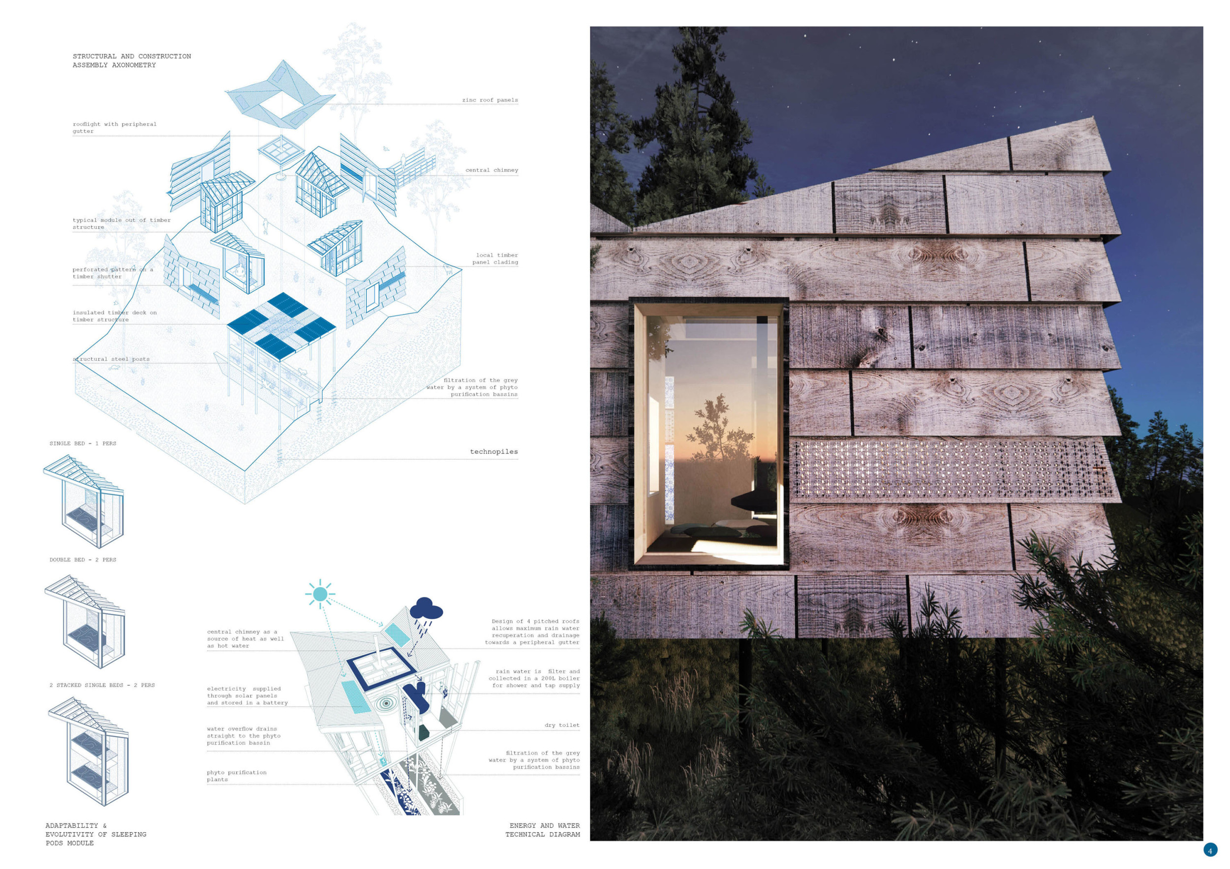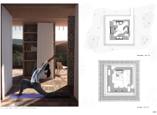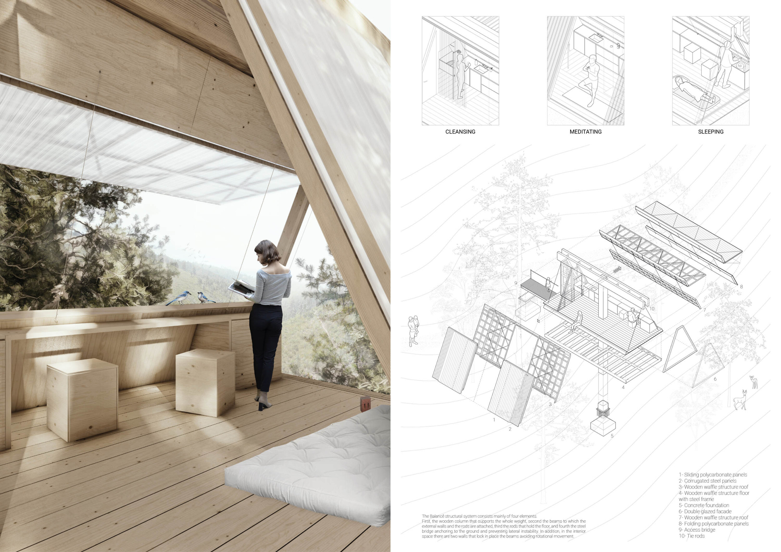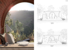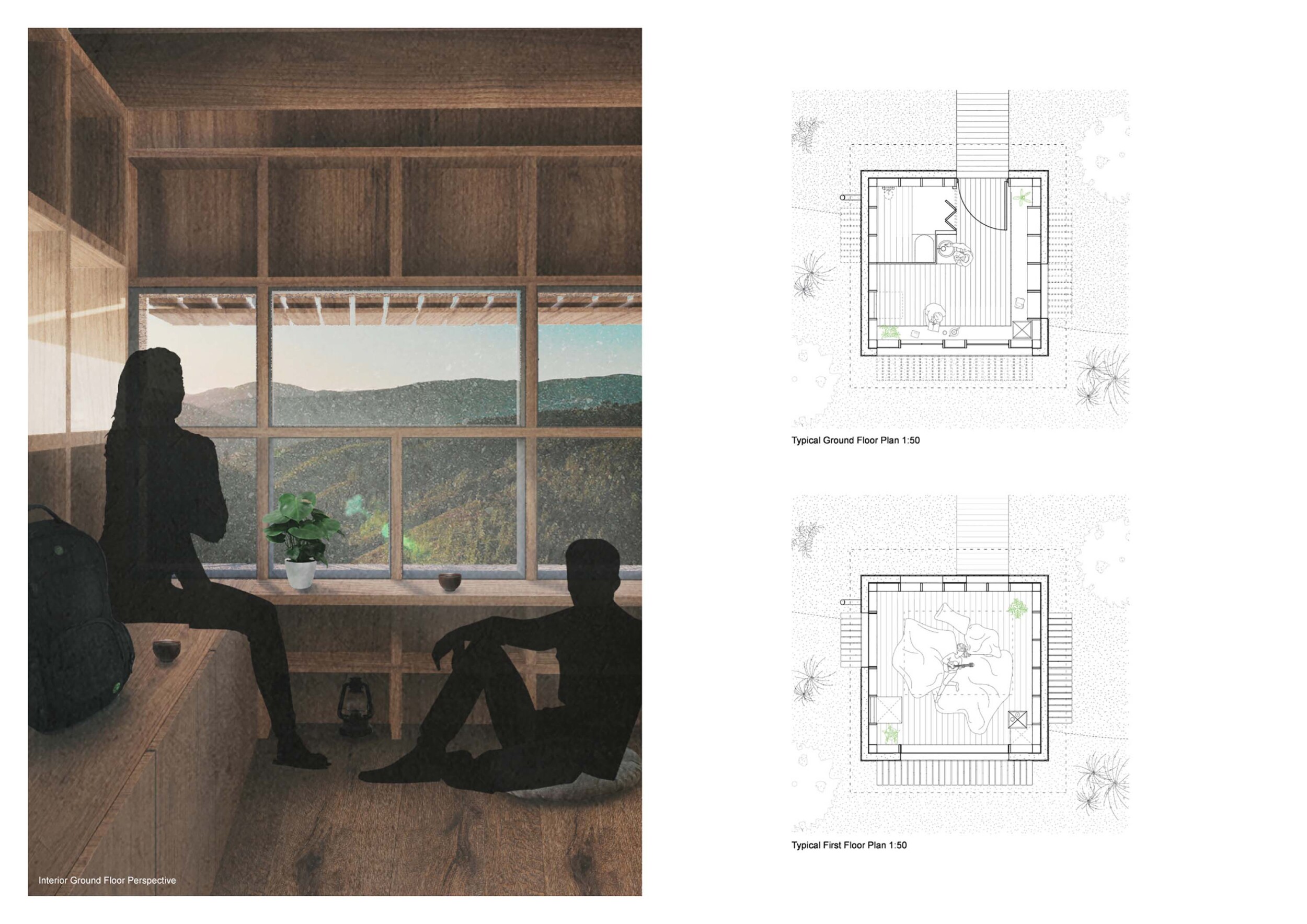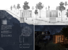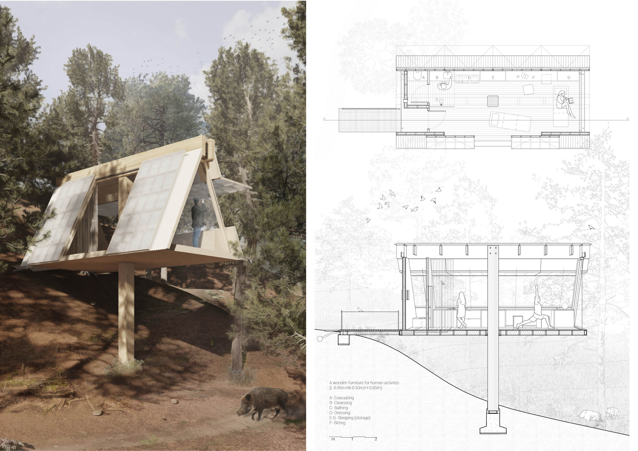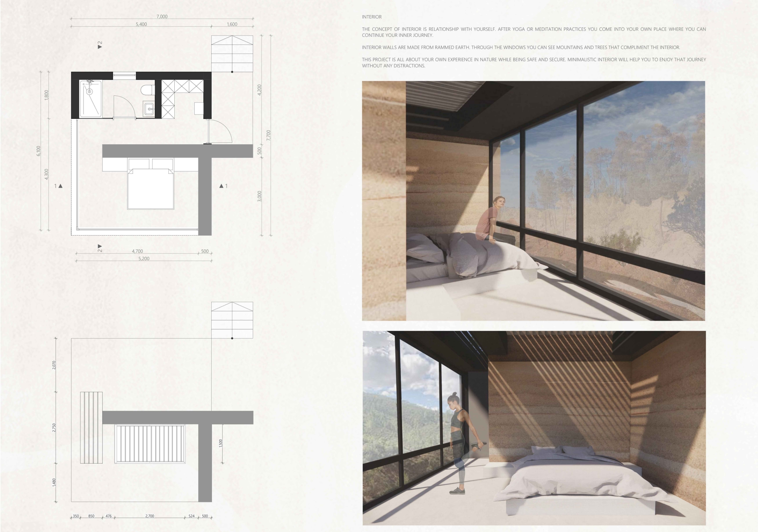 The current infrastructure of the retreat consists of four once-abandoned stone farmhouse cottages that are now repurposed. For the Sleeping Pods on a Cliff competition, participants were tasked with proposing design solutions for simple sleeping pods that could accommodate a couple of guests at a time. Each sleeping pod was to include a basic sleeping zone as well as washing facilities.