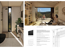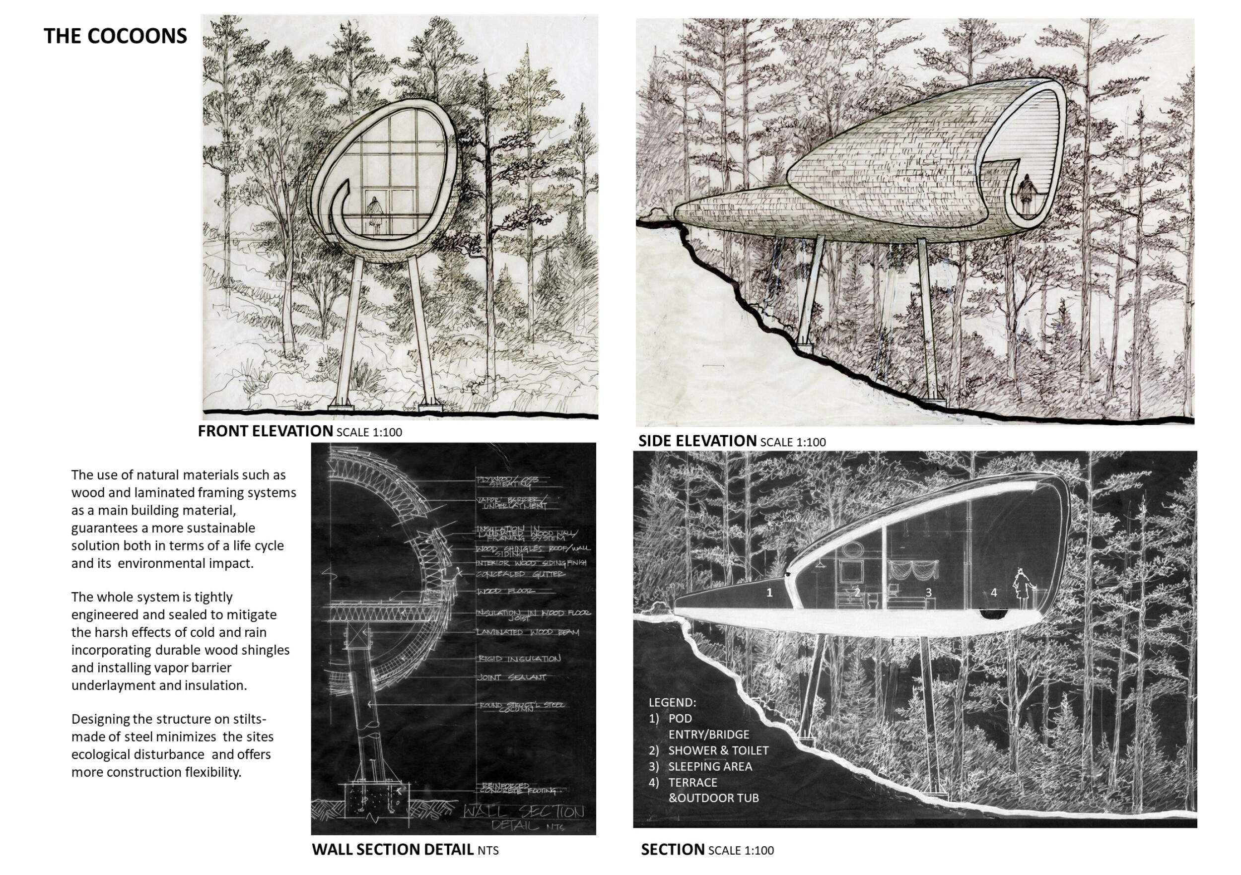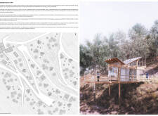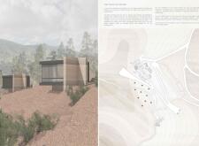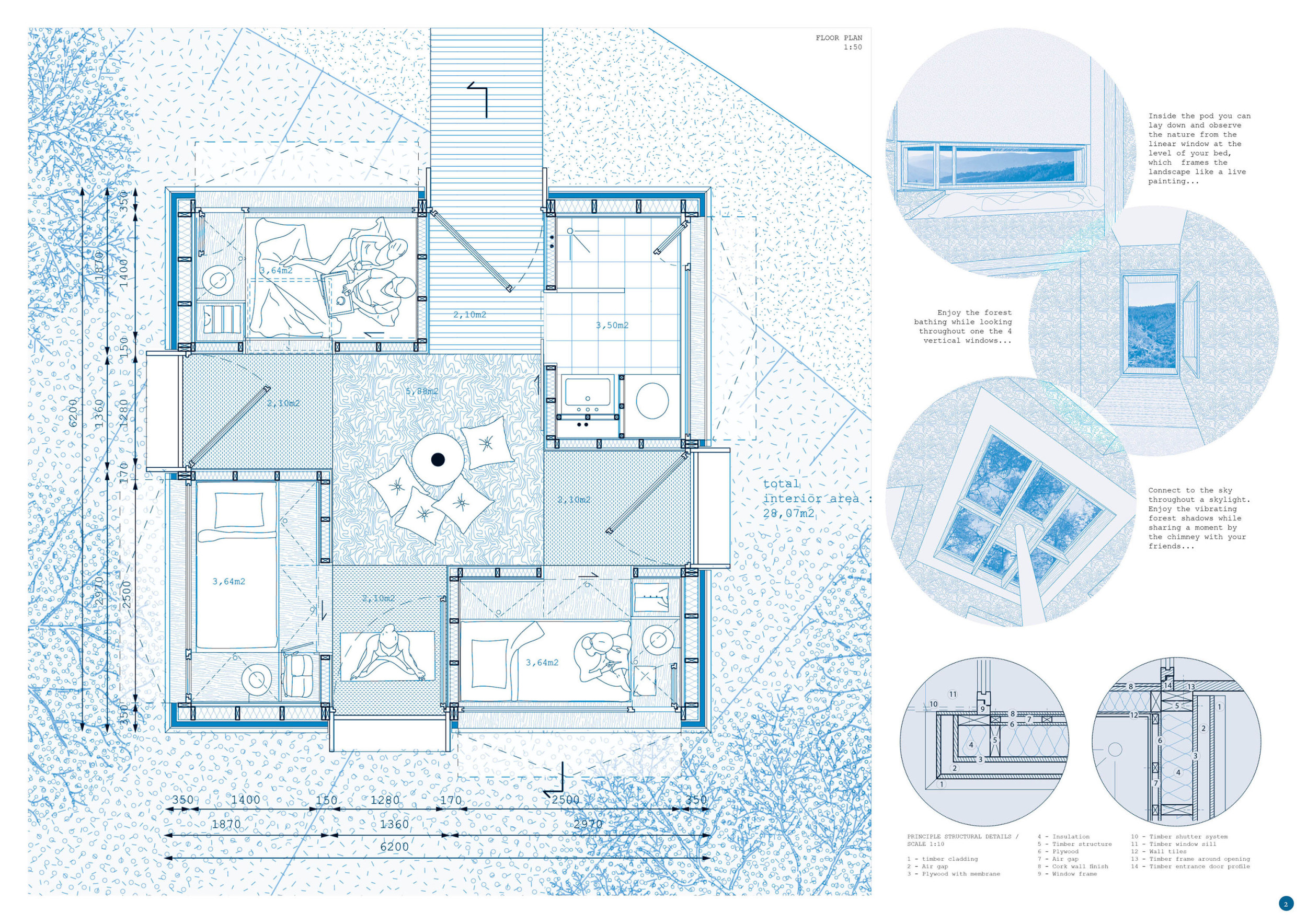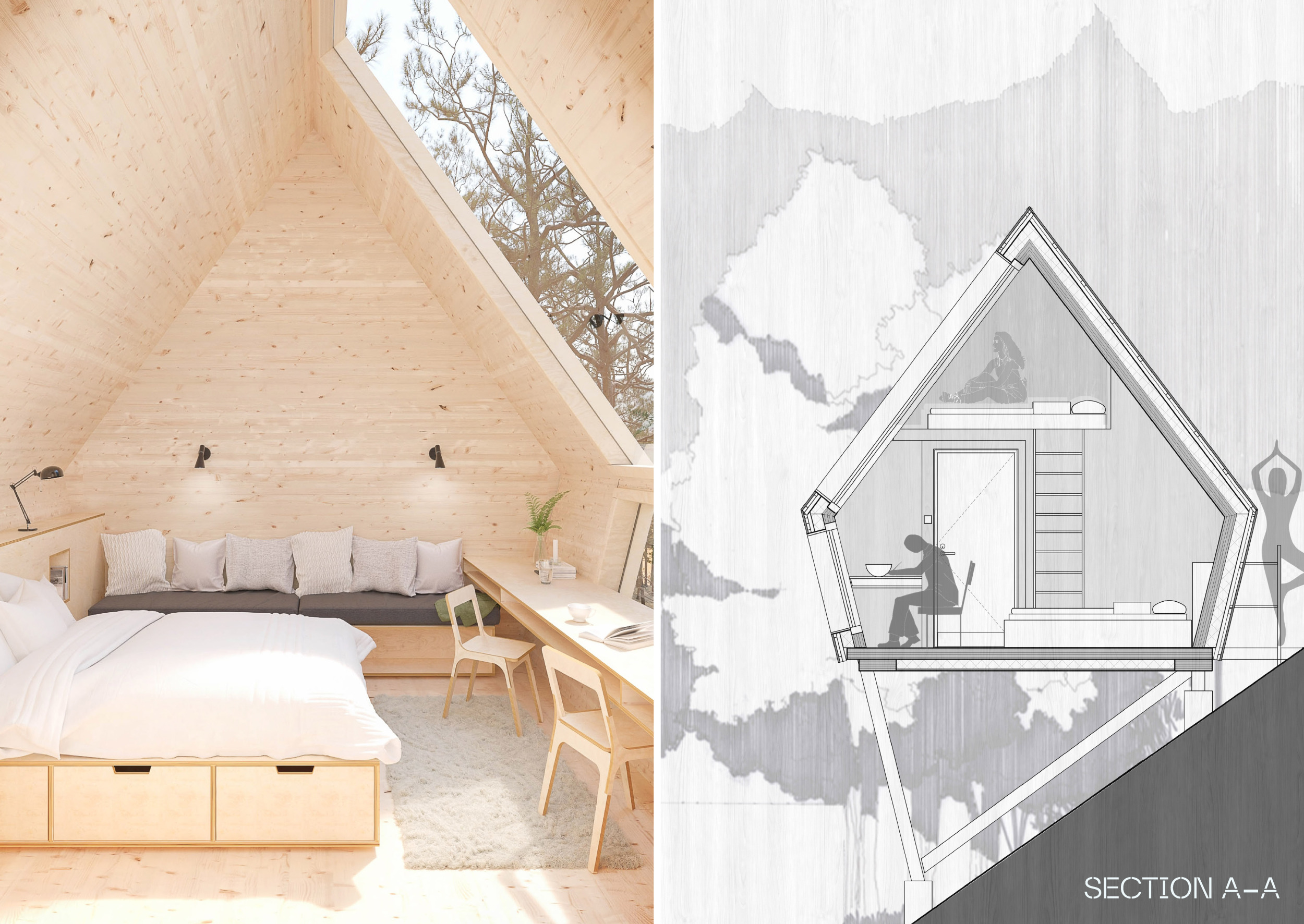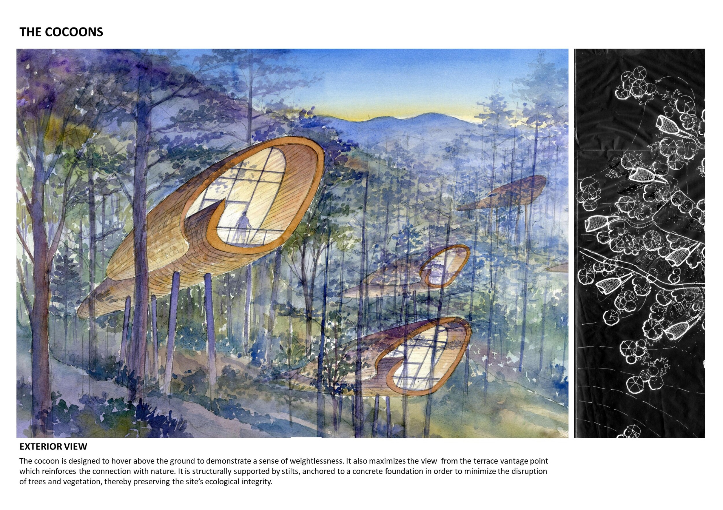 The current infrastructure of the retreat consists of four once-abandoned stone farmhouse cottages that are now repurposed. For the Sleeping Pods on a Cliff competition, participants were tasked with proposing design solutions for simple sleeping pods that could accommodate a couple of guests at a time. Each sleeping pod was to include a basic sleeping zone as well as washing facilities.