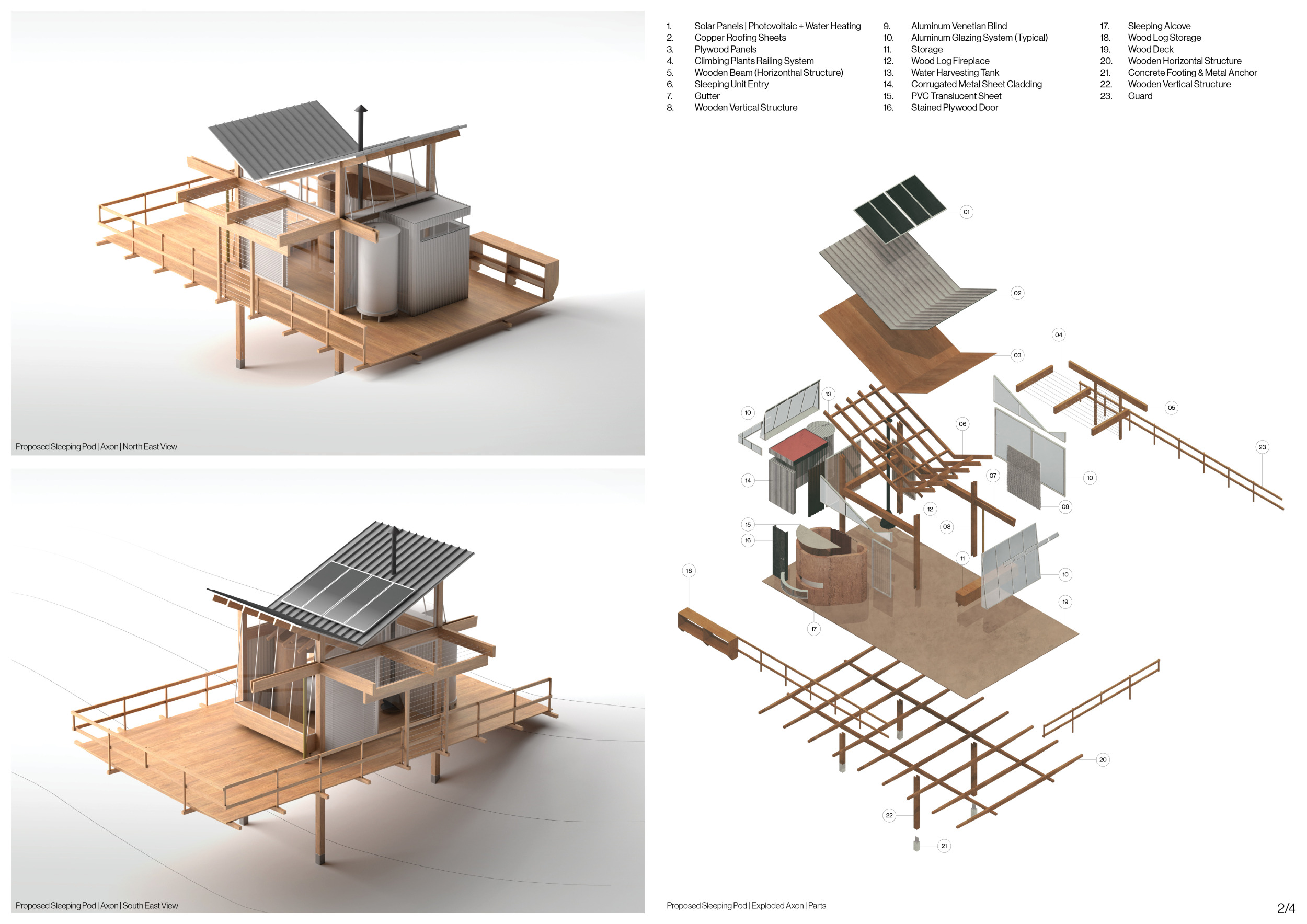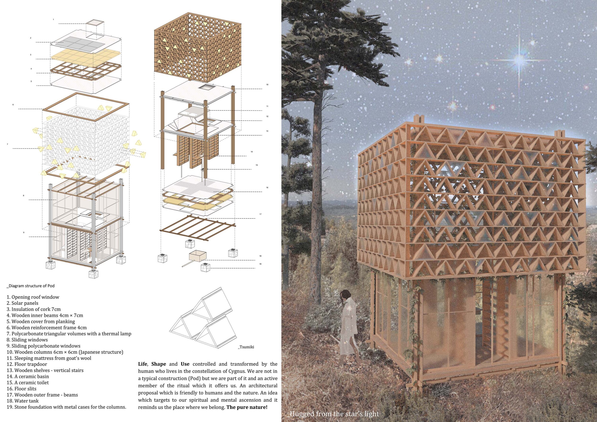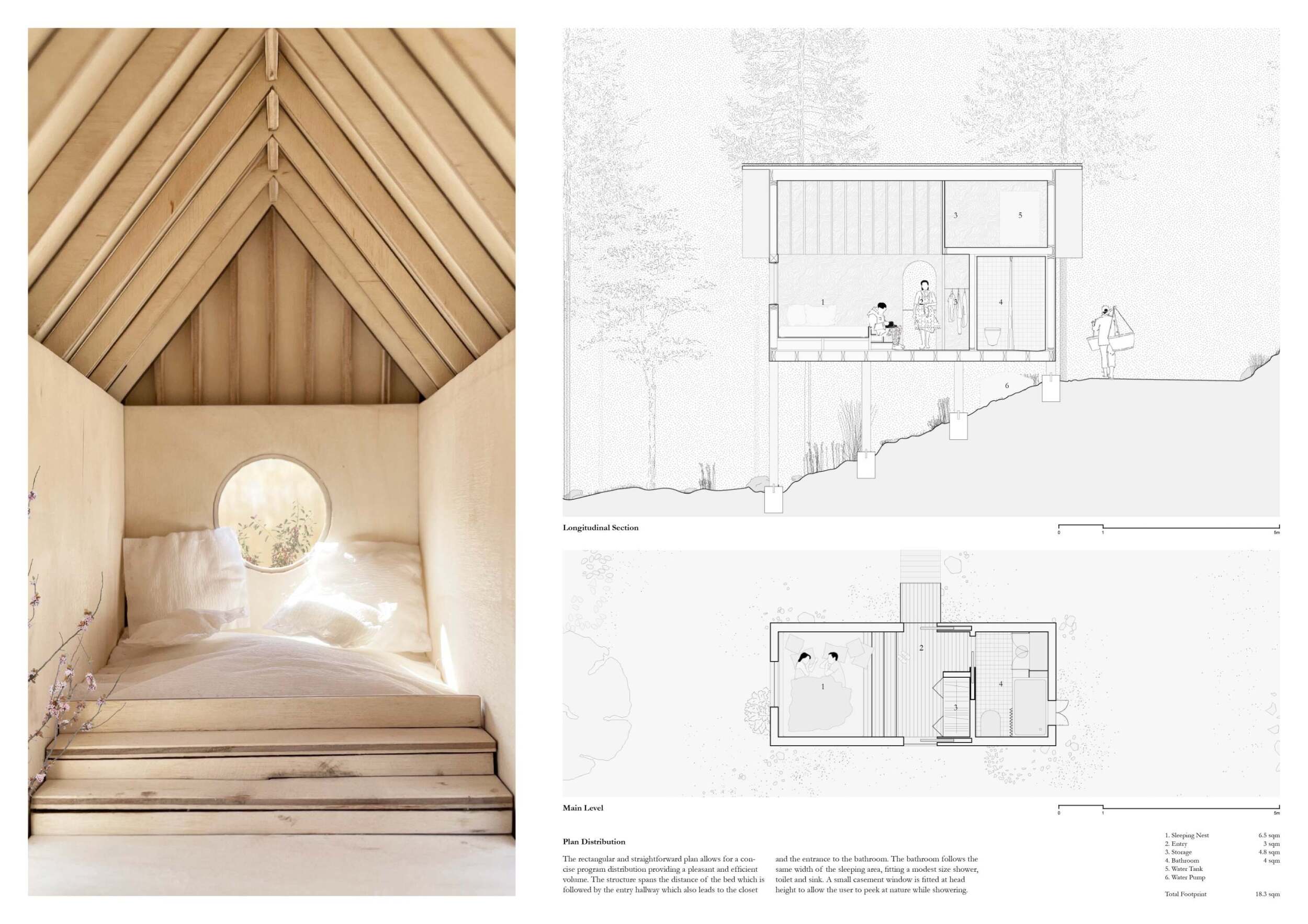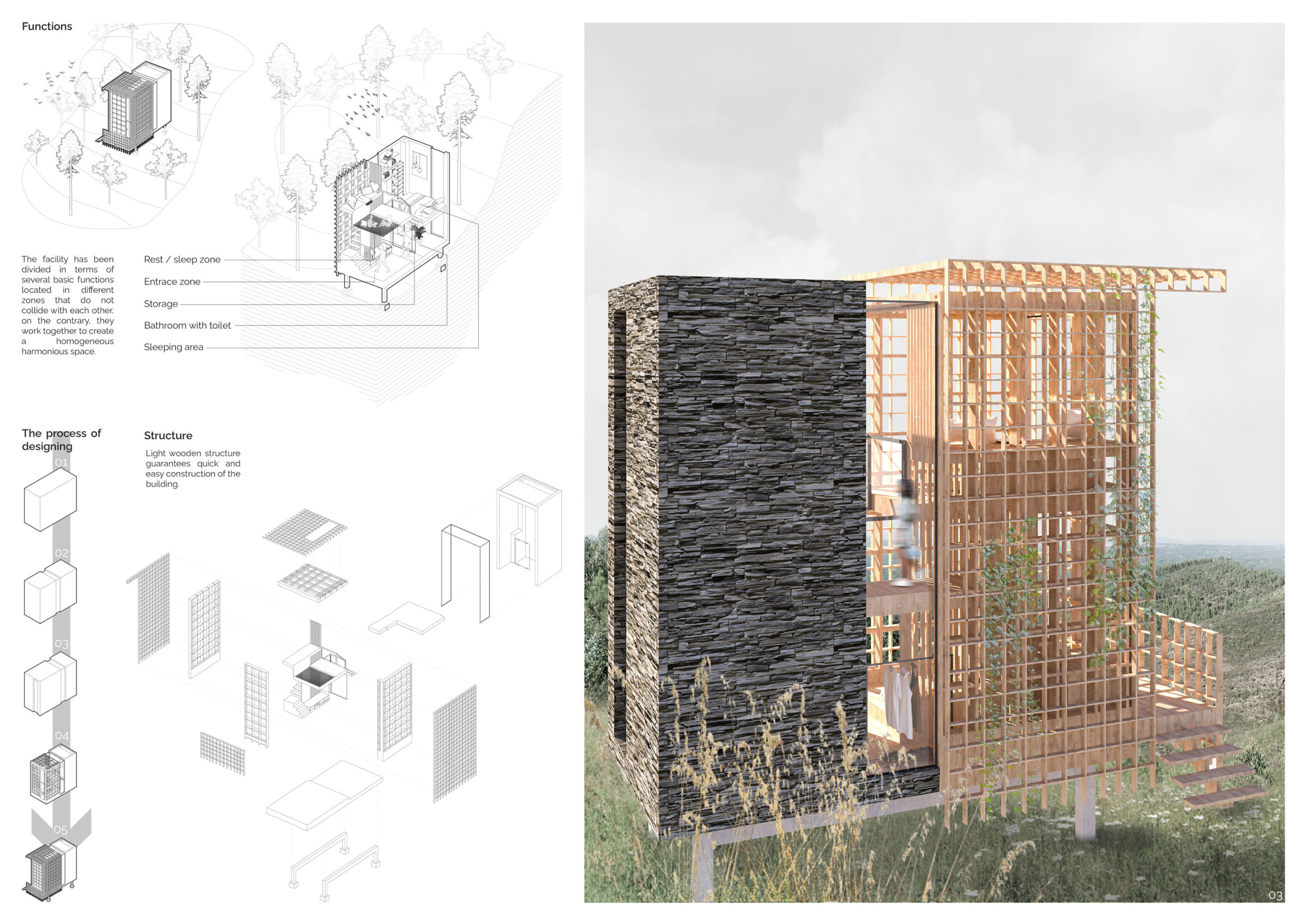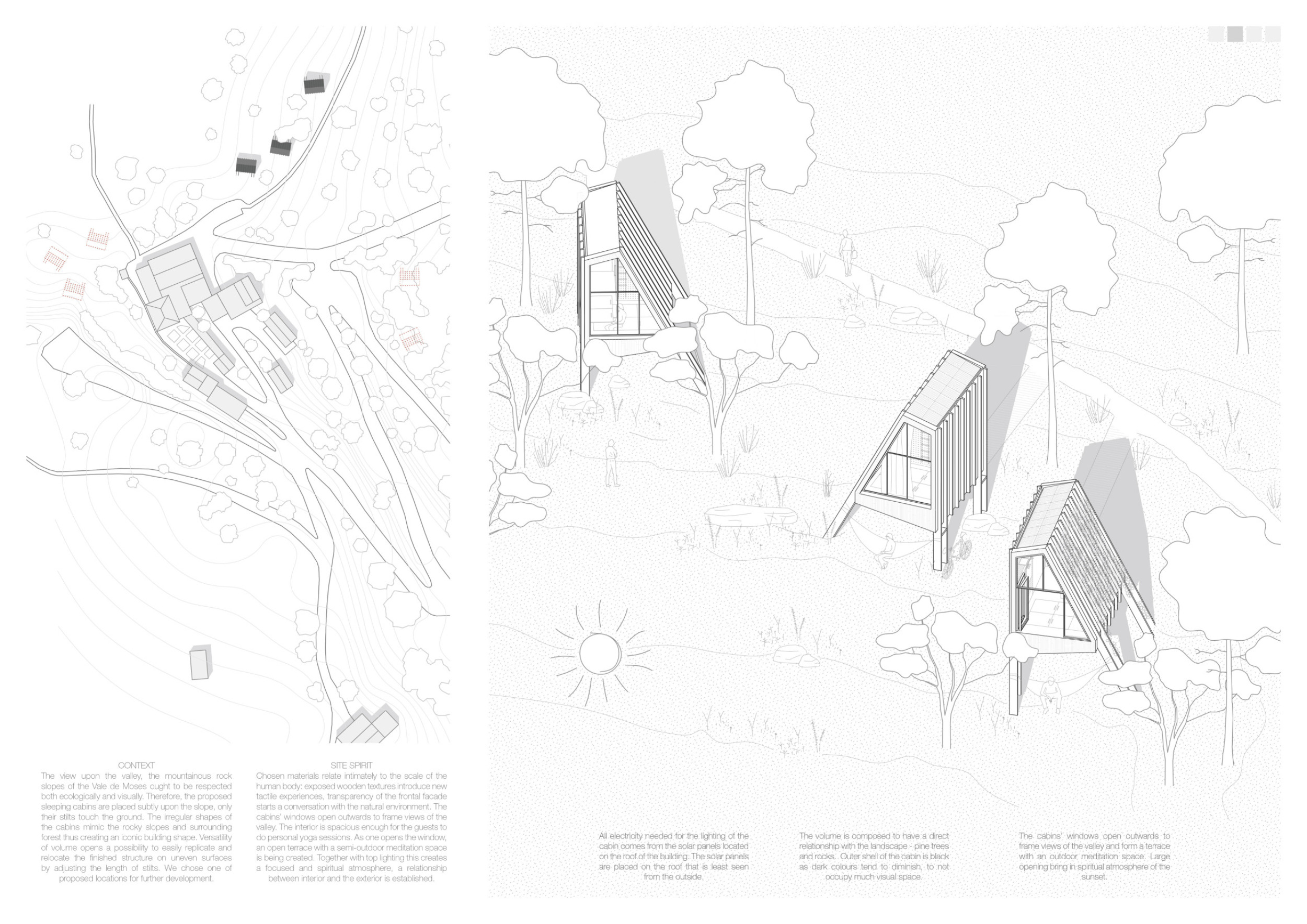 The current infrastructure of the retreat consists of four once-abandoned stone farmhouse cottages that are now repurposed. For the Sleeping Pods on a Cliff competition, participants were tasked with proposing design solutions for simple sleeping pods that could accommodate a couple of guests at a time. Each sleeping pod was to include a basic sleeping zone as well as washing facilities.