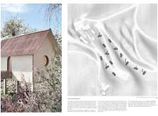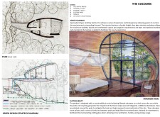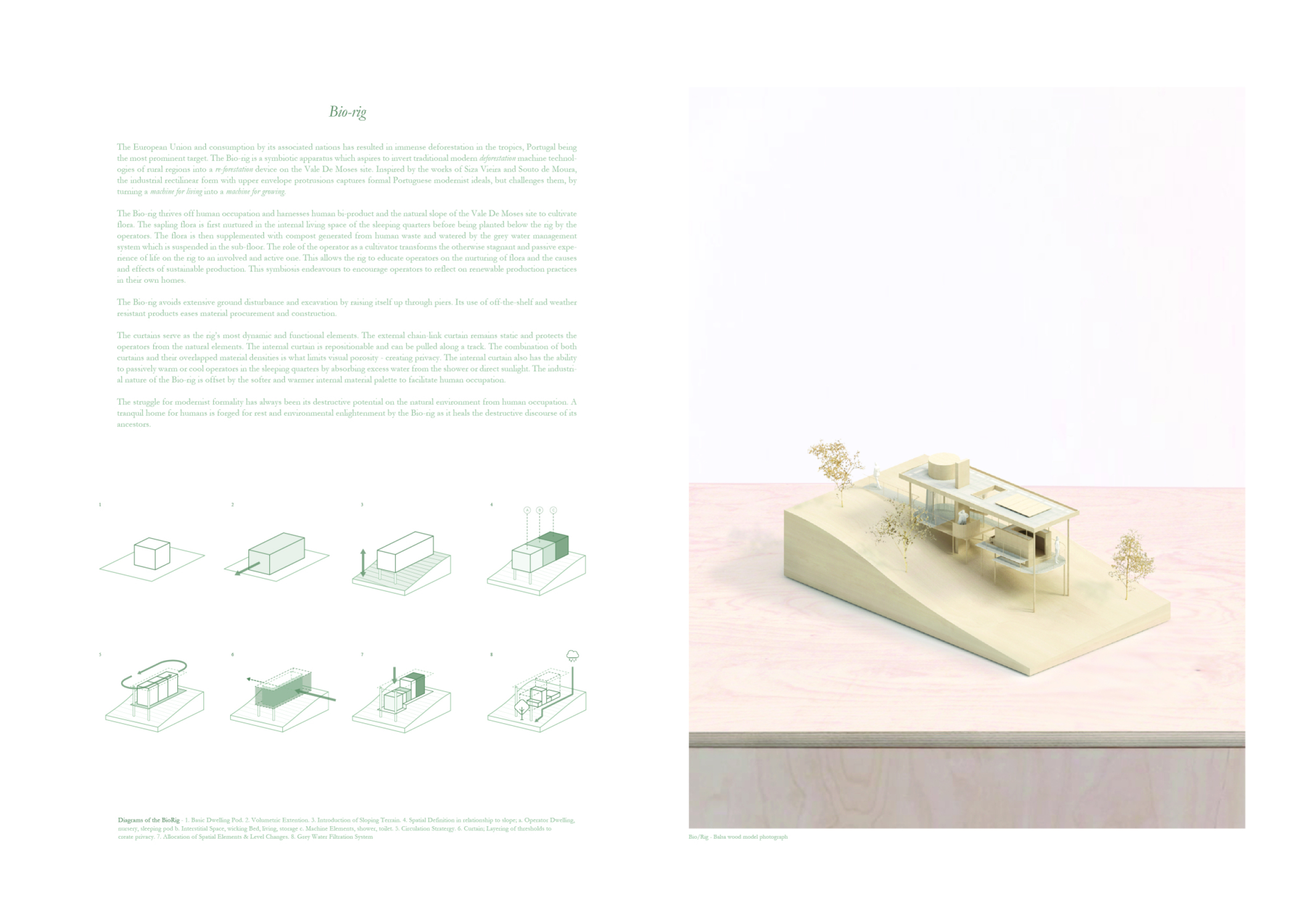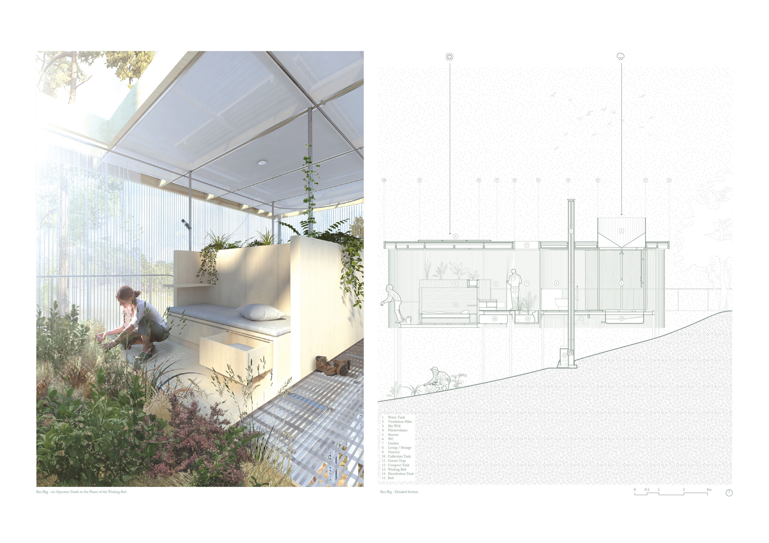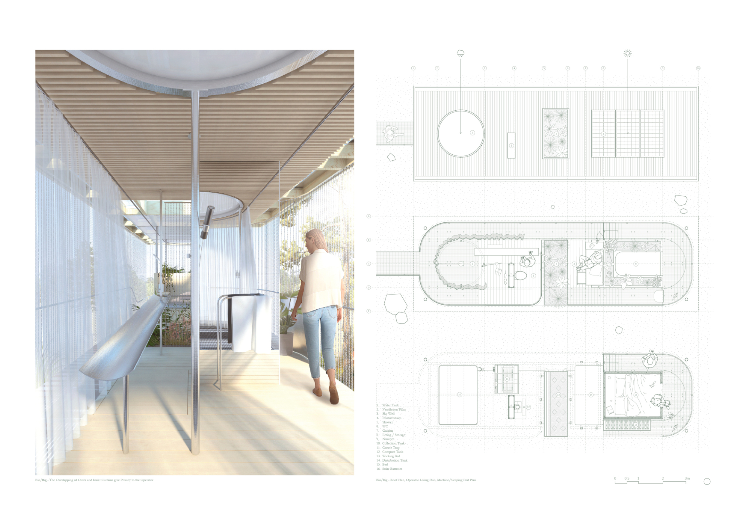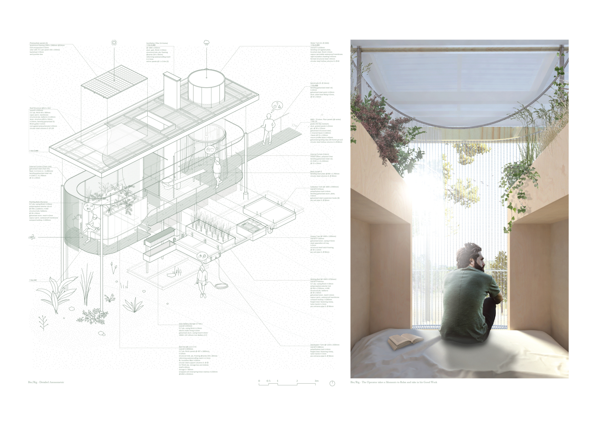 ‘Bio-Rig’ is a proposal for a pill-shaped pod, defined by two rings of curtains centered on an interior plant nursery. The exterior curtain of galvanized chain link and interior curtain of fabric offer the user a variety of micro-spatial opportunities. The jurors described the project as “a poetic proposal with an inner core with functional, sculptural elements and an open circulation space at the perimeter.