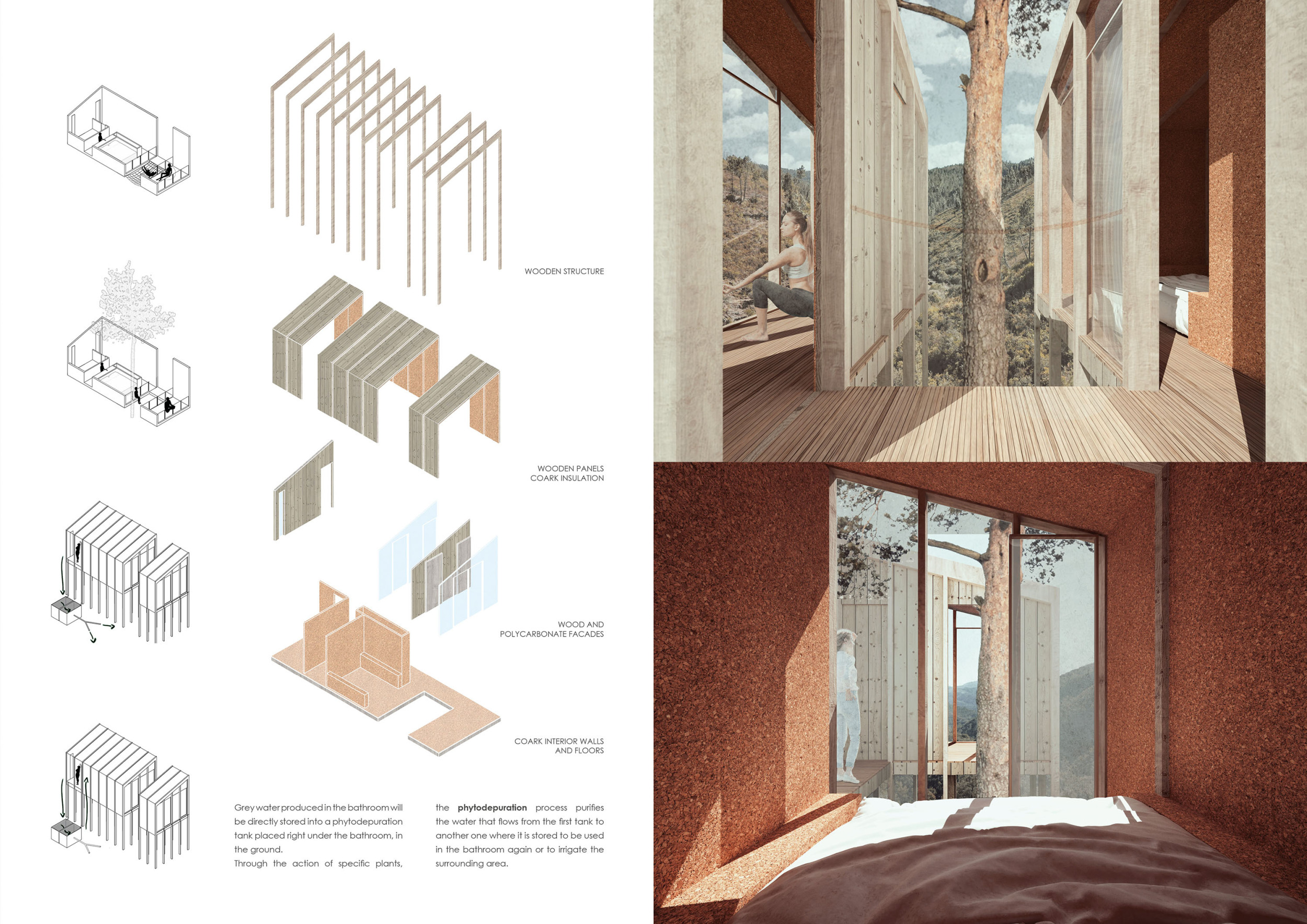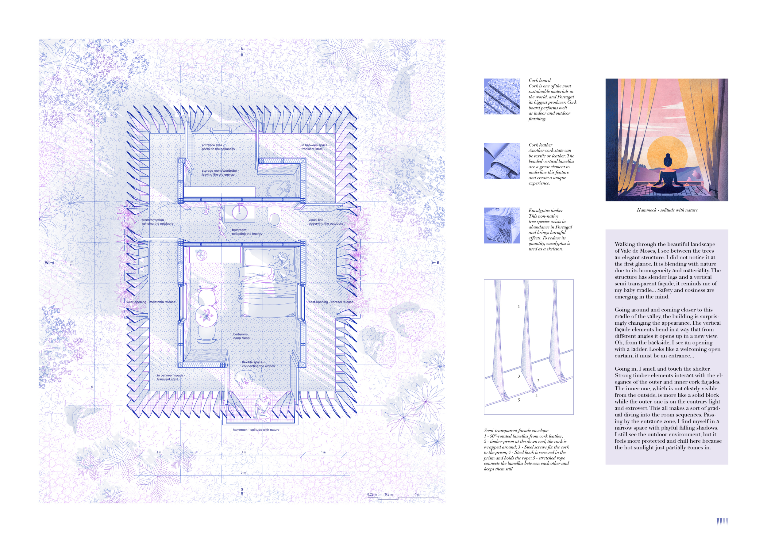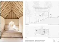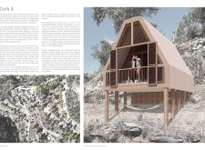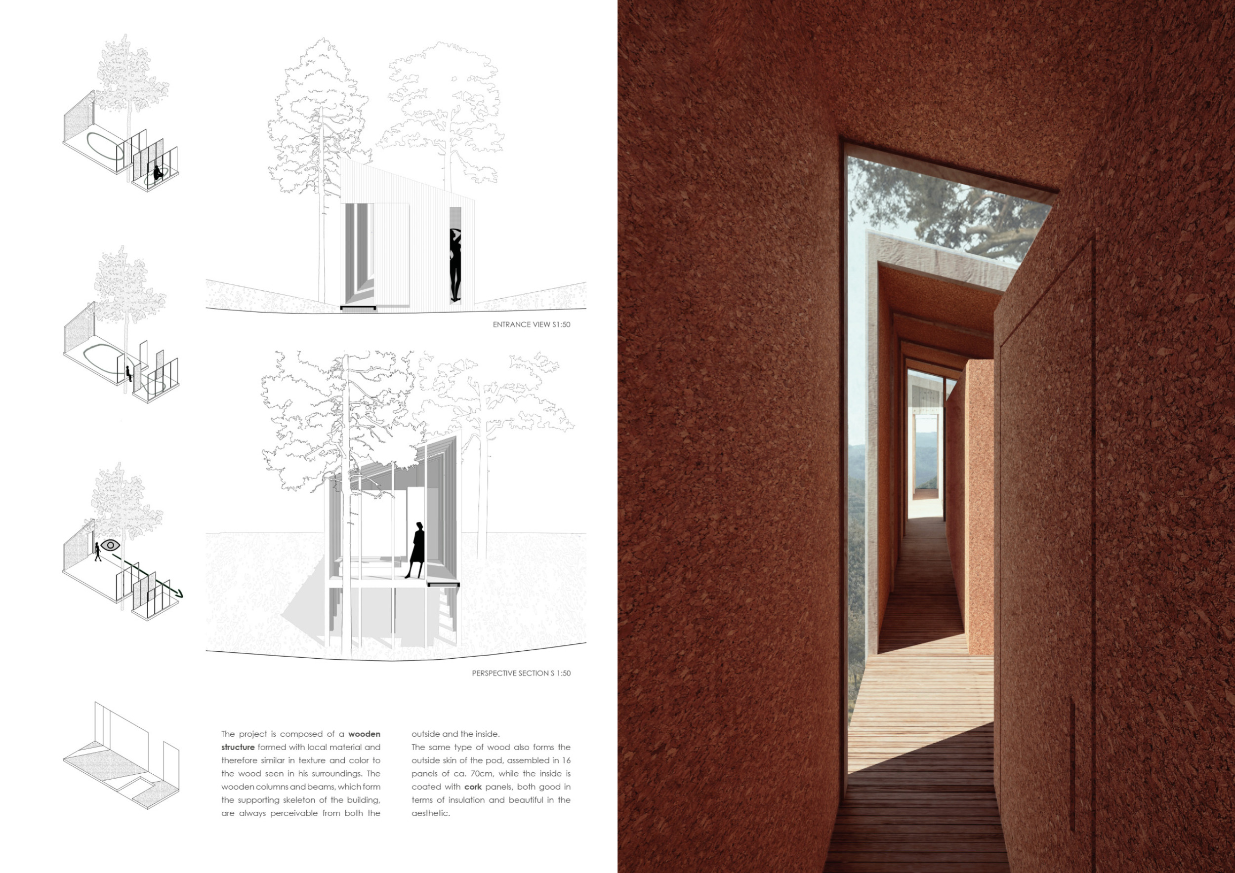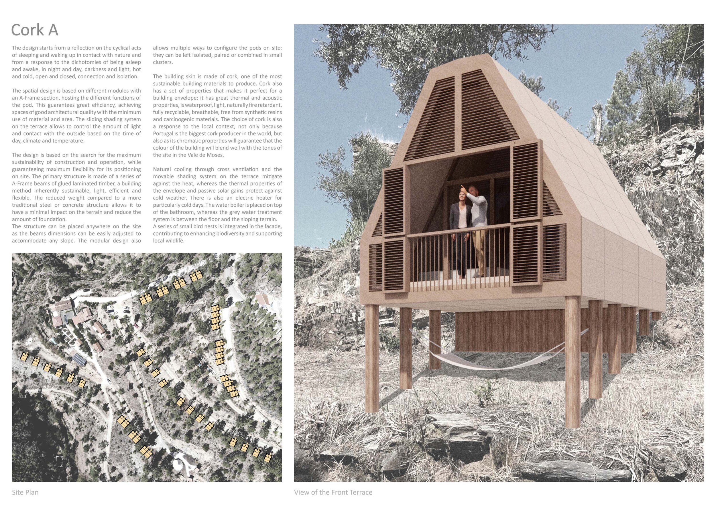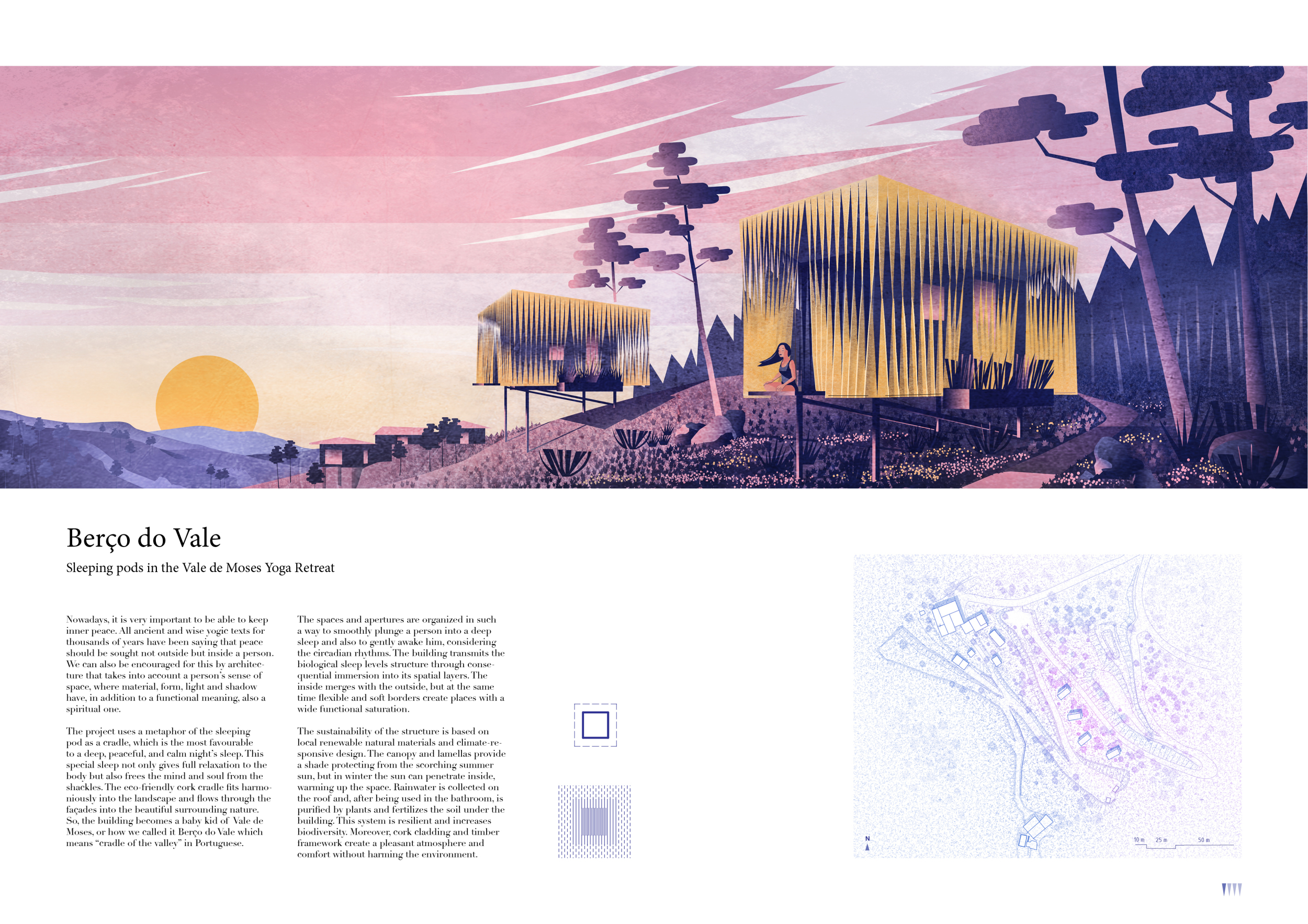 ‘Berço do Vale’ is a rectangular pod with an outer perimeter of vertical lamella made of cork leather and an inner core of timber. The proposal is based on the concept of a ‘cradle’ – a favorable tool for a deep and peaceful night’s sleep. According to the jury, “Utilizing the leathered state of cork as a rain screen and light-diffusing cladding is a beautiful idea.
