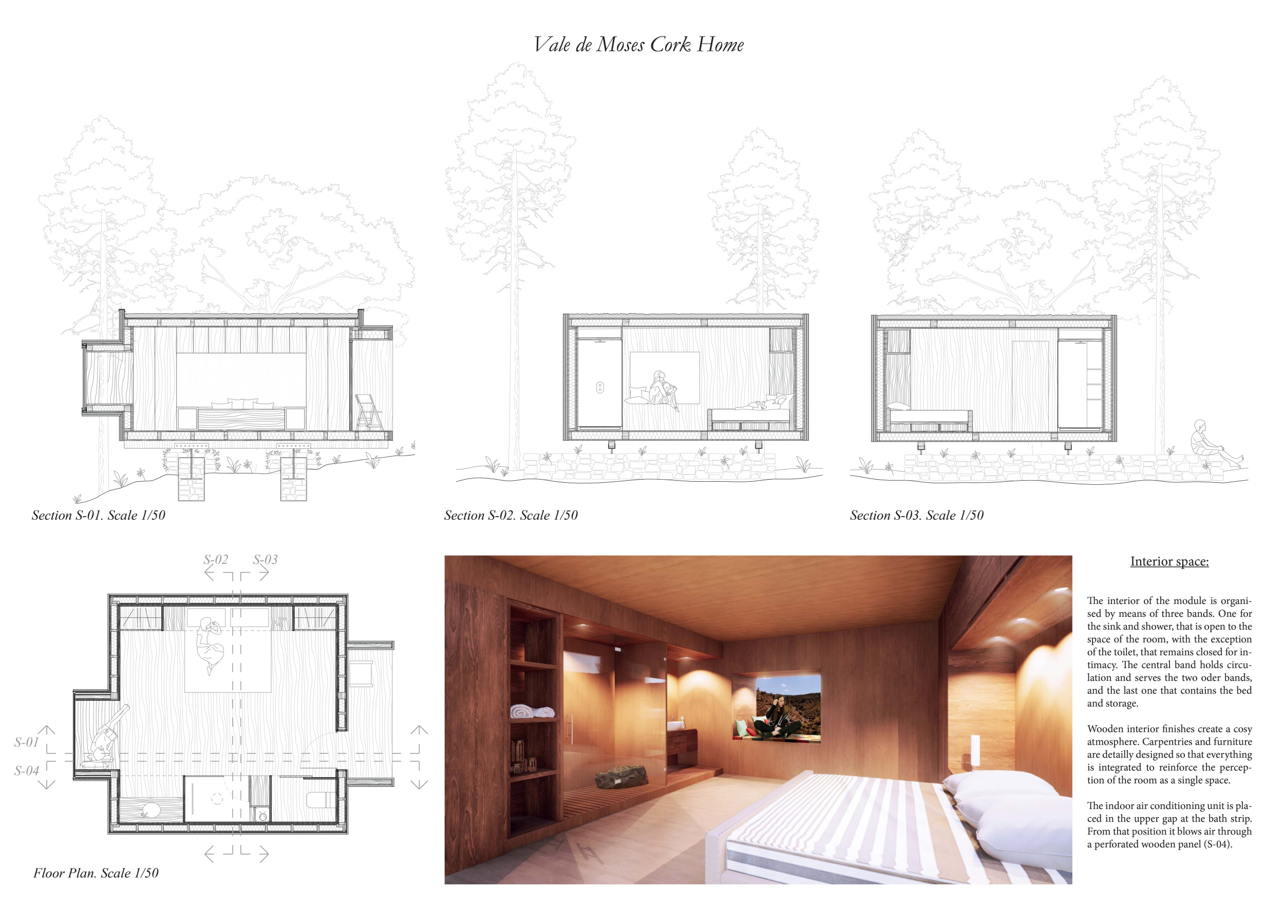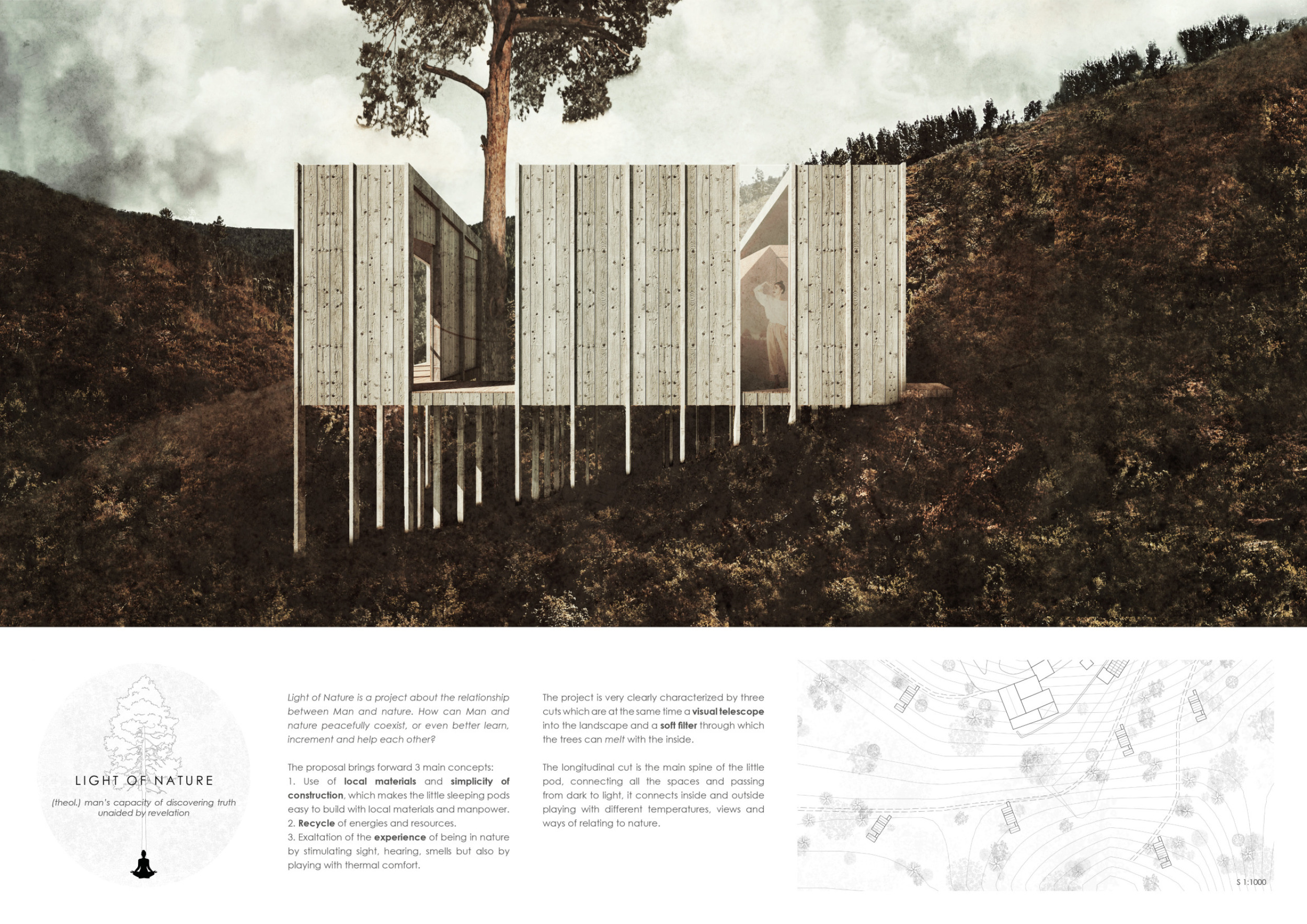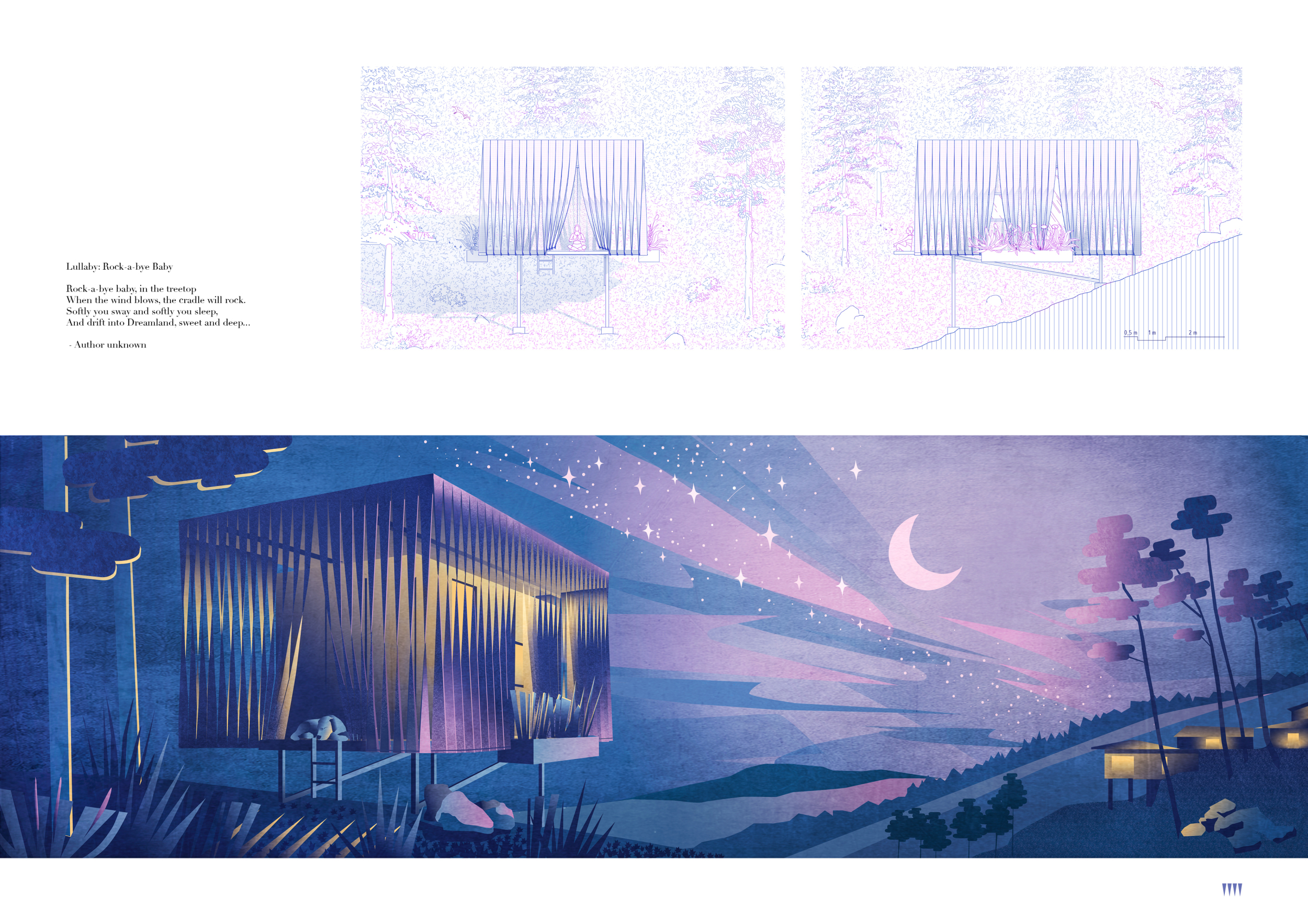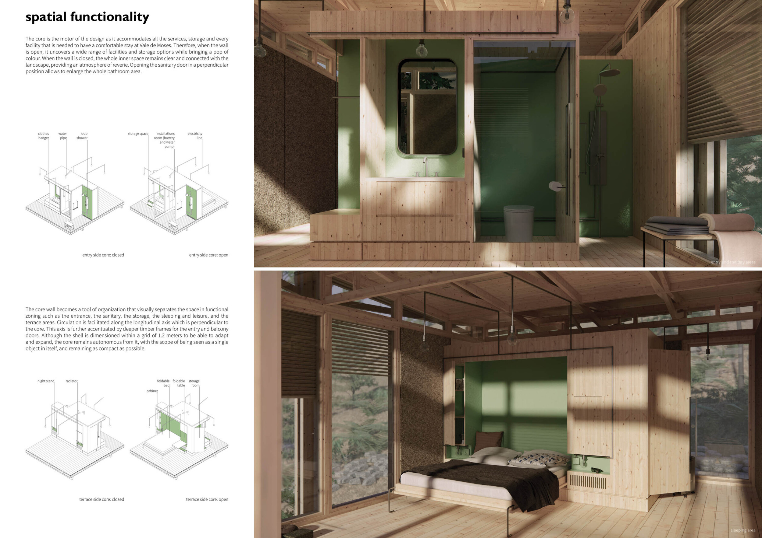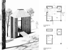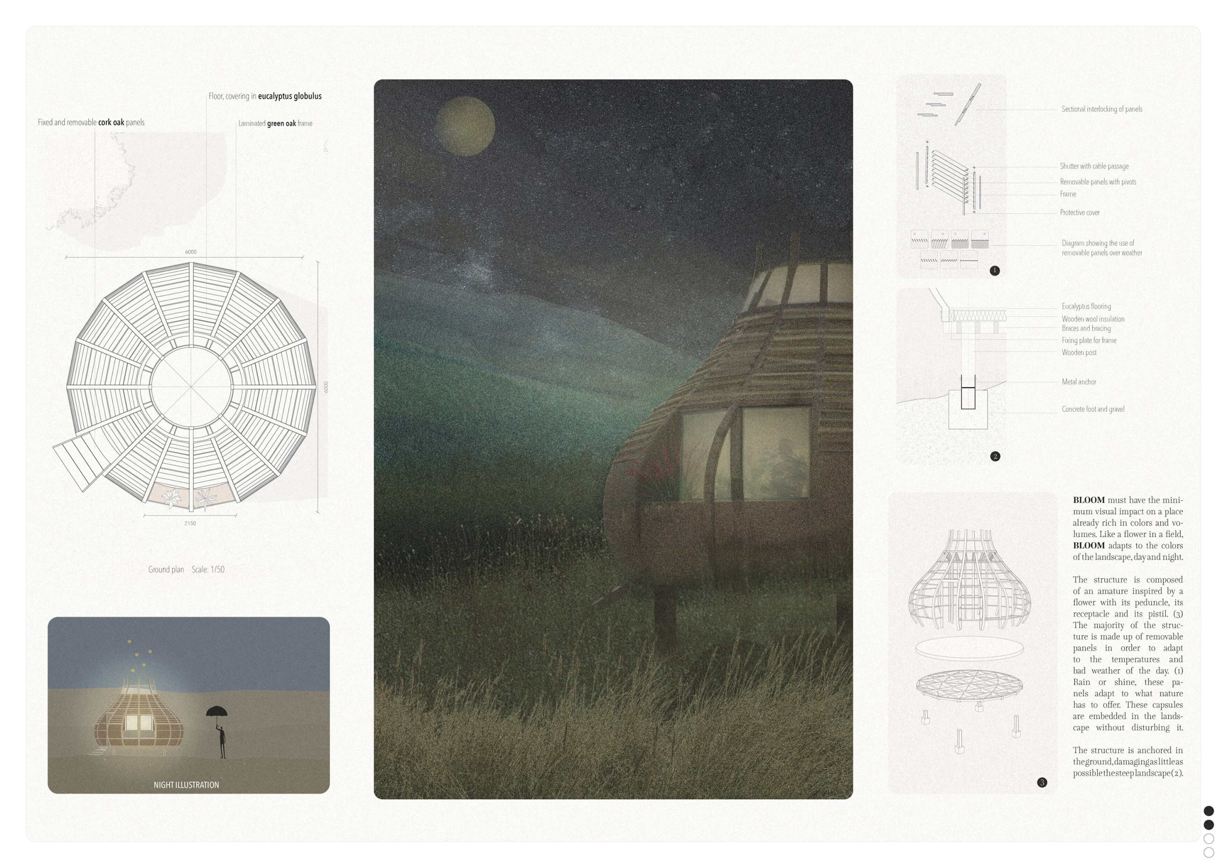 ‘Berço do Vale’ is a rectangular pod with an outer perimeter of vertical lamella made of cork leather and an inner core of timber. The proposal is based on the concept of a ‘cradle’ – a favorable tool for a deep and peaceful night’s sleep. According to the jury, “Utilizing the leathered state of cork as a rain screen and light-diffusing cladding is a beautiful idea.