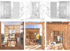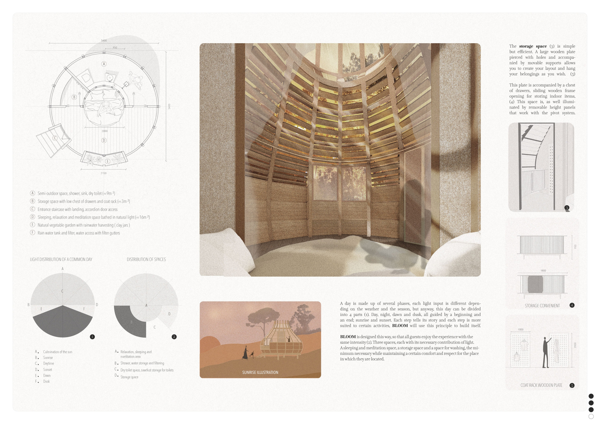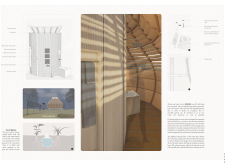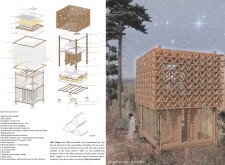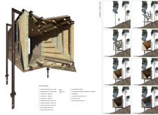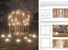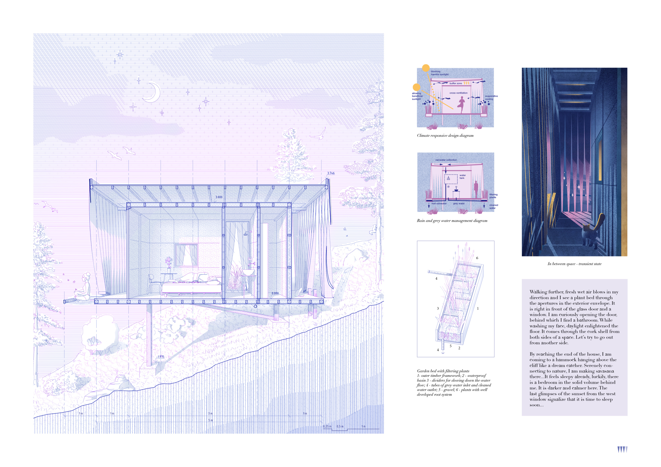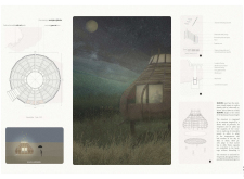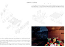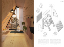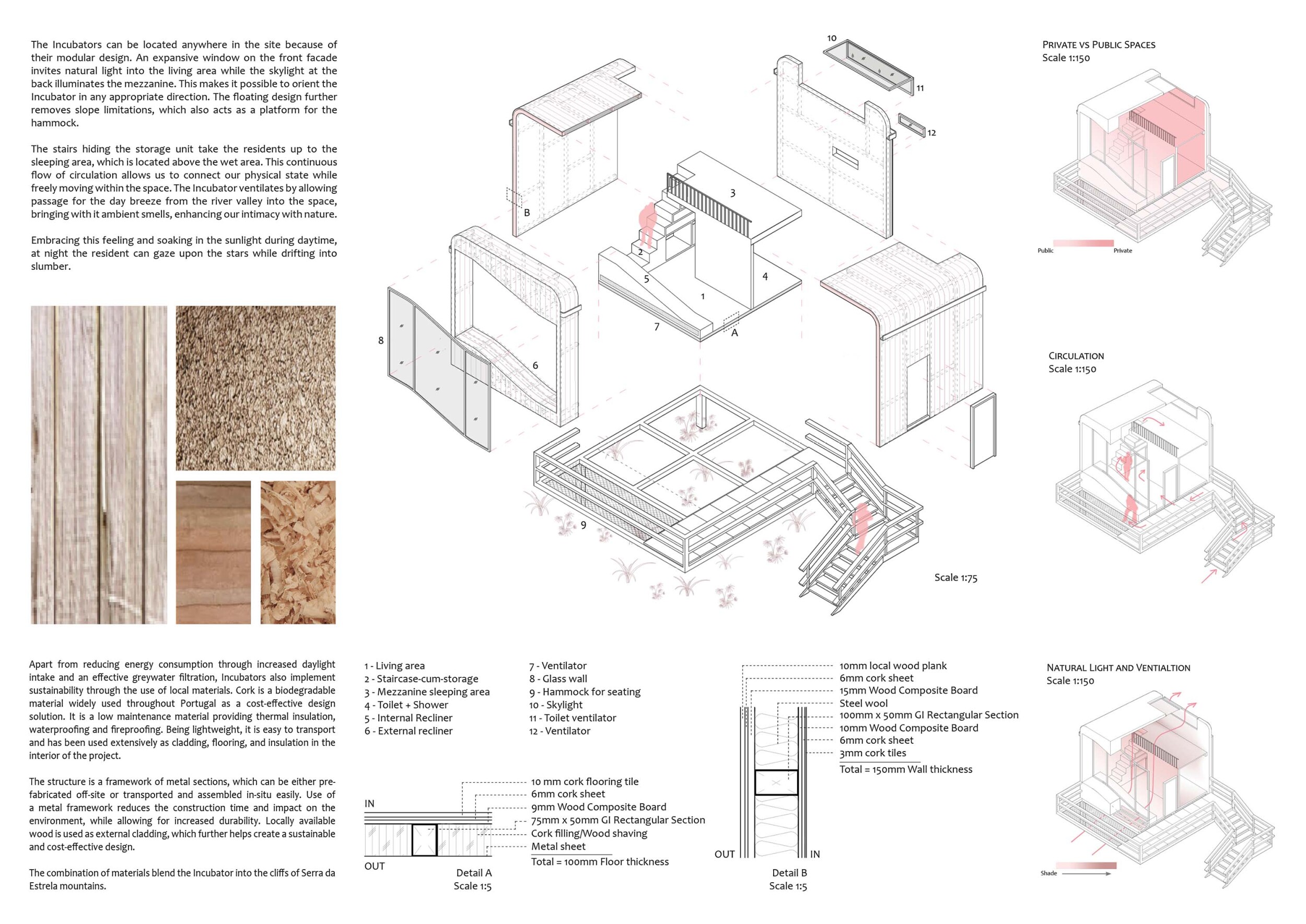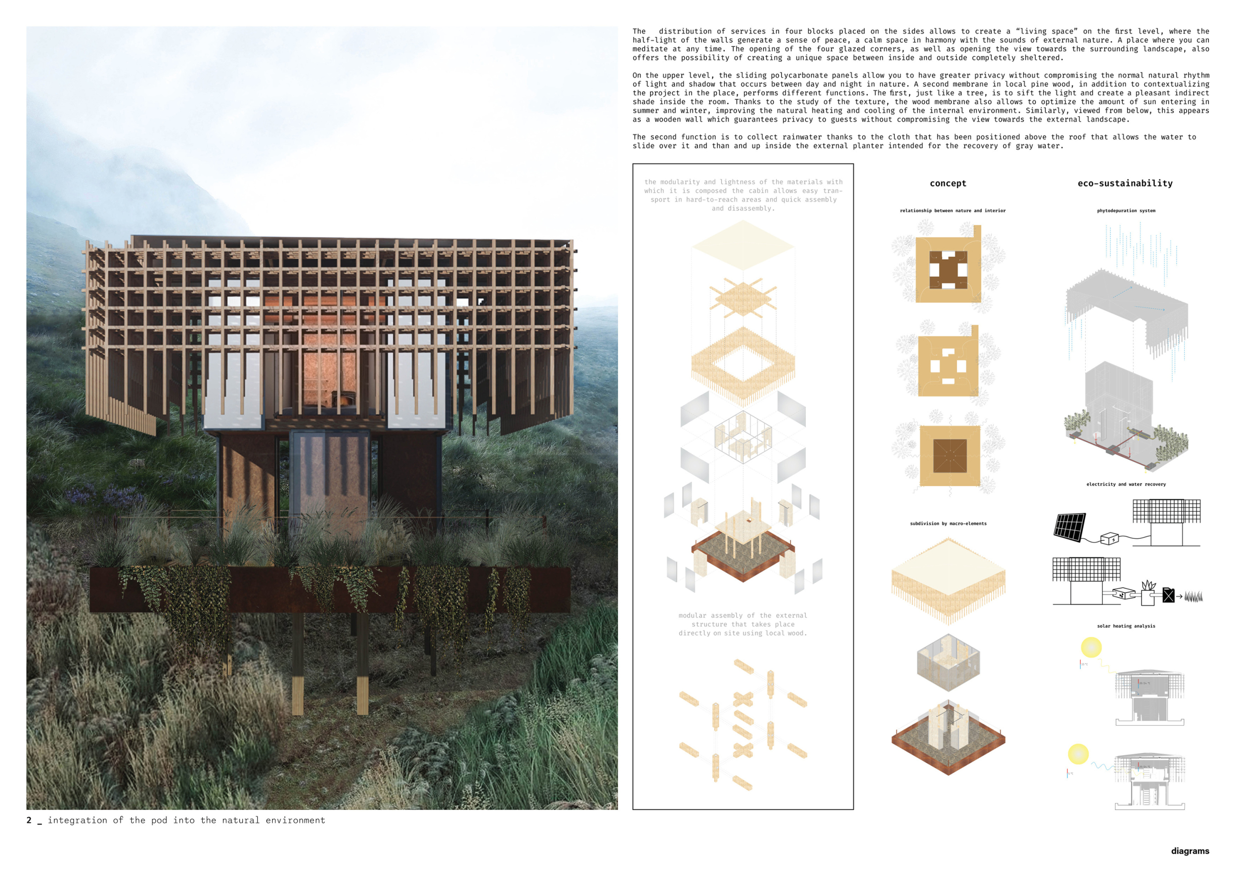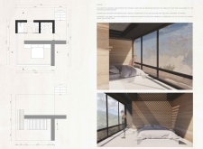 ‘Berço do Vale’ is a rectangular pod with an outer perimeter of vertical lamella made of cork leather and an inner core of timber. The proposal is based on the concept of a ‘cradle’ – a favorable tool for a deep and peaceful night’s sleep. According to the jury, “Utilizing the leathered state of cork as a rain screen and light-diffusing cladding is a beautiful idea.