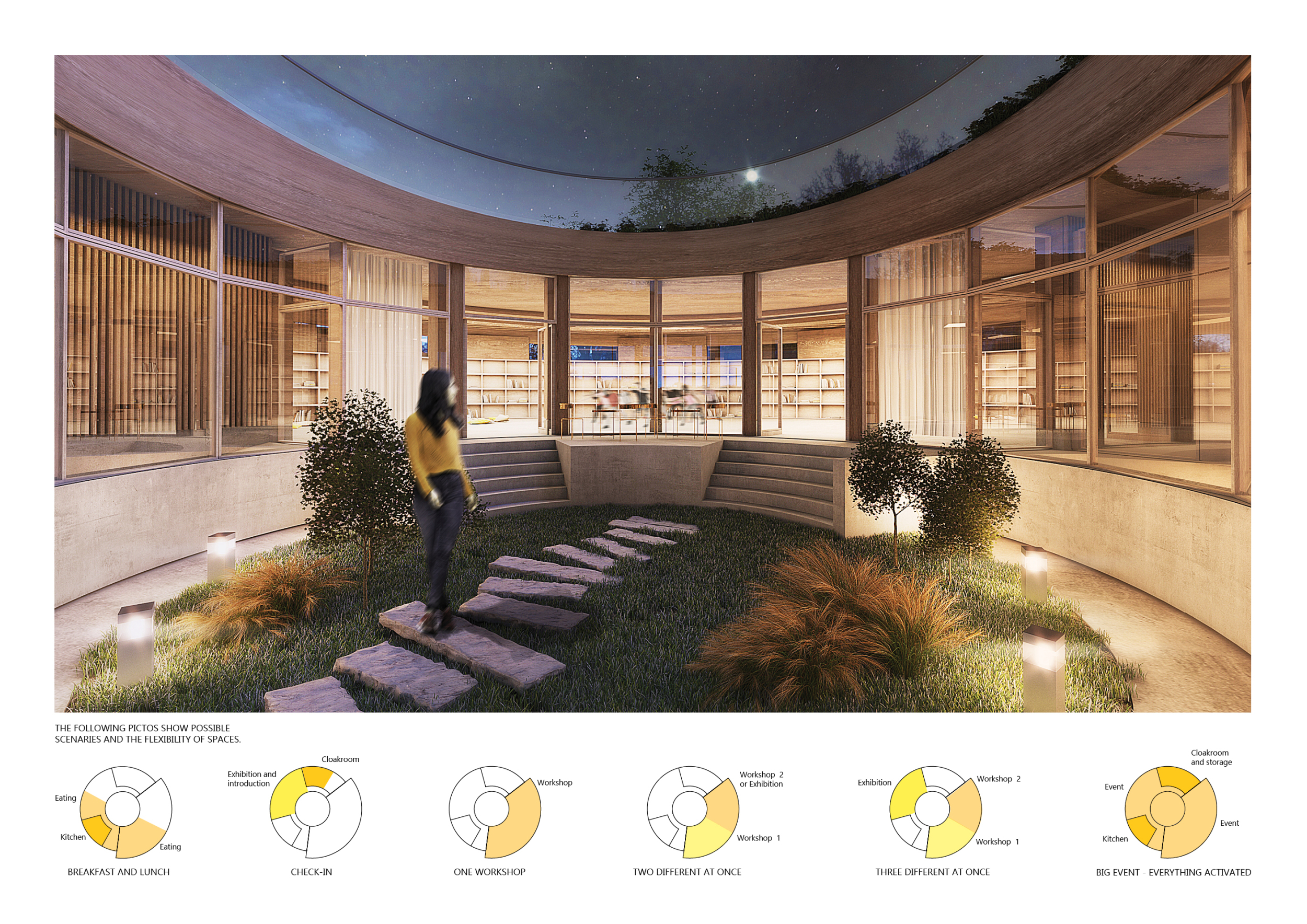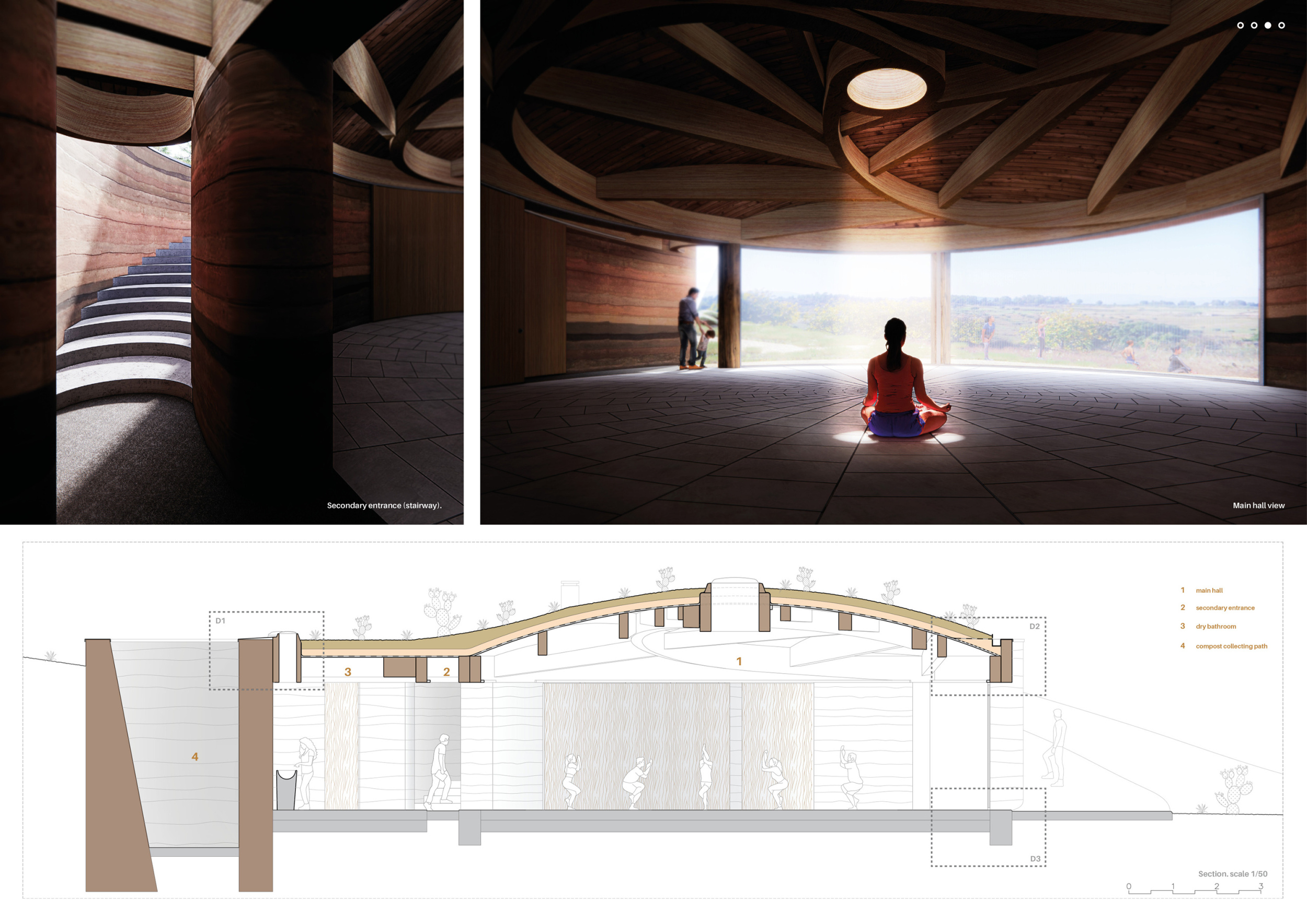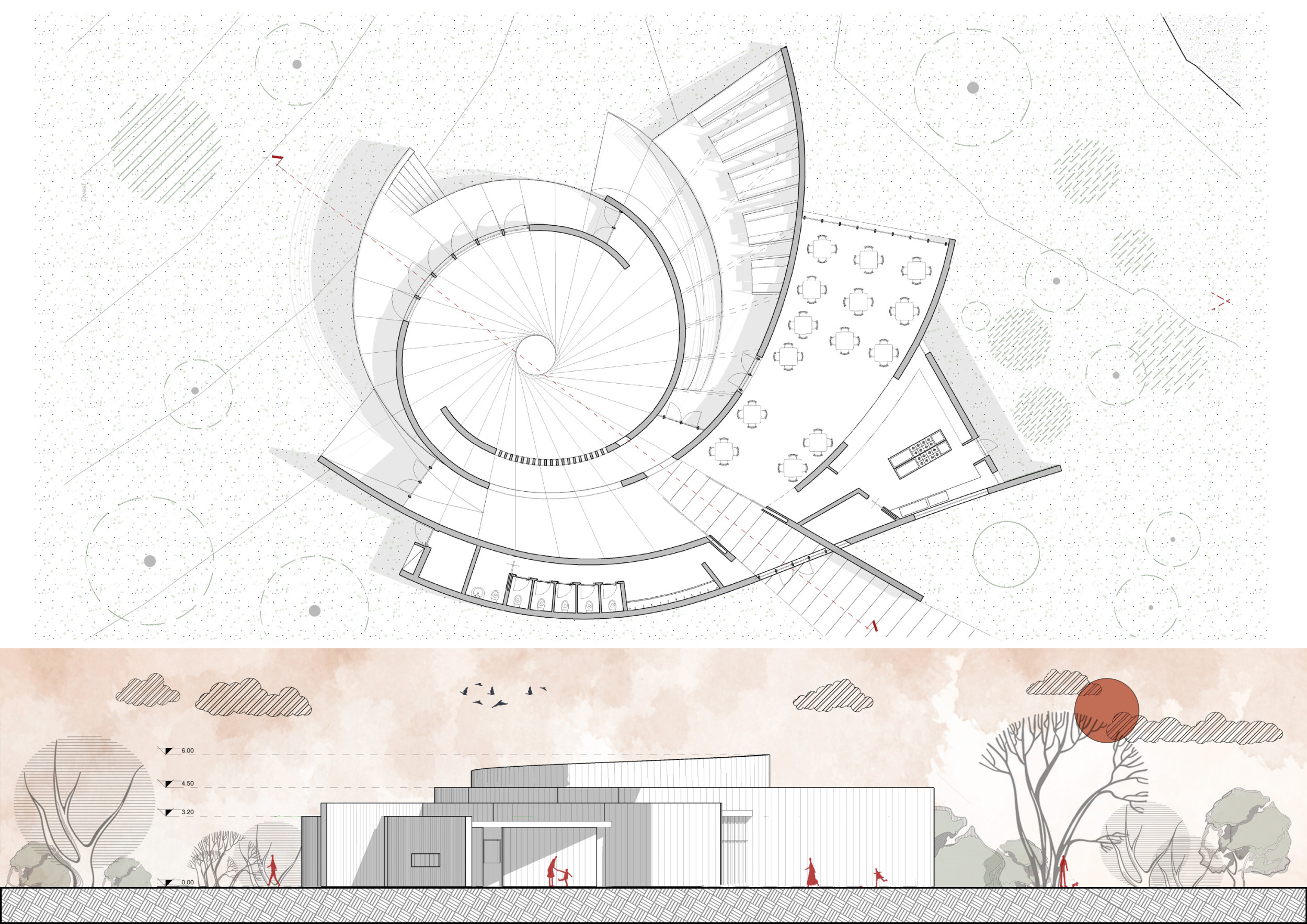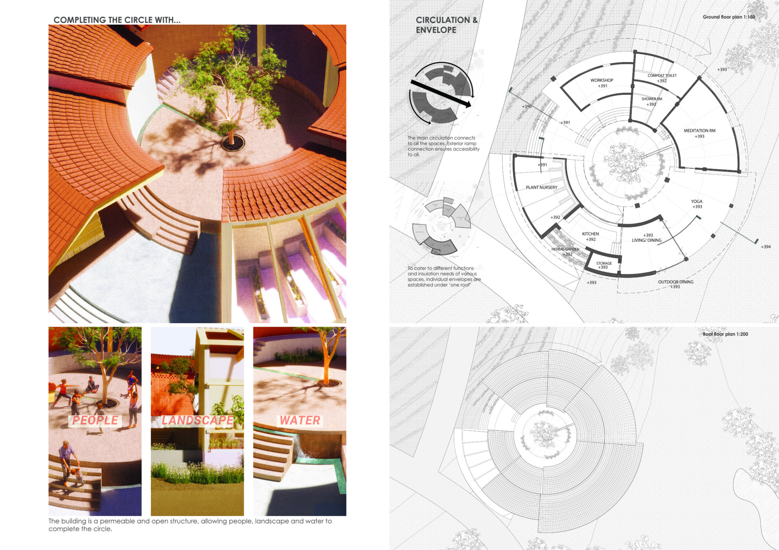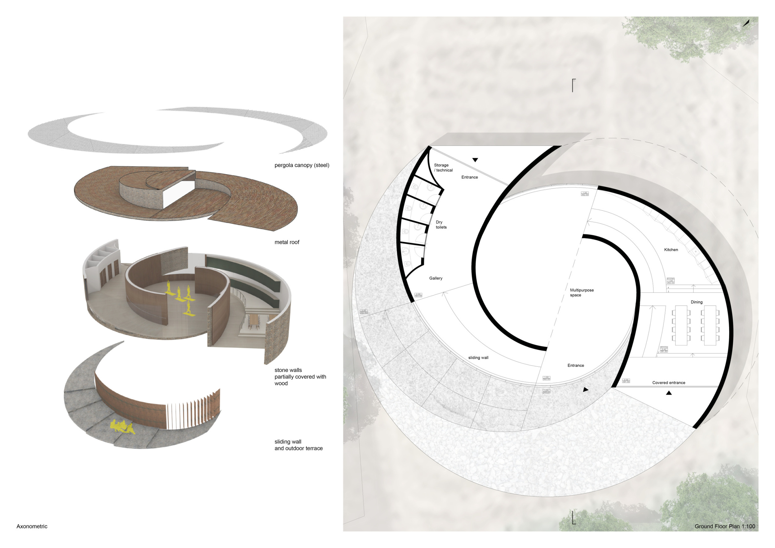 The project, titled ‘Swirl Pavilion’, proposes a circular structure made of rammed earth and timber, featuring openings on the east and west for natural ventilation, and an inclined green roof centered on a skylight. According to the jury, “There is a quiet subtlety about this design that made this proposal stand out.