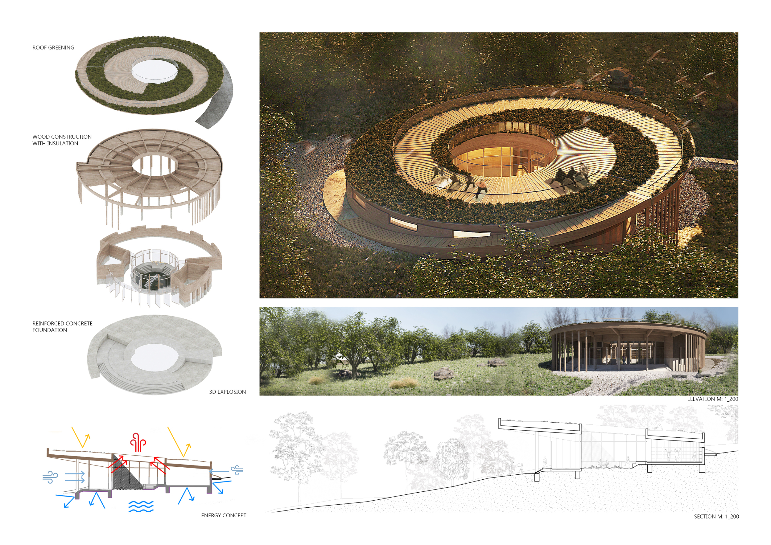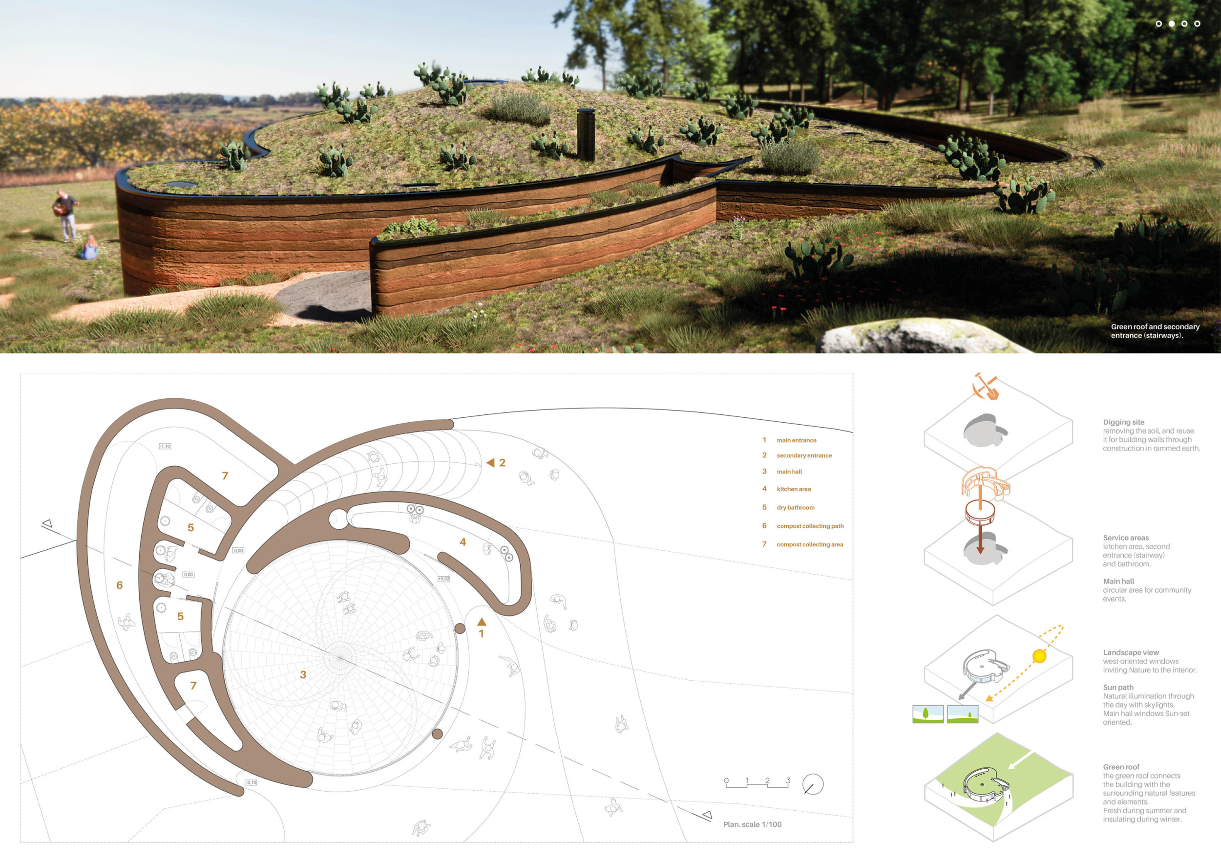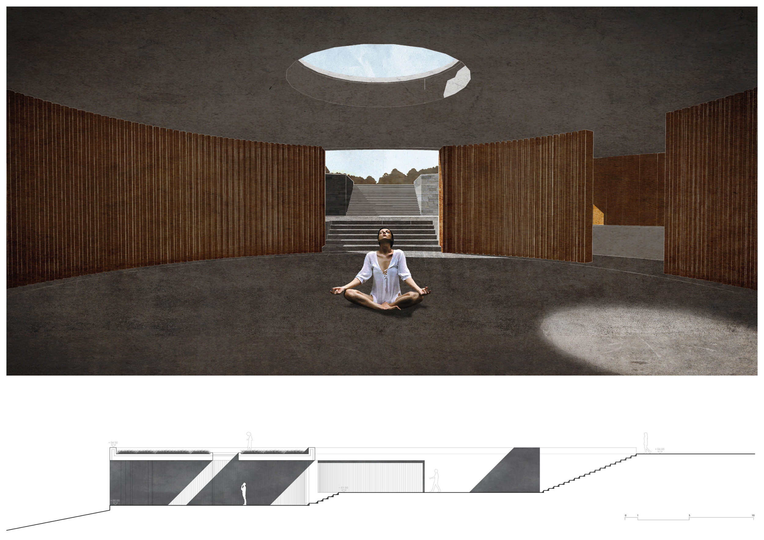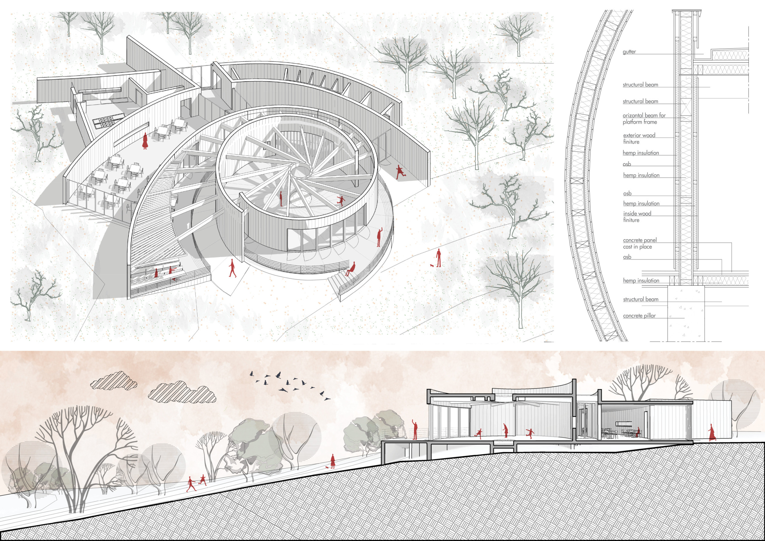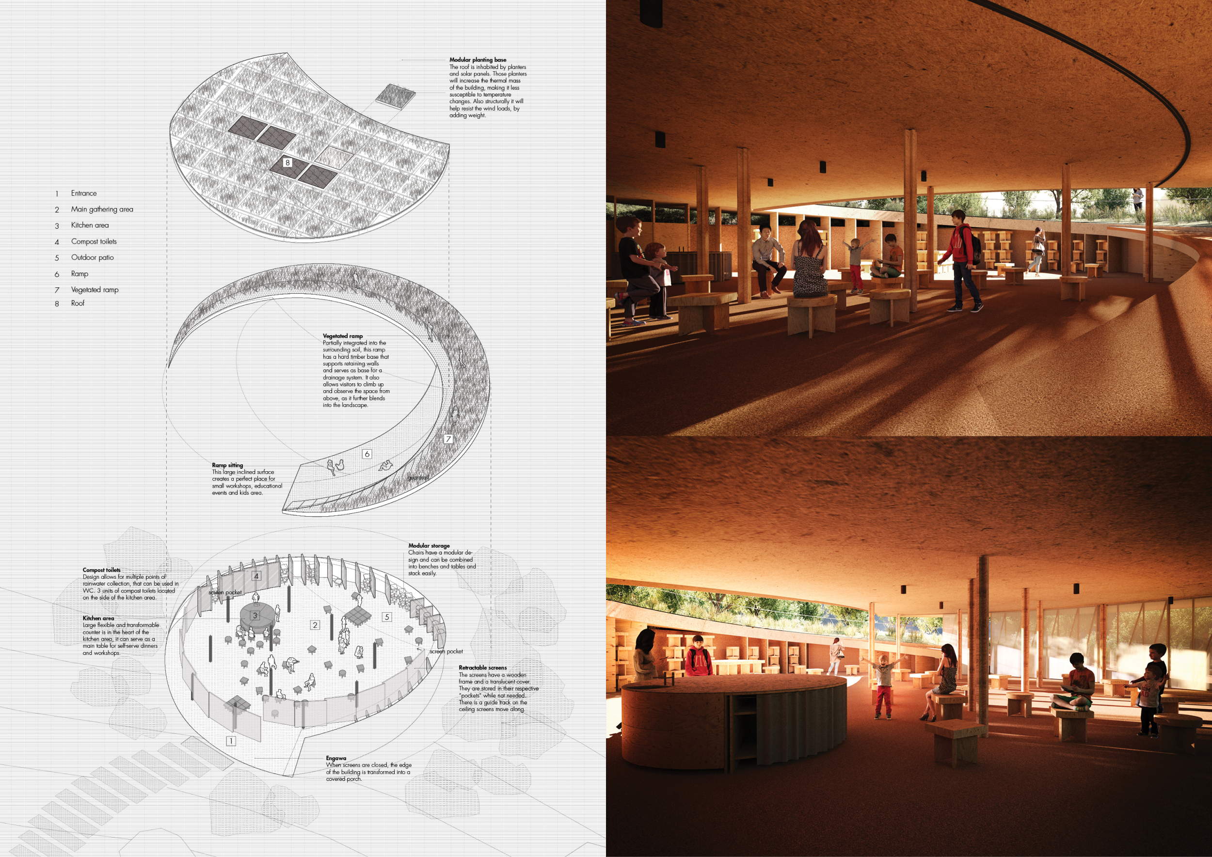 The project, titled ‘Swirl Pavilion’, proposes a circular structure made of rammed earth and timber, featuring openings on the east and west for natural ventilation, and an inclined green roof centered on a skylight. According to the jury, “There is a quiet subtlety about this design that made this proposal stand out.