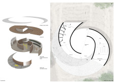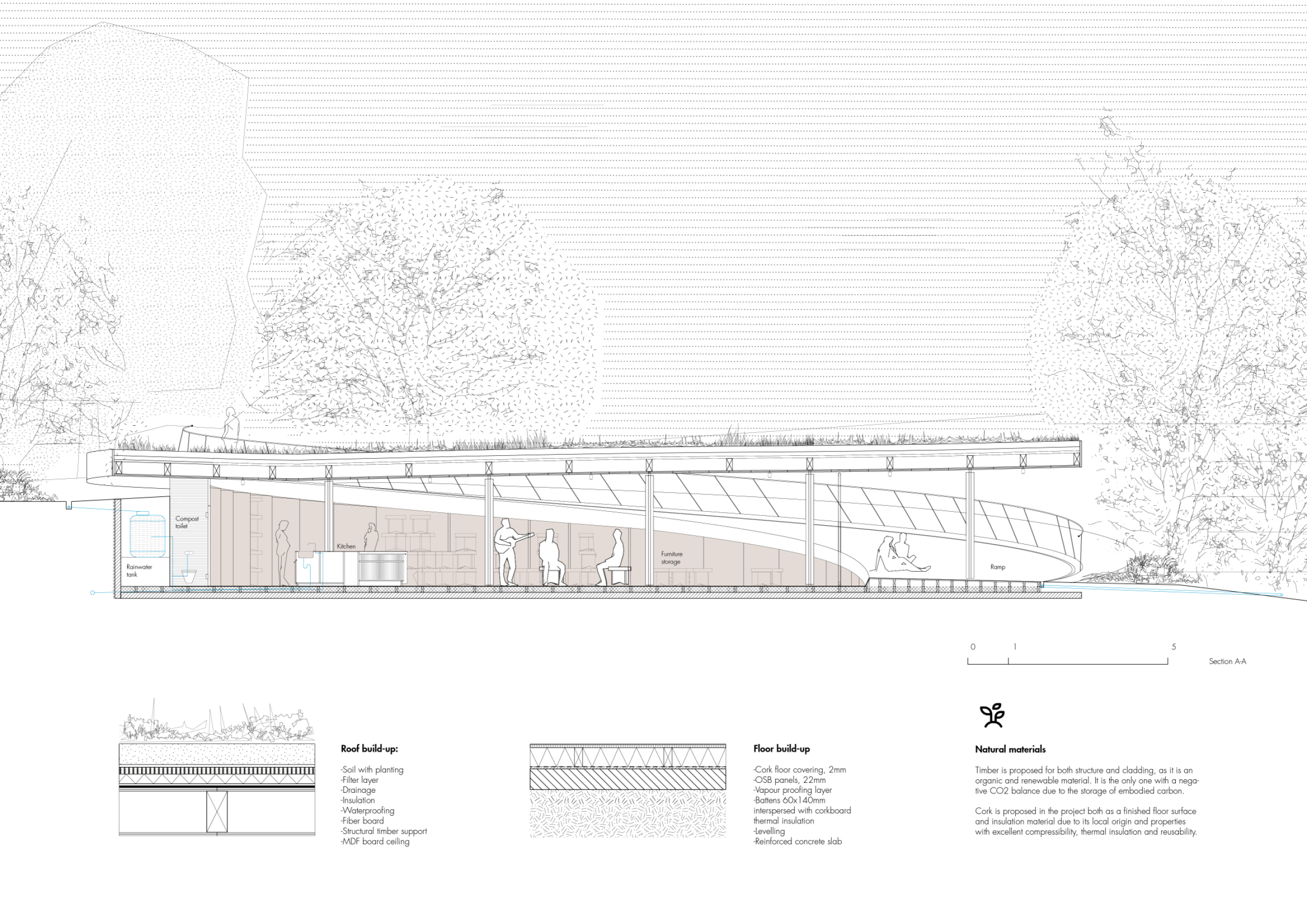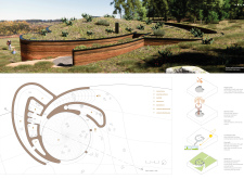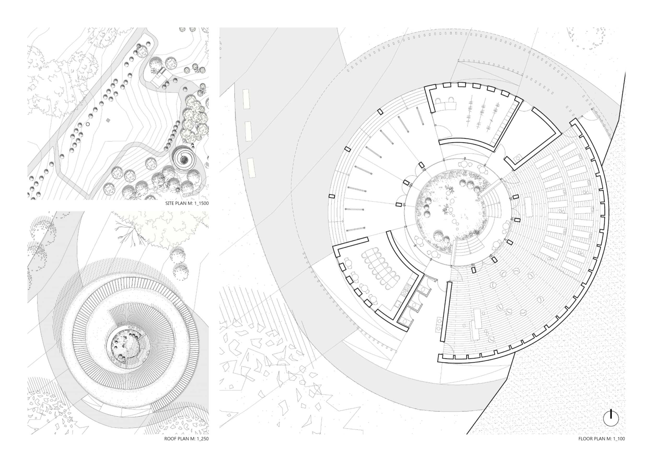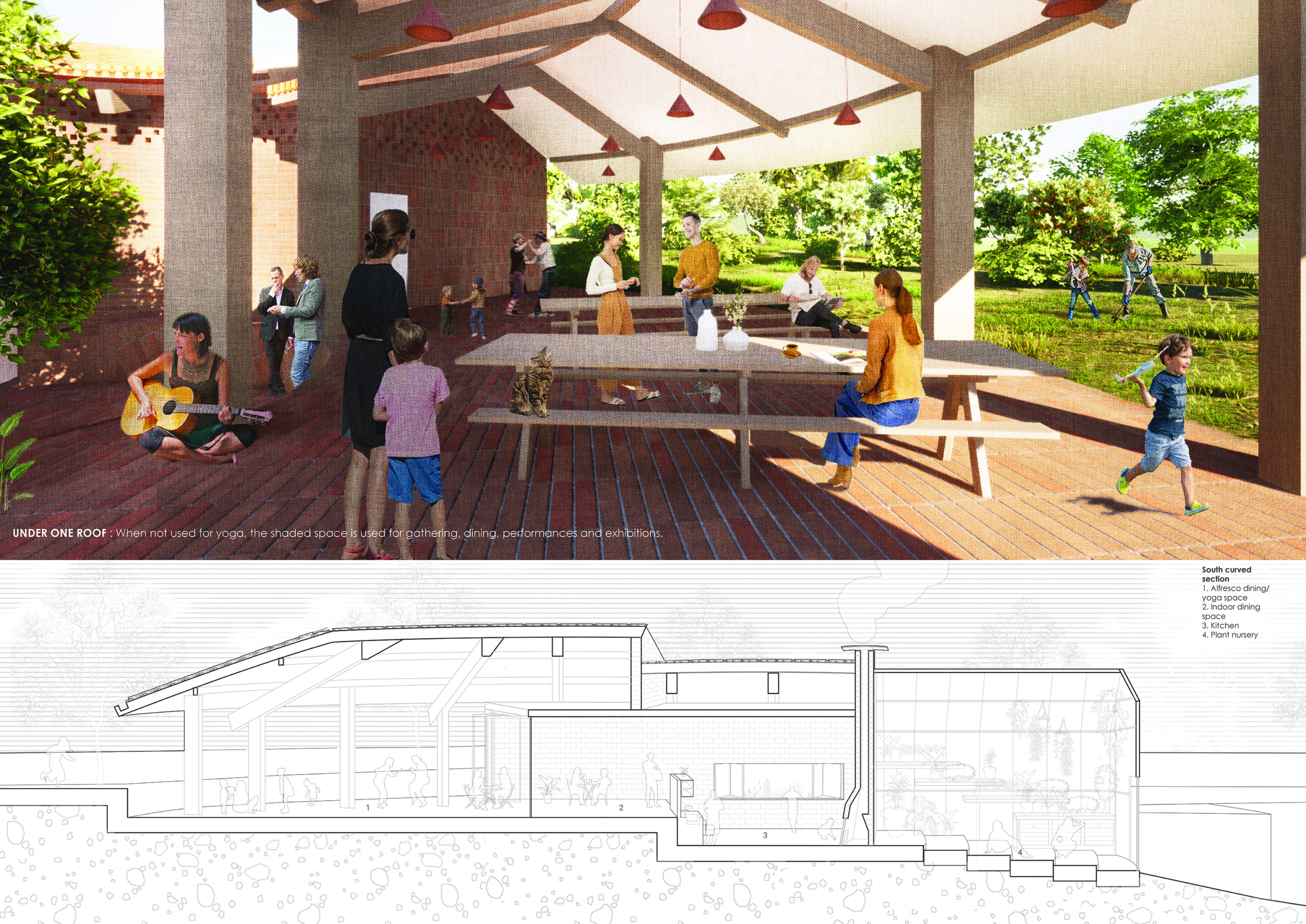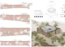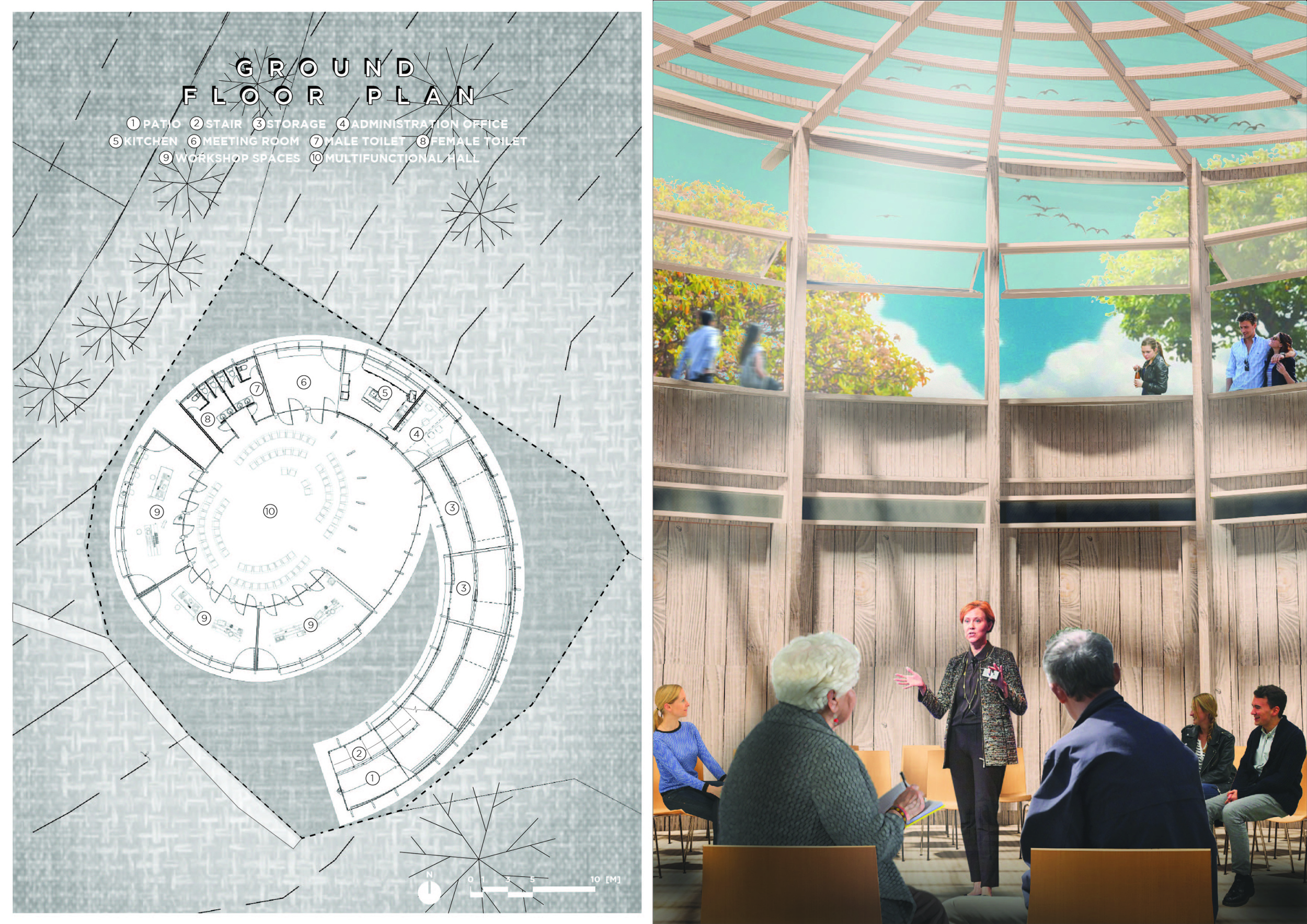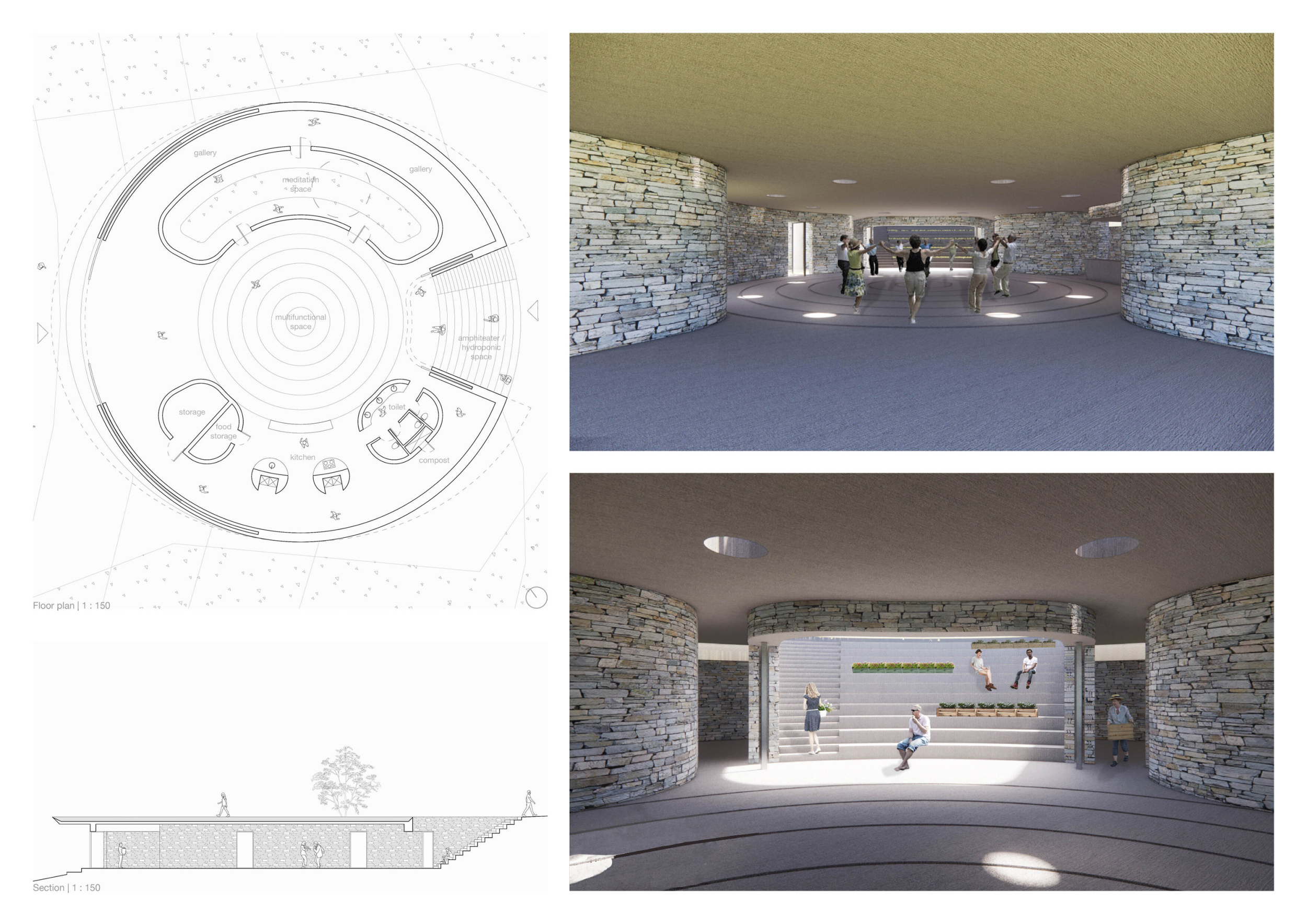 The project, titled ‘Swirl Pavilion’, proposes a circular structure made of rammed earth and timber, featuring openings on the east and west for natural ventilation, and an inclined green roof centered on a skylight. According to the jury, “There is a quiet subtlety about this design that made this proposal stand out.