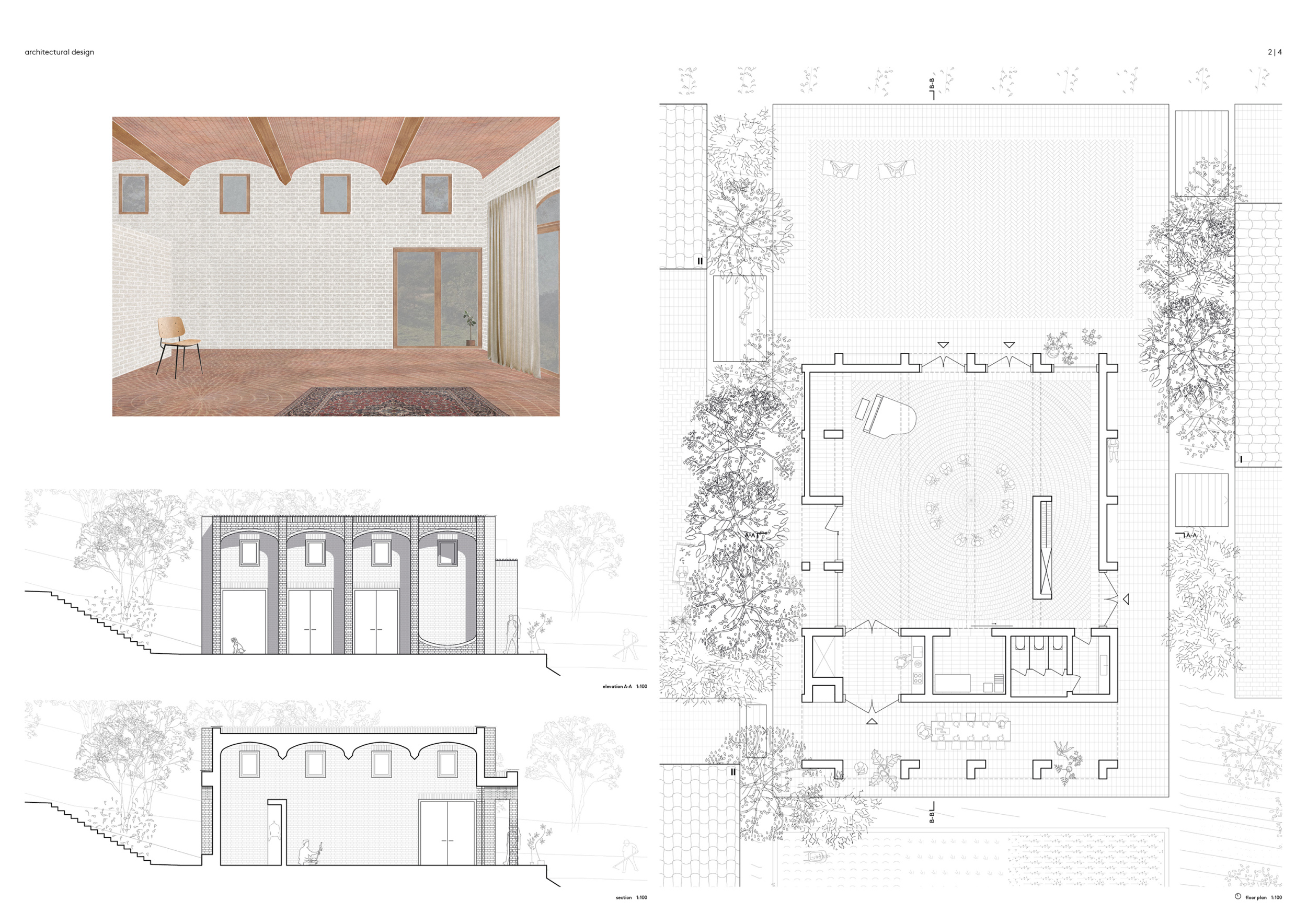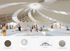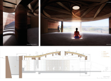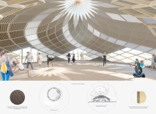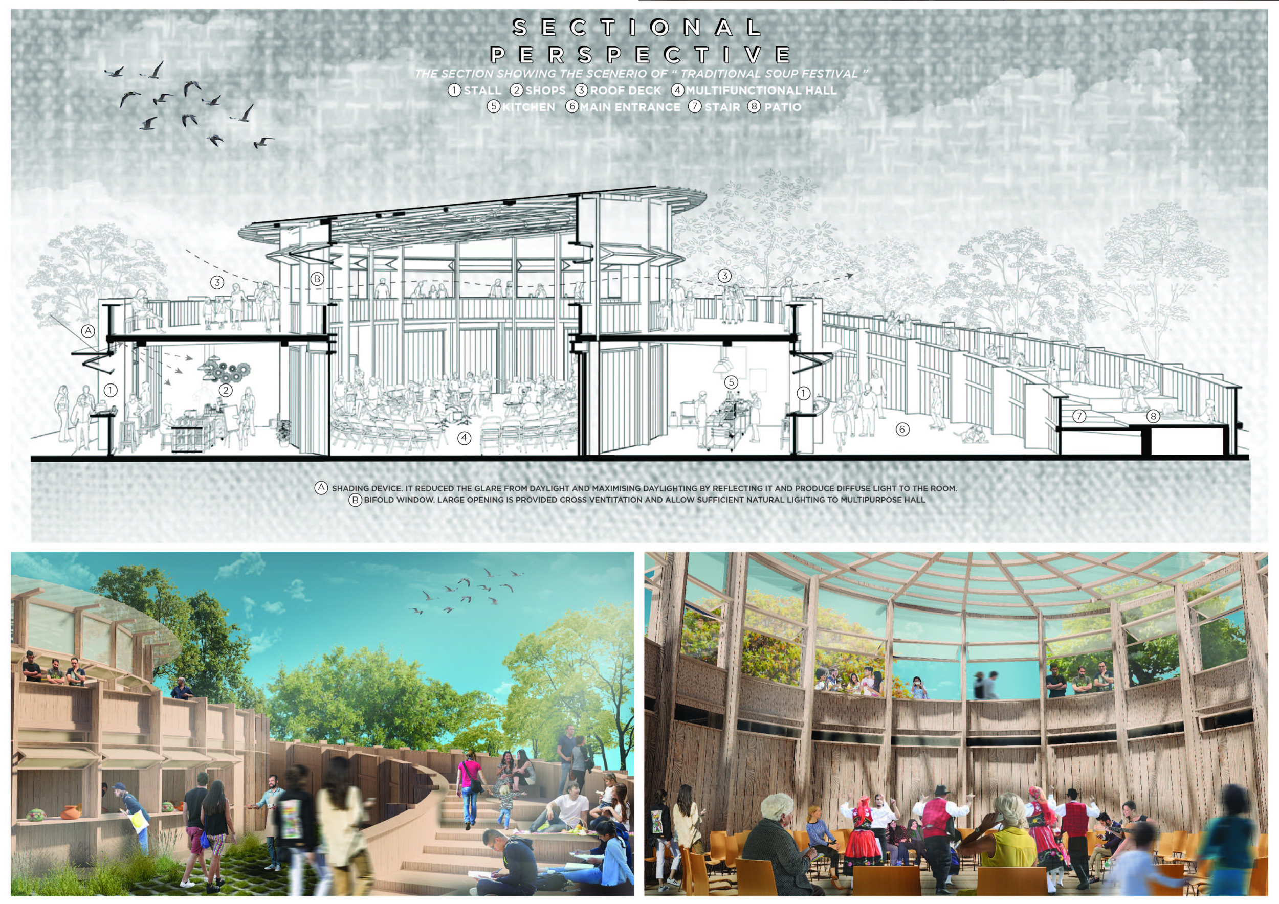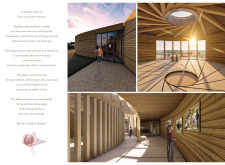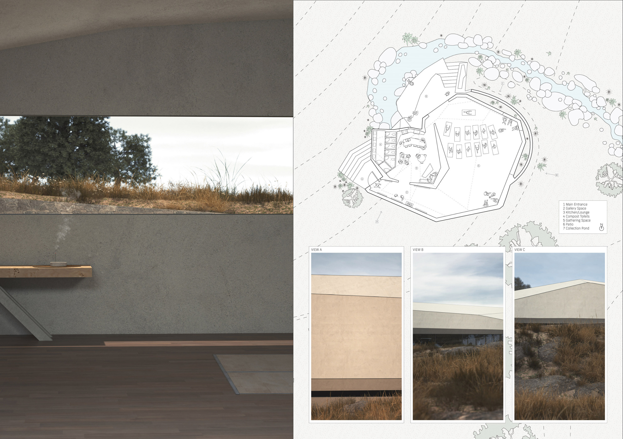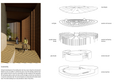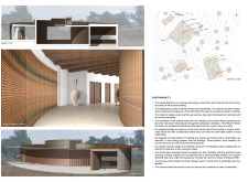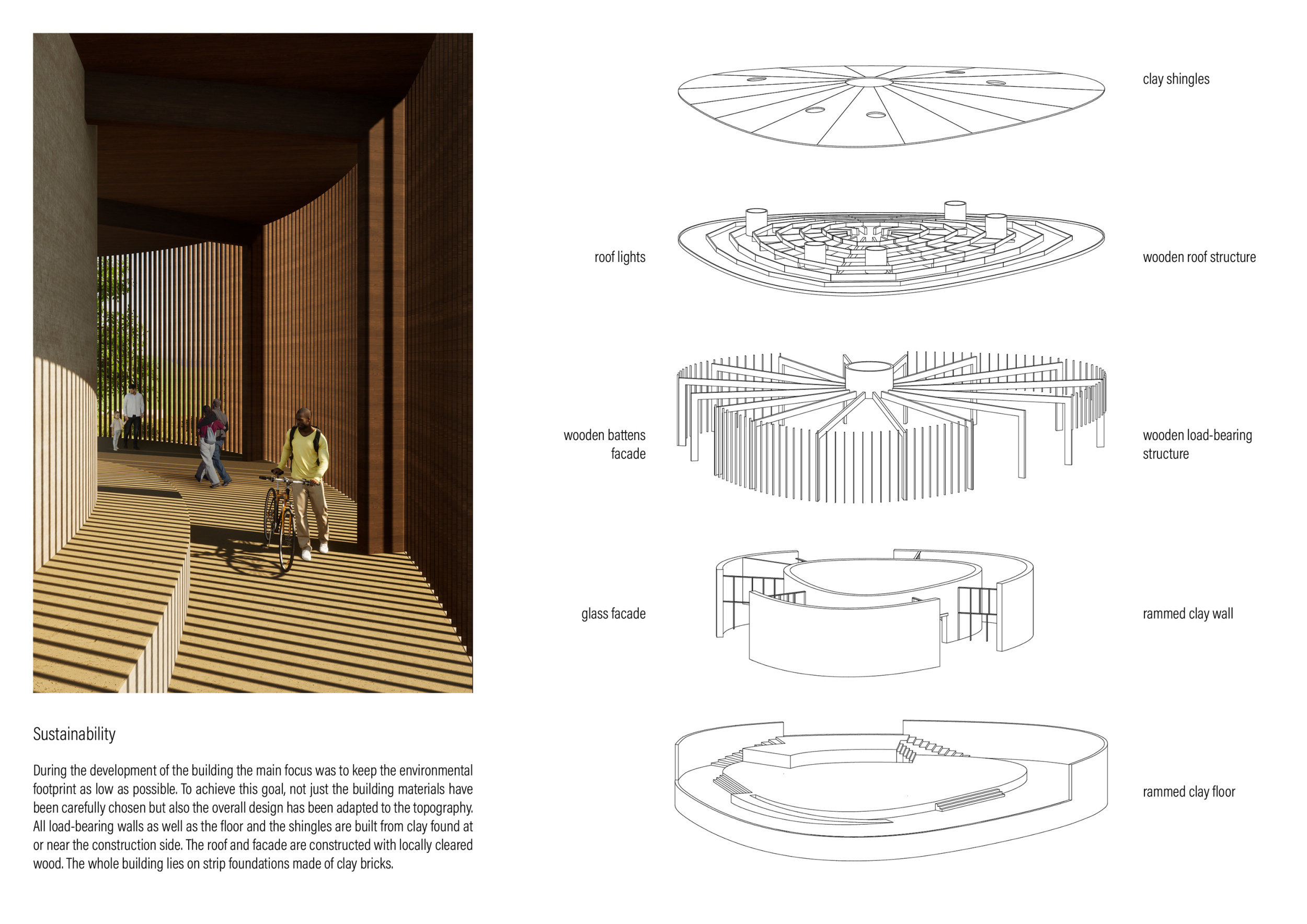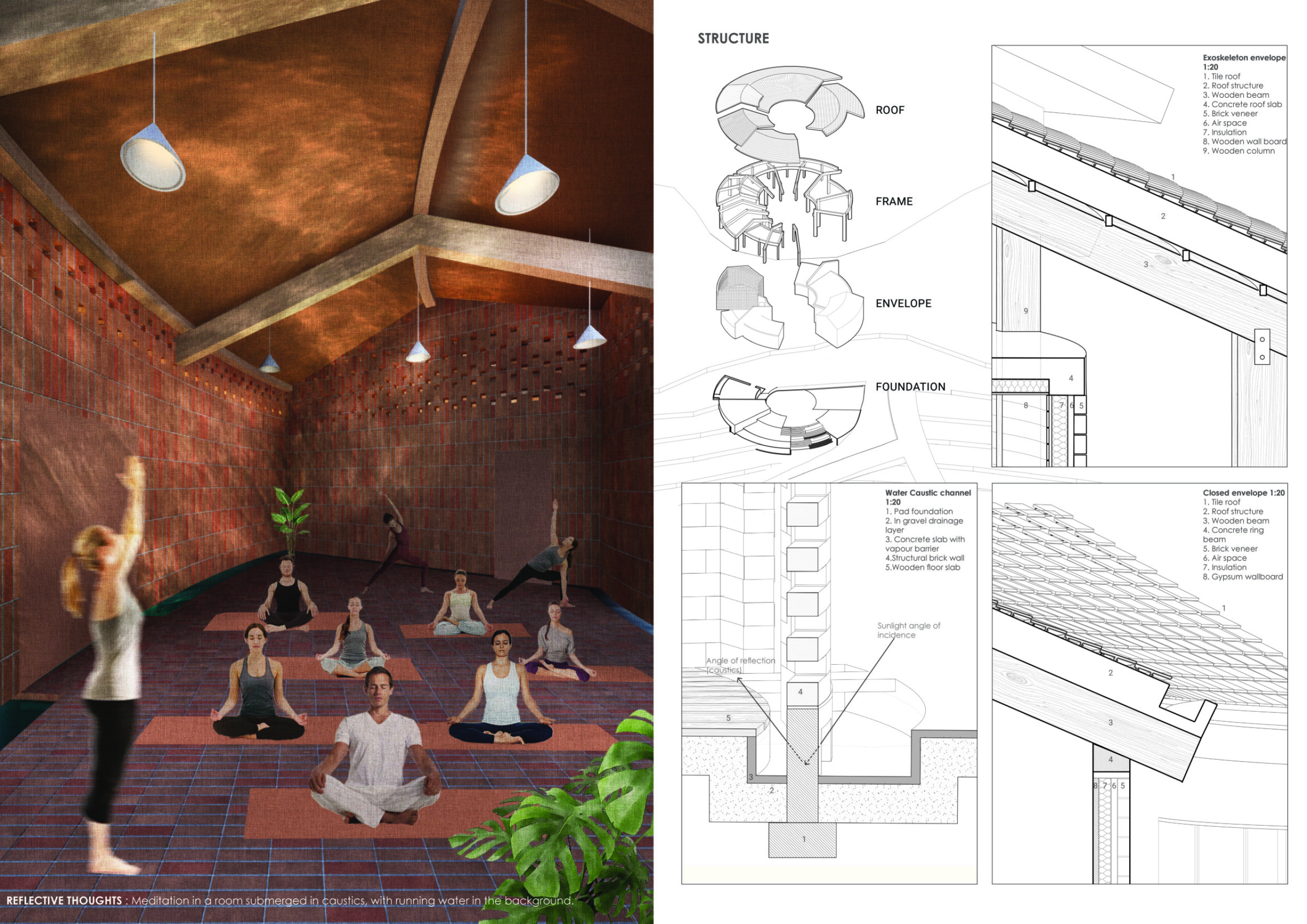 The project, titled ‘Swirl Pavilion’, proposes a circular structure made of rammed earth and timber, featuring openings on the east and west for natural ventilation, and an inclined green roof centered on a skylight. According to the jury, “There is a quiet subtlety about this design that made this proposal stand out.
