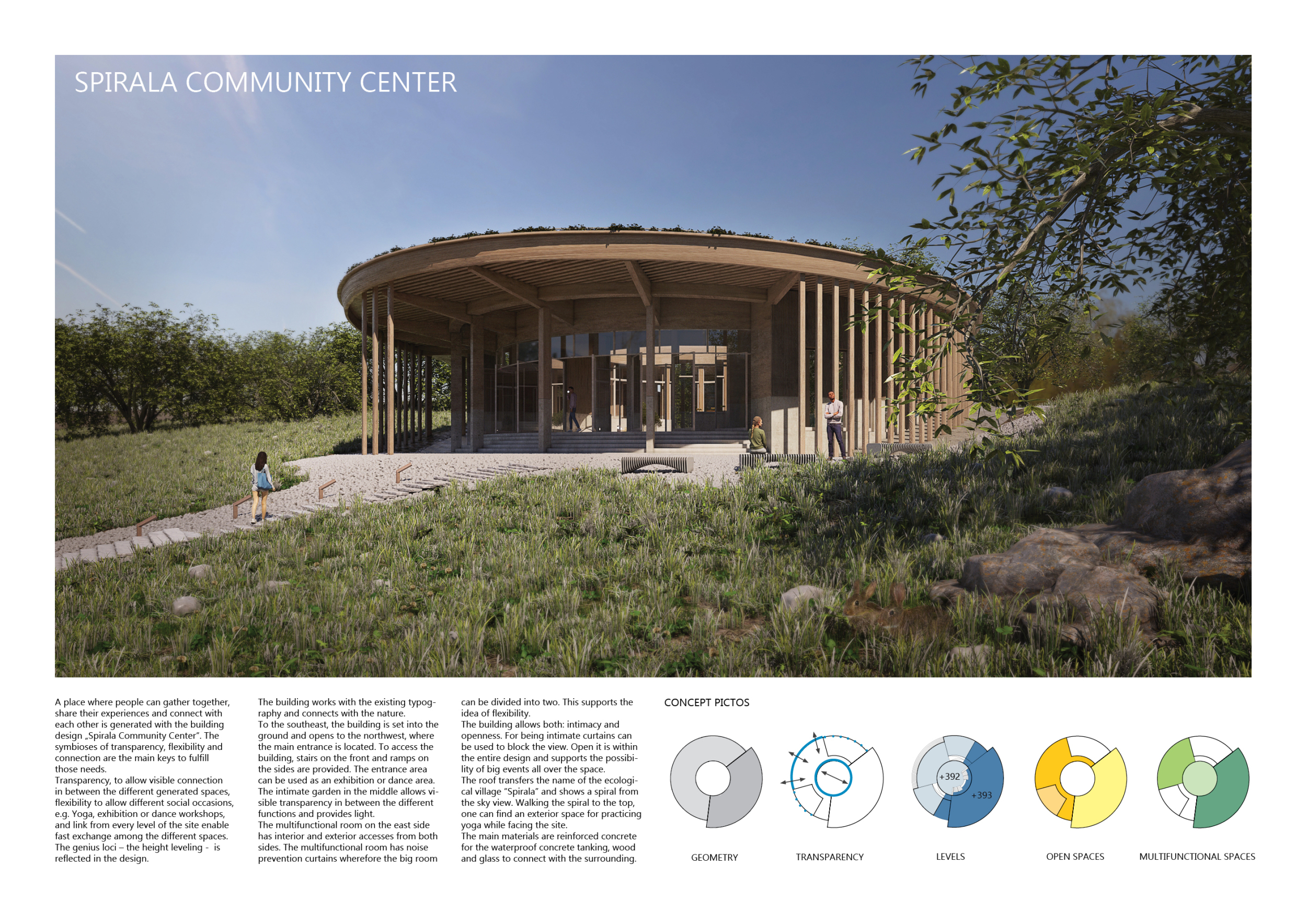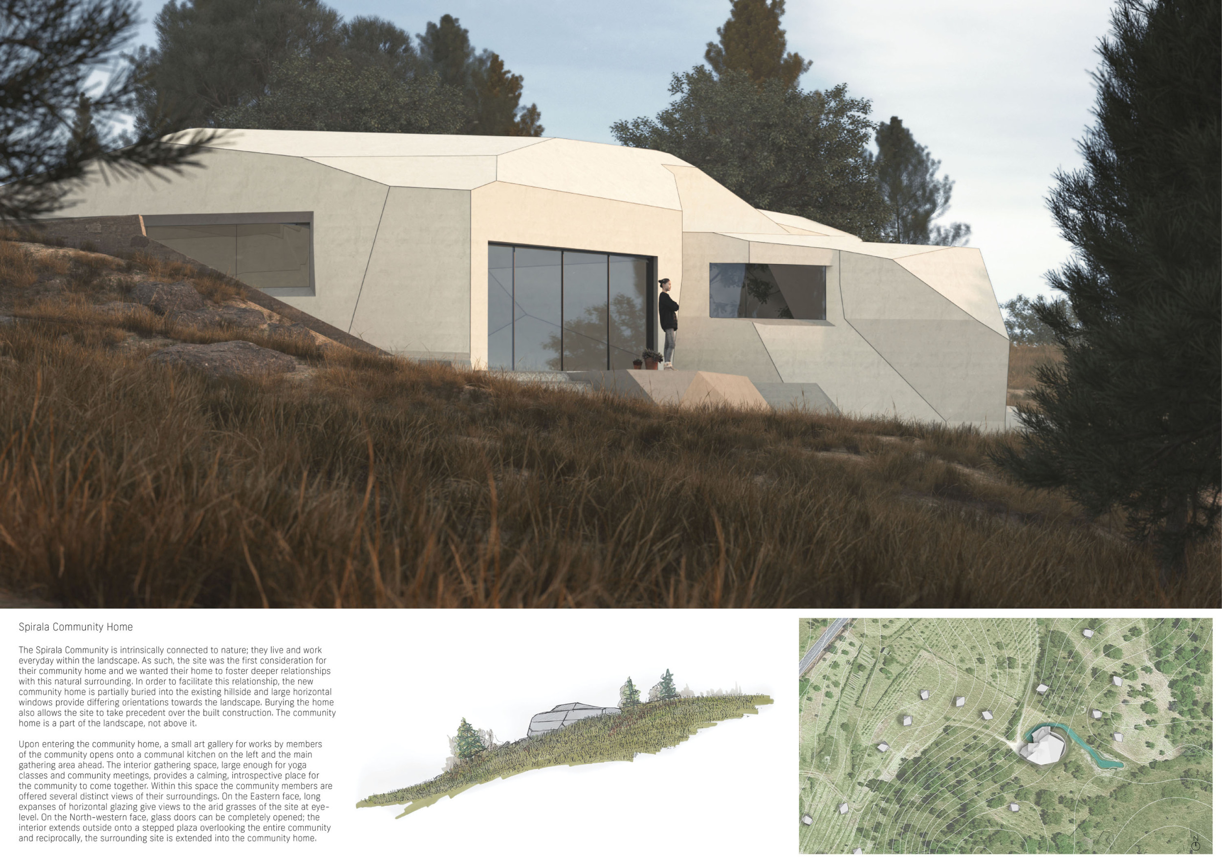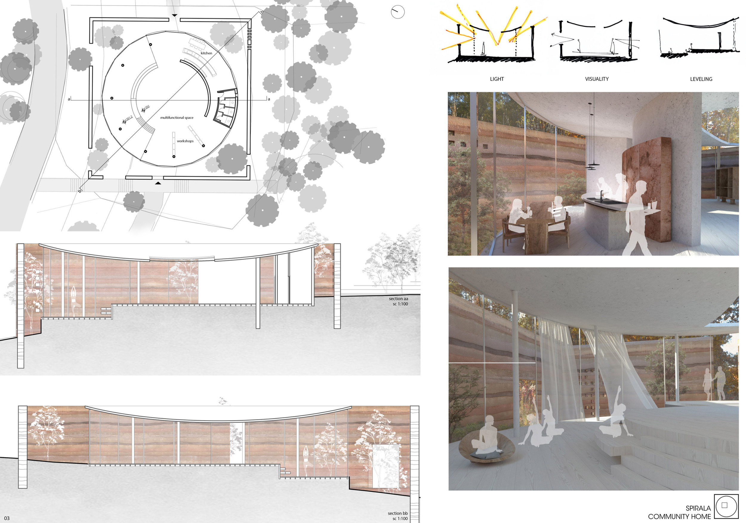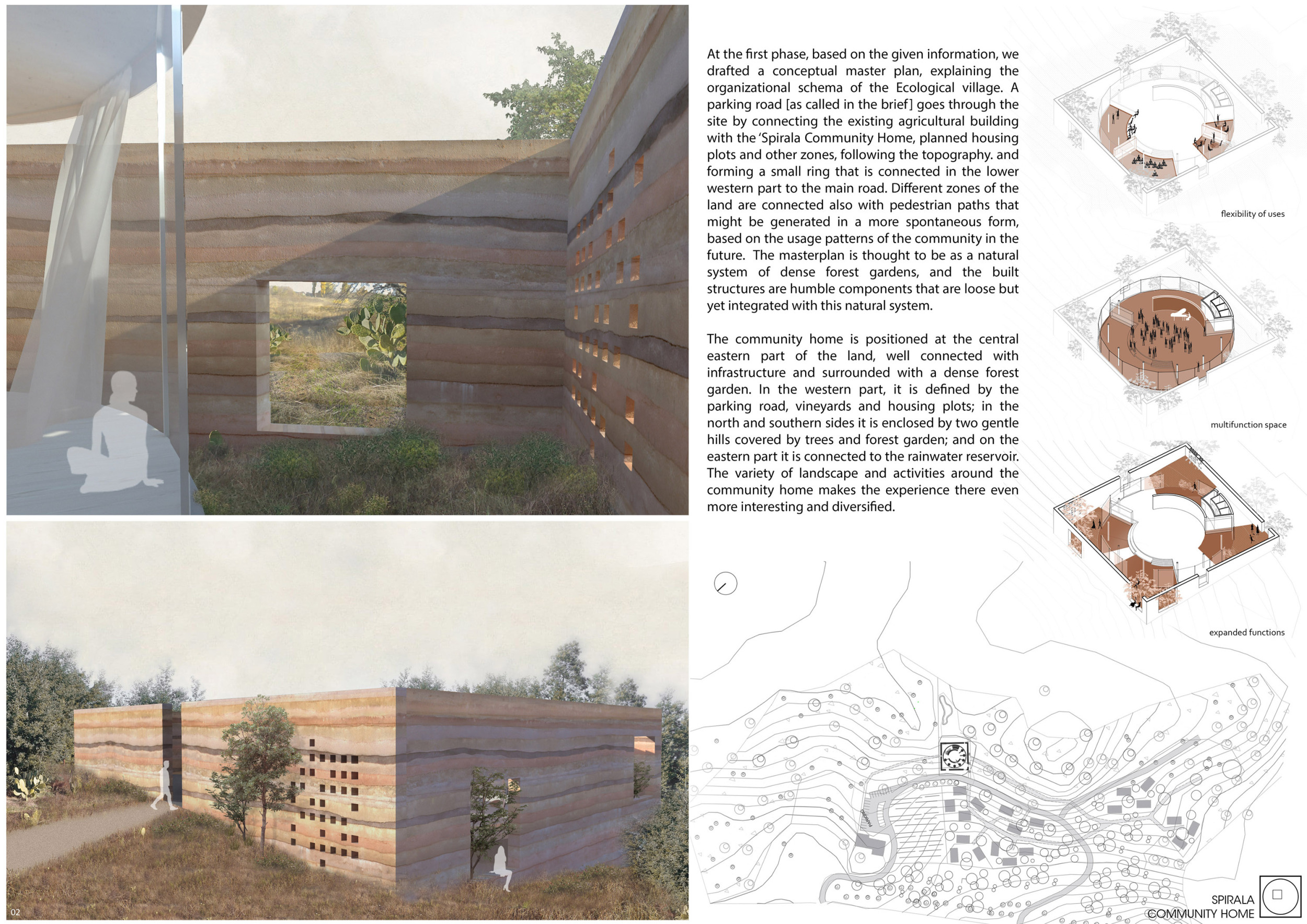 The Spirala Community Home Competition called for submissions for a shared building that will form the heart of the Spirala Ecological Village – a space where community members could gather together and meet for events, workshops, or socializing. It should have both indoor and outdoor spaces for congregating for various purposes throughout the year. As winning designs will be considered for construction, the founders of the ecological village and the jurors sought solutions that would best serve the various needs of the community, while also being examples of green building practices and sustainable design.