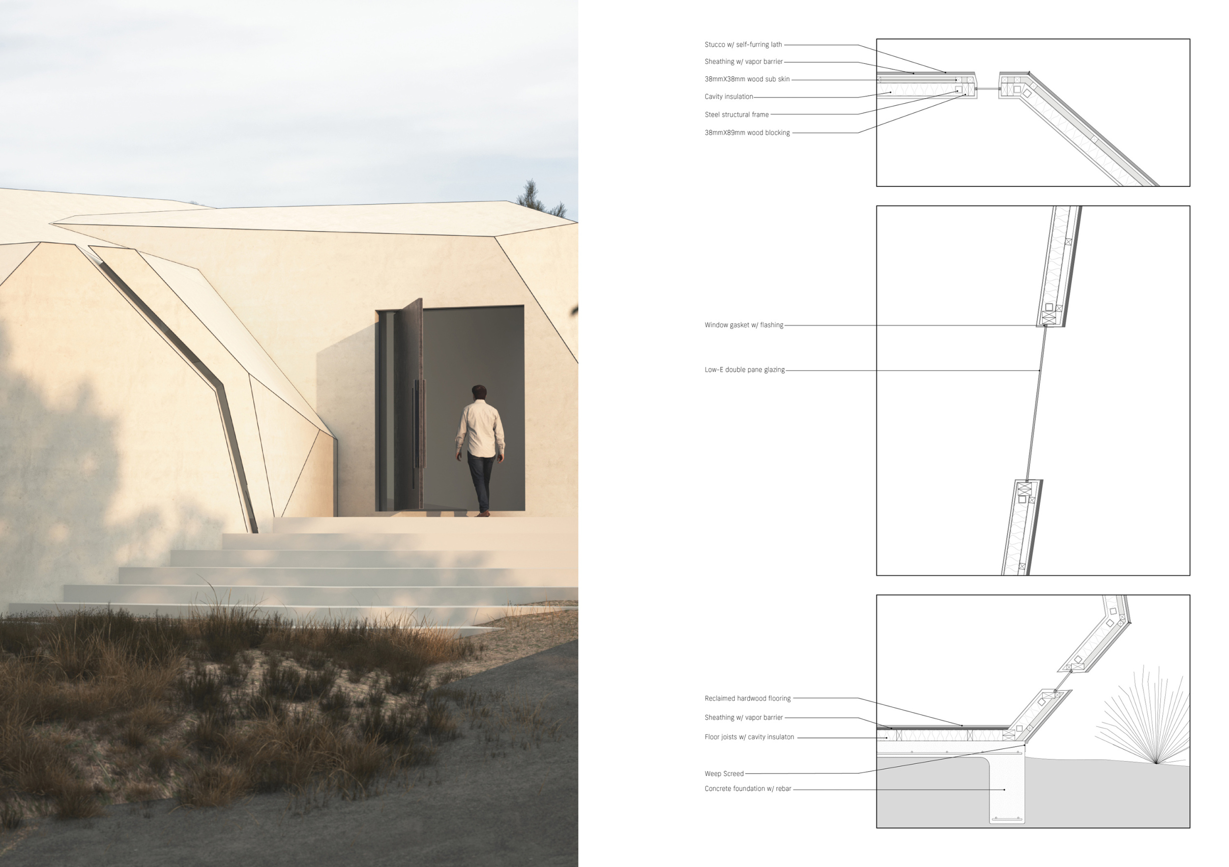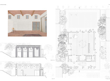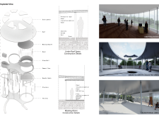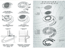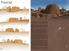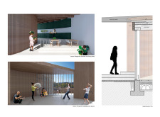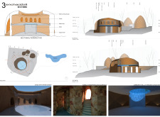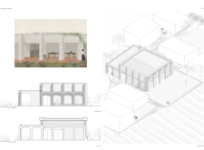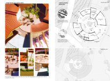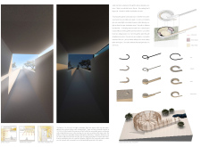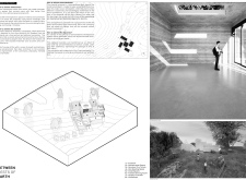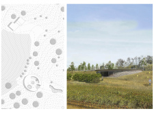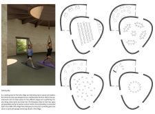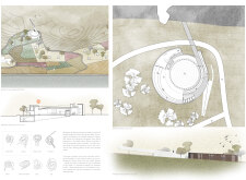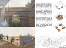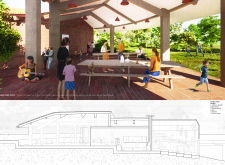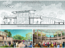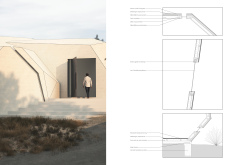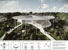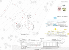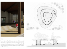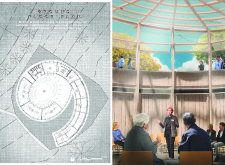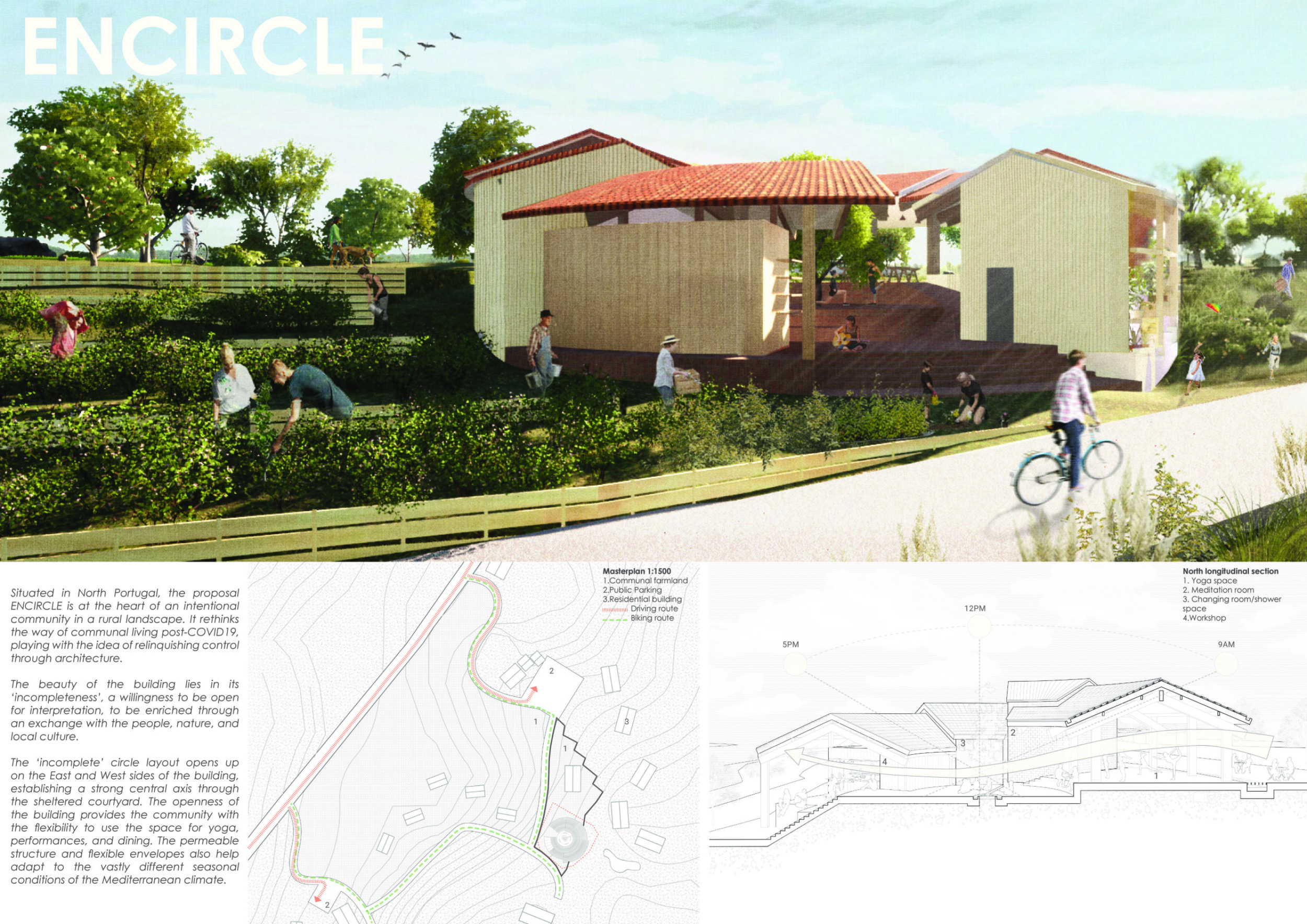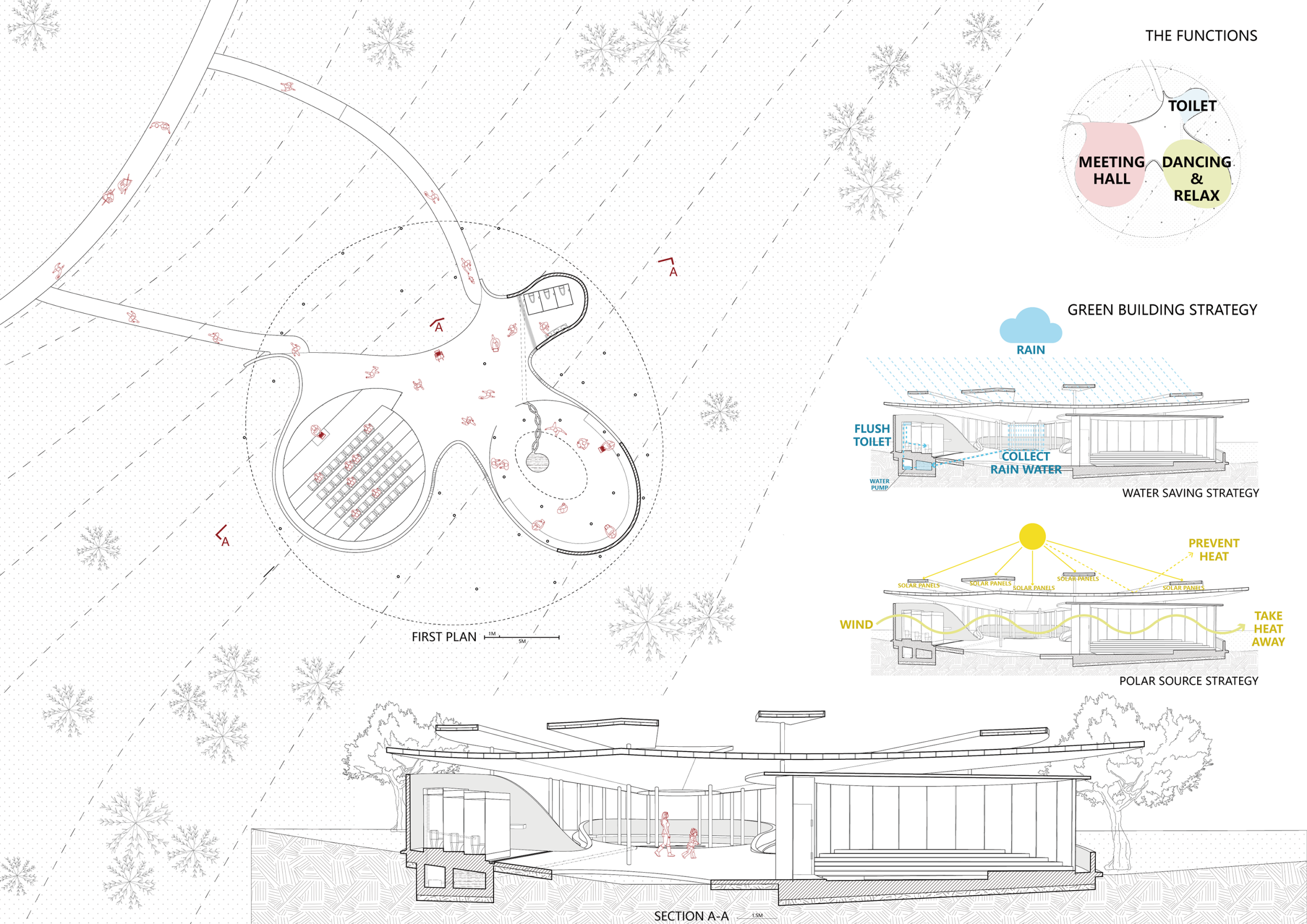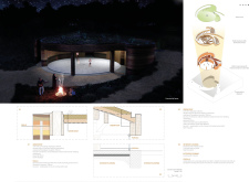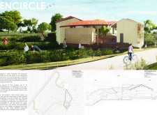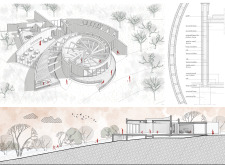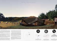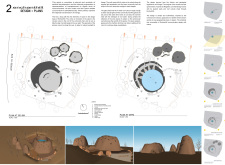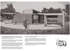 ‘Shadow Cycles’ is described as “a constellation of programs orbiting around a protective shadow in motion”. The plan is designed around a primary circle partially enclosed with a tall, pitched roof that casts shadows on exterior spaces during the hot summer months. It is a dynamic and flexible proposal with an interesting correlation between exterior spaces and interior spaces, plus seasonal cycles. The jury writes, “This project had a reality and humbleness about it.