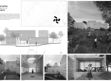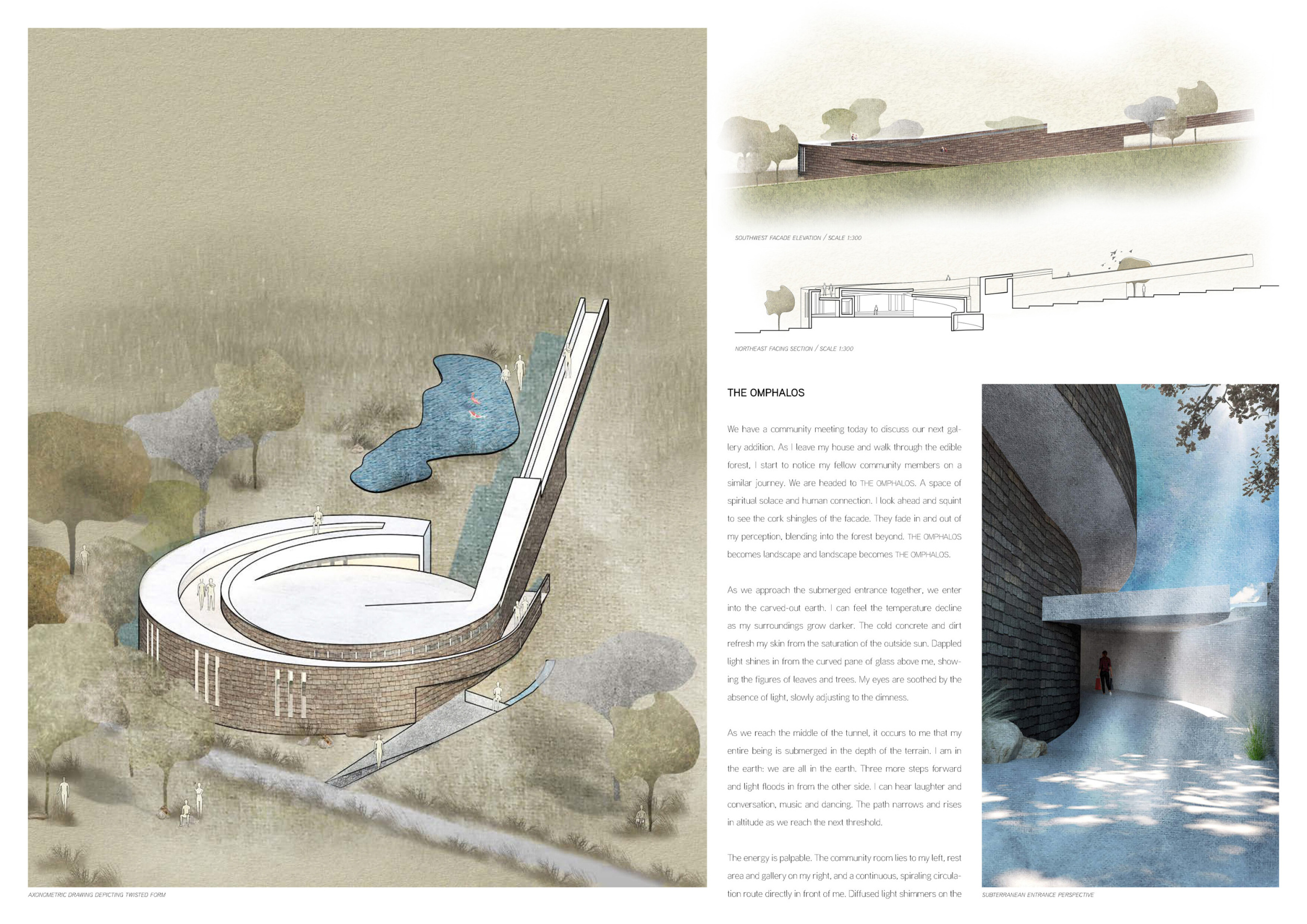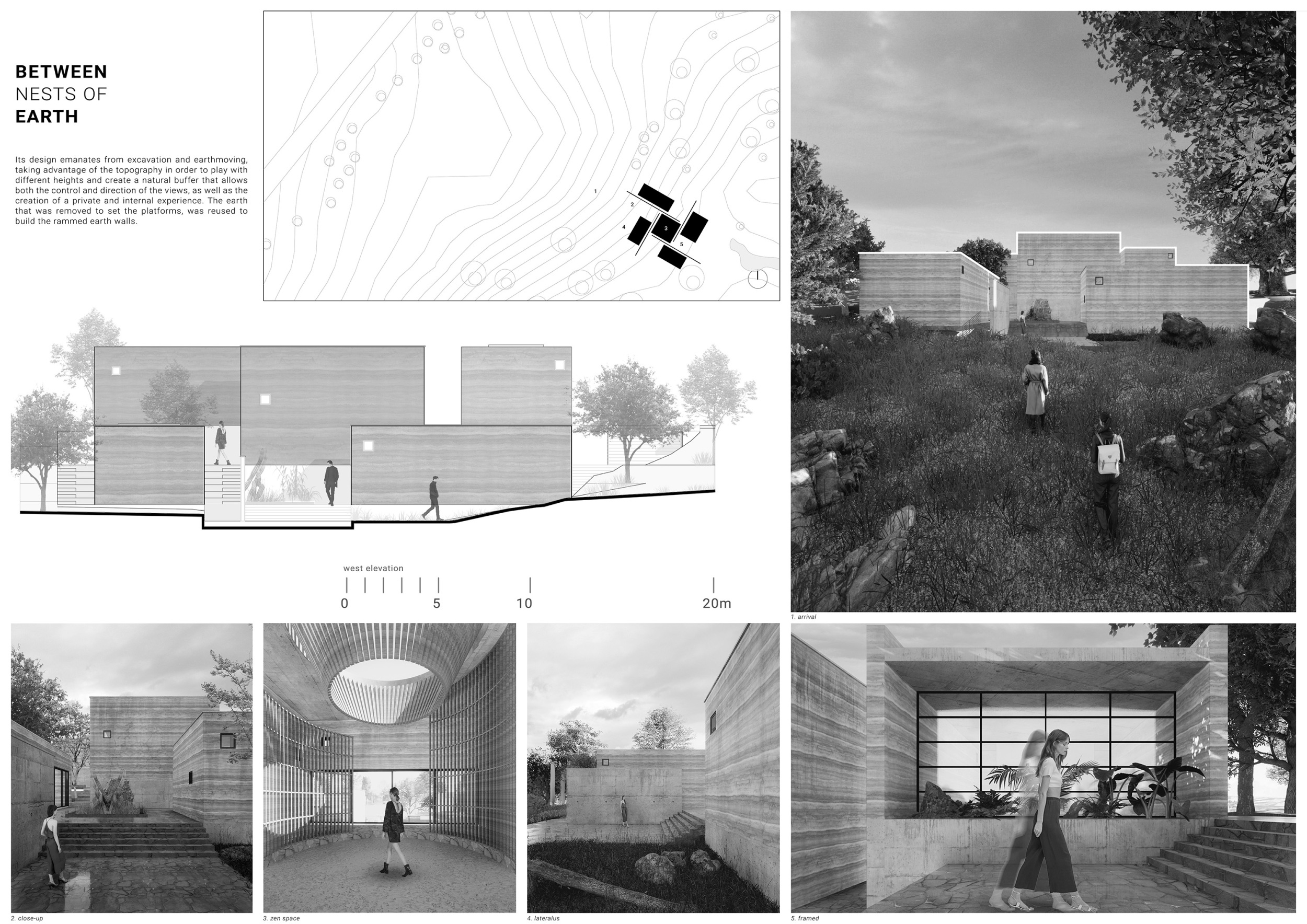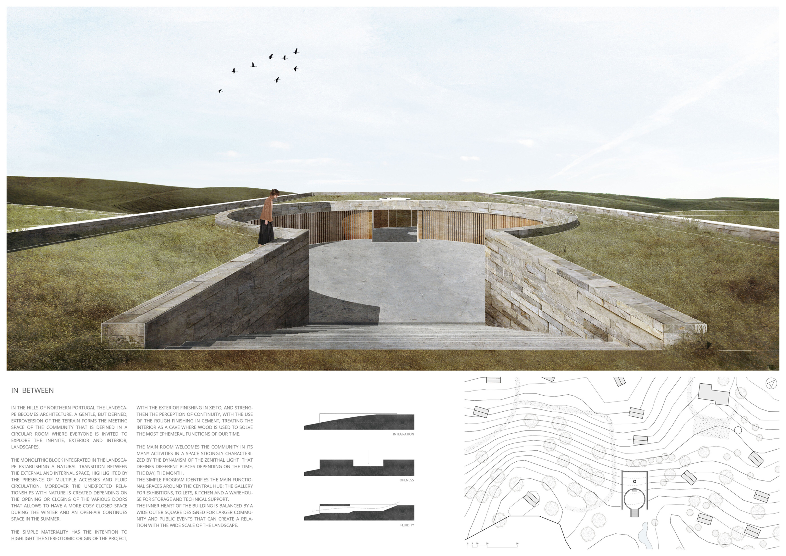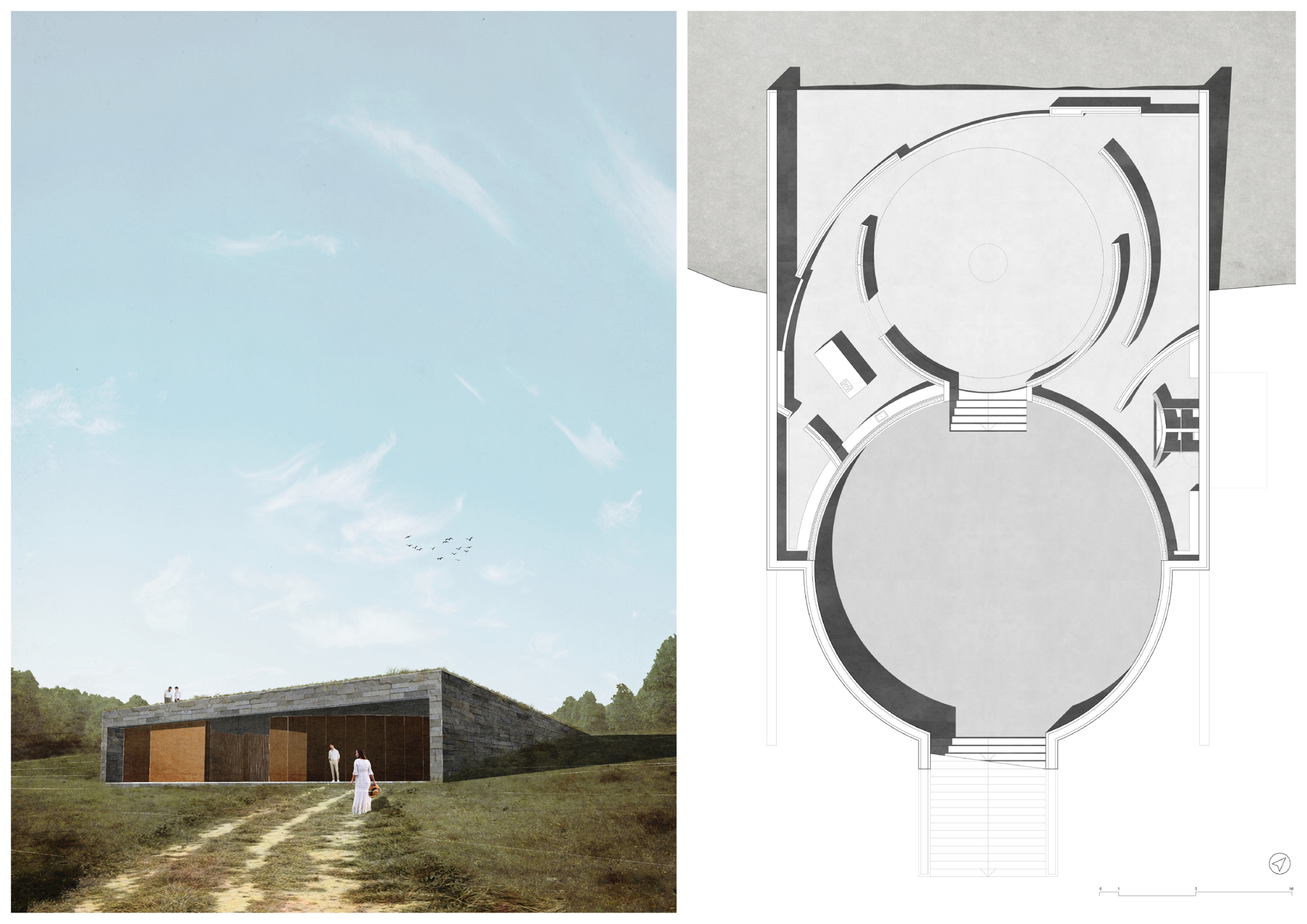 ‘In Between’ is a sunken rectangular form, made of concrete with two large circular spaces, one exterior and one interior, and topped with a roof garden. The jury commented, “An evocative form and use of the site slope. A poetic use of exterior and interior space, beautifully drawn and rendered.