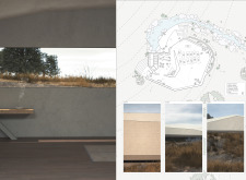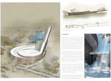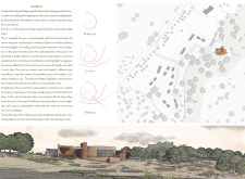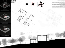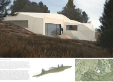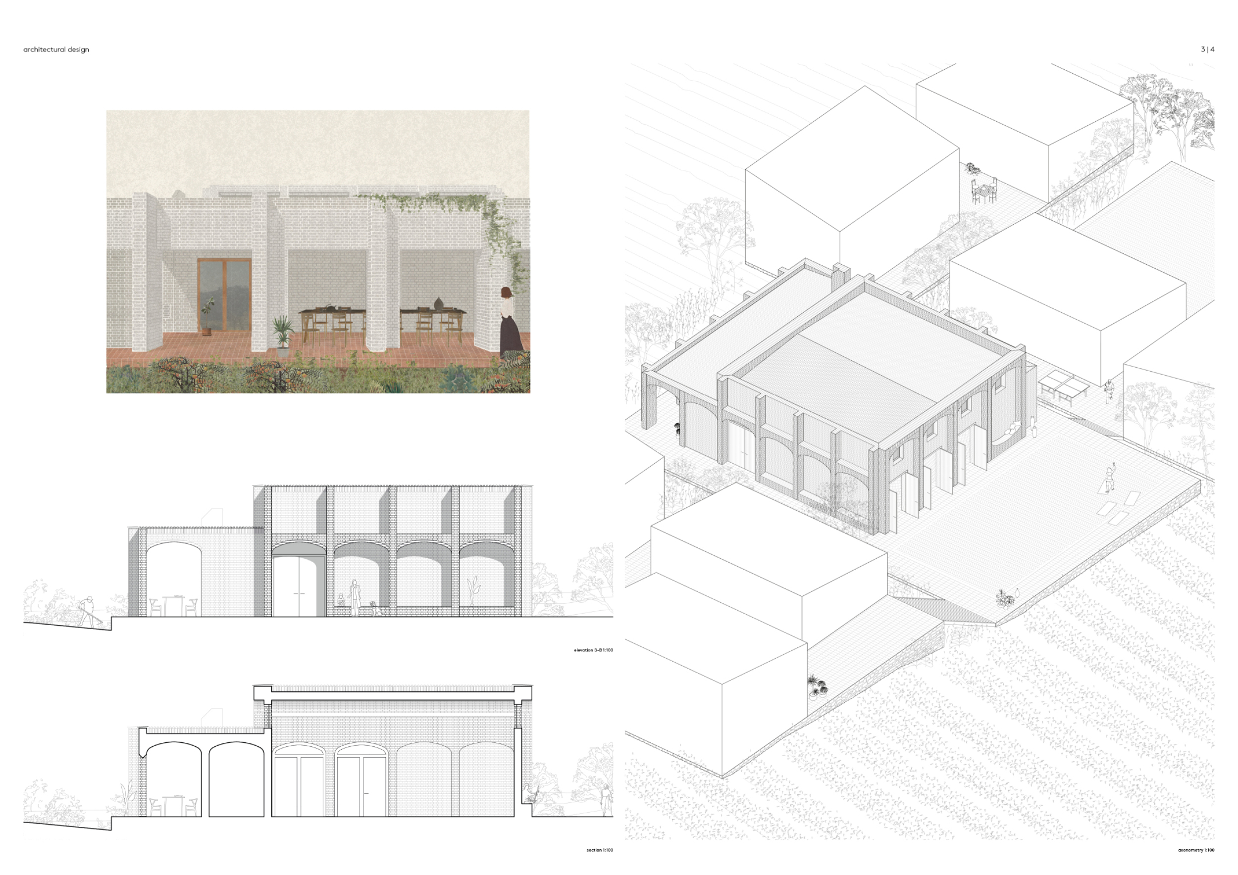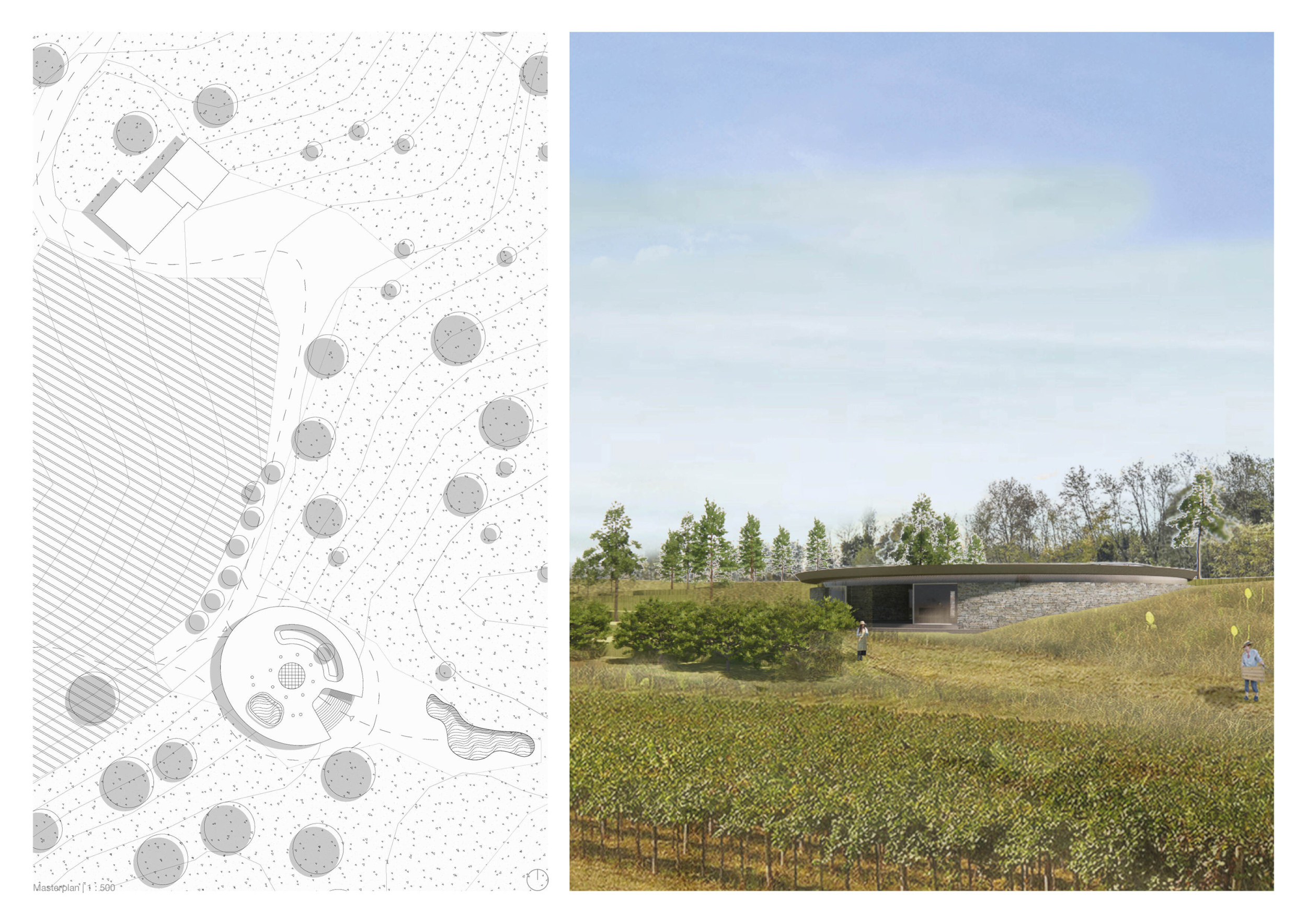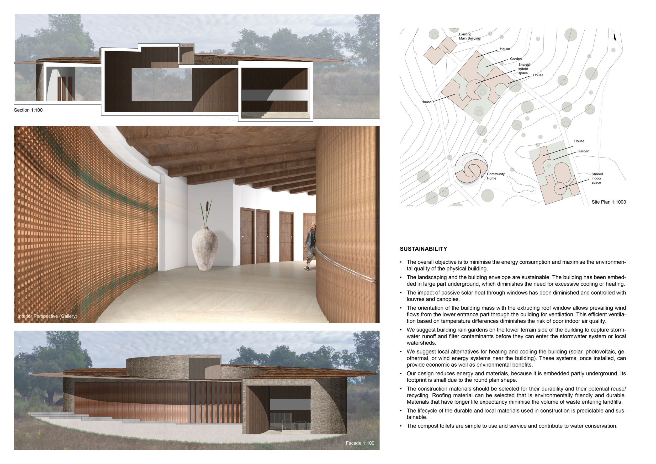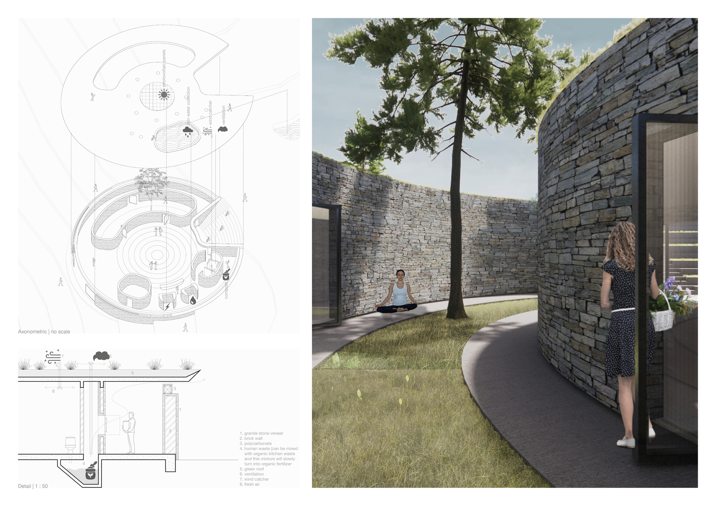 ‘In Between’ is a sunken rectangular form, made of concrete with two large circular spaces, one exterior and one interior, and topped with a roof garden. The jury commented, “An evocative form and use of the site slope. A poetic use of exterior and interior space, beautifully drawn and rendered.