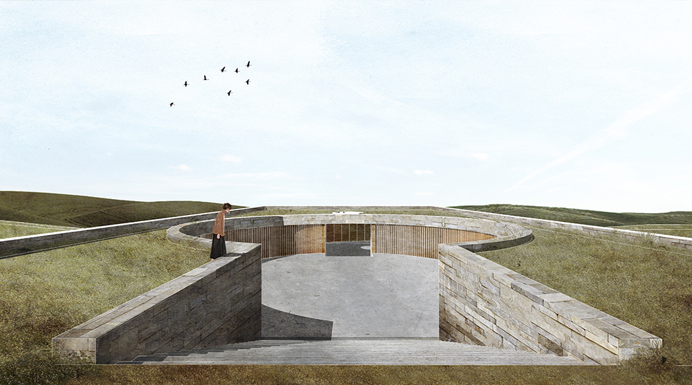 Second prize winners Manuel Collado Arpia, Dustin Hernandez Jover and Berta Calle Martos from Spain created “a constellation of programs orbiting around a protective shadow in motion” for their ‘Shadow Cycles’ project, showing a “a reality and humbleness” that the jury enjoyed. Leonardo Raviola, Joao Carriço and Ruben Guerreiro from Portugal were awarded third prize for their ‘In Between’ project. This involved a sunken rectangular form, made of concrete with two large circular spaces, in a “poetic use of exterior and interior space, beautifully drawn and rendered,” according to the jury.