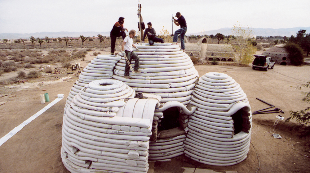 Nader Khalili invented the SuperAdobe construction method - also called the super block system - which uses layers of sand-filled bags coiled up and placed one upon the other and secured into a dome-shaped structure by barbed wire. The adobe structure is simple in appearance, but strong enough to resist floods, fires, earthquakes and hurricanes. It provides insulation against both cold and heat, and is quickly and can be easily constructed by men, women, or even young adults.