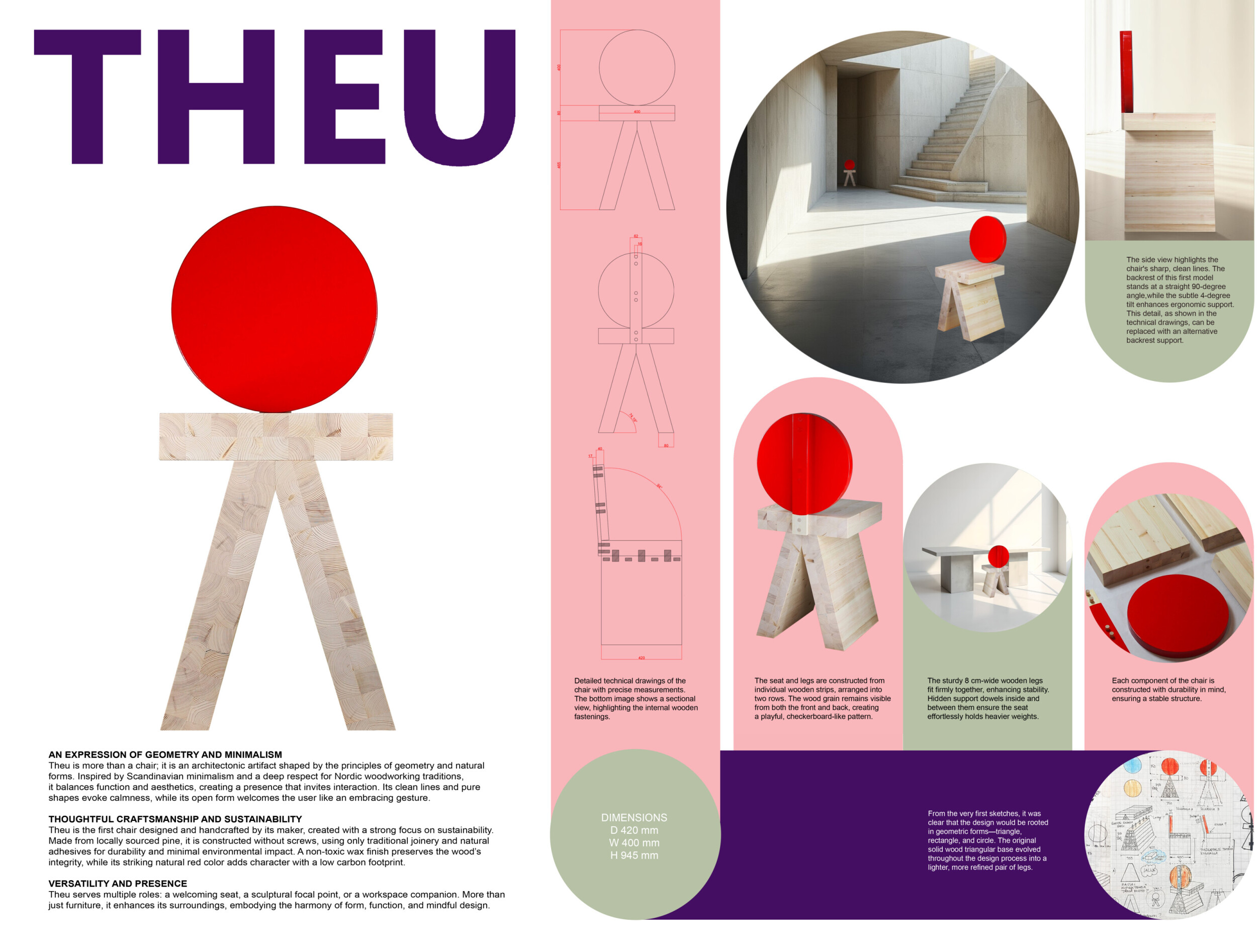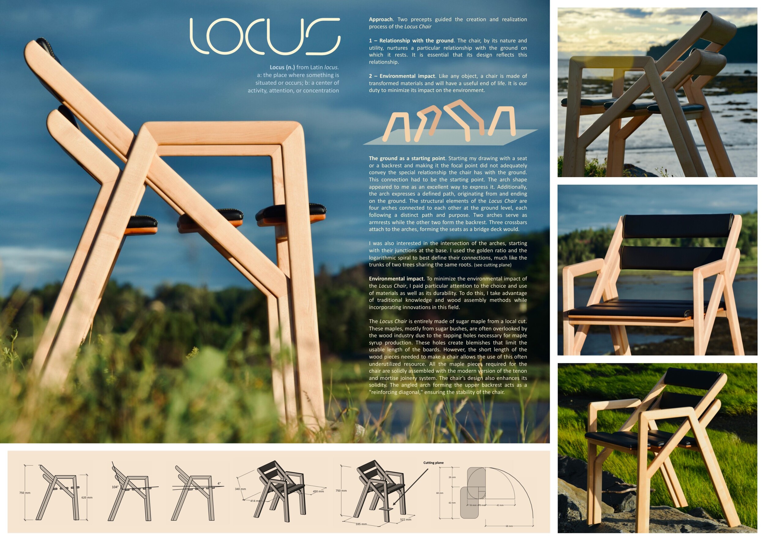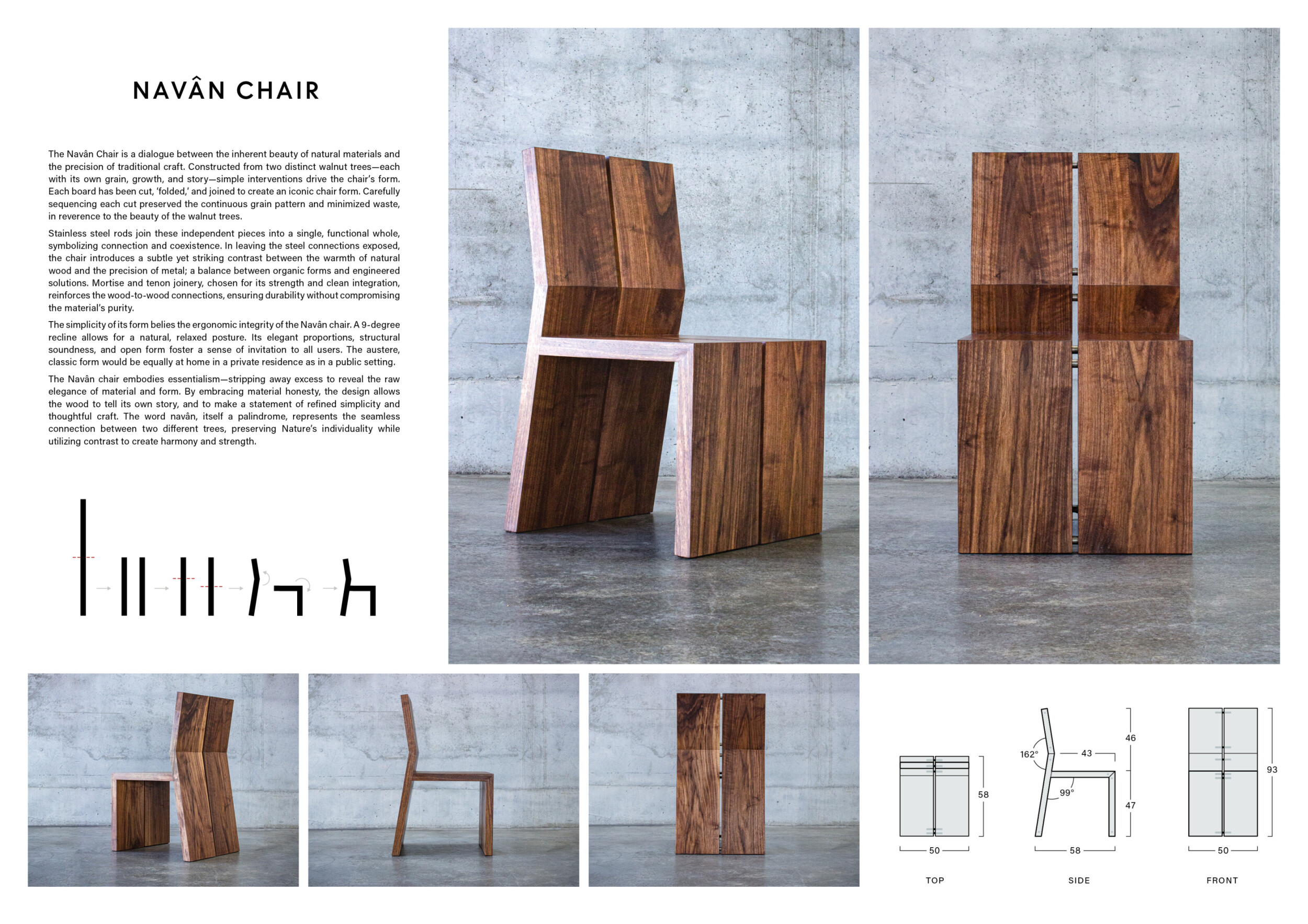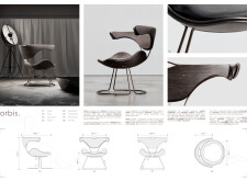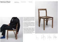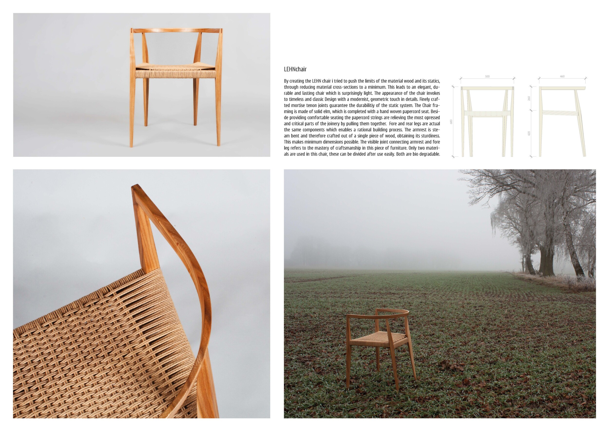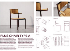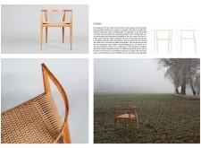 The three primary images at the top of the page provide a comprehensive view of the chair from multiple angles, ensuring that a viewer fully understands its structure, materials, and craftsmanship. The contrast between the chair and its industrial background creates strong visual interest without overwhelming the clarity of the design. Read more However, it raises a question—does this setting truly reflect the intended environment for the chair? The inclusion of production photos is a standout element, immediately communicating the level of craftsmanship and reinforcing that this is a realized, tested project, likely developed by a team. This tangible proof of execution adds credibility and impact. The text is well-structured, using clear titles and short, well-organized paragraphs with subtitles that highlight key points. One area for improvement is annotation. Adding callouts directly on the images—highlighting joint construction, materials, and dimensions—would provide additional clarity and make the presentation even stronger.
