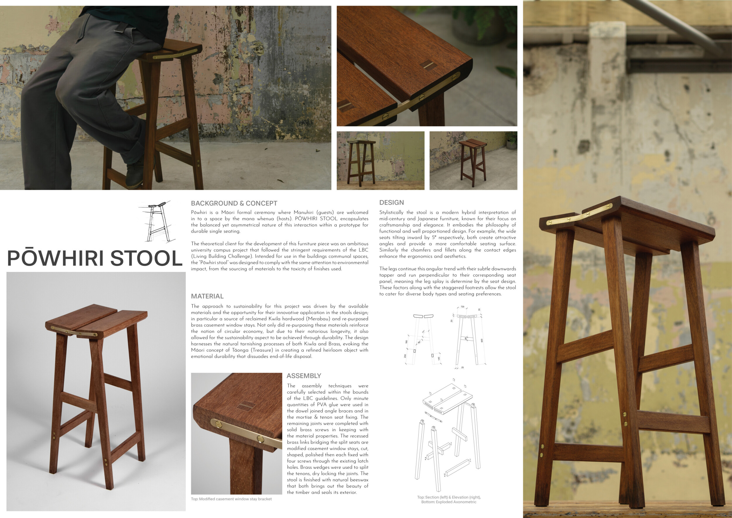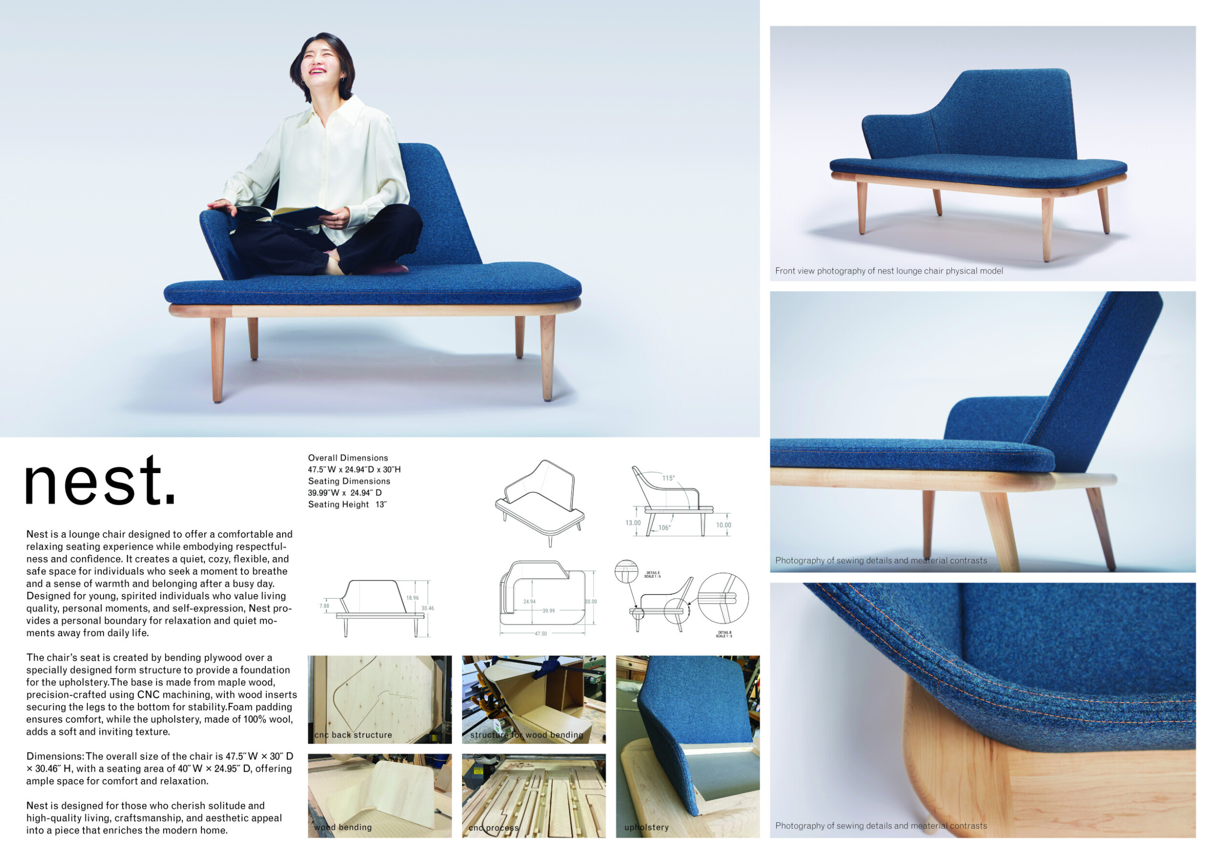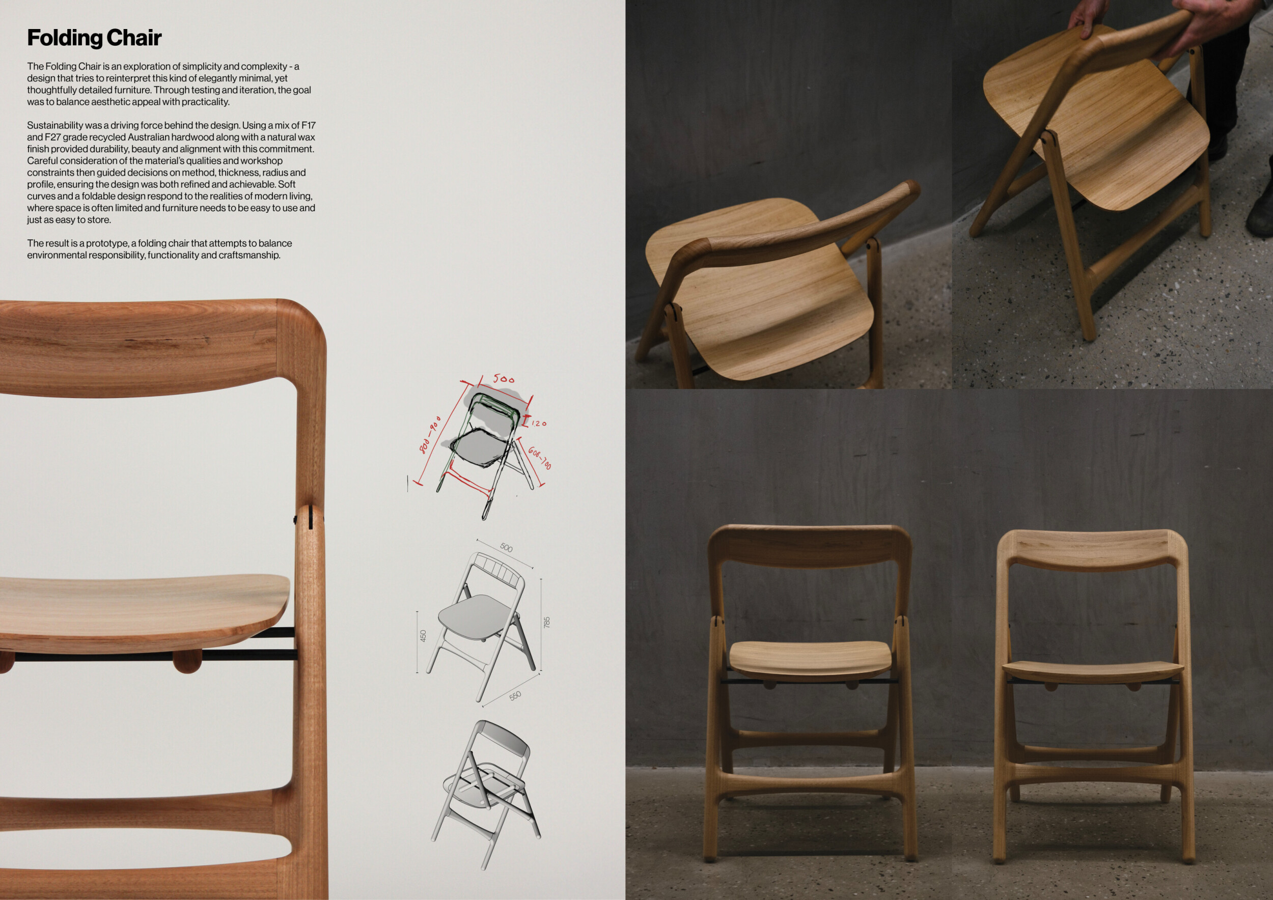 The three primary images at the top of the page provide a comprehensive view of the chair from multiple angles, ensuring that a viewer fully understands its structure, materials, and craftsmanship. The contrast between the chair and its industrial background creates strong visual interest without overwhelming the clarity of the design. Read more However, it raises a question—does this setting truly reflect the intended environment for the chair? The inclusion of production photos is a standout element, immediately communicating the level of craftsmanship and reinforcing that this is a realized, tested project, likely developed by a team. This tangible proof of execution adds credibility and impact. The text is well-structured, using clear titles and short, well-organized paragraphs with subtitles that highlight key points. One area for improvement is annotation. Adding callouts directly on the images—highlighting joint construction, materials, and dimensions—would provide additional clarity and make the presentation even stronger.