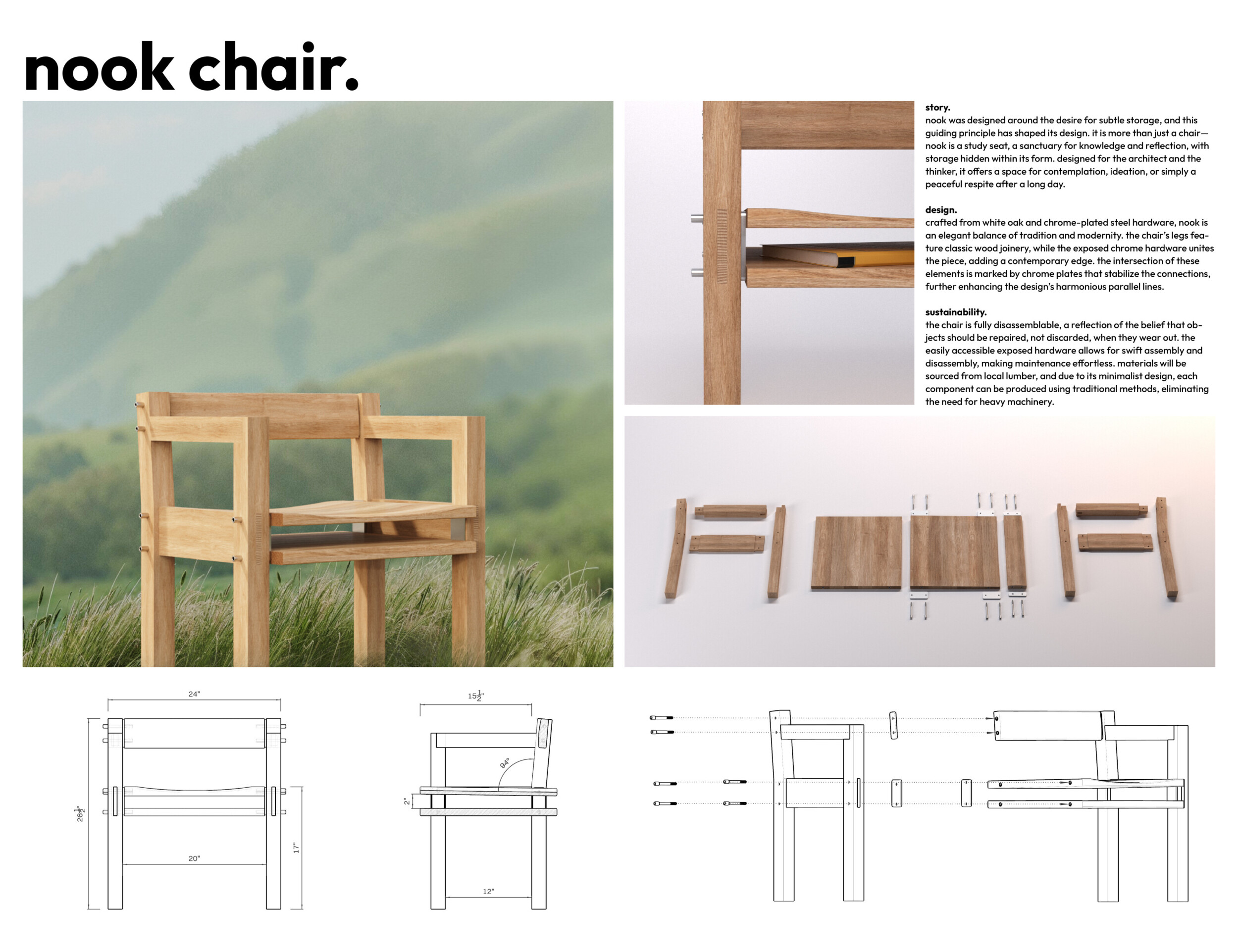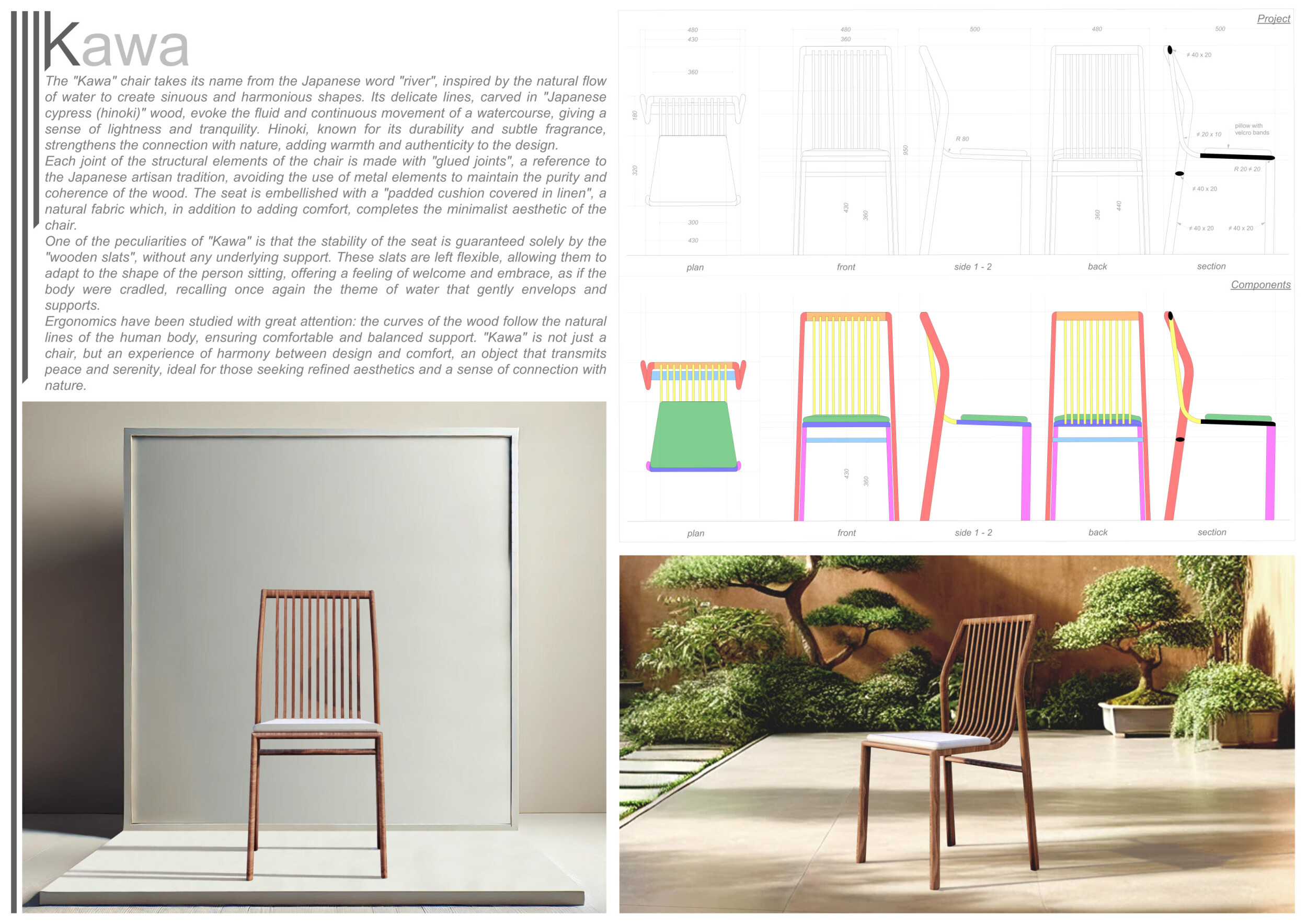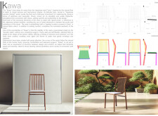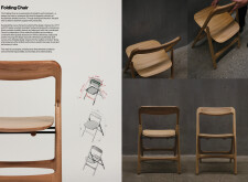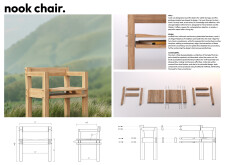 The presentation is clean and effective, using three equally sized renderings or photos that immediately draw the reviewer’s eye. A slight variation in lighting and background colors adds subtle engagement, while the third image does an excellent job of showcasing the chair’s joinery and materials—an essential detail in a competition focused on craftsmanship. However, the first two renderings are quite similar in scale and perspective, limiting the variety of information they provide. Read more While the central image effectively presents the chair’s proportions and geometry in direct elevation, the first image would be more impactful if it showed the chair from a profile or rear angle to offer a fuller understanding of the design. Additionally, the accompanying text could be streamlined. Breaking it into shorter sections or simplifying key points would improve readability and make the information easier to absorb at a glance. These small adjustments would further strengthen an already well-executed presentation.