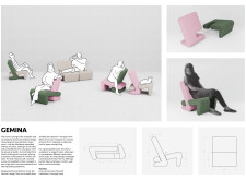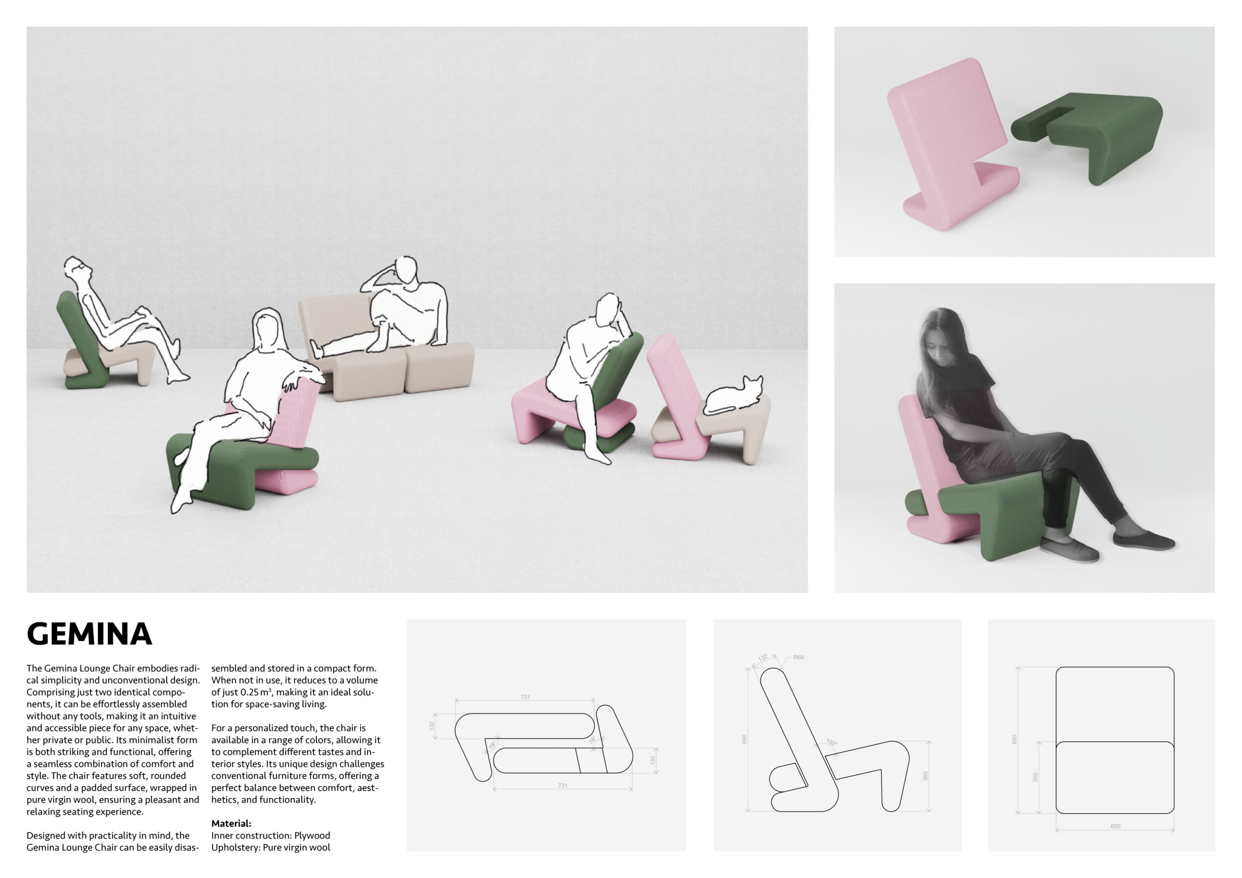 It is an interesting idea to go beyond the concept of a chair. In the presentation, the photo of two chairs stacked on top of each other is attractive, but I would have liked to see a vision of how it would be used as well.