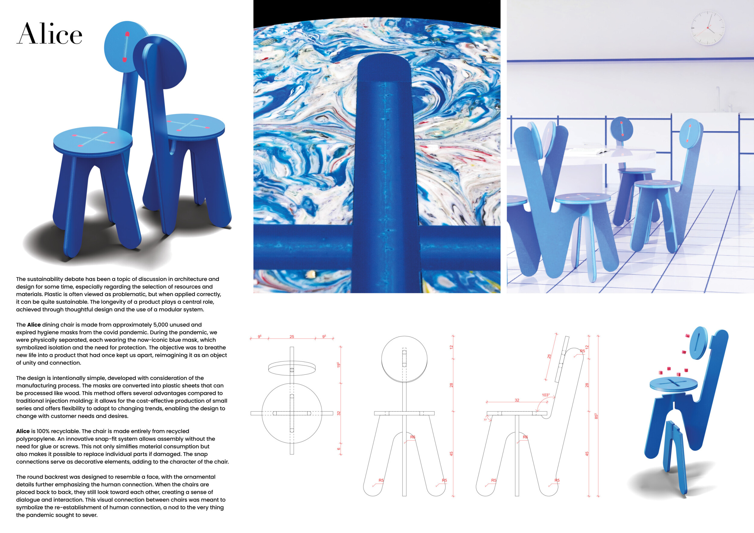 The Bäuer:innenstuhl is a contemporary reinterpretation of the traditional "Bauernstuhl," a simple wooden chair commonly found in Alpine regions. Constructed from solid wood, it features an angular structure with a split backrest, maintaining a balance between rustic craftsmanship and modern aesthetics. The design embraces traditional joinery while avoiding metal fasteners and chemical treatments, enhancing sustainability. Read more Developed through a community-based approach, it promotes local material sourcing and upcycling. The chair's production emphasizes low-waste processes and CO₂ reduction. By integrating historical elements with modern needs, the Bäuer:innenstuhl serves as both functional seating and a reflection of evolving design traditions.