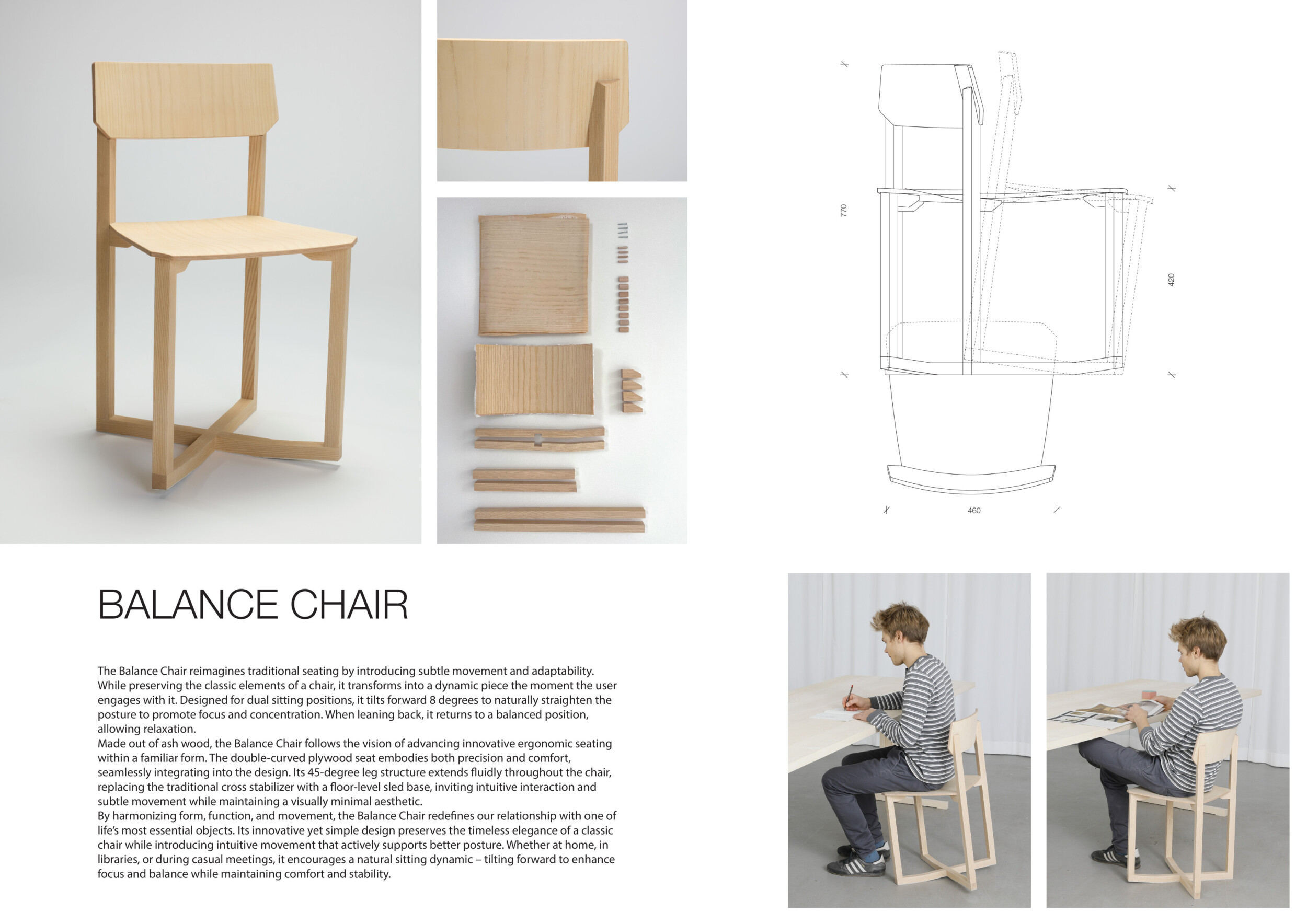 The Balance Chair incorporates subtle movement to promote better posture and engagement. It features a forward tilt of eight degrees, encouraging an upright sitting position for improved focus, while allowing users to lean back into a stable resting position. Constructed from ash wood, it has a double-curved plywood seat for comfort and a 45-degree leg structure that integrates movement without compromising stability. Read more Replacing a standard cross stabilizer with a floor-level sled base, the design maintains a minimal aesthetic while supporting natural posture adjustments. Suitable for various environments, it provides ergonomic benefits through controlled motion.