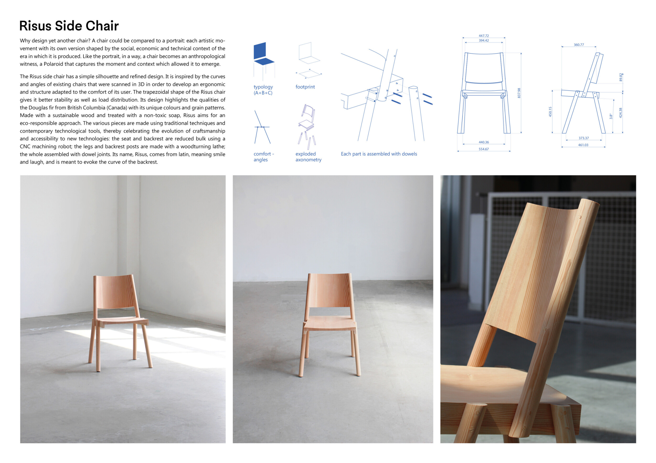 The Risus Side Chair is a wooden chair designed with a refined silhouette, inspired by the curves and angles of existing seating forms that were digitally scanned to enhance ergonomics and structural stability. Its trapezoidal shape provides better weight distribution, while the Douglas fir wood from British Columbia highlights natural grain patterns. Read more Constructed using both traditional woodworking and CNC machining, the seat and backrest are shaped for comfort, with legs and joints crafted on a lathe. Assembled with dowels and treated with a non-toxic finish, the chair prioritizes sustainability. The name "Risus," meaning smile in Latin, references the curved backrest, designed to provide ergonomic support while maintaining a simple, modern aesthetic suitable for various environments.