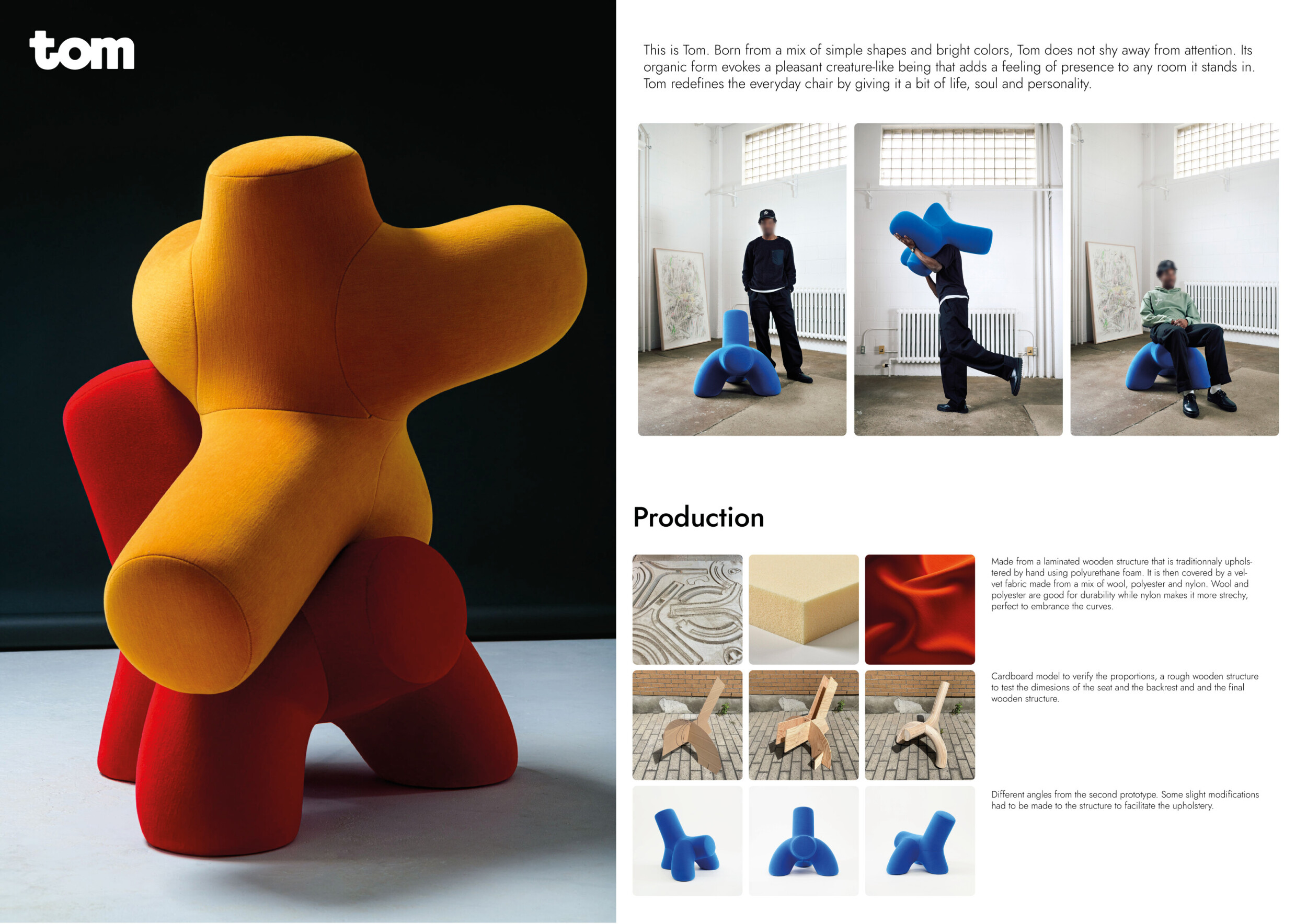 The Tom chair is a sculptural seating piece characterized by bold colors and organic, rounded shapes. Designed to stand out, its abstract form gives it a playful, almost creature-like presence. Constructed with a laminated wooden frame, it is upholstered by hand using polyurethane foam and covered in a velvet fabric blend of wool, polyester, and nylon. The combination of materials ensures durability and flexibility, allowing the fabric to conform smoothly to its curved shape. Read more The design process involved prototyping with cardboard and wood to refine proportions and upholstery techniques. Tom challenges traditional seating by prioritizing form and character alongside function.
