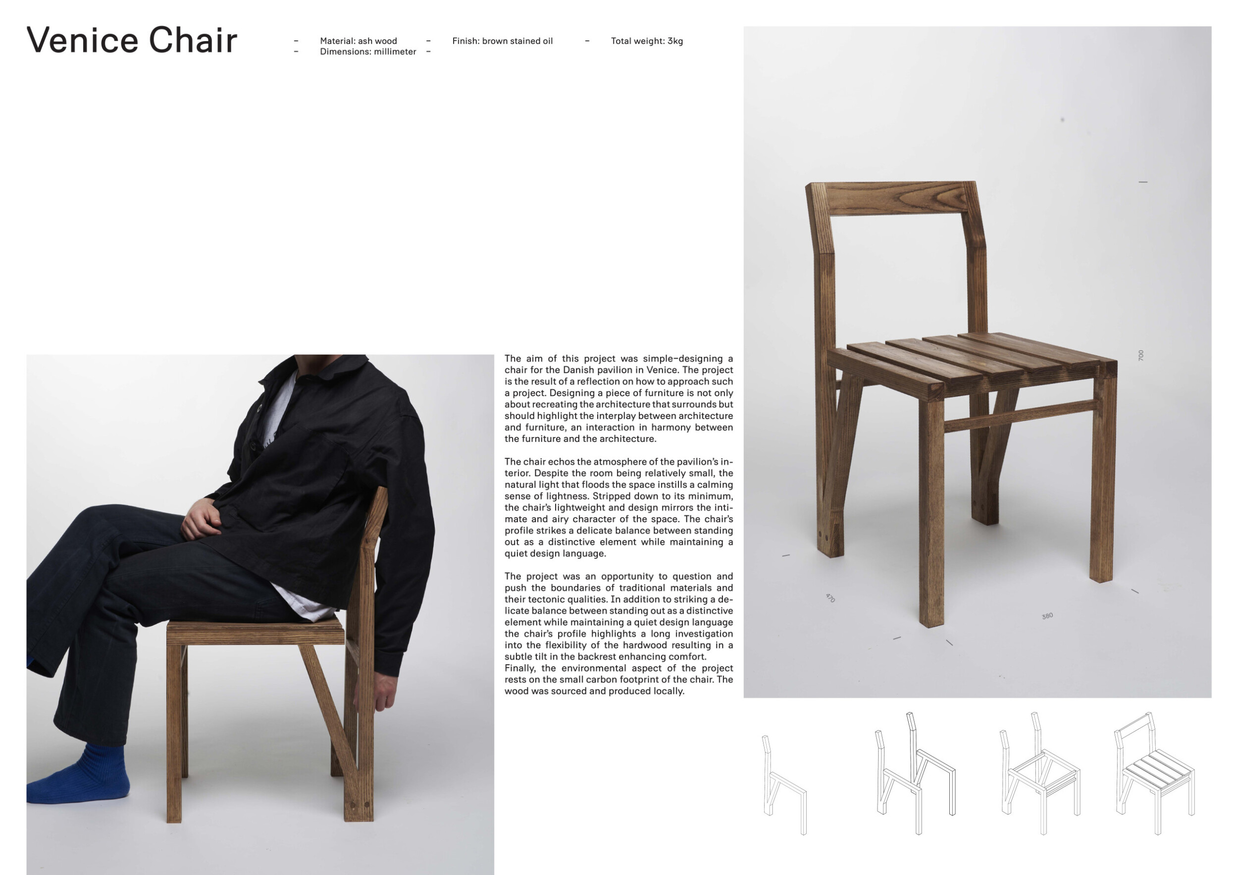 Beautifull aesthetic and well proportioned parts. A minimalist chair that is quite different from existing wooden chair with this unique backrest. However, the connections and structure seems under evaluated to withstand a human body. The upper parts that maintains the backrest should have been simply an extension from the frontal legs. It would have been much more resistant. In addition, the thin plank of Douglas fir seems fragile. Douglas fir is really a beautiful wood, but it has some issues with resin pouches and reacts to humidity differences.